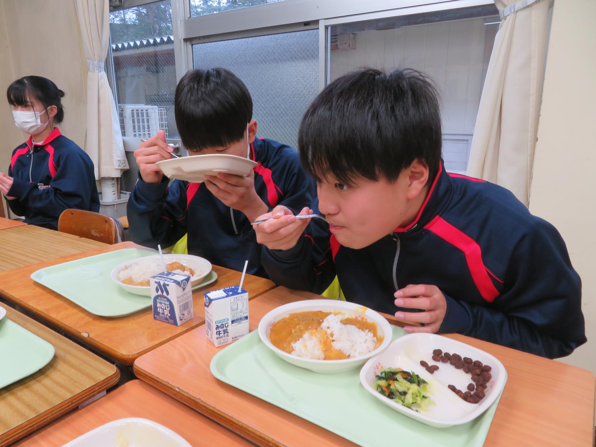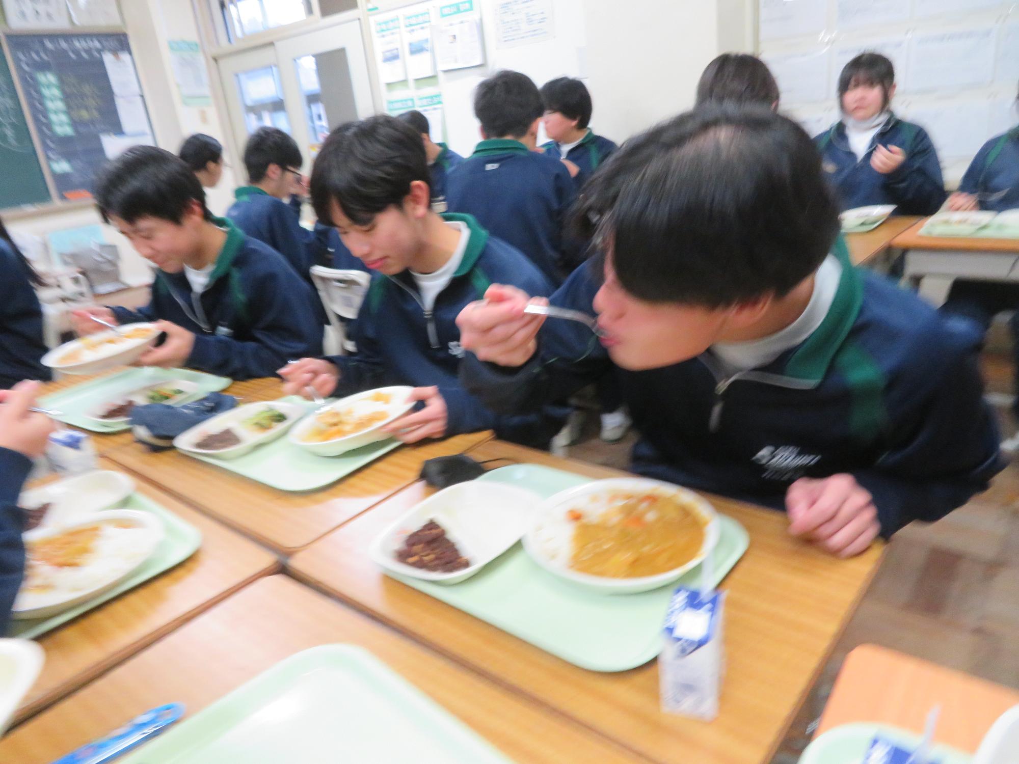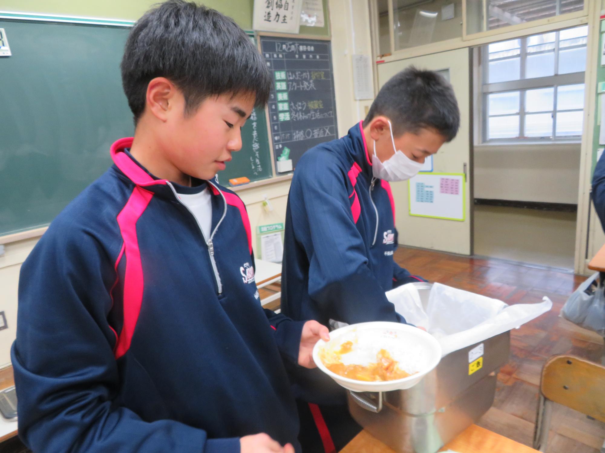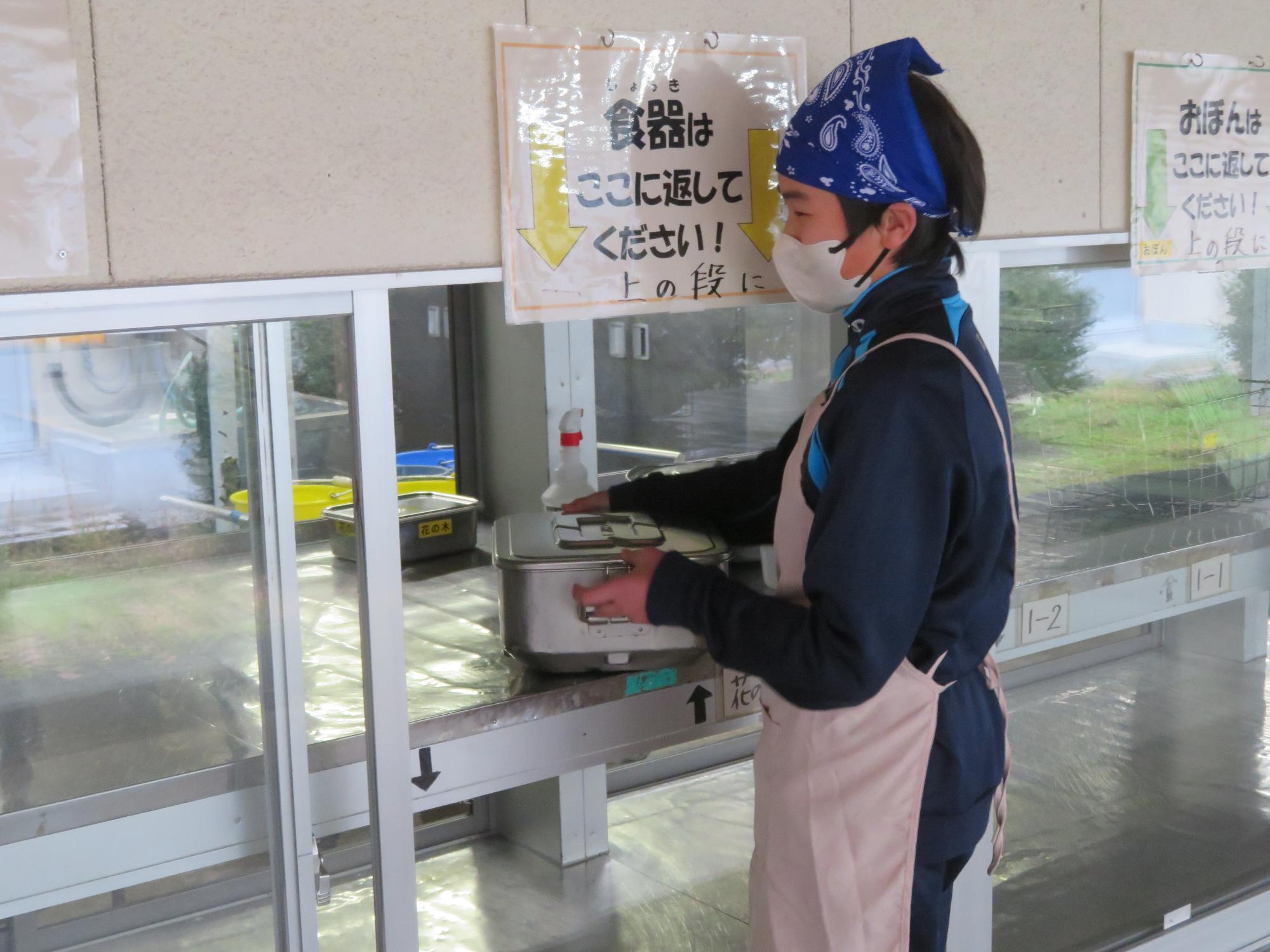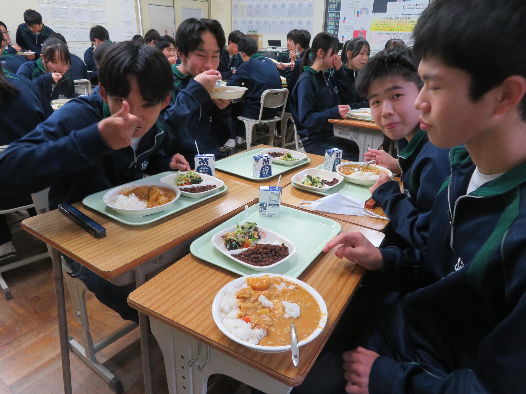 坂本中学校調理場の利用は本日で終了です。1月からは新坂本地区調理場で給食が作られます。本日、坂本中調理場のお別れということもあり、生徒たちは「今までありがとうございました!」と感謝の気持ちを込めて、給食の食器や食缶を返却する生徒がたくさん見られました。また、前期と後期の給食委員長が、調理員さんたちと給食調理場の施設にお礼にいく場面も見られました。最後のメニューはカレーライス。どのクラスも残量ゼロとなるよう意識しながら、感謝の気持ちを込めてもりもり食べていました。