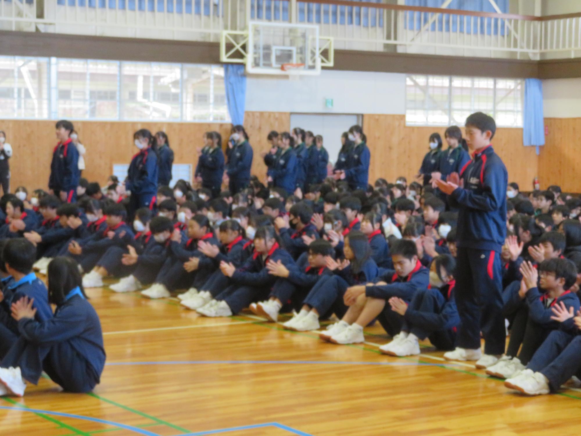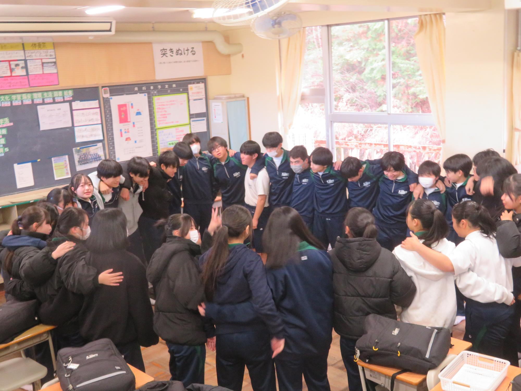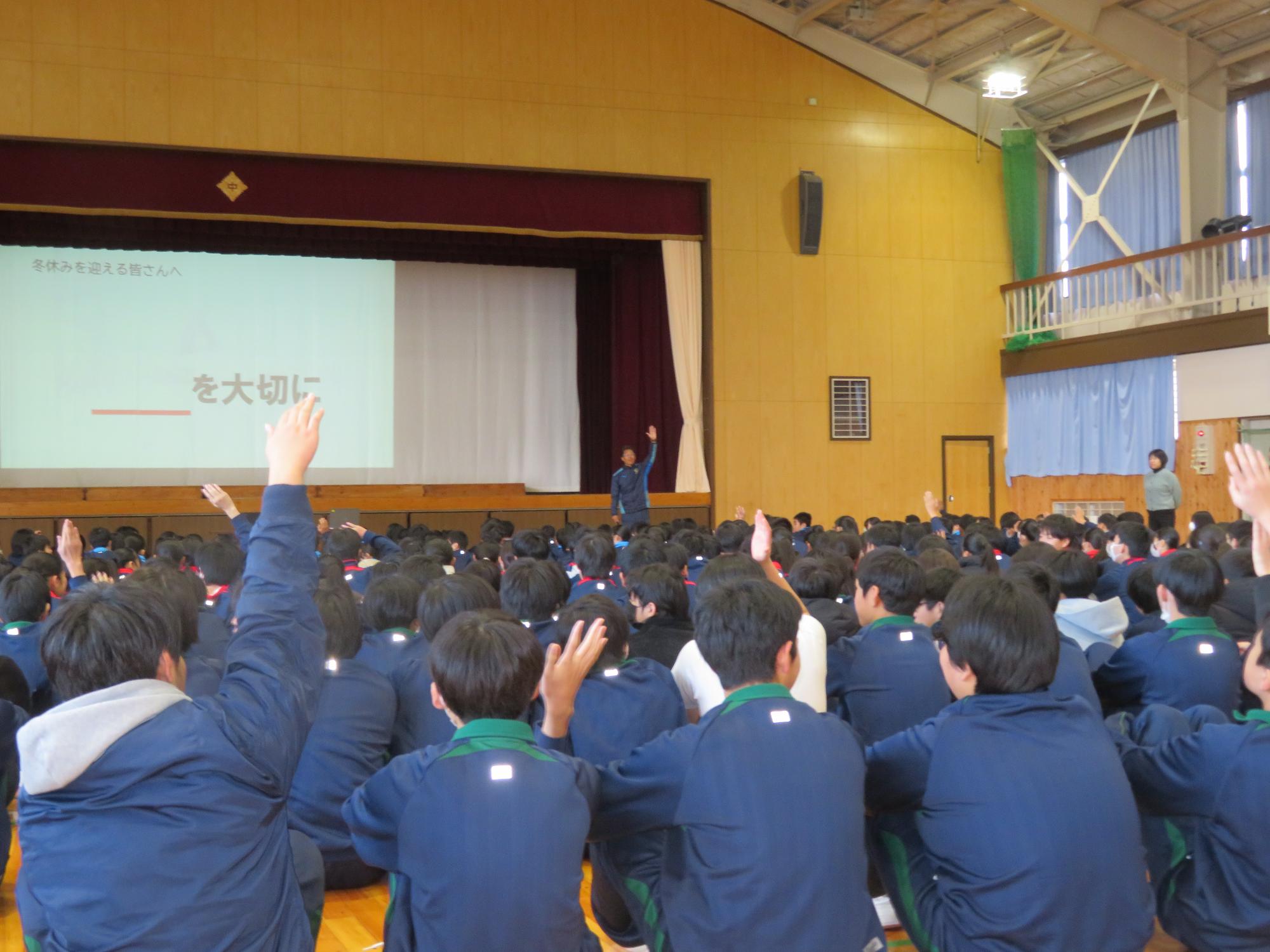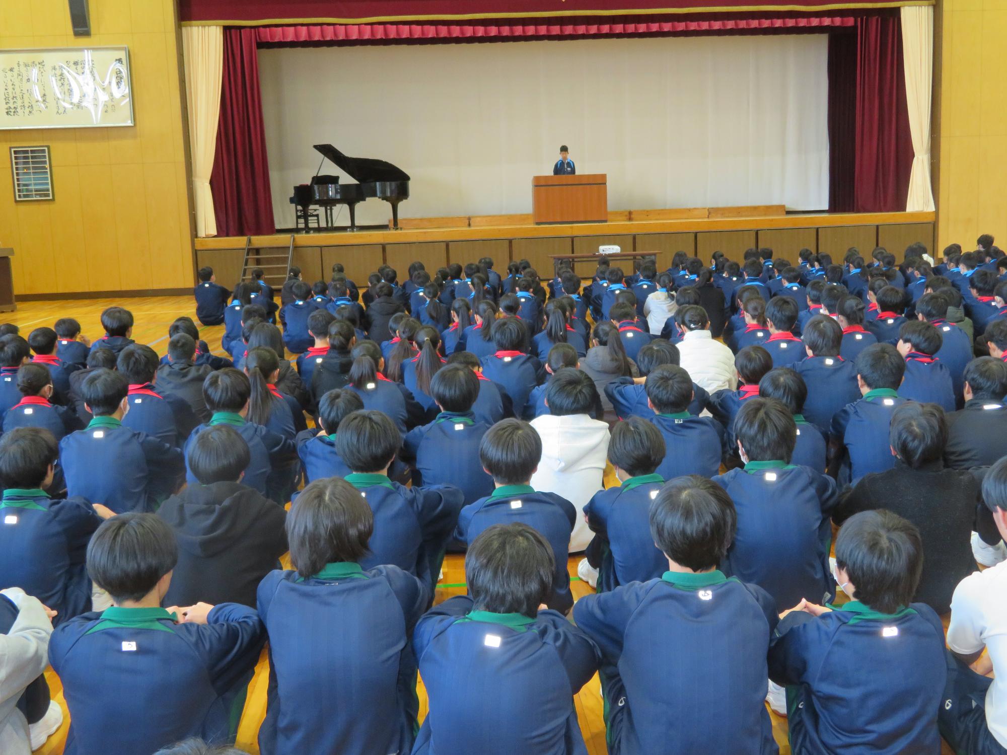 冬休み前集会を整然とした雰囲気の中で行いました。1年生代表の生徒は「仲間とのつながりや関わりが大切であると学んだことを今後も大切にしたい!」と合唱祭で得たことをもとに語りました。3年生代表の生徒は「自分と向き合い、自分の弱さに気づき、それを打開した自分かいる。冬休みの生活にもつなげたい!」と力強く語りました。なお、3年生は代表生徒の言葉につながり、クラスで円陣を組んで、冬休みの互いの頑張りにエールを送っていた姿もとても印象的でした。自分の命と心を大切に、自分一人でも正しい判断力をもって生活できる冬休みになることを職員一同、願っています。どうか、よいお年をお迎えください。