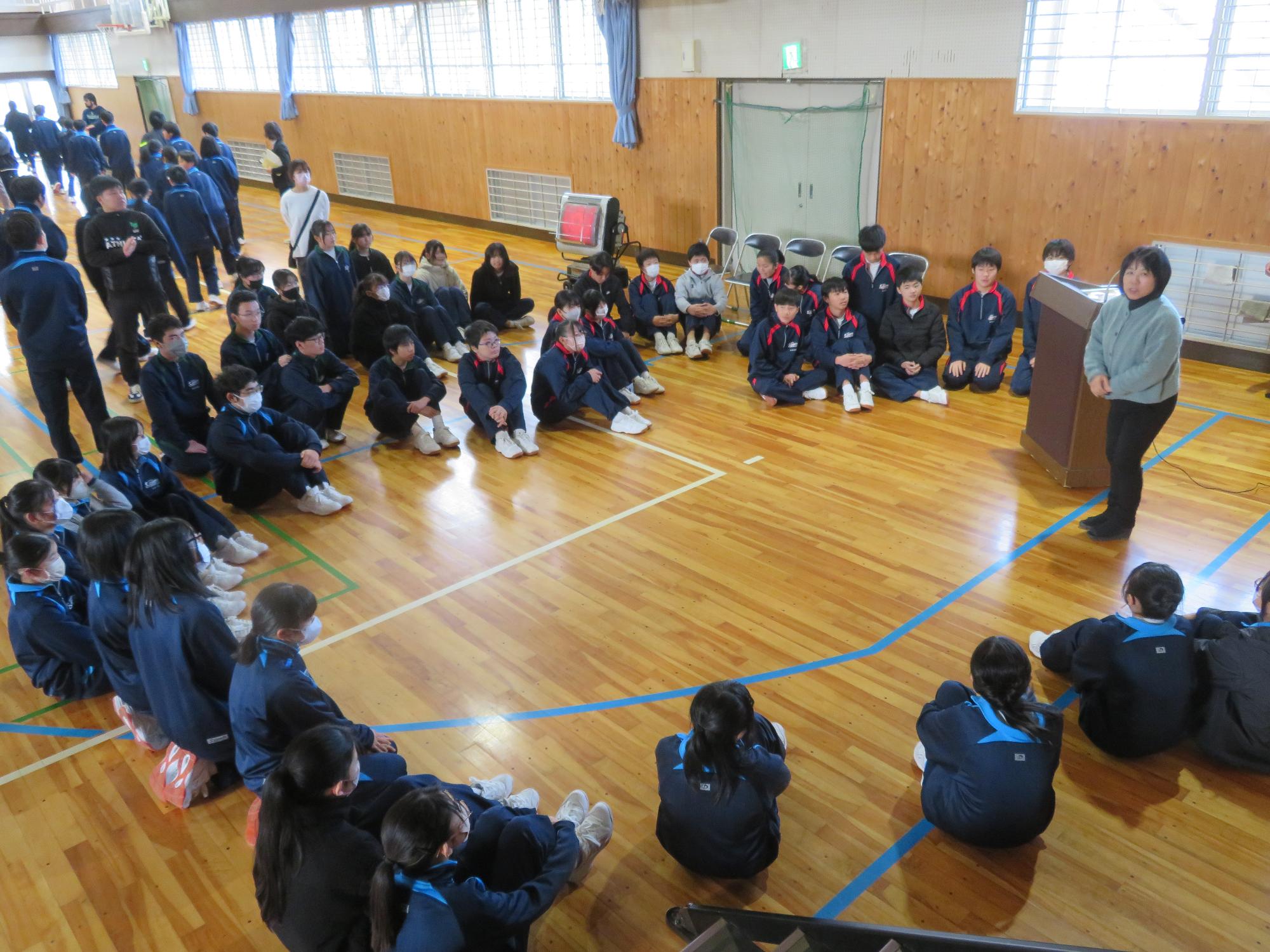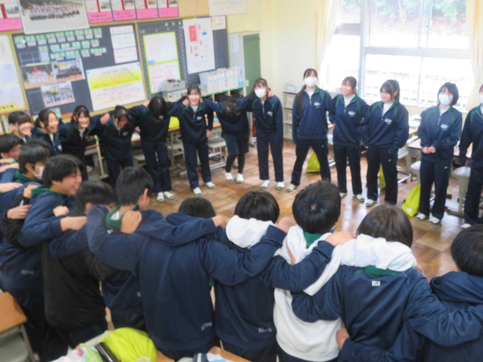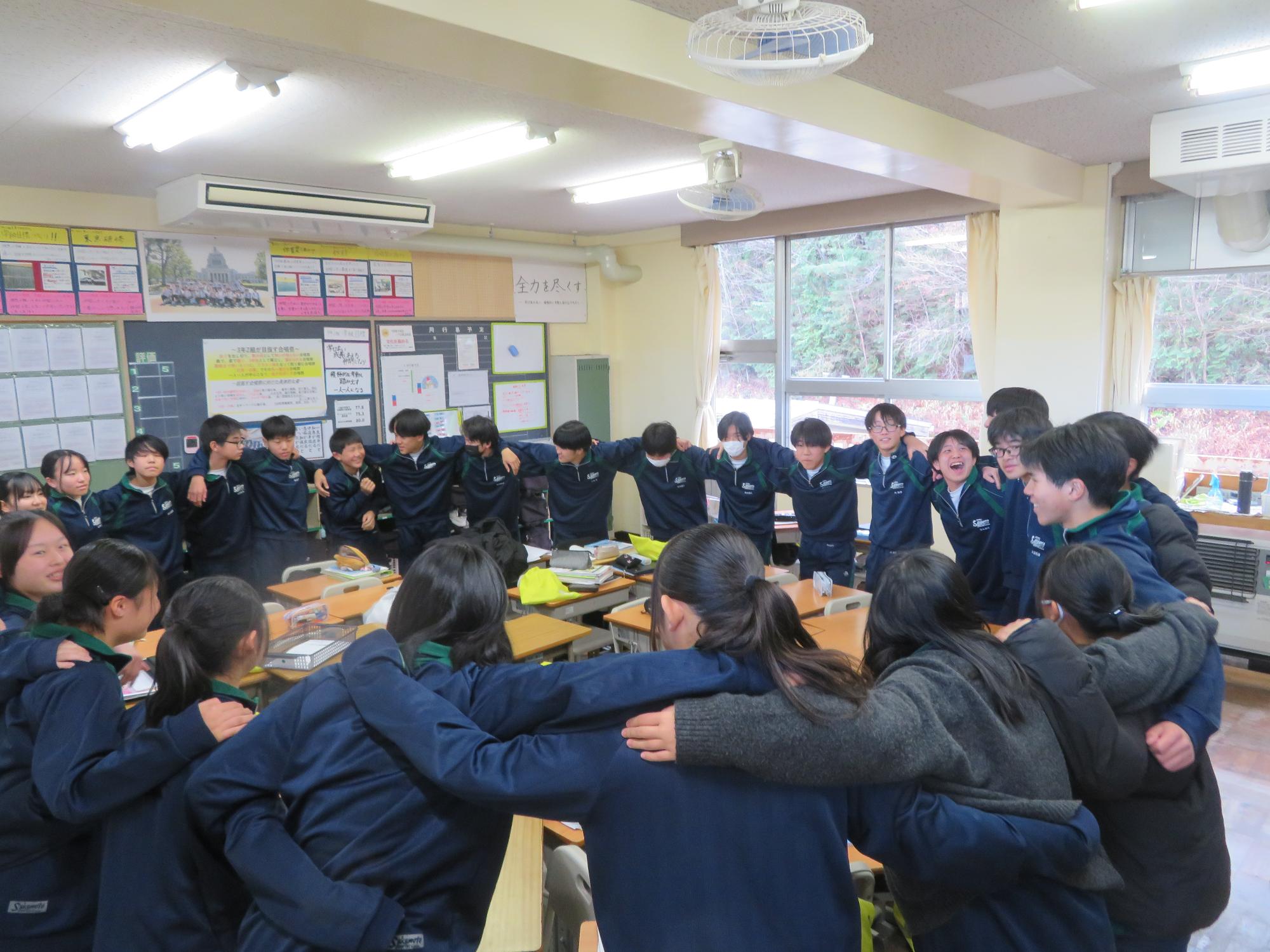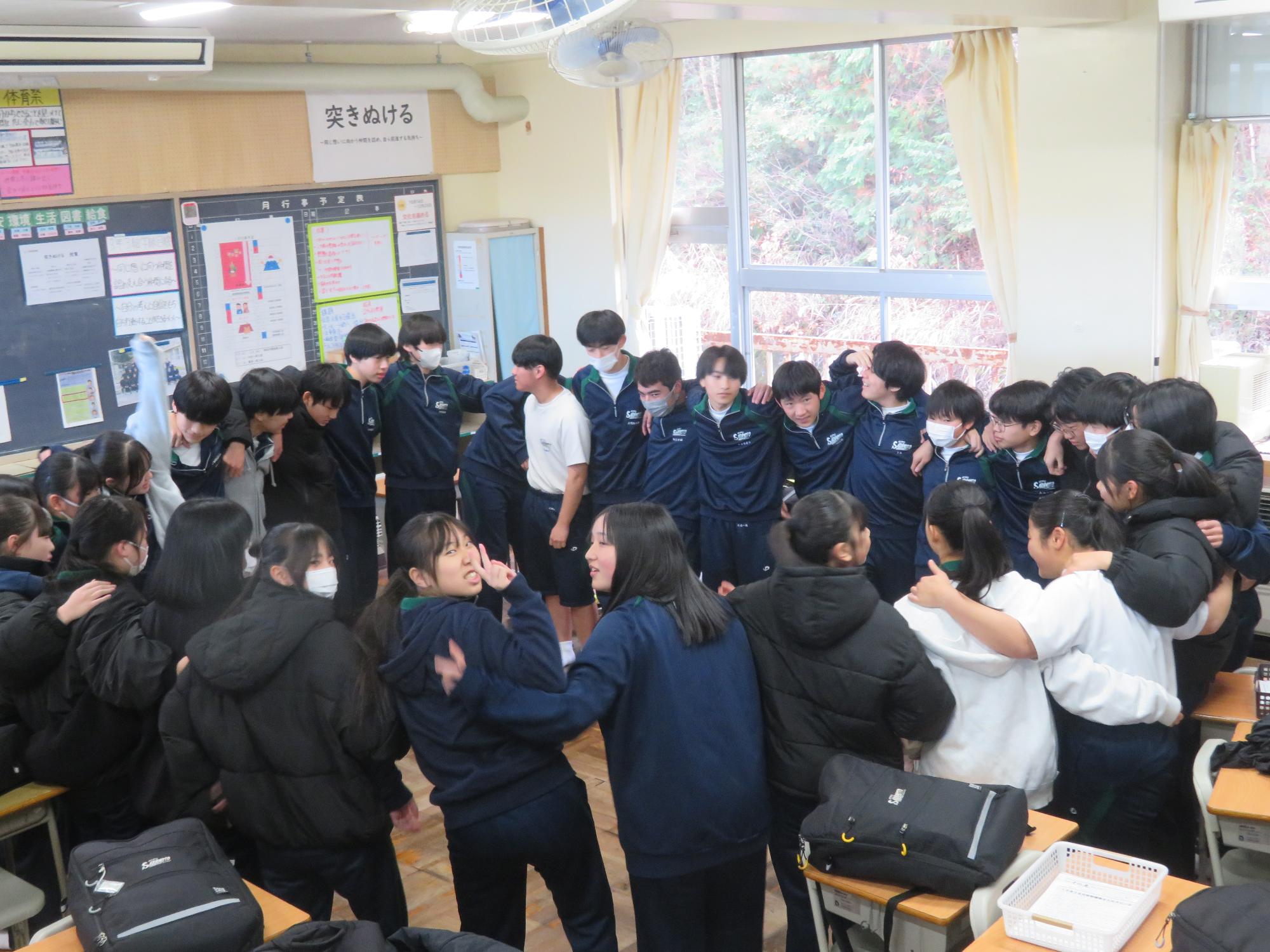 冬休み前集会を整然とした雰囲気の中で行いました。1年生代表の生徒は「仲間とのつながりや関わりが大切であると学んだことを今後も大切にしたい!」と合唱祭で得たことをもとに語りました。3年生代表の生徒は「自分と向き合い、自分の弱さに気づき、それを打開した自分かいる。冬休みの生活にもつなげたい!」と力強く語りました。なお、3年生は代表生徒の言葉につながり、クラスで円陣を組んで、冬休みの互いの頑張りにエールを送っていた姿もとても印象的でした。自分の命と心を大切に、自分一人でも正しい判断力をもって生活できる冬休みになることを職員一同、願っています。どうか、よいお年をお迎えください。