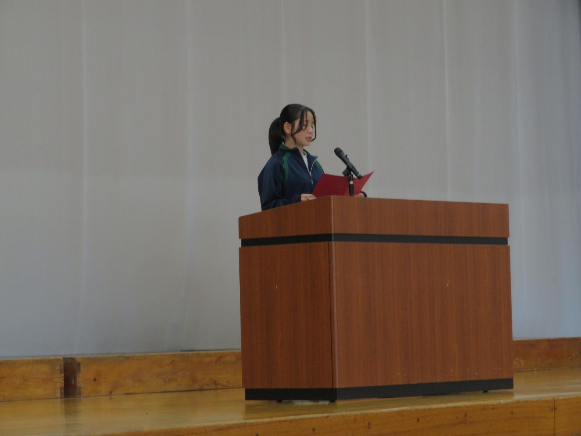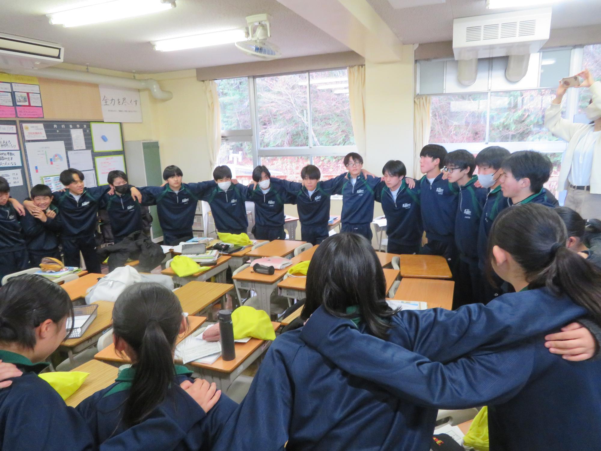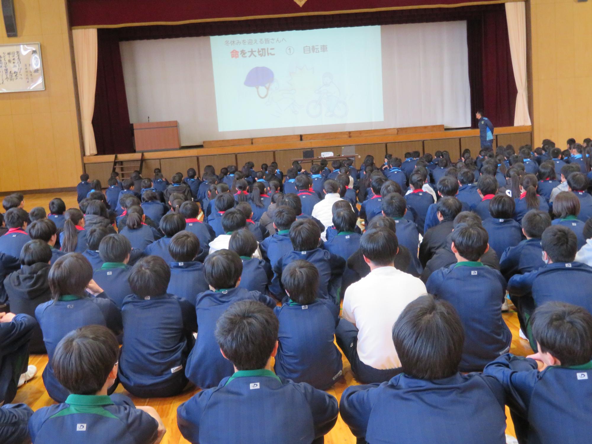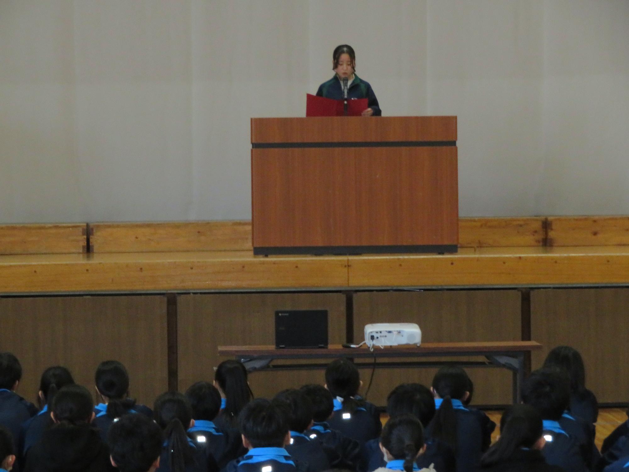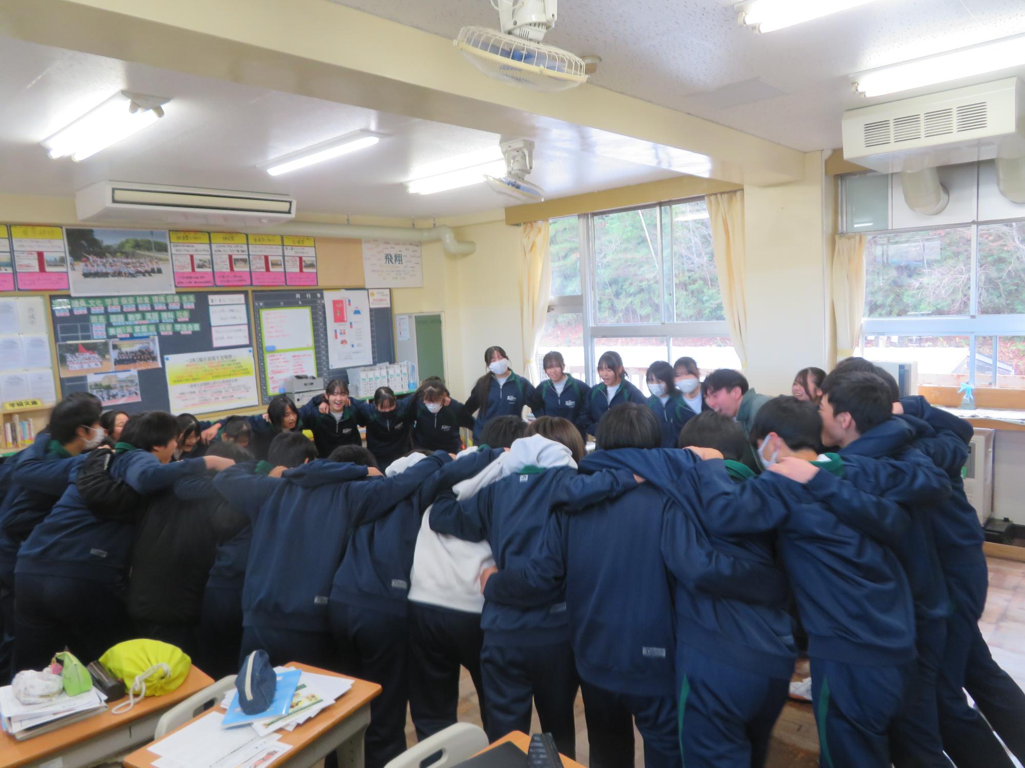 冬休み前集会を整然とした雰囲気の中で行いました。1年生代表の生徒は「仲間とのつながりや関わりが大切であると学んだことを今後も大切にしたい!」と合唱祭で得たことをもとに語りました。3年生代表の生徒は「自分と向き合い、自分の弱さに気づき、それを打開した自分かいる。冬休みの生活にもつなげたい!」と力強く語りました。なお、3年生は代表生徒の言葉につながり、クラスで円陣を組んで、冬休みの互いの頑張りにエールを送っていた姿もとても印象的でした。自分の命と心を大切に、自分一人でも正しい判断力をもって生活できる冬休みになることを職員一同、願っています。どうか、よいお年をお迎えください。