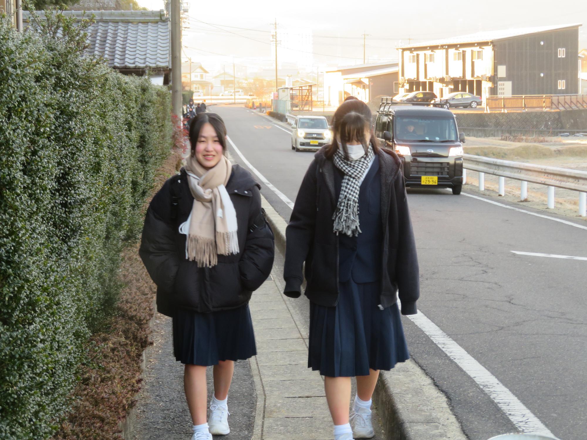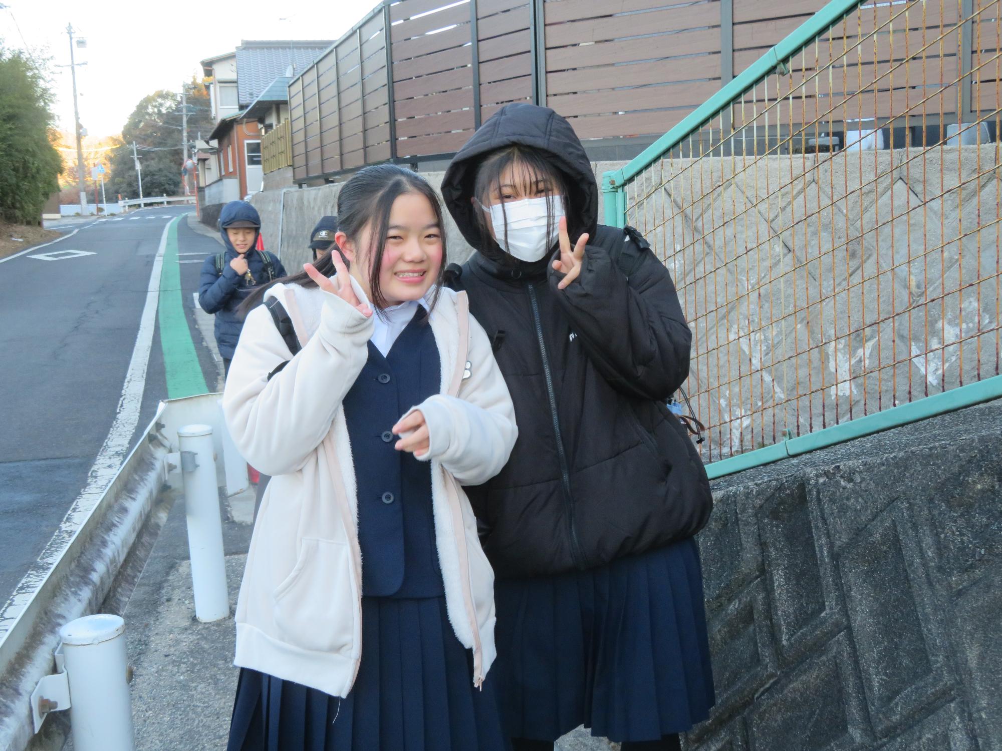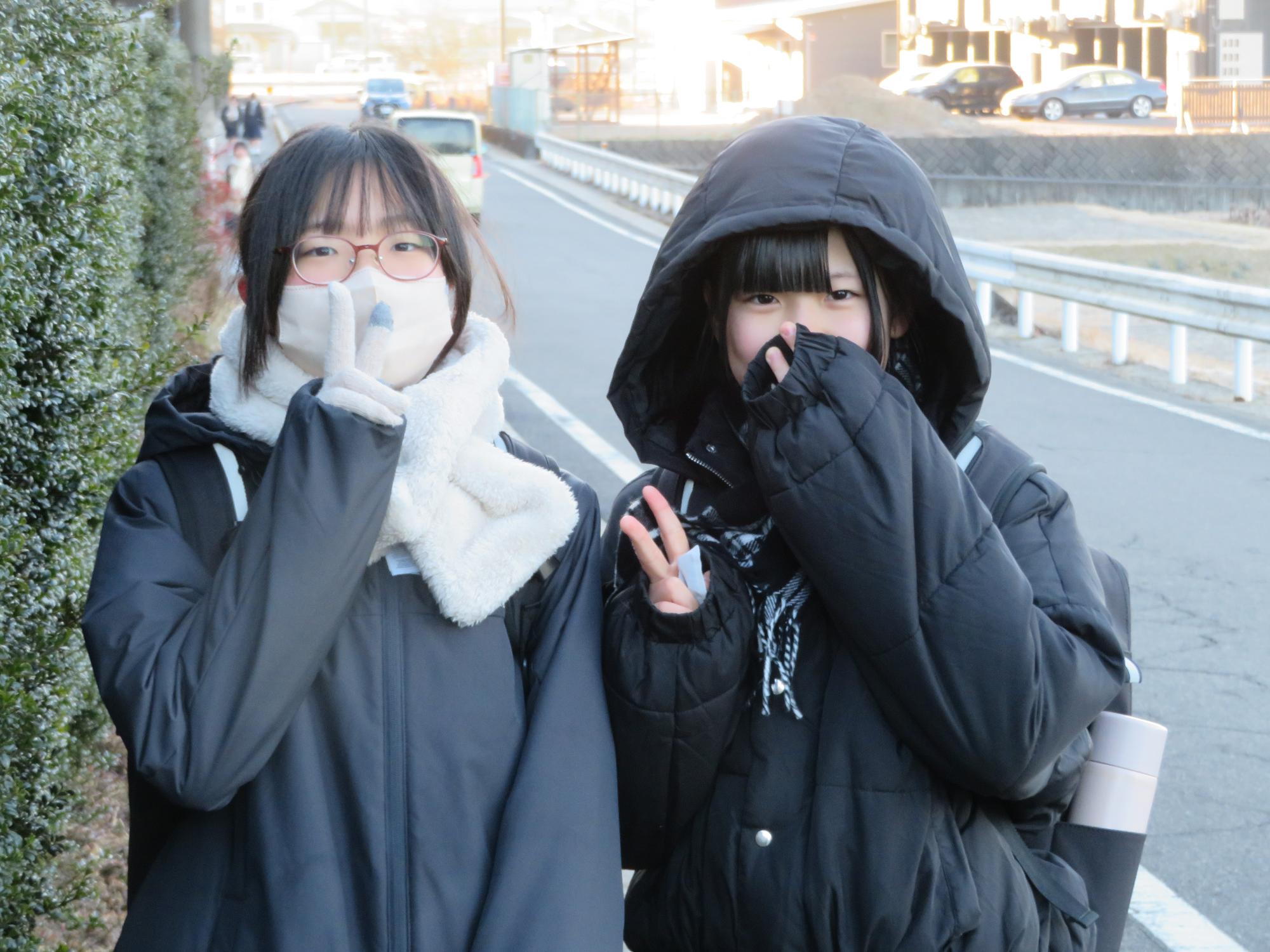 -4℃の寒さの中の登校 更新日:2026年01月09日 今日7:00の外気温は-4℃。凍り付くような寒さの中、今日も坂中生の元気に登校する姿が見られました。特に今日は全校実力テストの日のため制服登校。「ジャージより寒い!」と話す生徒も多かったですが、寒さの中、笑顔で登校する姿にさわやかさも感じられました。実力テストが終わった後も、そのさわやかさが残っていてほしいと感じながら登校を見守る朝の風景でした。