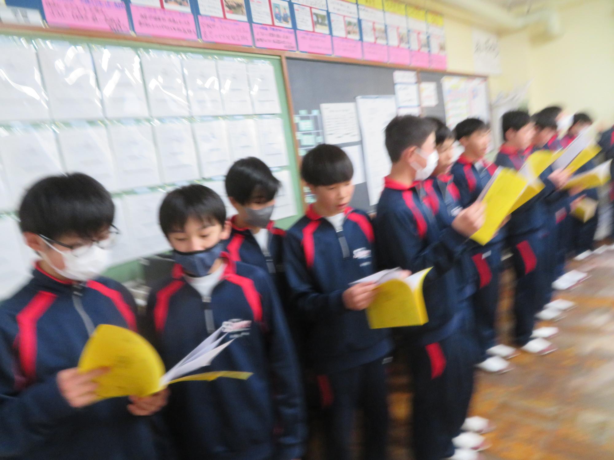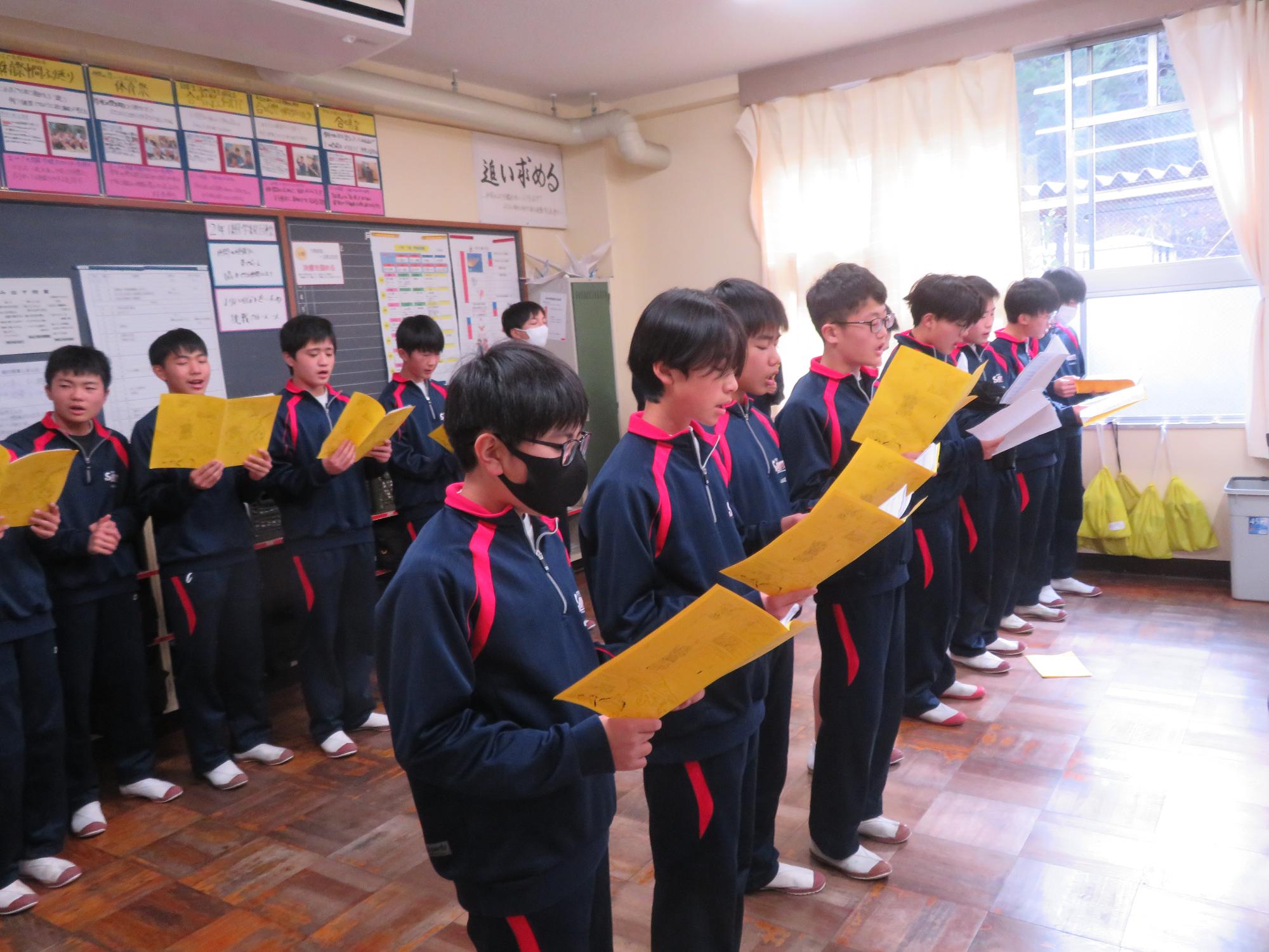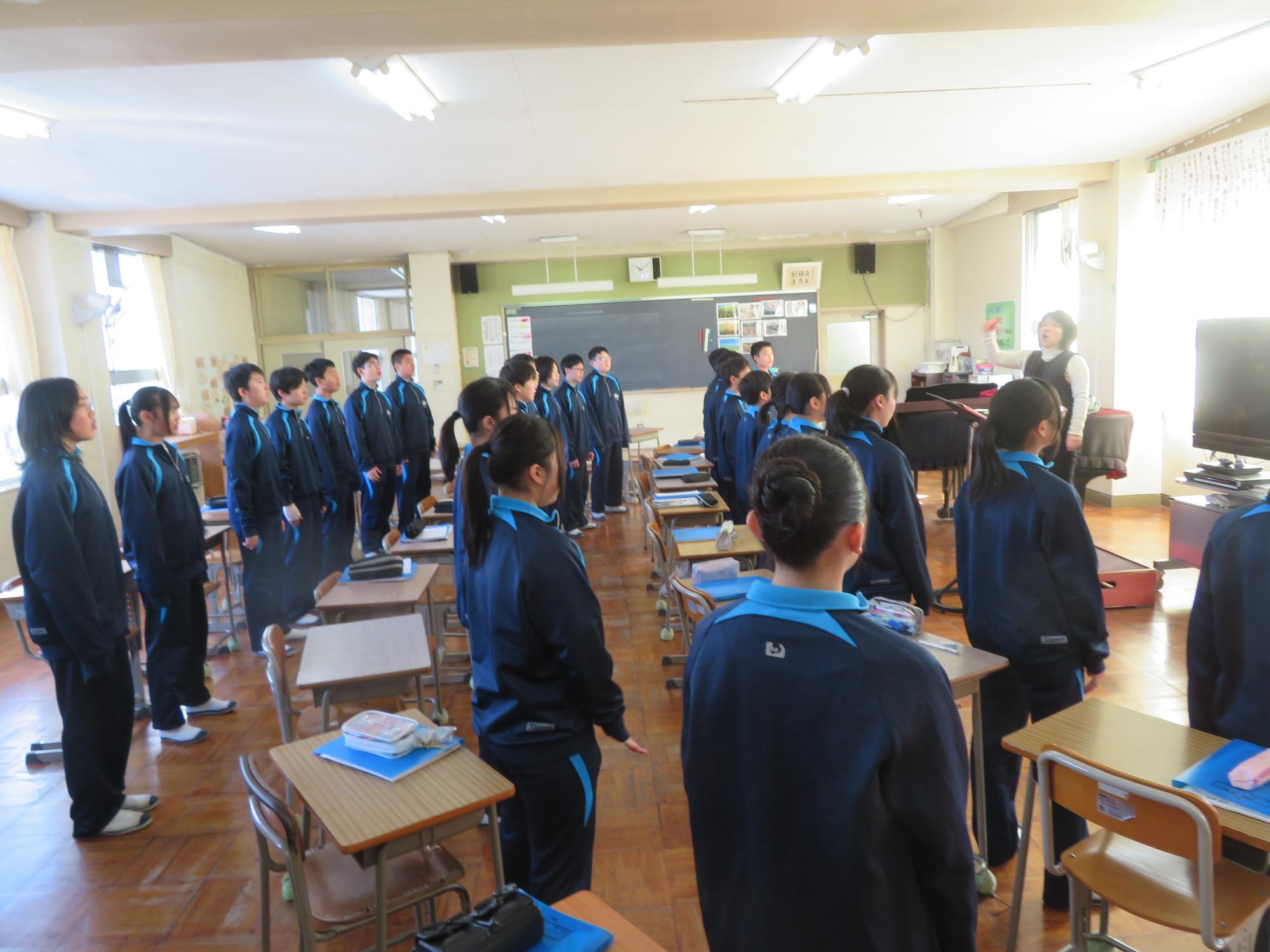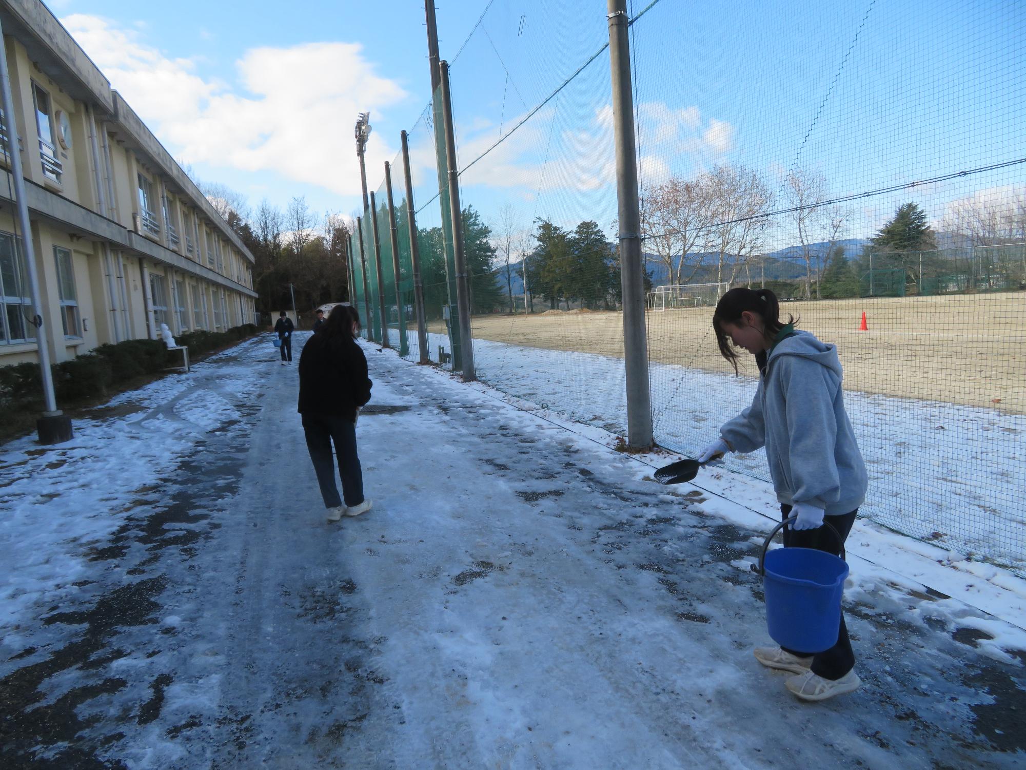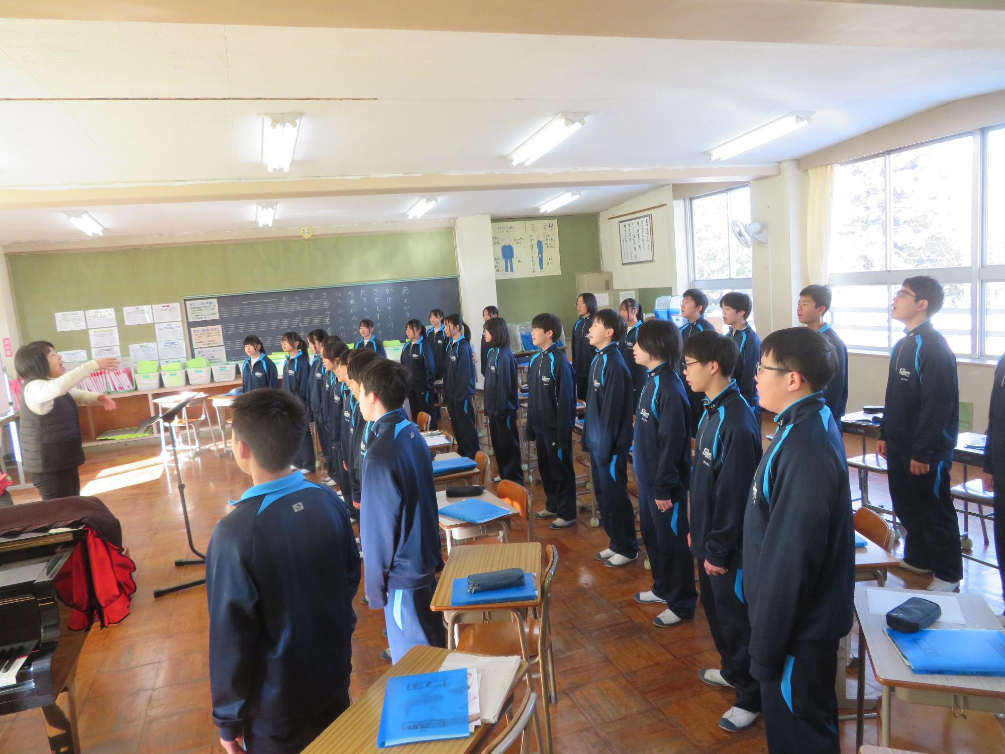 坂中生はいつももりもり給食を食べ、午後1時過ぎはエネルギーが全開状態です。冷たい風が吹く中でも外で仲間と元気に遊んだり、掃除を仲間と黙々と行ったりとエネルギッシュな姿が随所に見られます。ちょうどこの日の昼休みは、2年生は、学年合唱練習を仲間と呼びかけ合ってエネルギッシュに行っていました。3年生の玄関掃除のグループは、カチカチに凍った校舎の前の道に融雪剤をエネルギッシュにまいてくれました。午後1時過ぎはいつもエネルギッシュな坂中生の姿がたくさん見られる時間です。