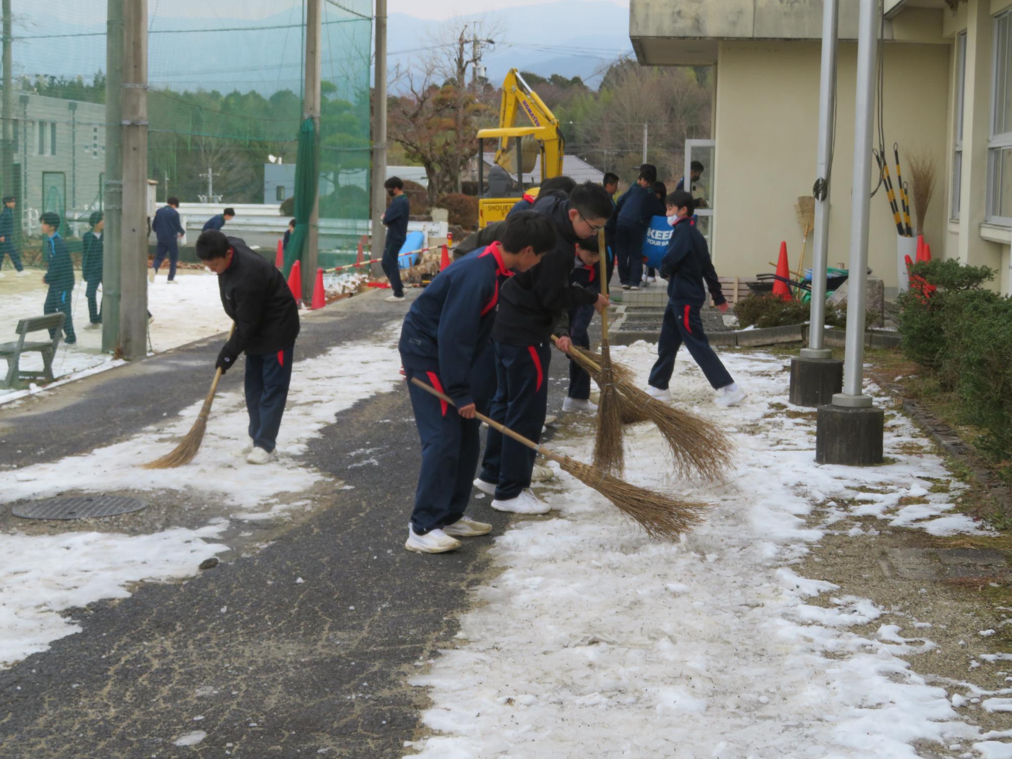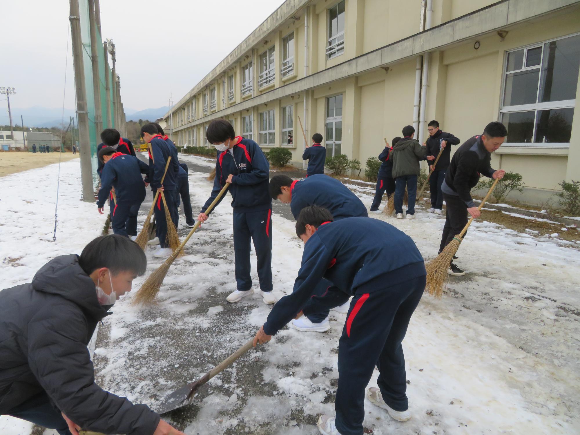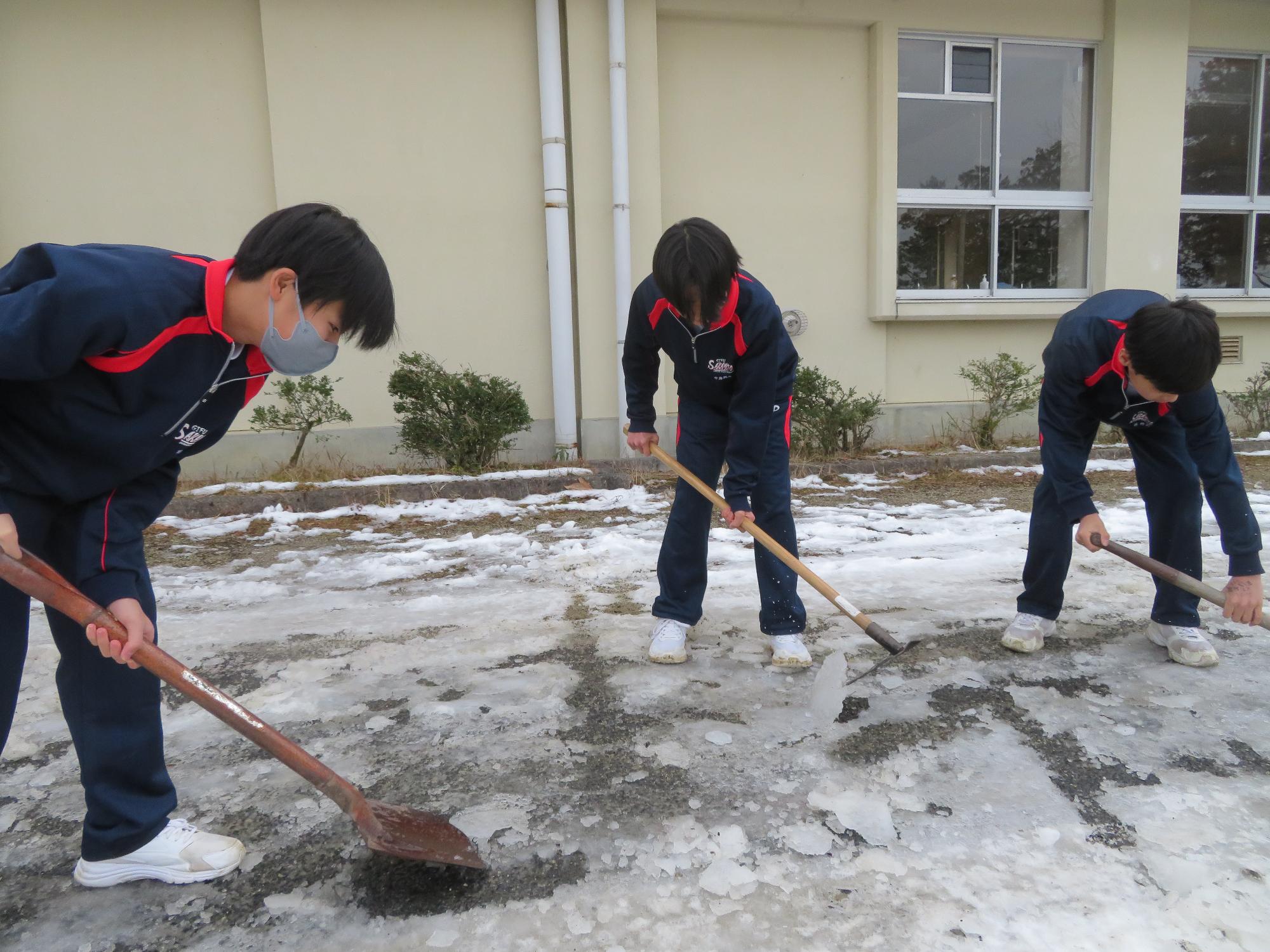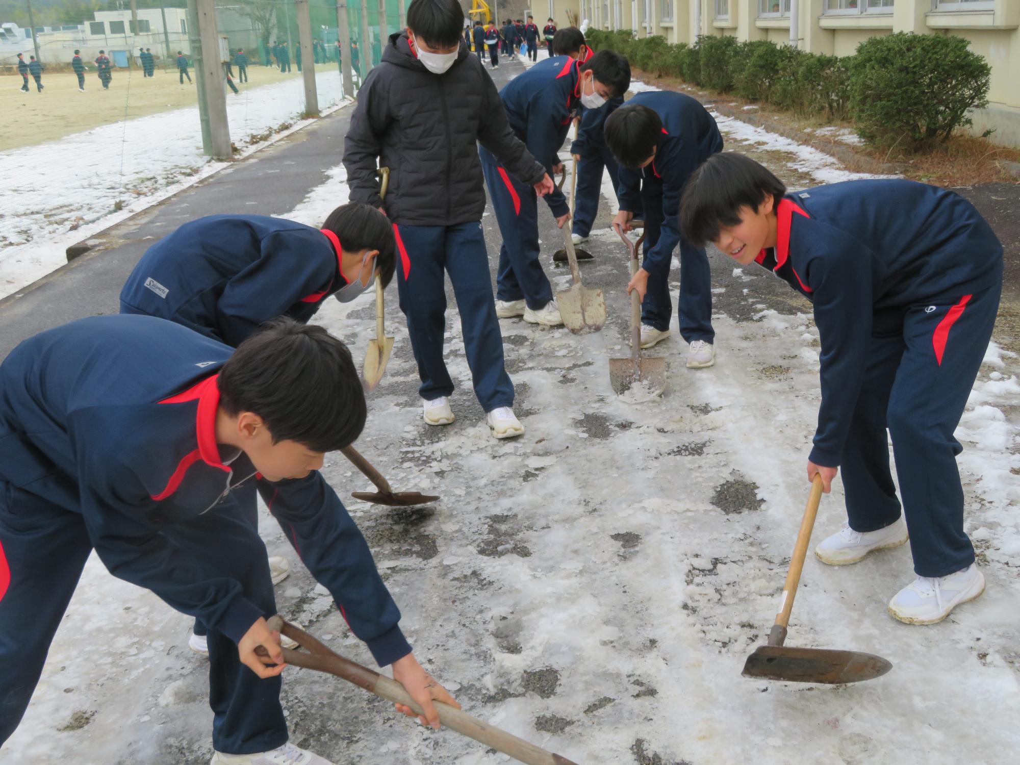 坂中生のボランティアの姿が随所に見られます。まずは朝、外気温3℃の中、7:30に決められた場所に立ち、あいさつボランティアを行う生徒が70名ほどいました。「今日は、目を見て笑顔であいさつすることにこだわりましょう。」という生徒会執行部の呼びかけにつながり、地域の方とともにボランティアを行う姿が見られました。そして昼休み。凍って滑る校舎前の道路を、スコップやほうきできれいにしてくれる2年生ボランティア30名の姿も見られました。するとよいことを判断し、ボランティアの心を姿で示していける坂中生が増えていることにうれしさを感じます。