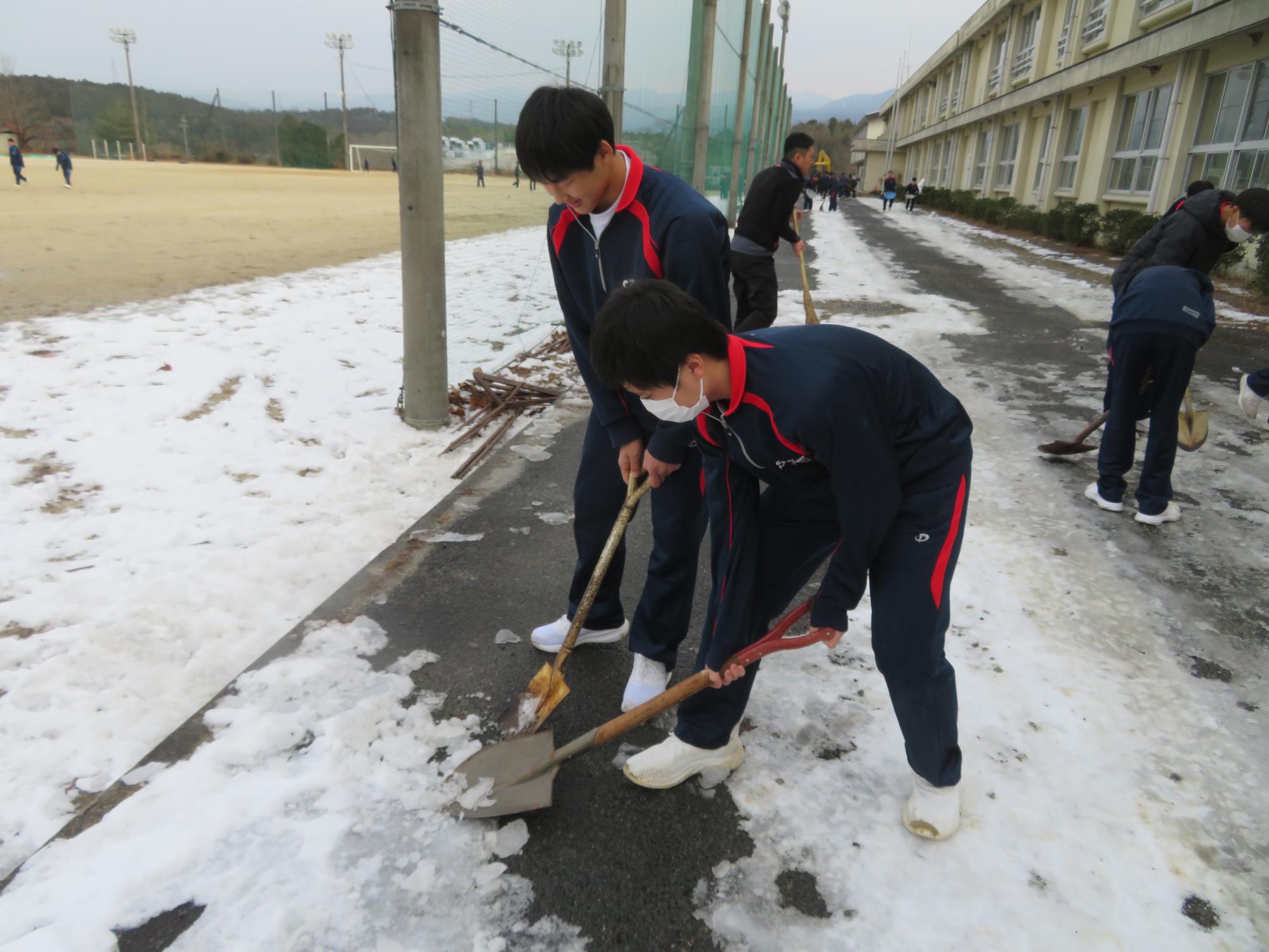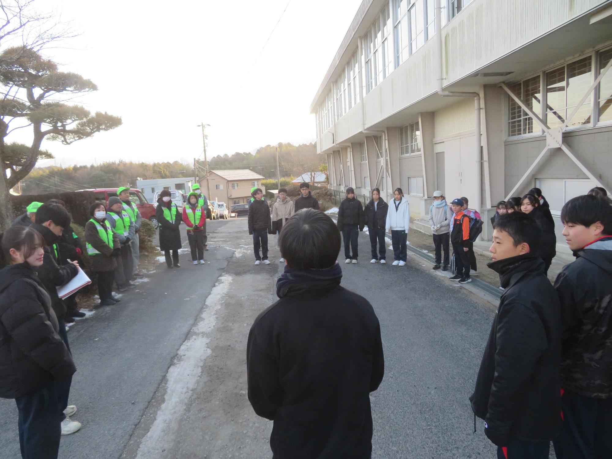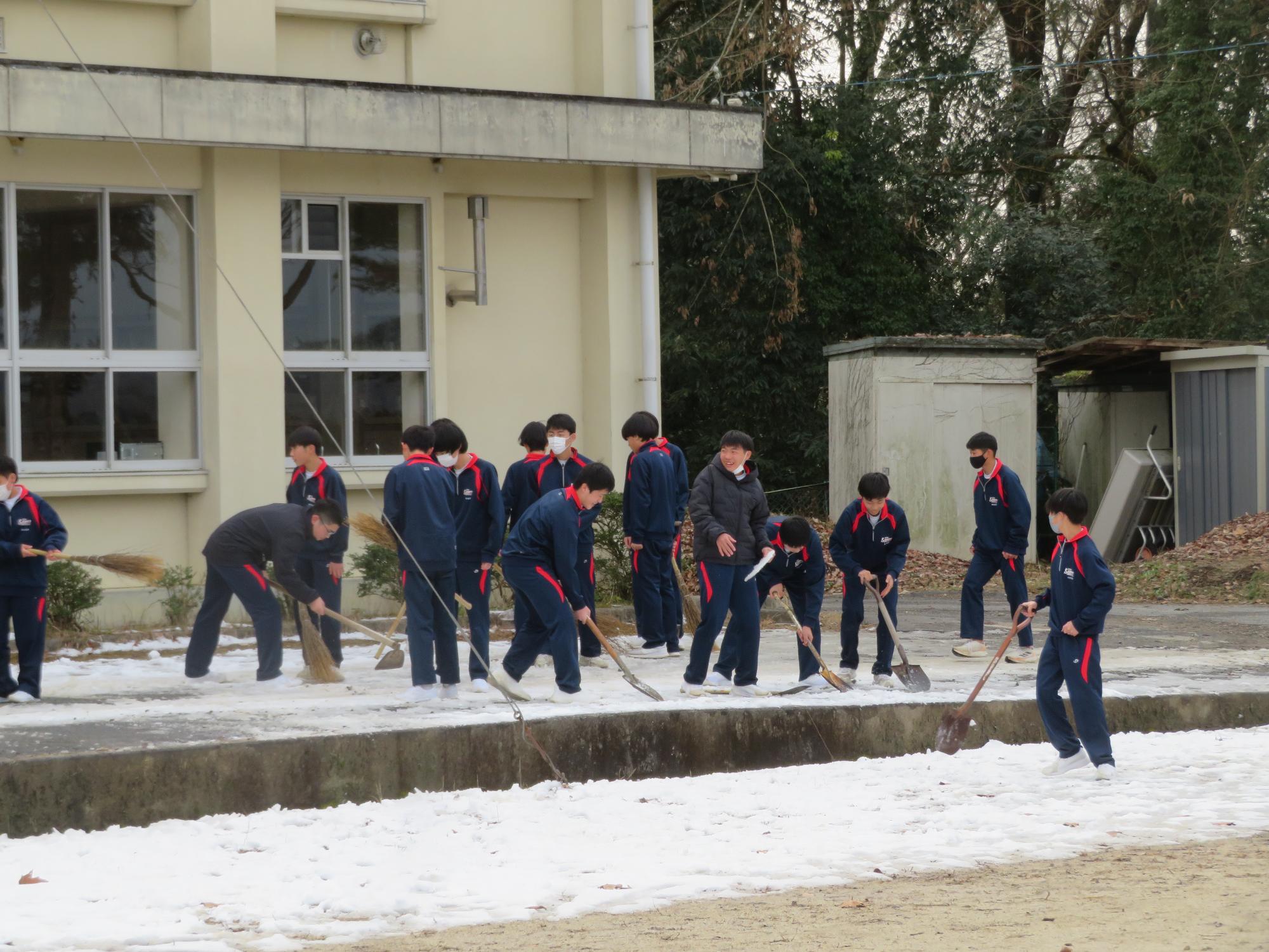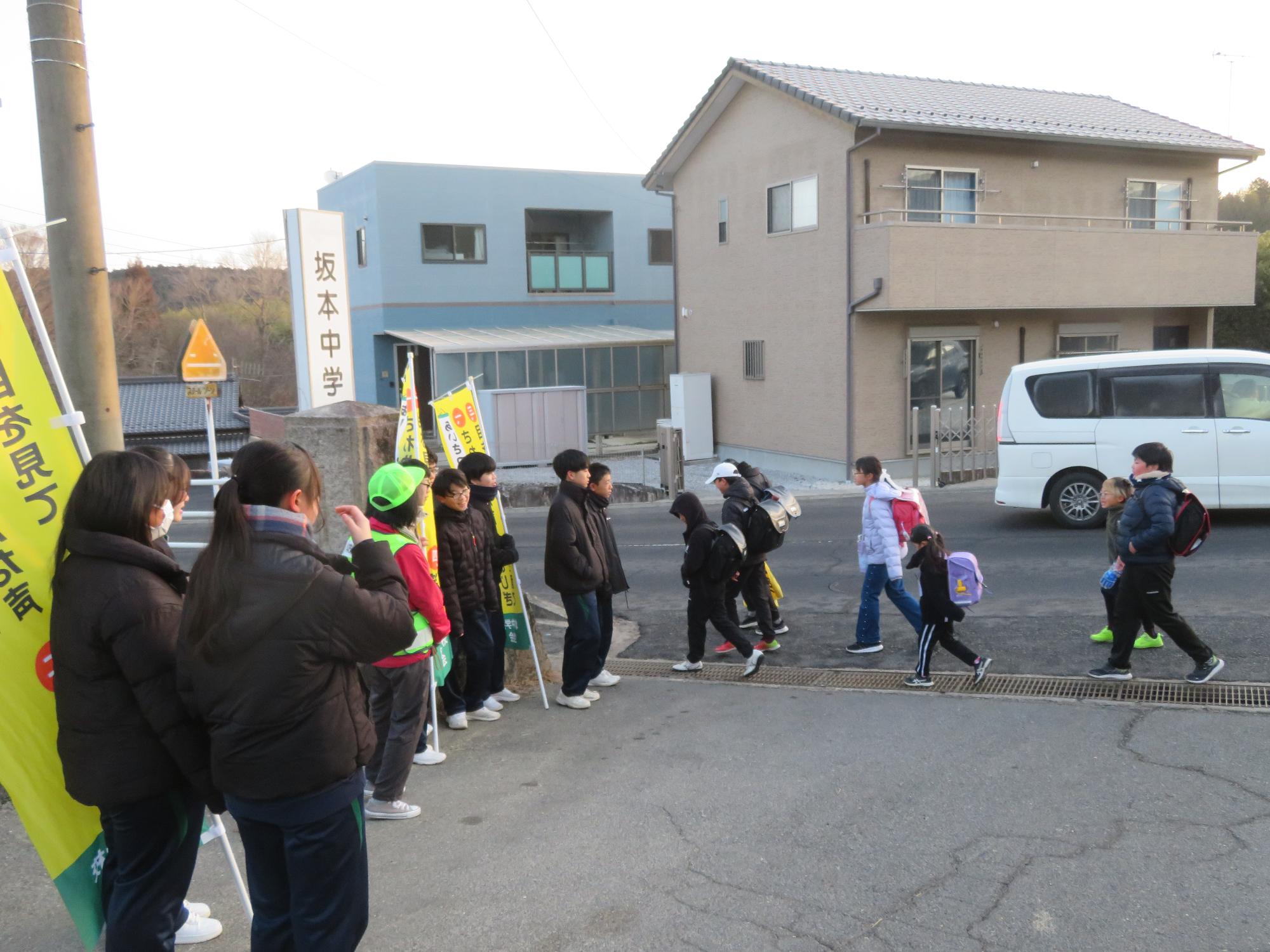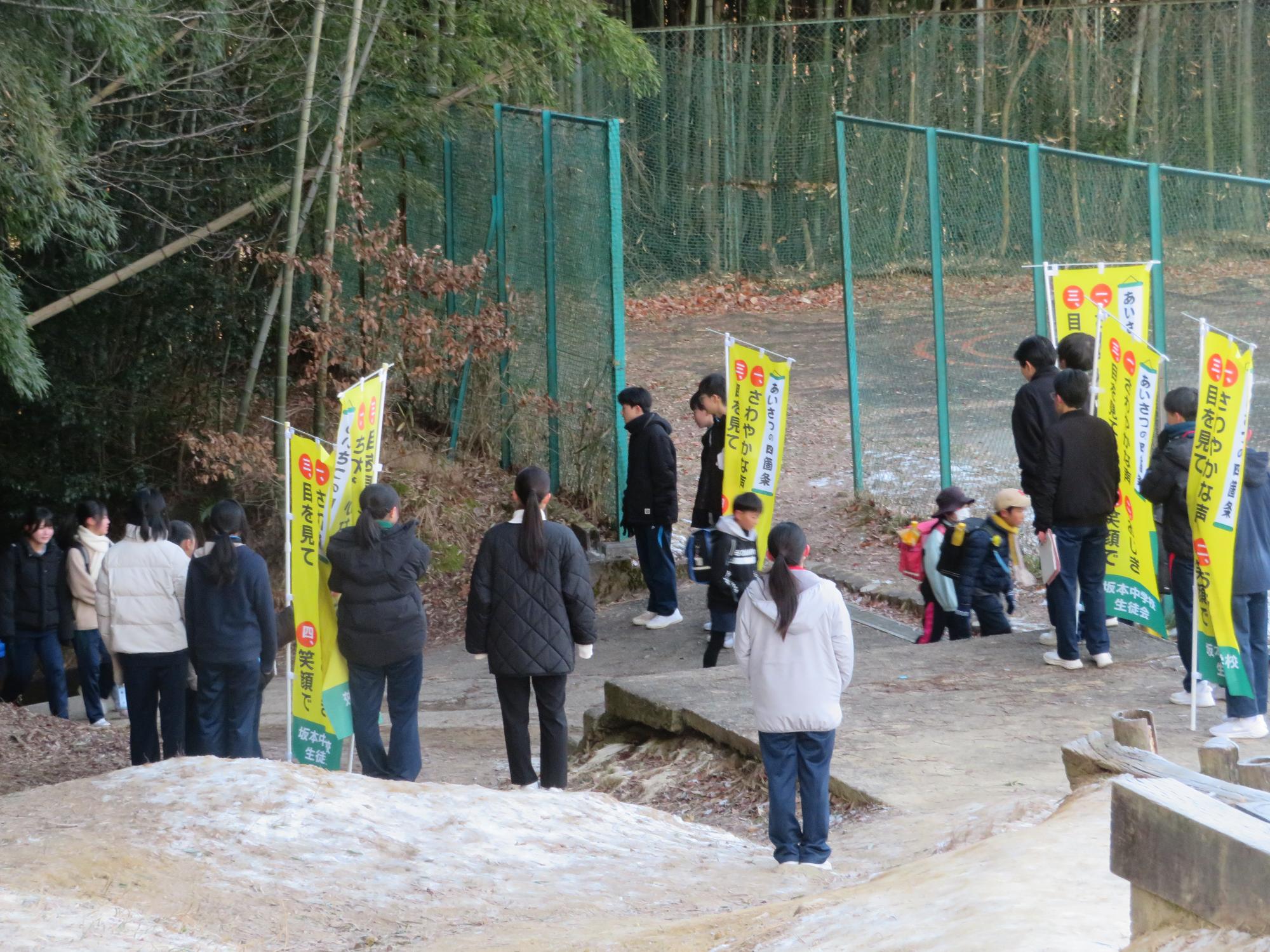 坂中生のボランティアの姿が随所に見られます。まずは朝、外気温3℃の中、7:30に決められた場所に立ち、あいさつボランティアを行う生徒が70名ほどいました。「今日は、目を見て笑顔であいさつすることにこだわりましょう。」という生徒会執行部の呼びかけにつながり、地域の方とともにボランティアを行う姿が見られました。そして昼休み。凍って滑る校舎前の道路を、スコップやほうきできれいにしてくれる2年生ボランティア30名の姿も見られました。するとよいことを判断し、ボランティアの心を姿で示していける坂中生が増えていることにうれしさを感じます。
