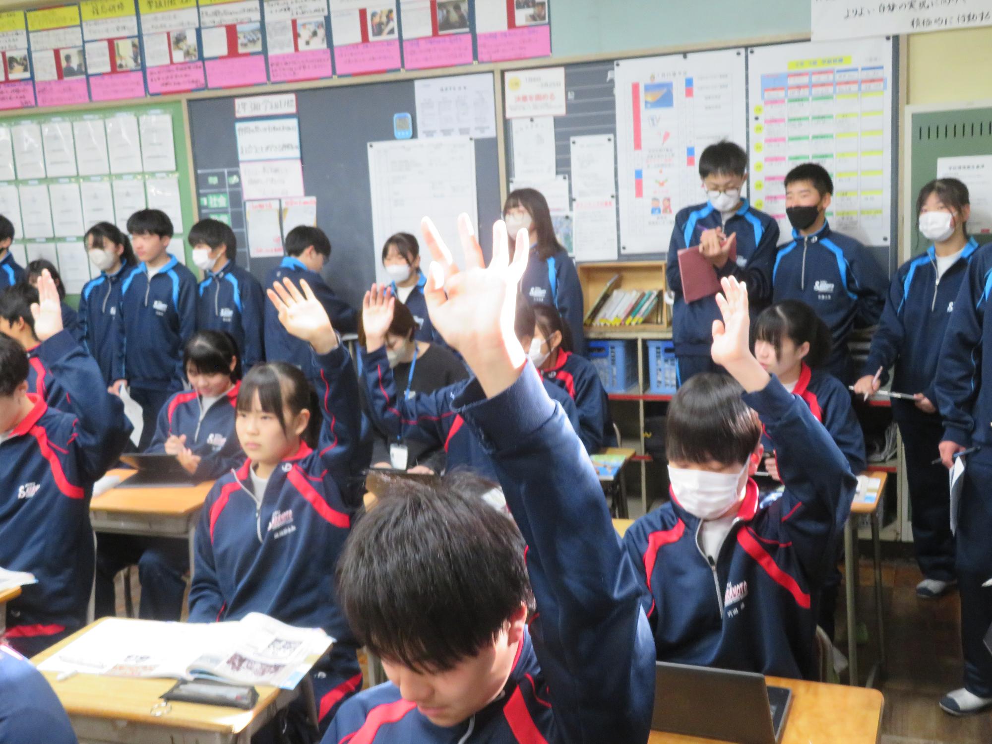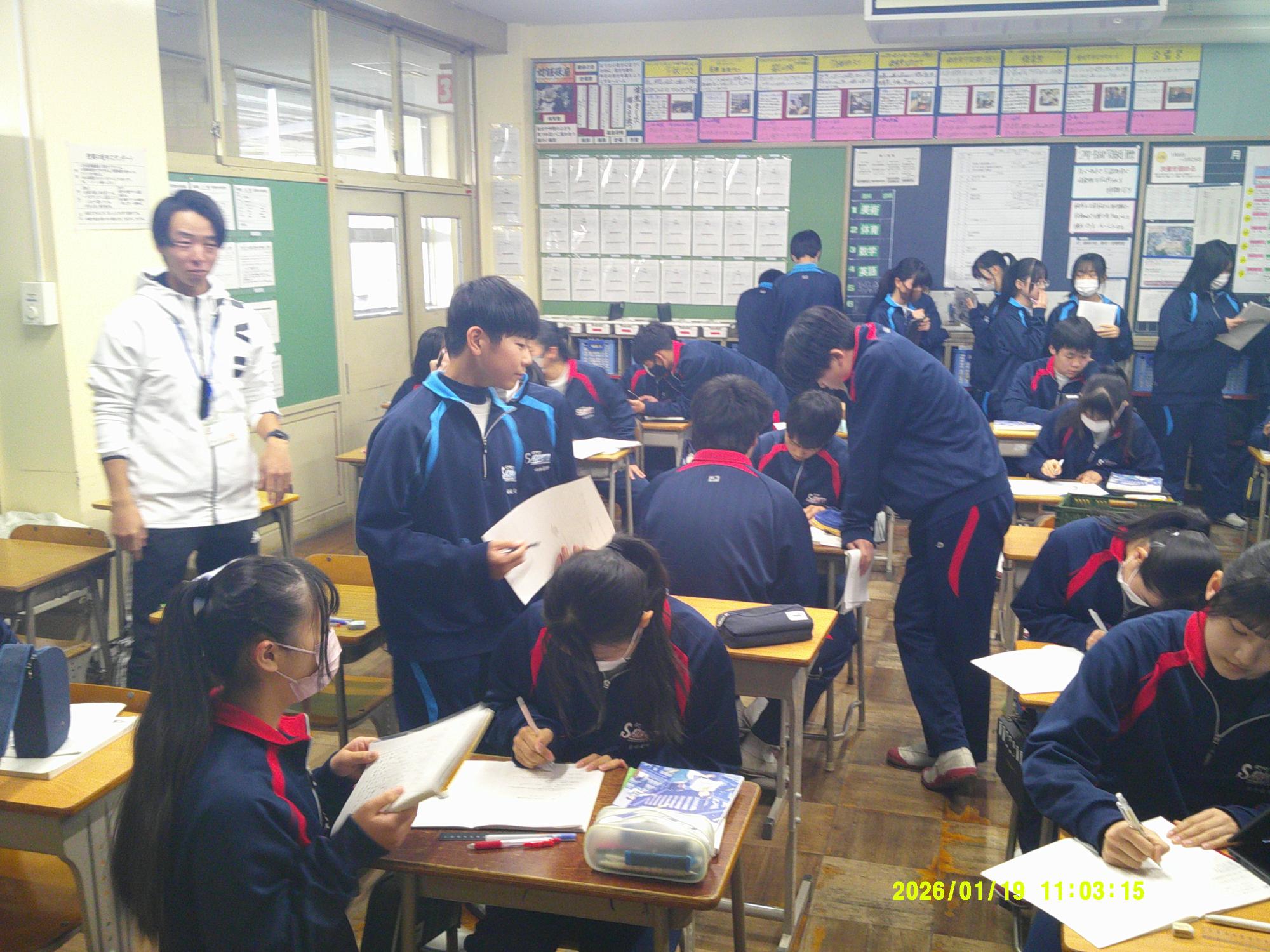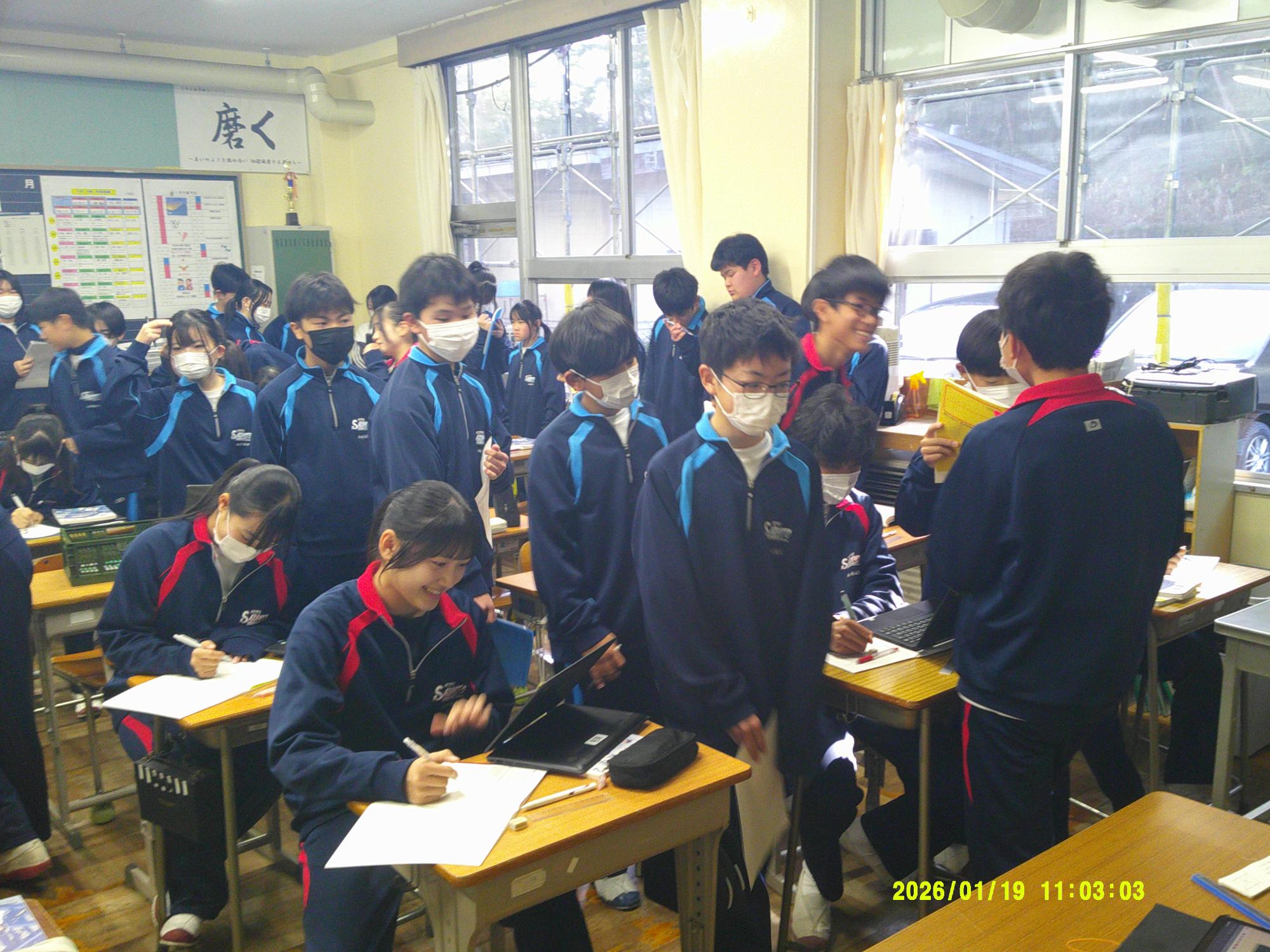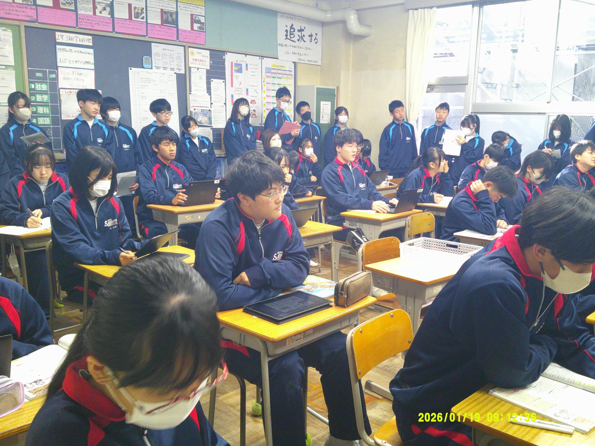 学習委員会が授業交流会を企画しました。ねらいは、1つ上の先輩の授業を参観し、よさを学びながら次年度の授業の向上に生かすと設定されています。今日はその一日目。2年生が1年生に授業を公開しました。ねらいを意識し、参観する生徒は真剣に授業を見て、先輩のよさをビッシリと記録していました。先輩たちも参観されることを意識しながら、一生懸命に取り組むことのかっこよさを示そうと授業に取り組んでいました。生徒同士が授業を高め合う活動を企画した学習委員会の意気込みは大変うれしいものです。