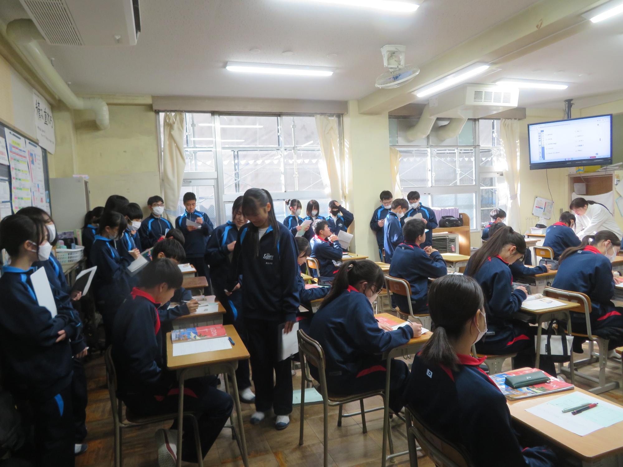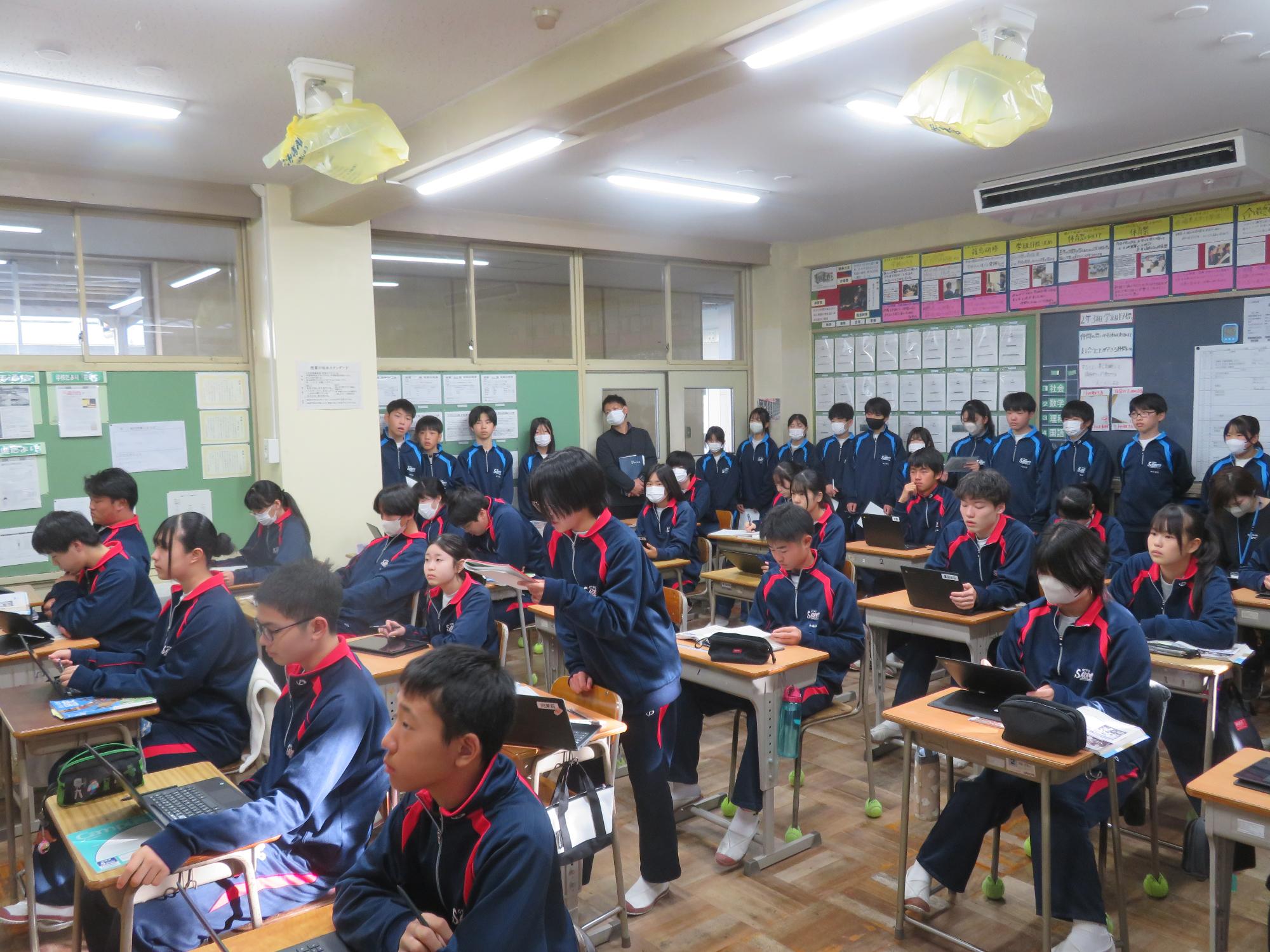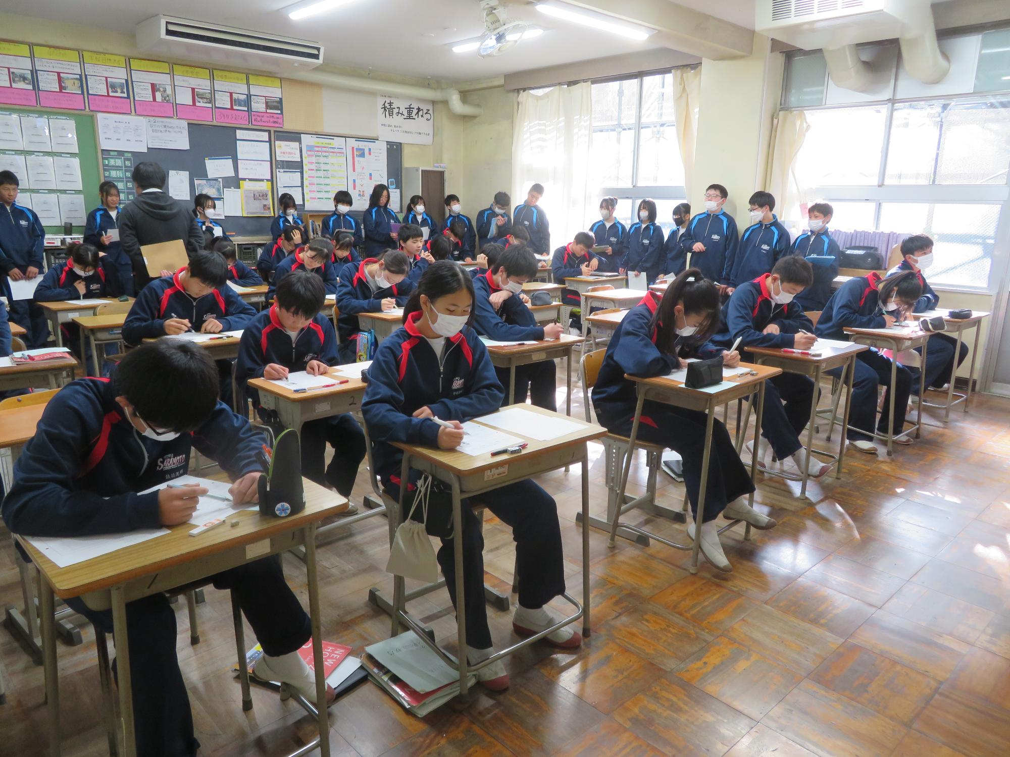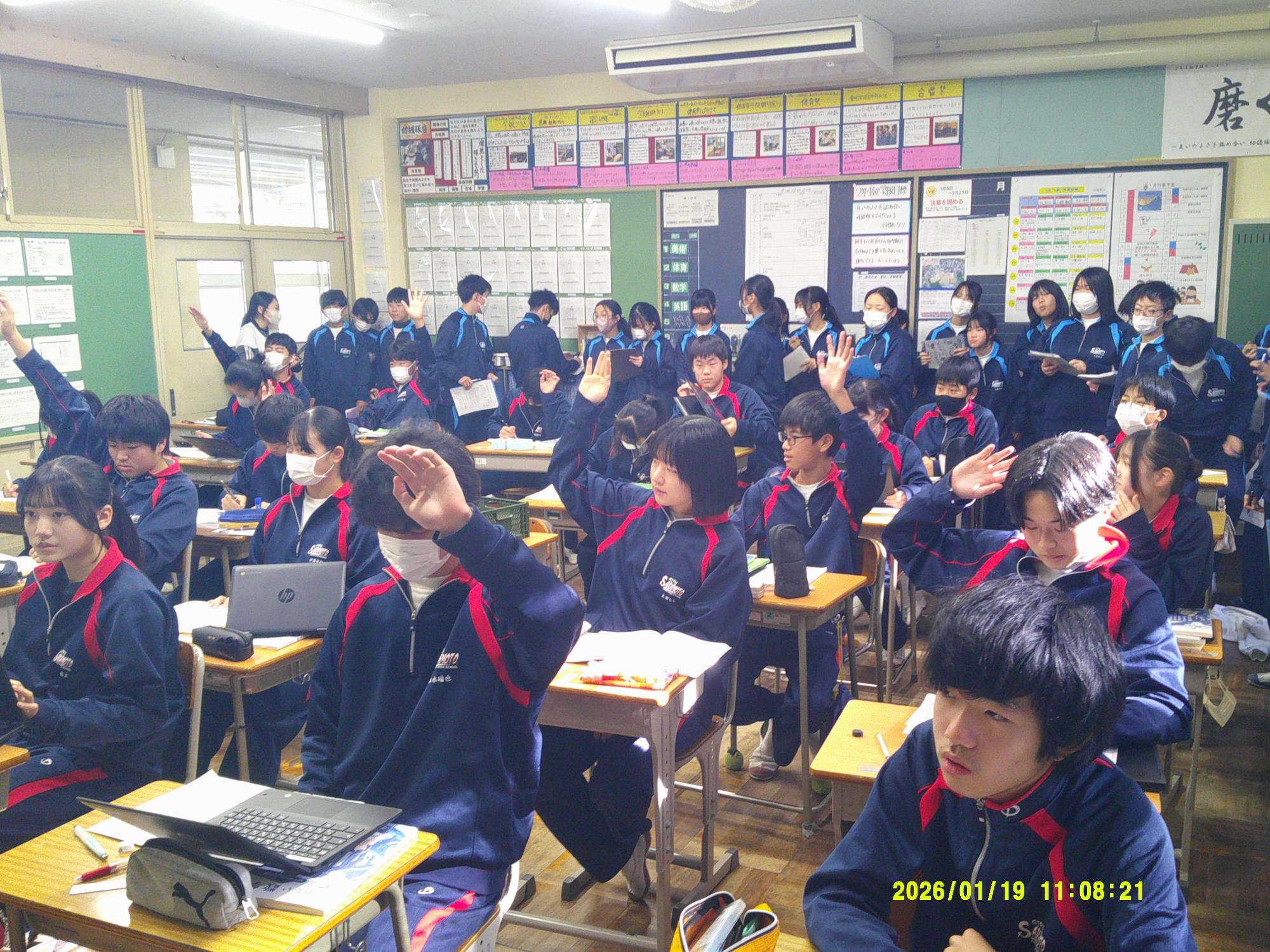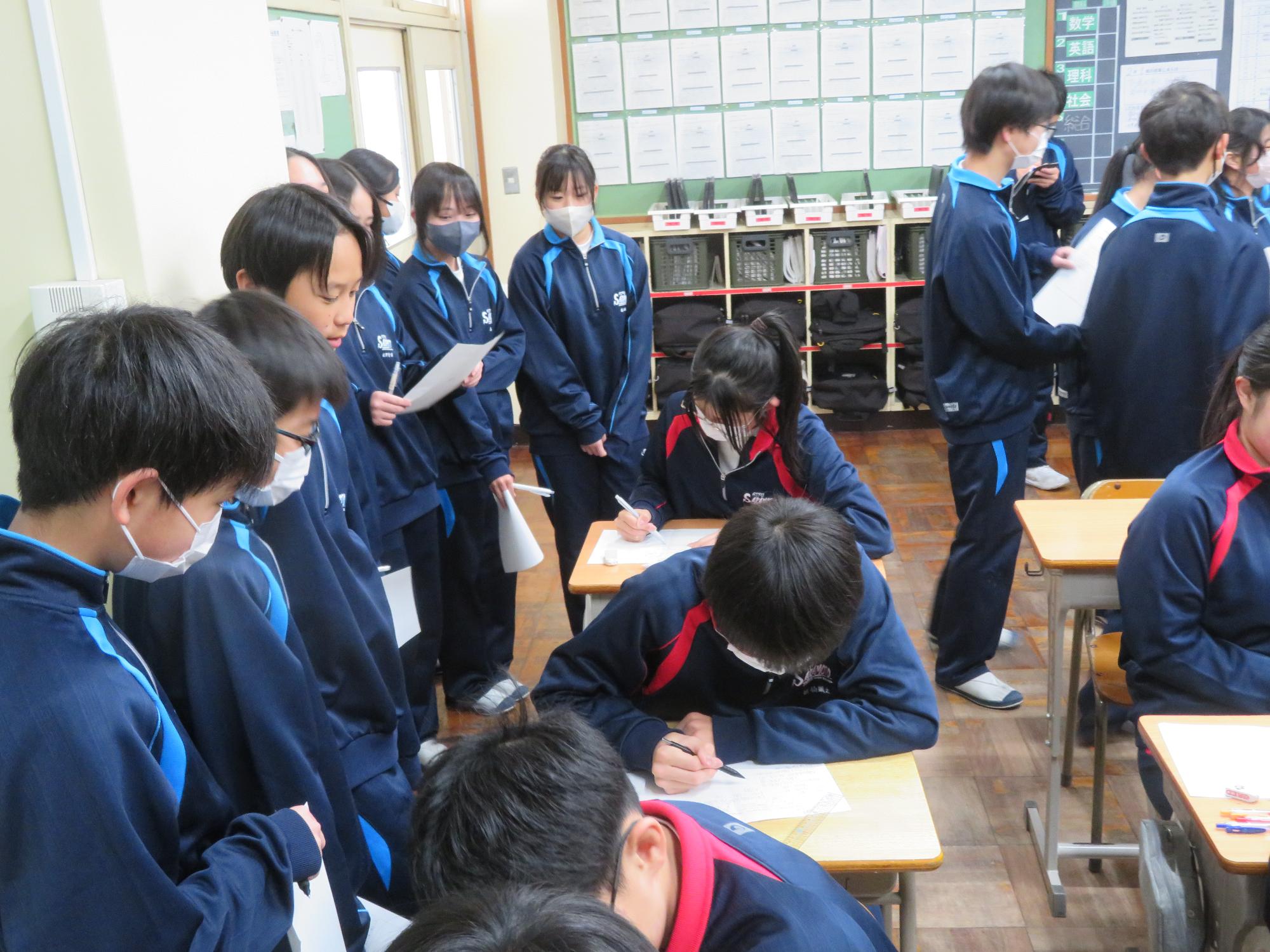 学習委員会が授業交流会を企画しました。ねらいは、1つ上の先輩の授業を参観し、よさを学びながら次年度の授業の向上に生かすと設定されています。今日はその一日目。2年生が1年生に授業を公開しました。ねらいを意識し、参観する生徒は真剣に授業を見て、先輩のよさをビッシリと記録していました。先輩たちも参観されることを意識しながら、一生懸命に取り組むことのかっこよさを示そうと授業に取り組んでいました。生徒同士が授業を高め合う活動を企画した学習委員会の意気込みは大変うれしいものです。