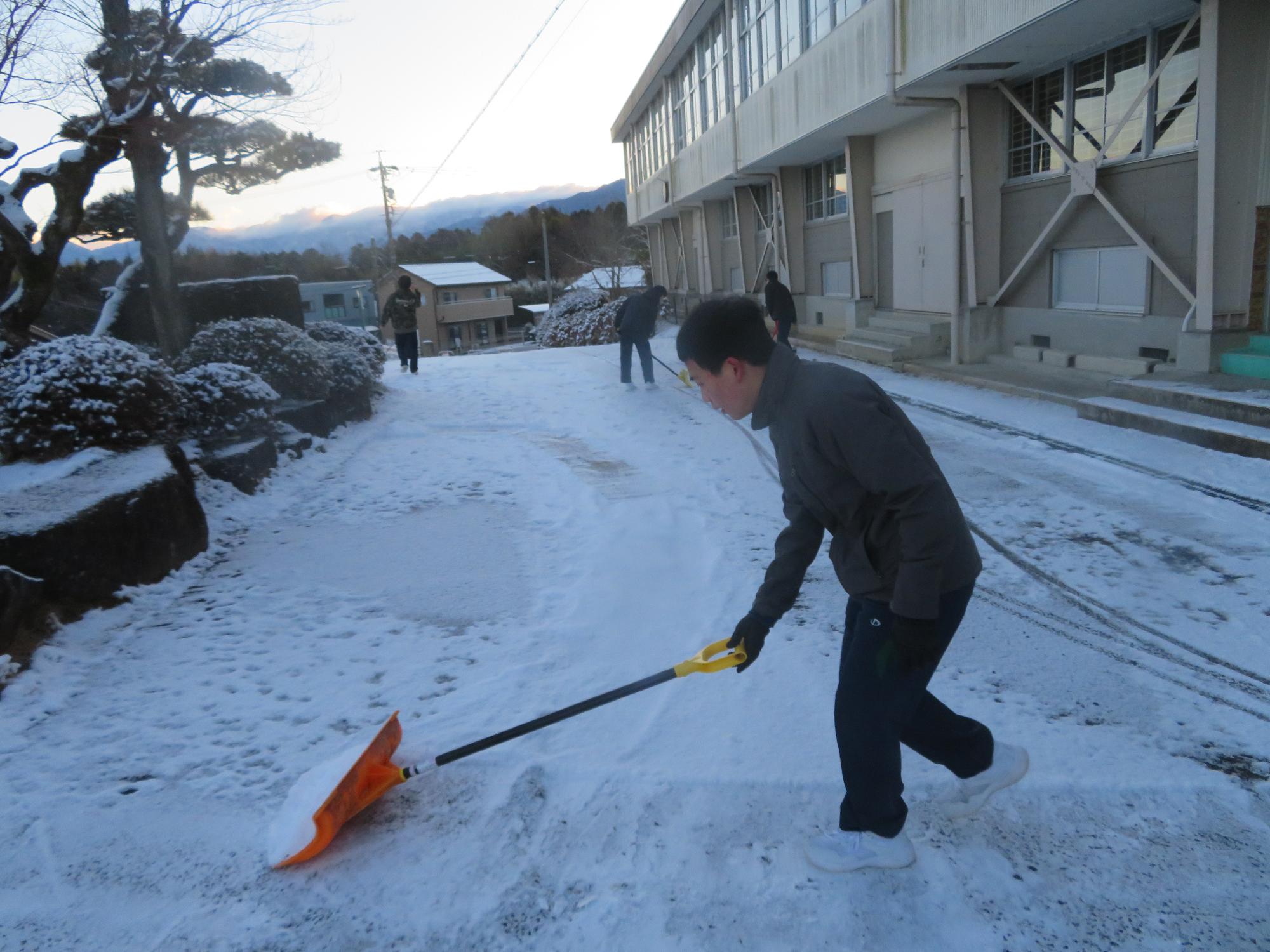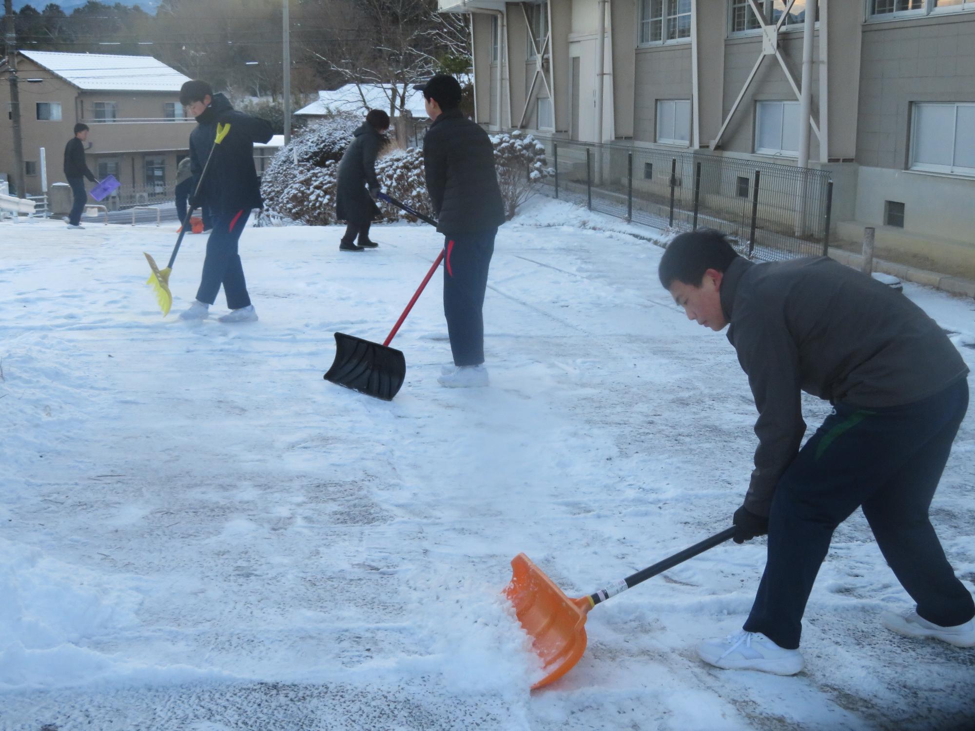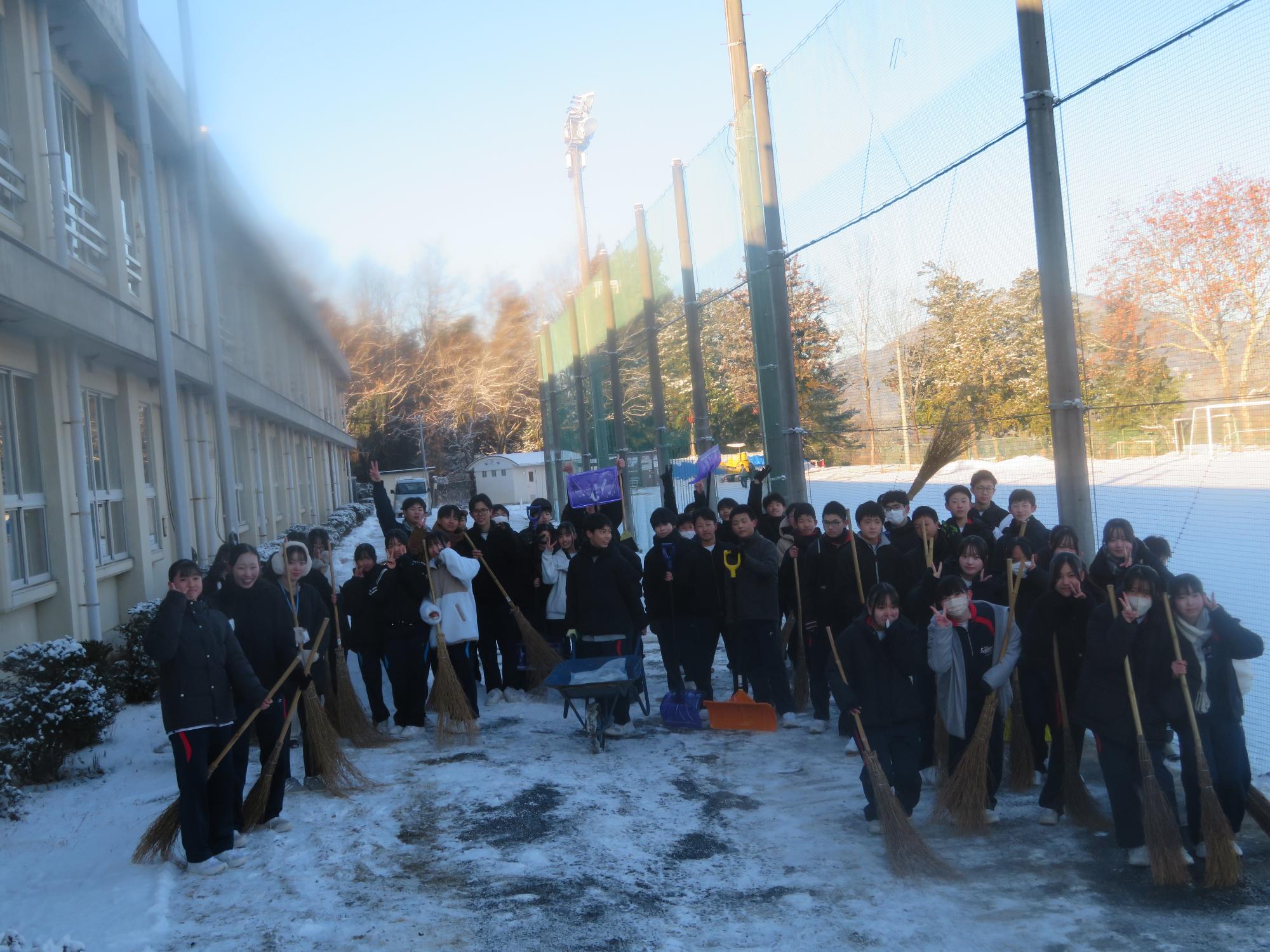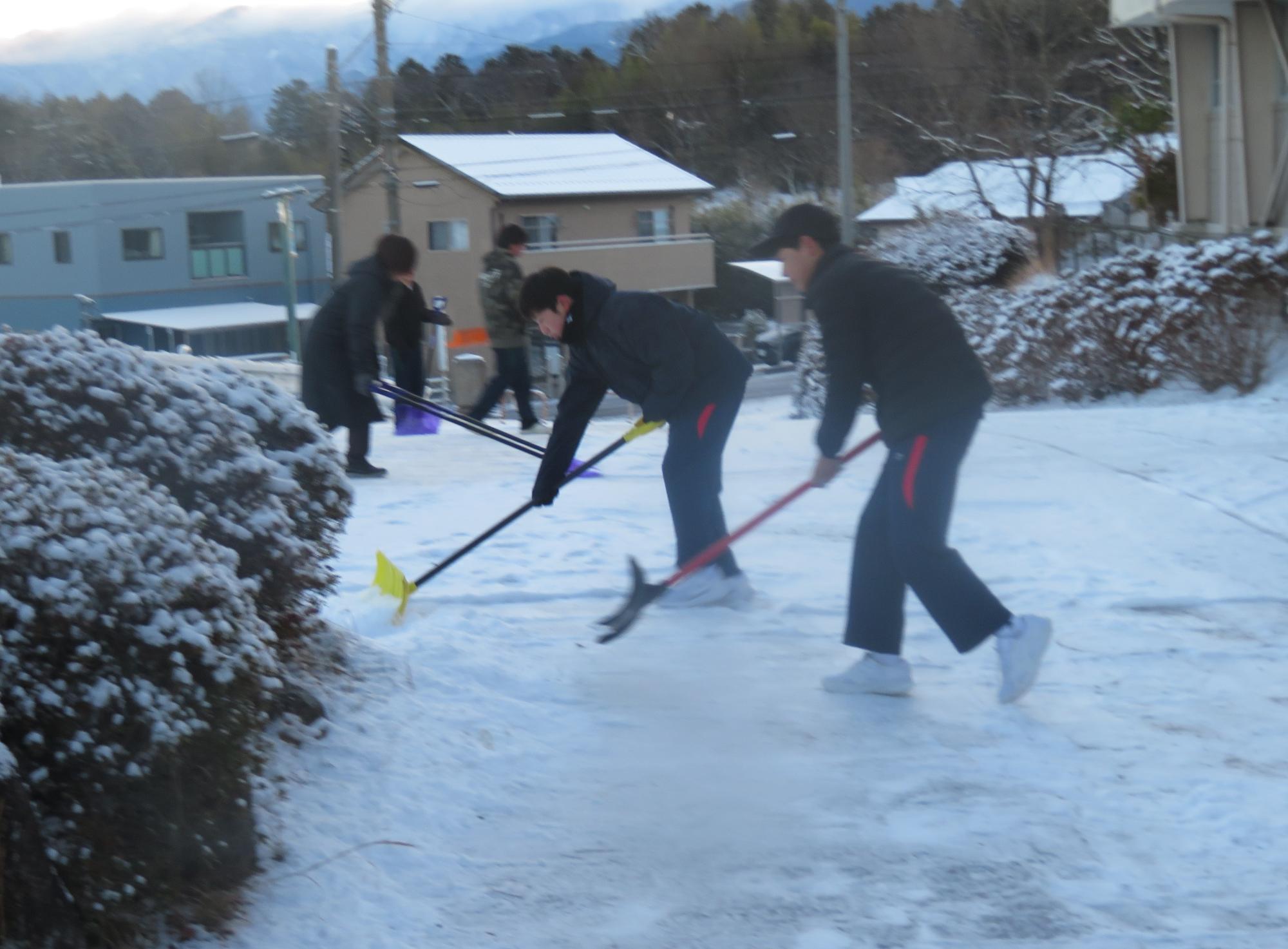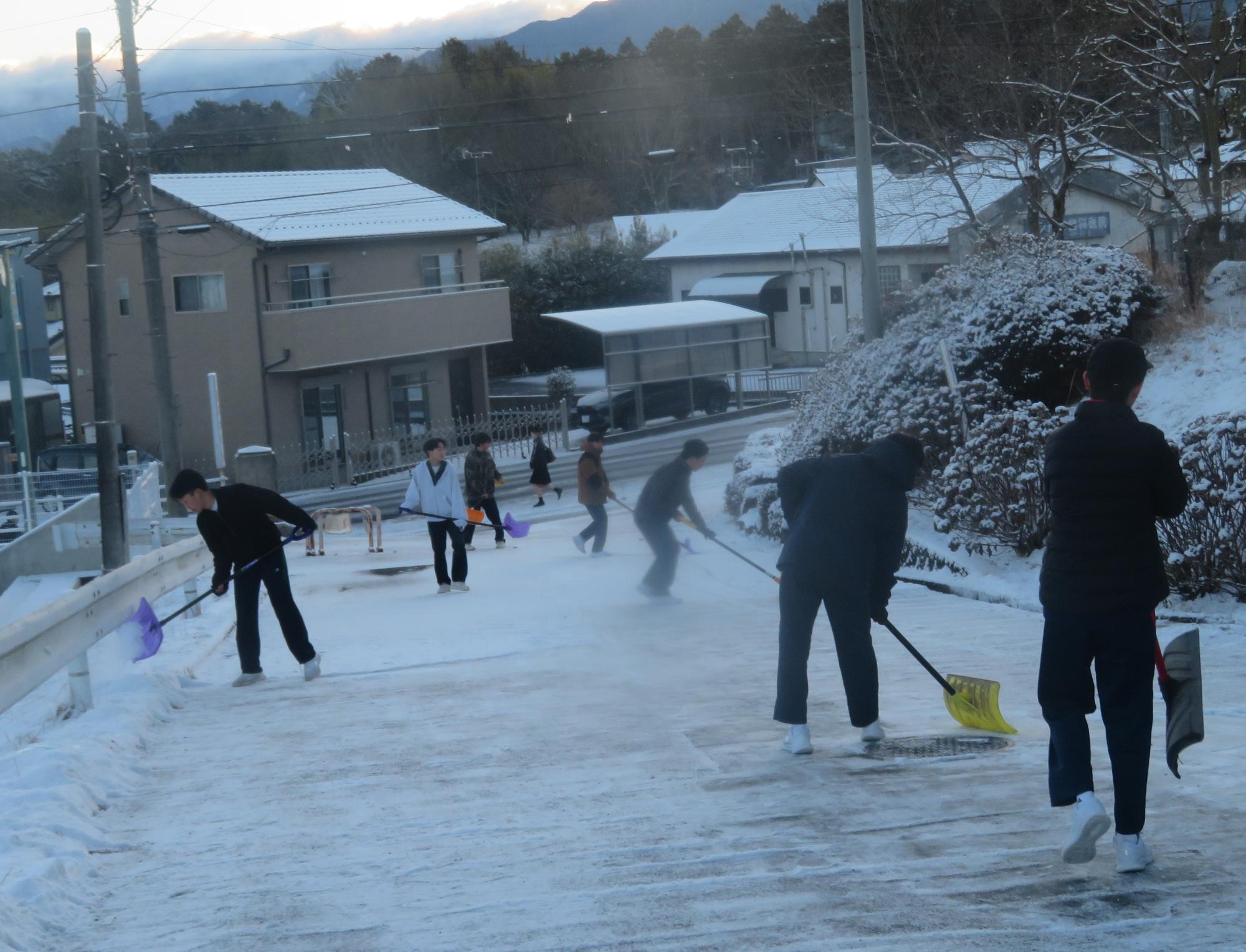 朝7:30校舎のまわりは雪で真っ白。そんな中、「雪かきします!」と生徒会執行部の新江くんと植田くんから始まった雪かきボランティア。登校する生徒の中で、自主的に雪かきに参加する生徒が増え、7:50には100人以上の生徒が雪かきボランティアに参加してくれました。スコップで雪をかく生徒、ほうきで雪を掃く生徒。教員がまこうとしていた融雪剤を「融雪剤をまきますよ。」とかわってくれる生徒。雪かきボランティアを自主的に行ってくれた生徒に感謝、感謝です。確実にボランティアの心や思いやりの心が育っている頼もしい坂中生徒の姿がそこにはありました。