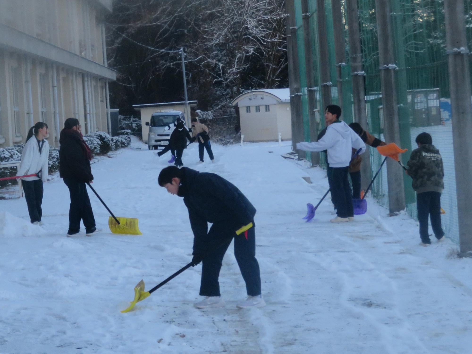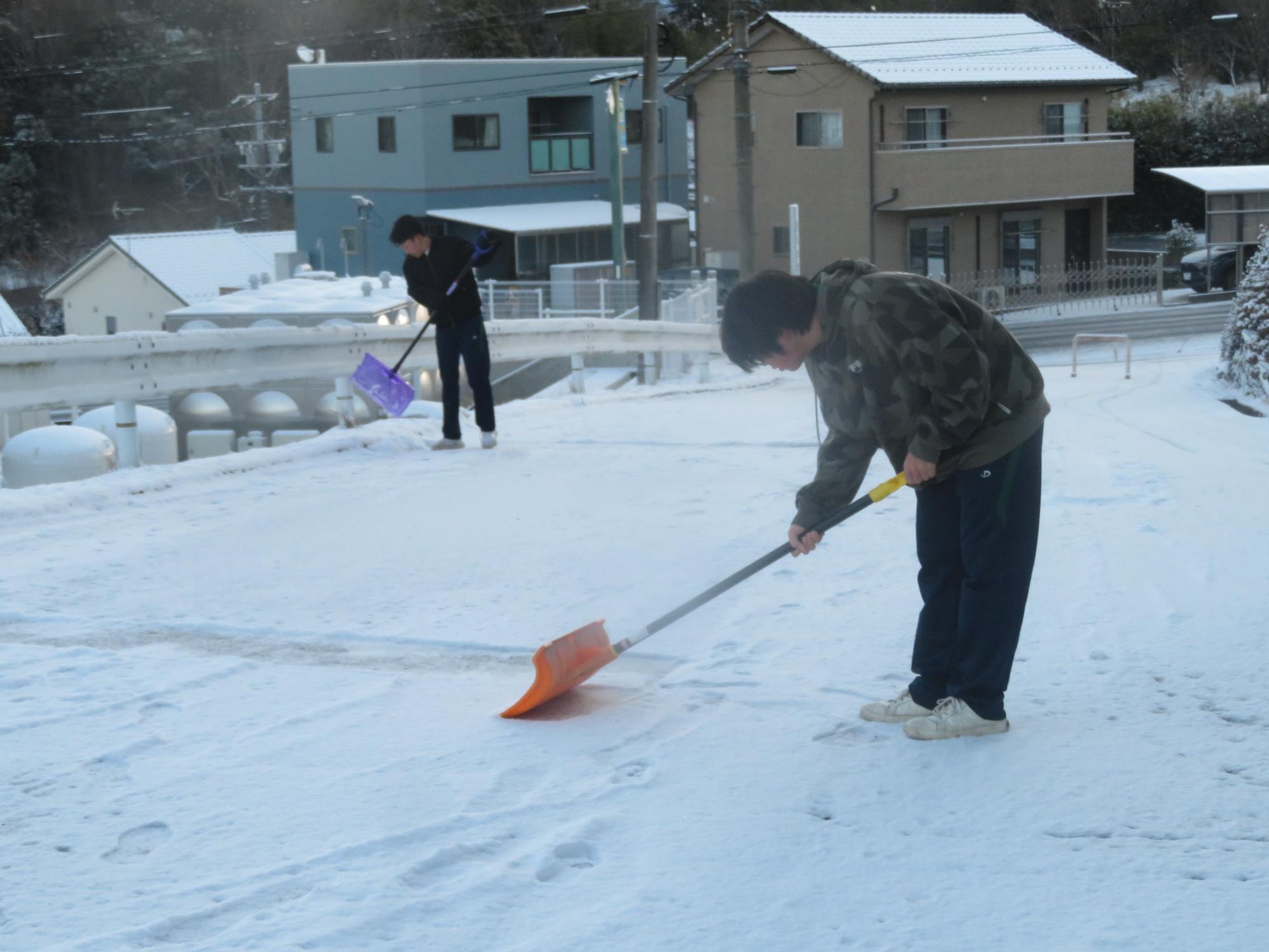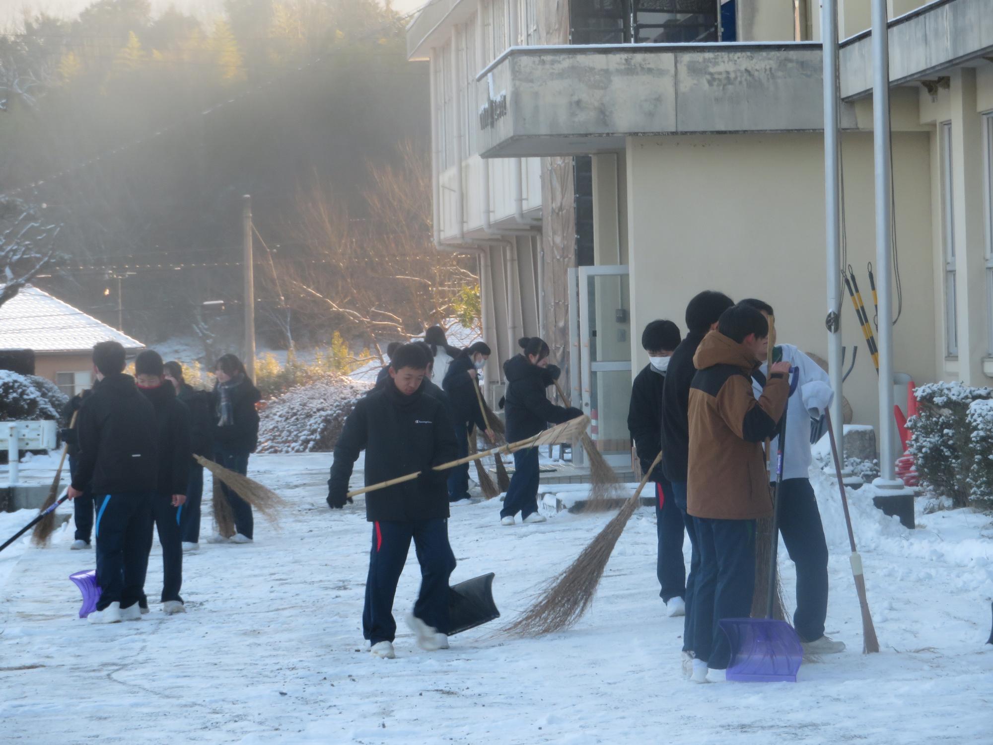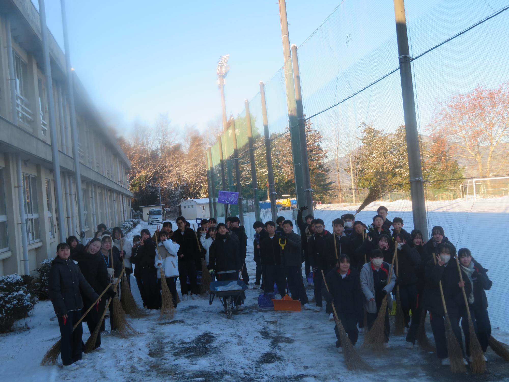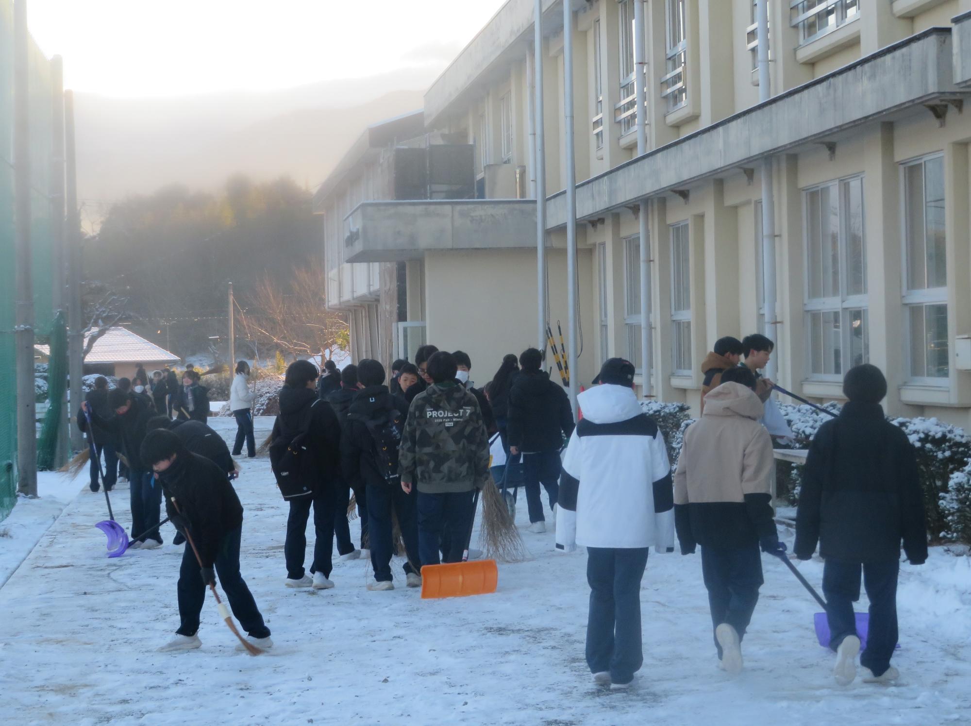 朝7:30校舎のまわりは雪で真っ白。そんな中、「雪かきします!」と生徒会執行部の新江くんと植田くんから始まった雪かきボランティア。登校する生徒の中で、自主的に雪かきに参加する生徒が増え、7:50には100人以上の生徒が雪かきボランティアに参加してくれました。スコップで雪をかく生徒、ほうきで雪を掃く生徒。教員がまこうとしていた融雪剤を「融雪剤をまきますよ。」とかわってくれる生徒。雪かきボランティアを自主的に行ってくれた生徒に感謝、感謝です。確実にボランティアの心や思いやりの心が育っている頼もしい坂中生徒の姿がそこにはありました。