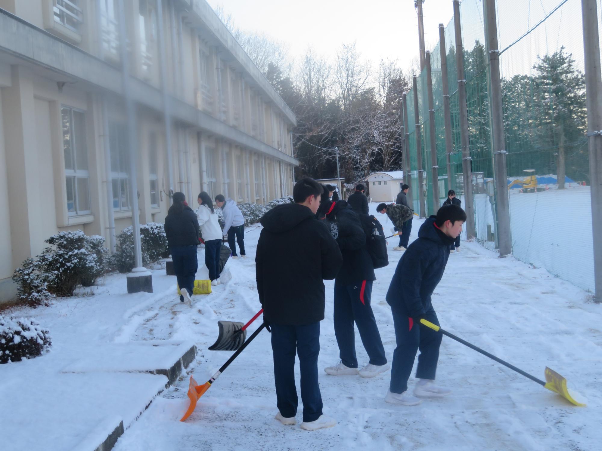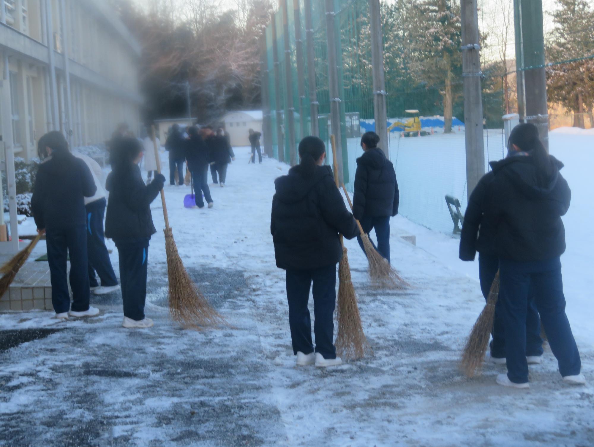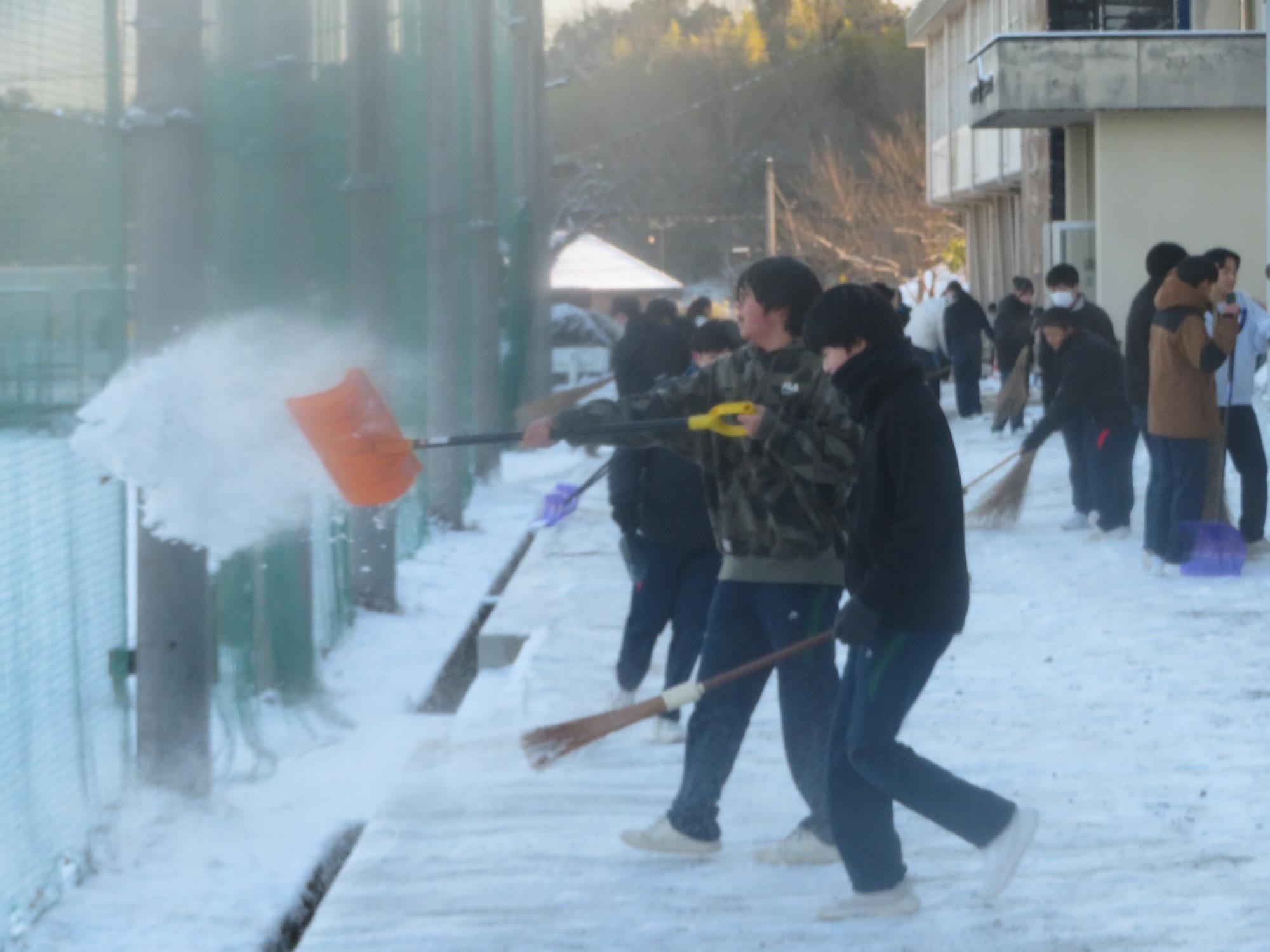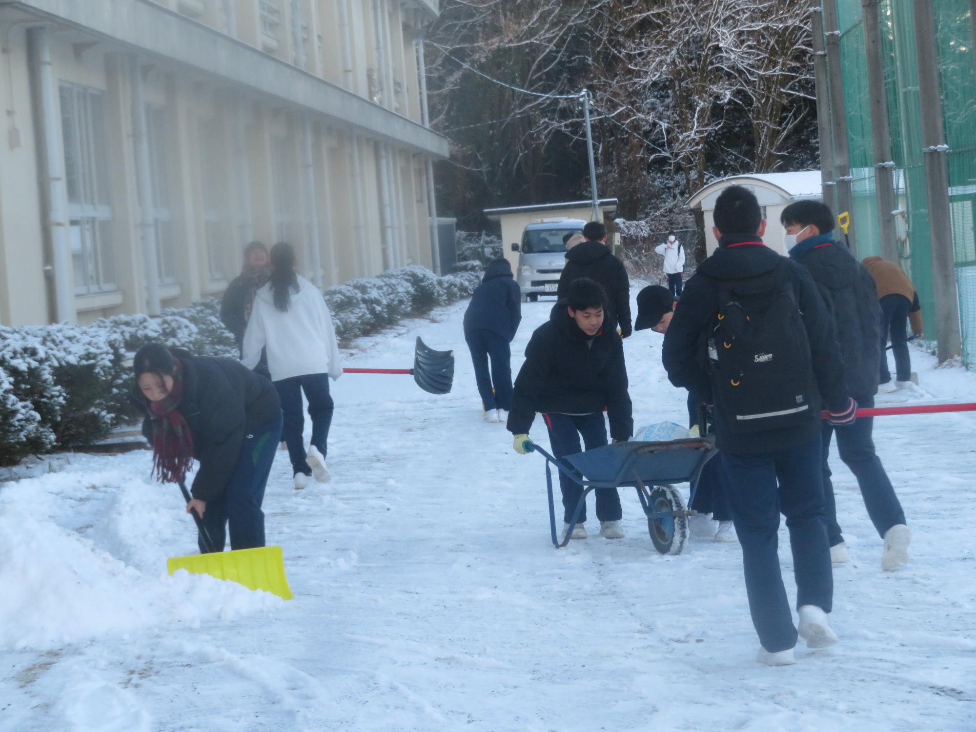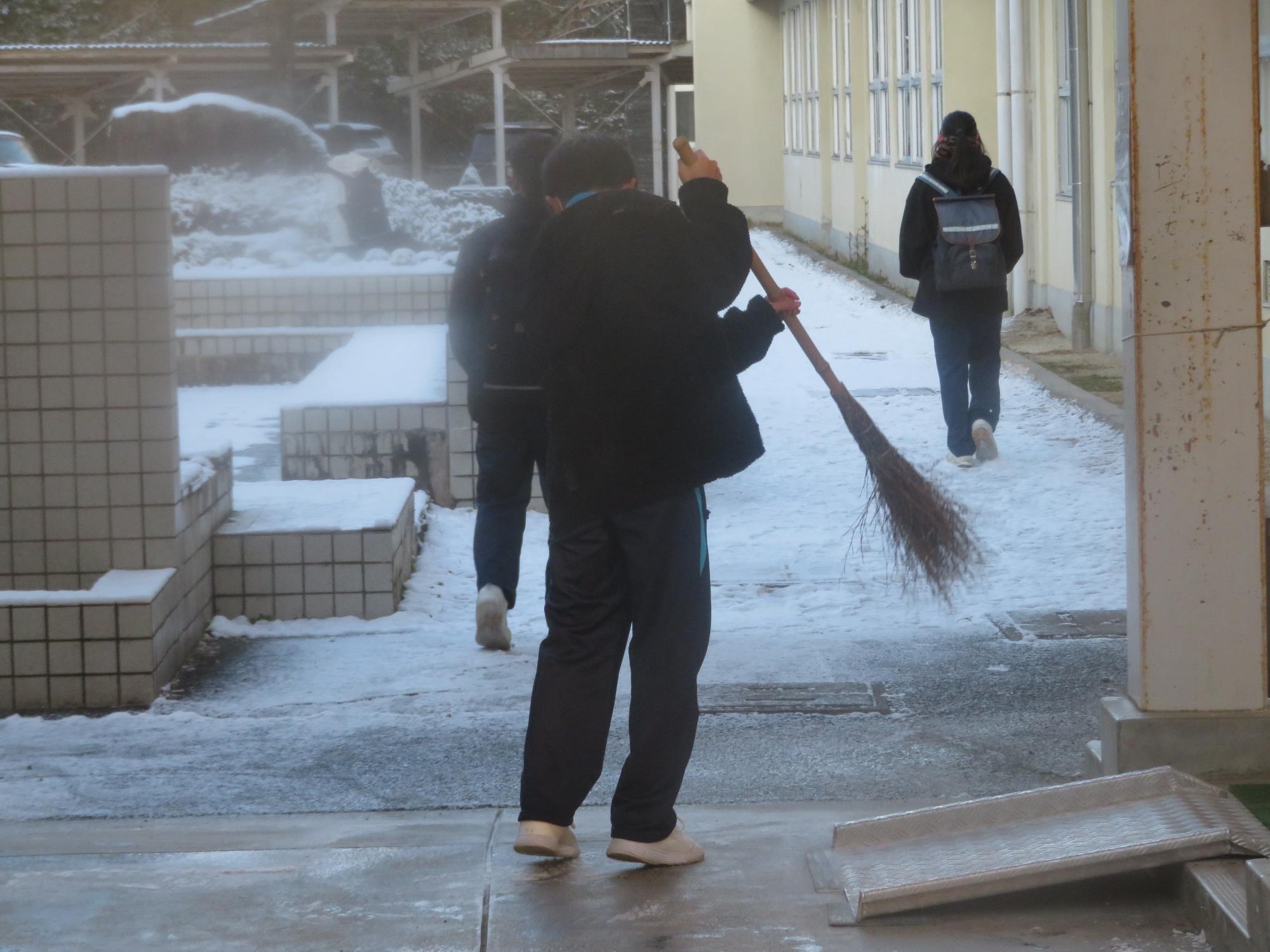 朝7:30校舎のまわりは雪で真っ白。そんな中、「雪かきします!」と生徒会執行部の新江くんと植田くんから始まった雪かきボランティア。登校する生徒の中で、自主的に雪かきに参加する生徒が増え、7:50には100人以上の生徒が雪かきボランティアに参加してくれました。スコップで雪をかく生徒、ほうきで雪を掃く生徒。教員がまこうとしていた融雪剤を「融雪剤をまきますよ。」とかわってくれる生徒。雪かきボランティアを自主的に行ってくれた生徒に感謝、感謝です。確実にボランティアの心や思いやりの心が育っている頼もしい坂中生徒の姿がそこにはありました。
