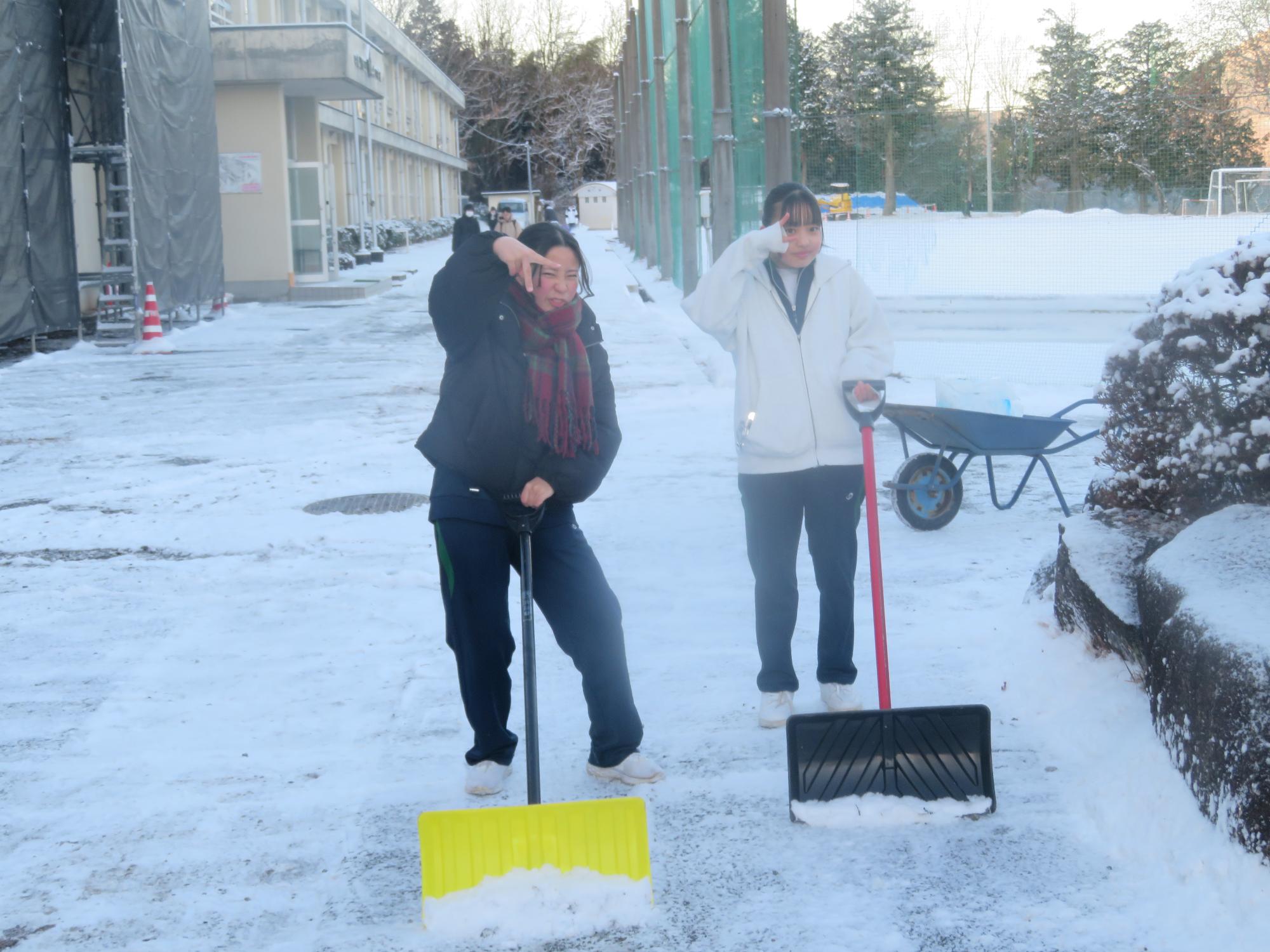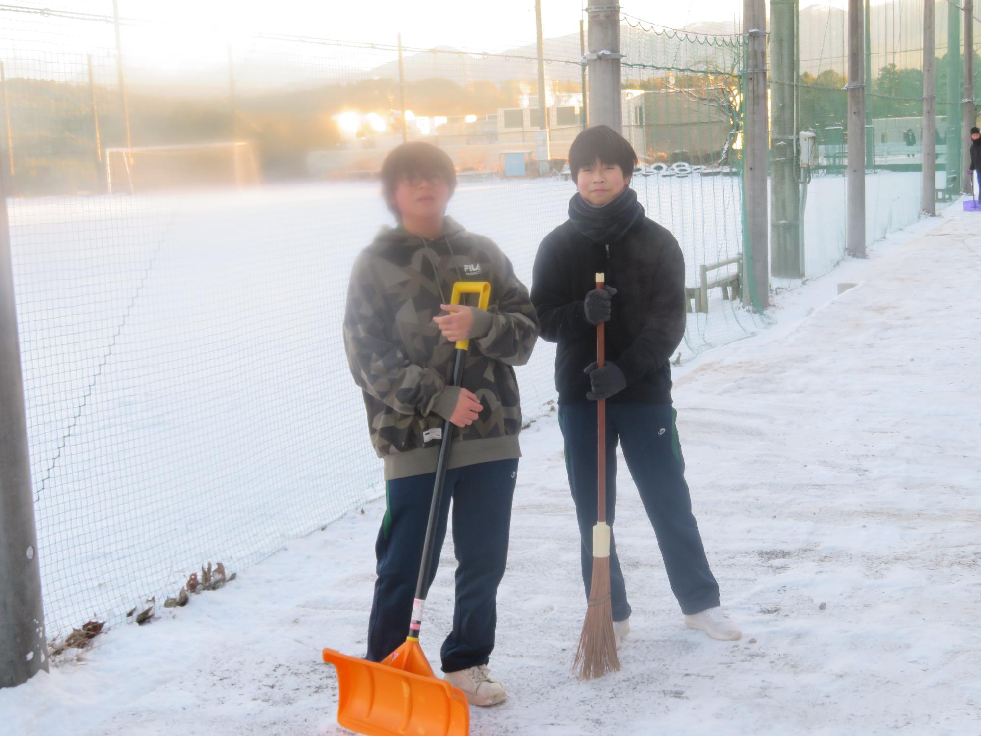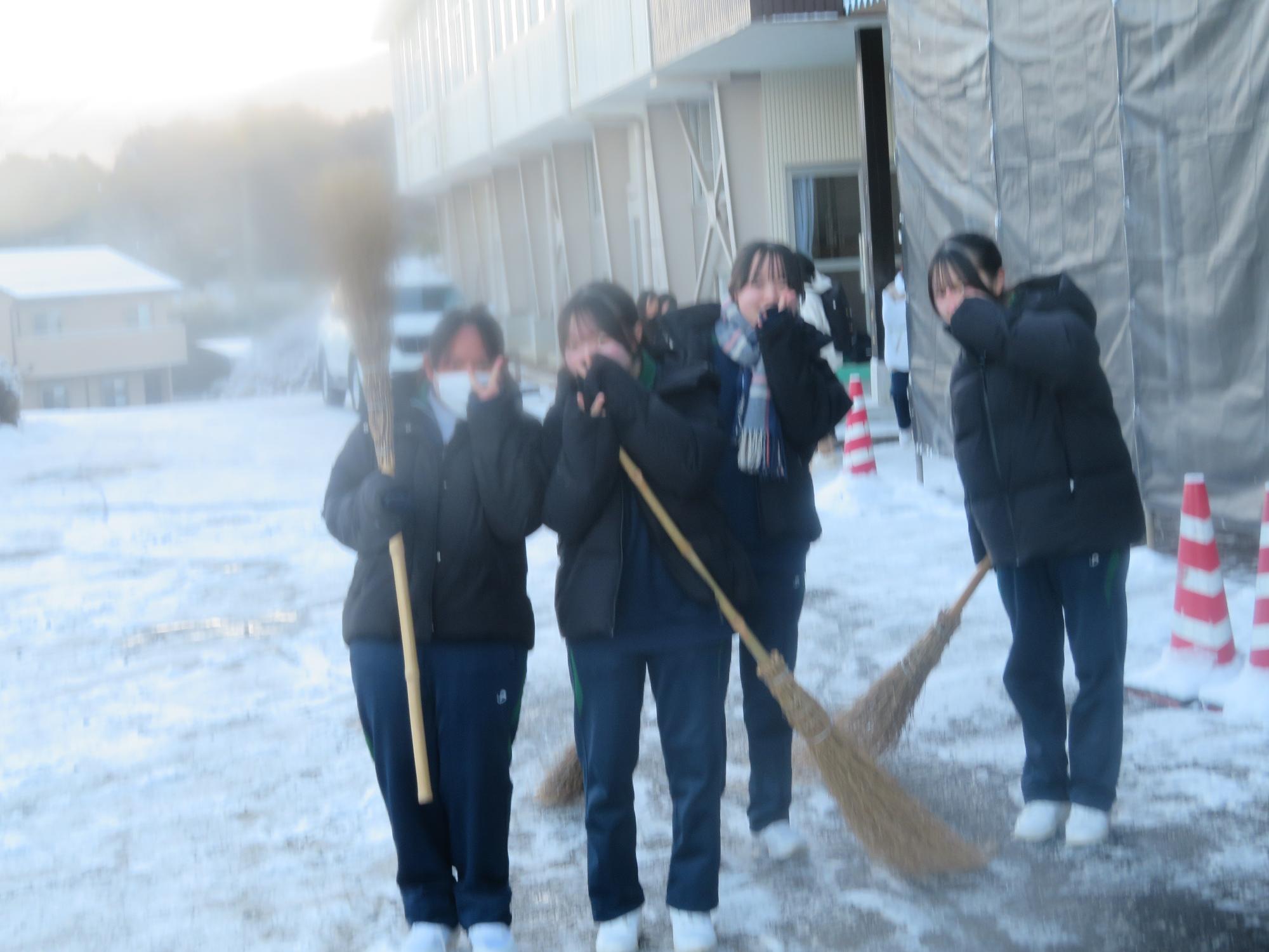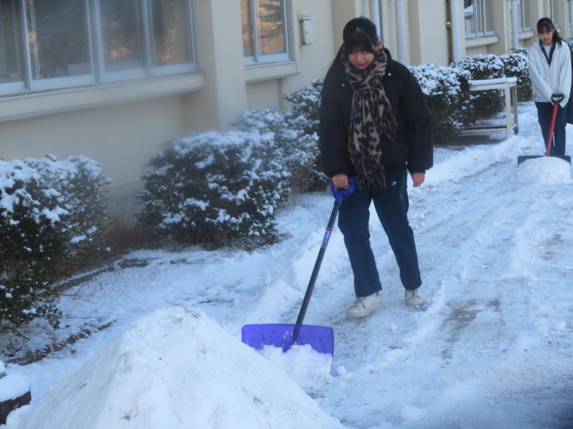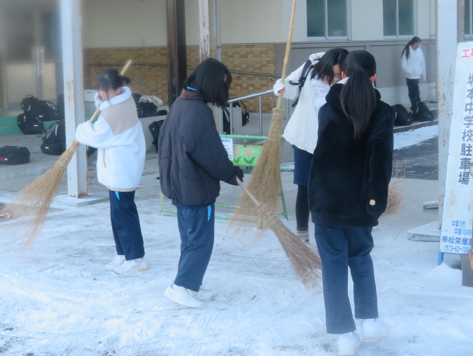 朝7:30校舎のまわりは雪で真っ白。そんな中、「雪かきします!」と生徒会執行部の新江くんと植田くんから始まった雪かきボランティア。登校する生徒の中で、自主的に雪かきに参加する生徒が増え、7:50には100人以上の生徒が雪かきボランティアに参加してくれました。スコップで雪をかく生徒、ほうきで雪を掃く生徒。教員がまこうとしていた融雪剤を「融雪剤をまきますよ。」とかわってくれる生徒。雪かきボランティアを自主的に行ってくれた生徒に感謝、感謝です。確実にボランティアの心や思いやりの心が育っている頼もしい坂中生徒の姿がそこにはありました。