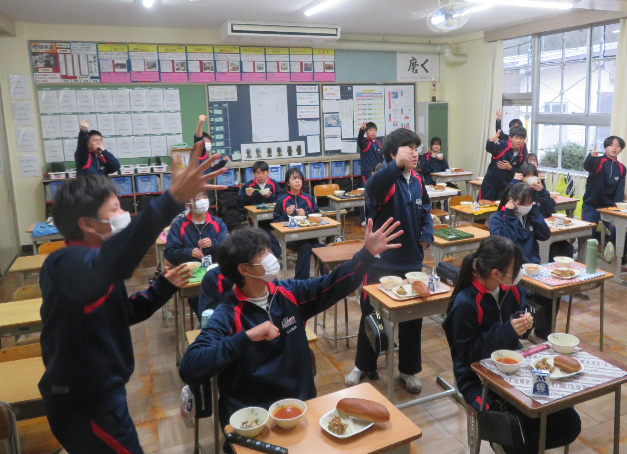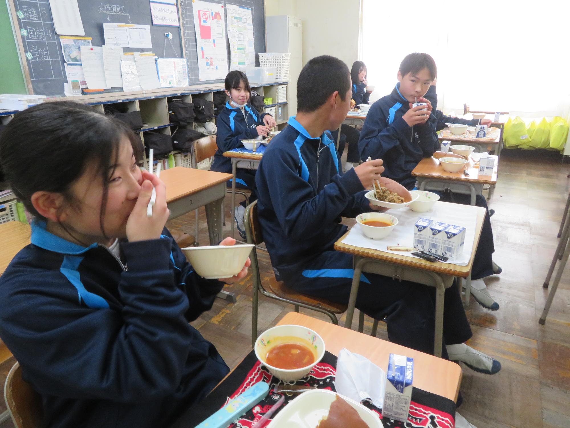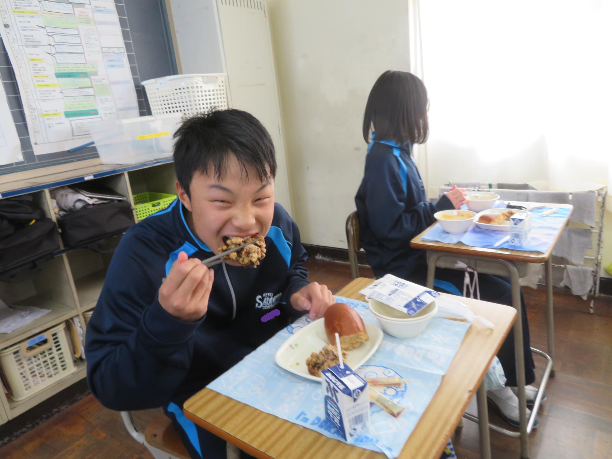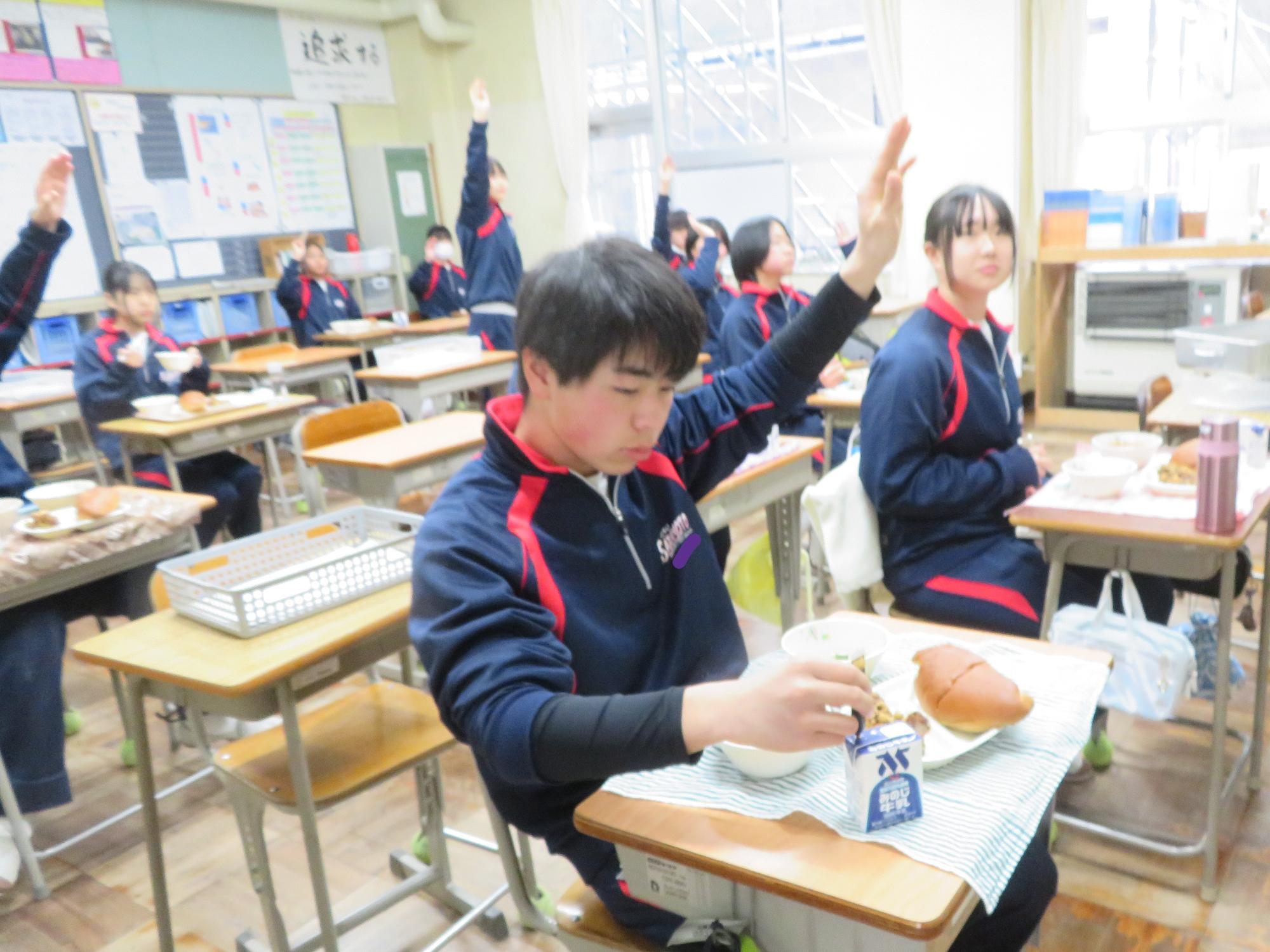 坂本中でもインフルエンザの流行が見られます。1、2年生で合計70人ほどの欠席者が出ました。校医さんと相談し、明日と明後日、感染防止のための1、2年生を学年閉鎖としました。下校前、1、2年生は今日の給食のブラジル料理を食べて栄養をつけました。欠席者がいるので、いつも以上に給食を食べ栄養UPです。2日間、ゆっくり休養し体調を整えていくことを願っています。