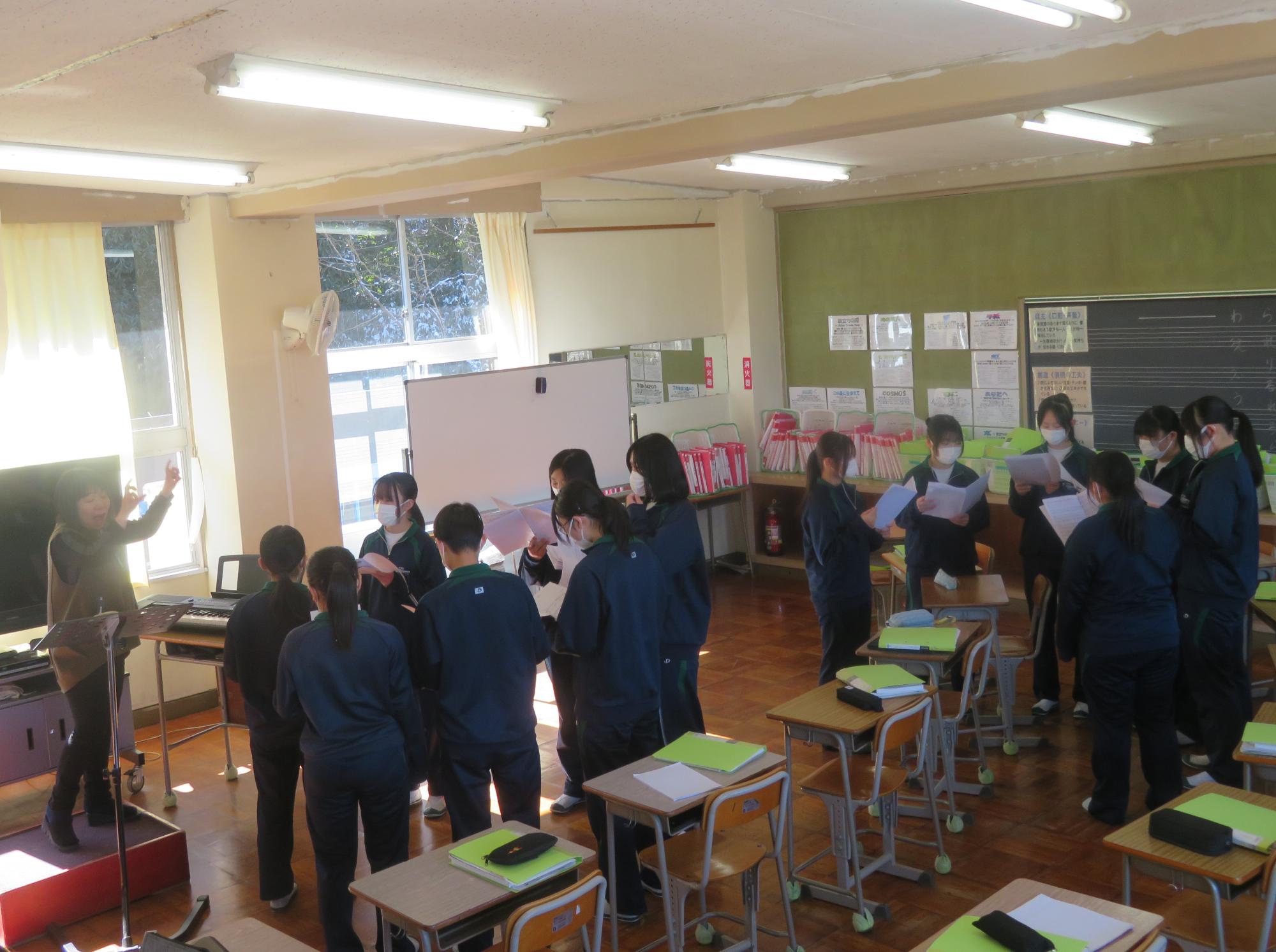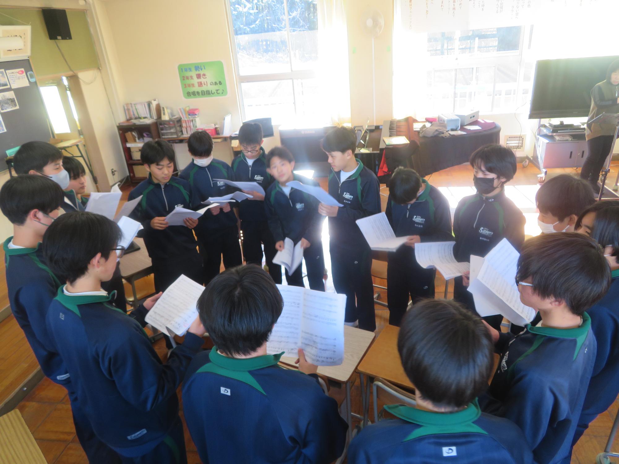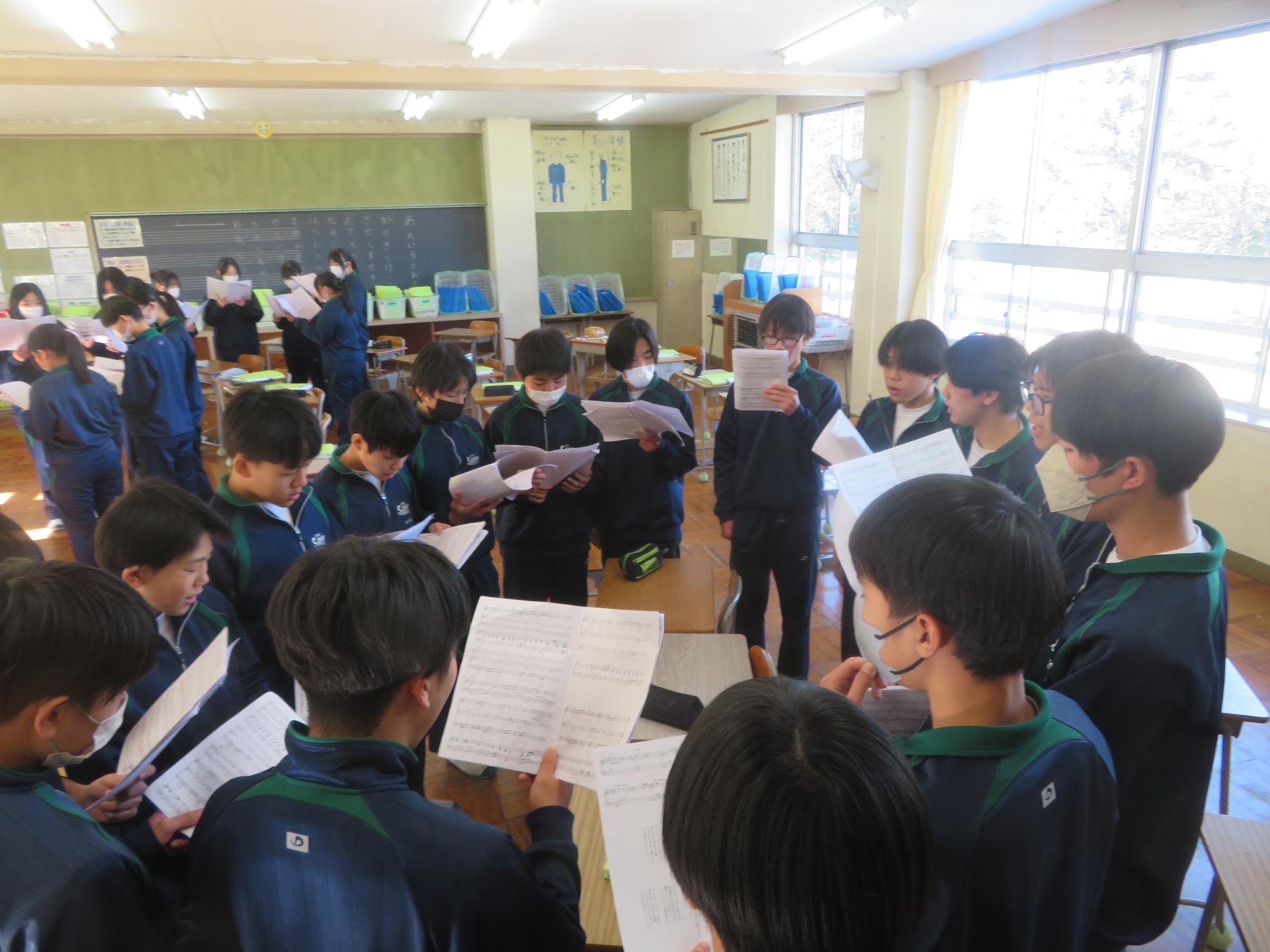 卒業式の式歌練習に力を込める3年生
