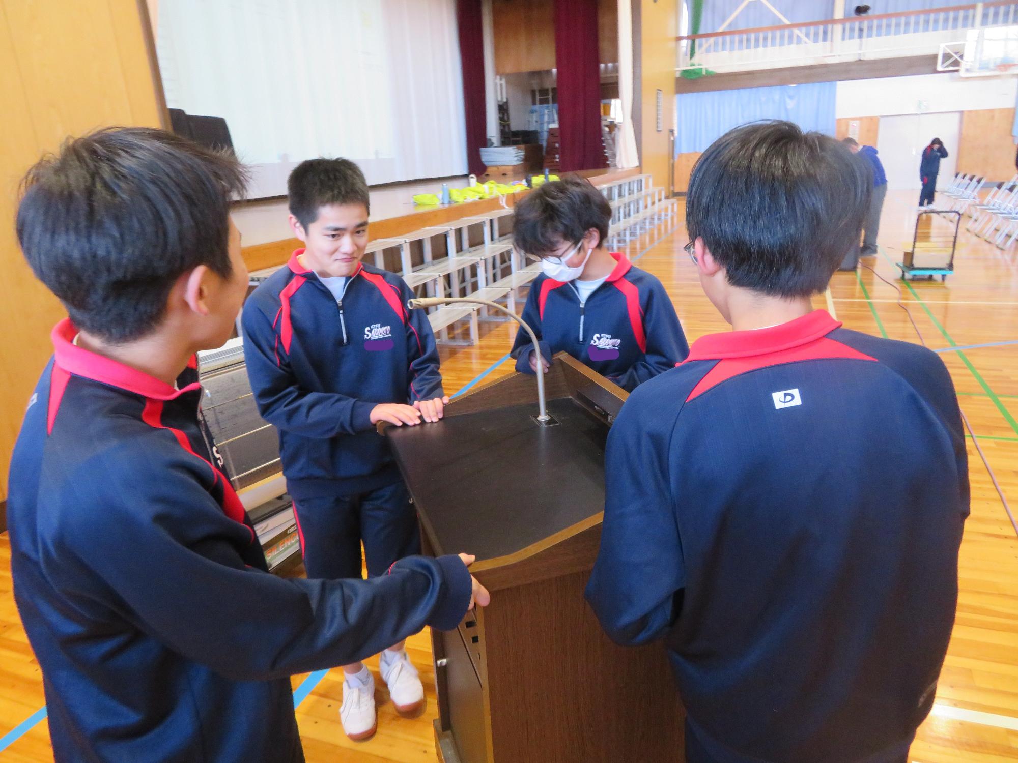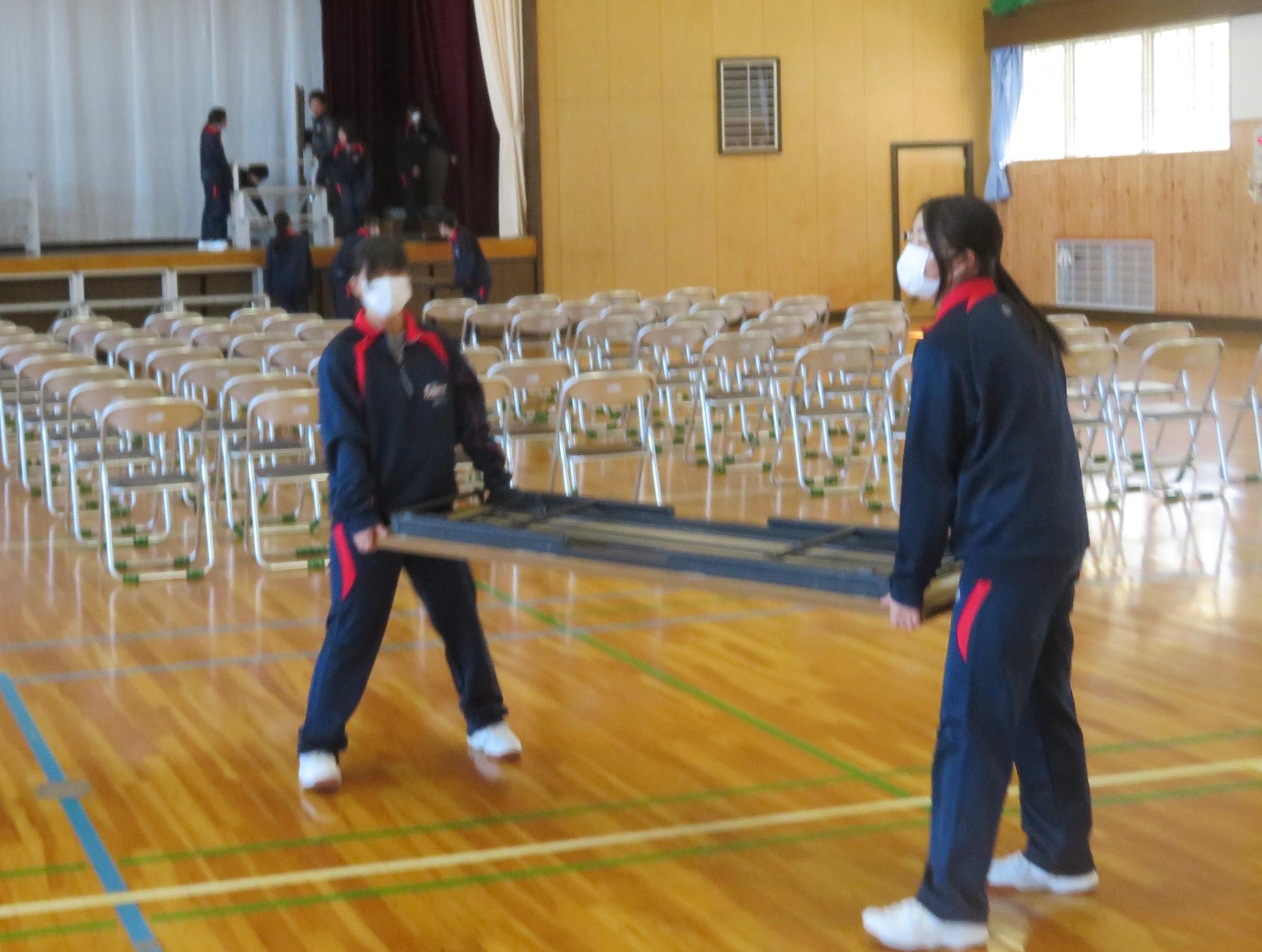 来年度に向けての新入生保護者向きの説明会を行いました。それに関わり、2年1組の生徒が自主的に体育館の準備を行ってくれました。「助かるよ。」とお礼を言うと、「4月から最高学年になる僕らですから…。これからも任せてください。」ととても力強い言葉を言ってくれました。また、3年生は残り登校できる日は19日です。来年度に向けての進路希望を実現させるために必死です。あと19日で卒業するのが悲しいこともあると思いますが、次の一歩に向けて一生懸命に歩んでいます。
