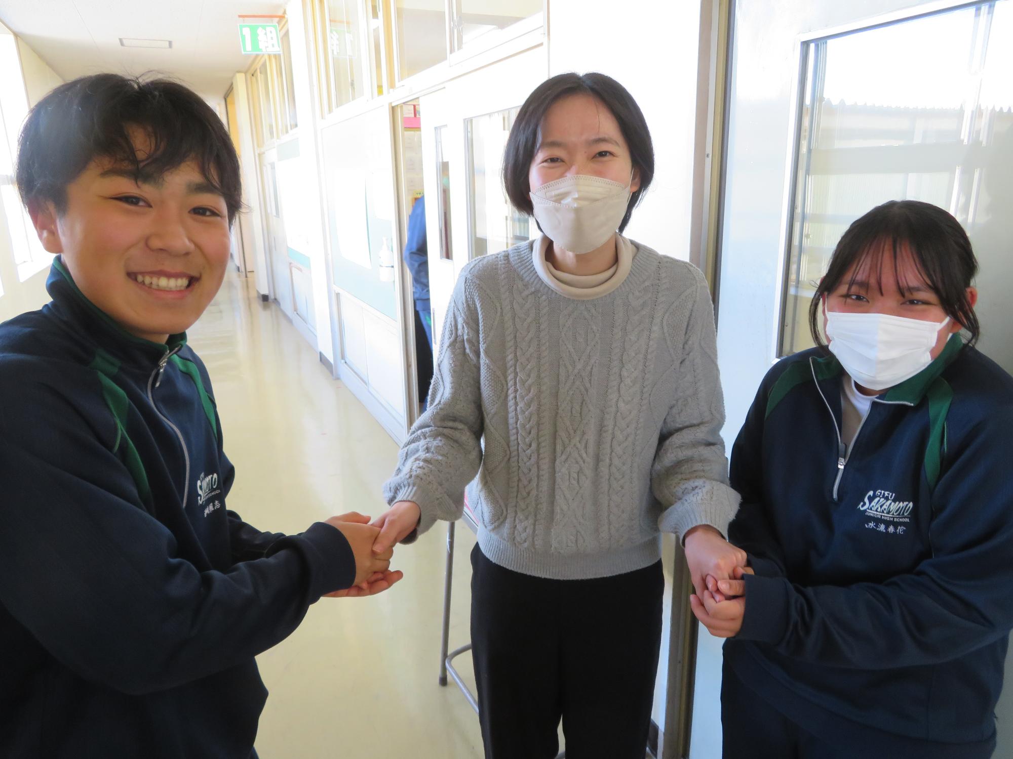 担任の先生と一緒に「はいポーズ」