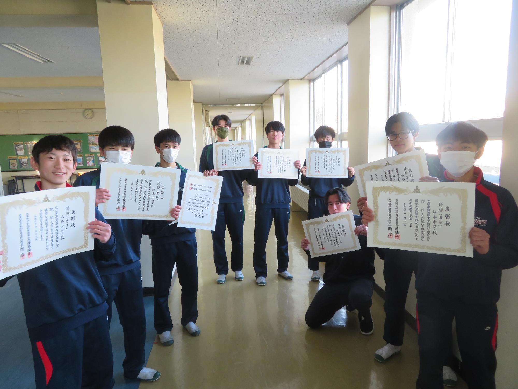 東濃大会駅伝優秀の賞状を一人に一枚ずつ渡すことができました。