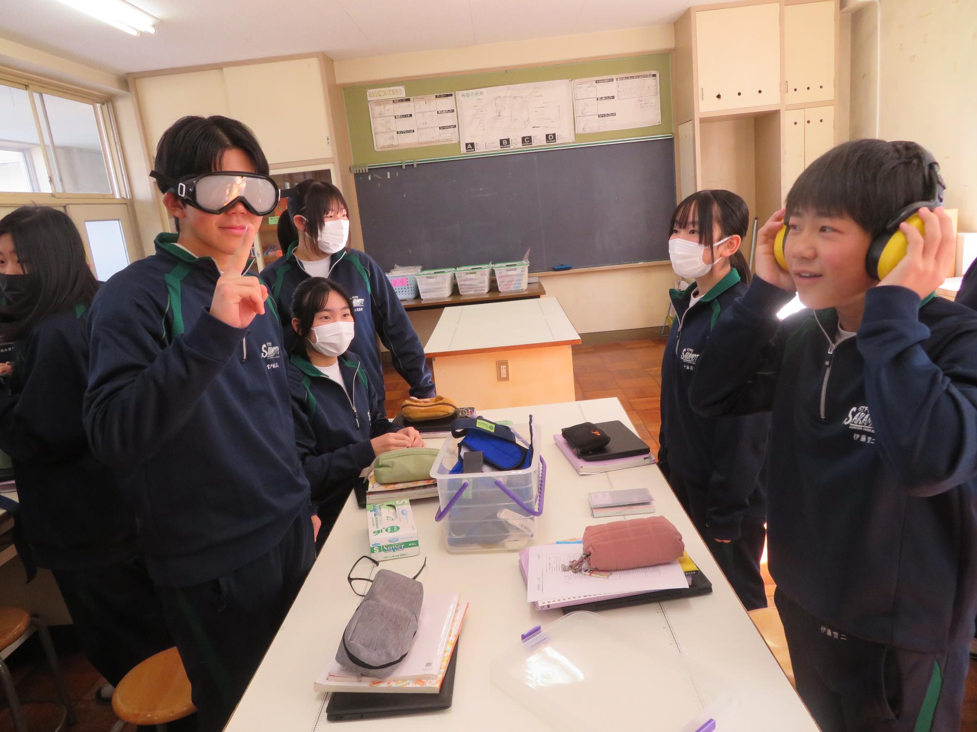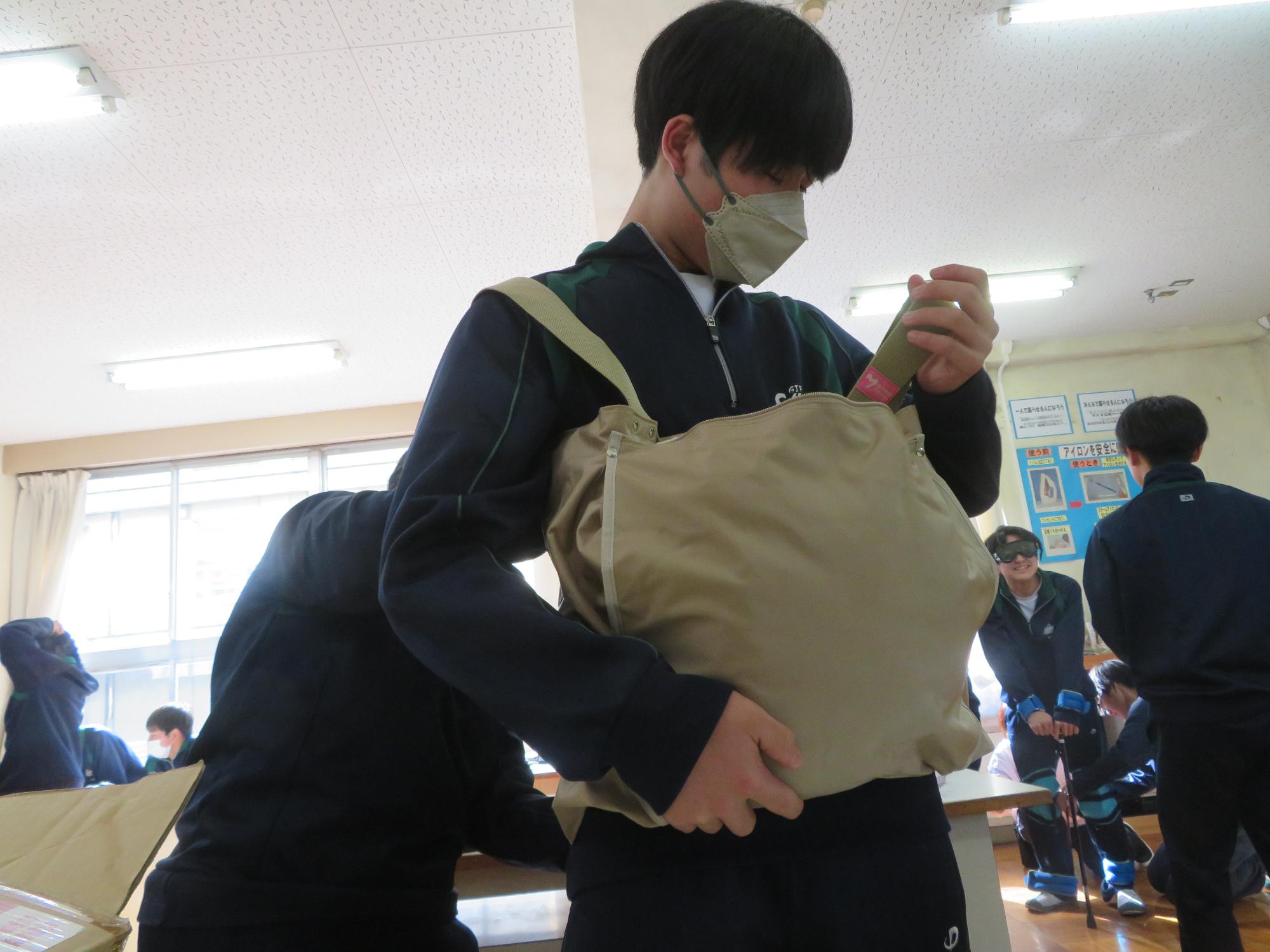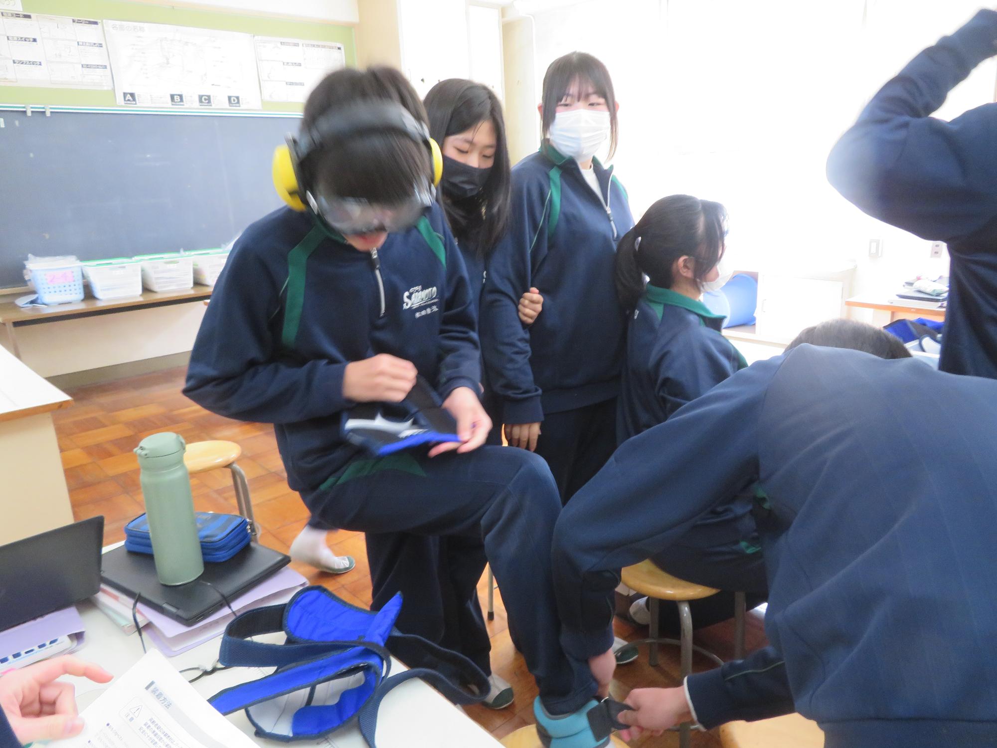 家庭科の福祉の授業で高齢者疑似体験をする生徒その1