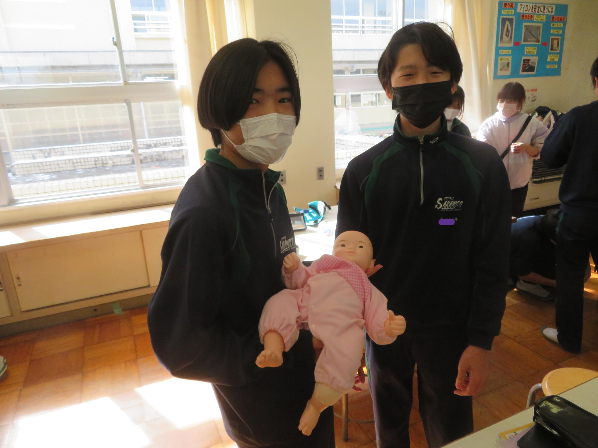 家庭科の保育の授業で赤ちゃんの抱き方を考える生徒