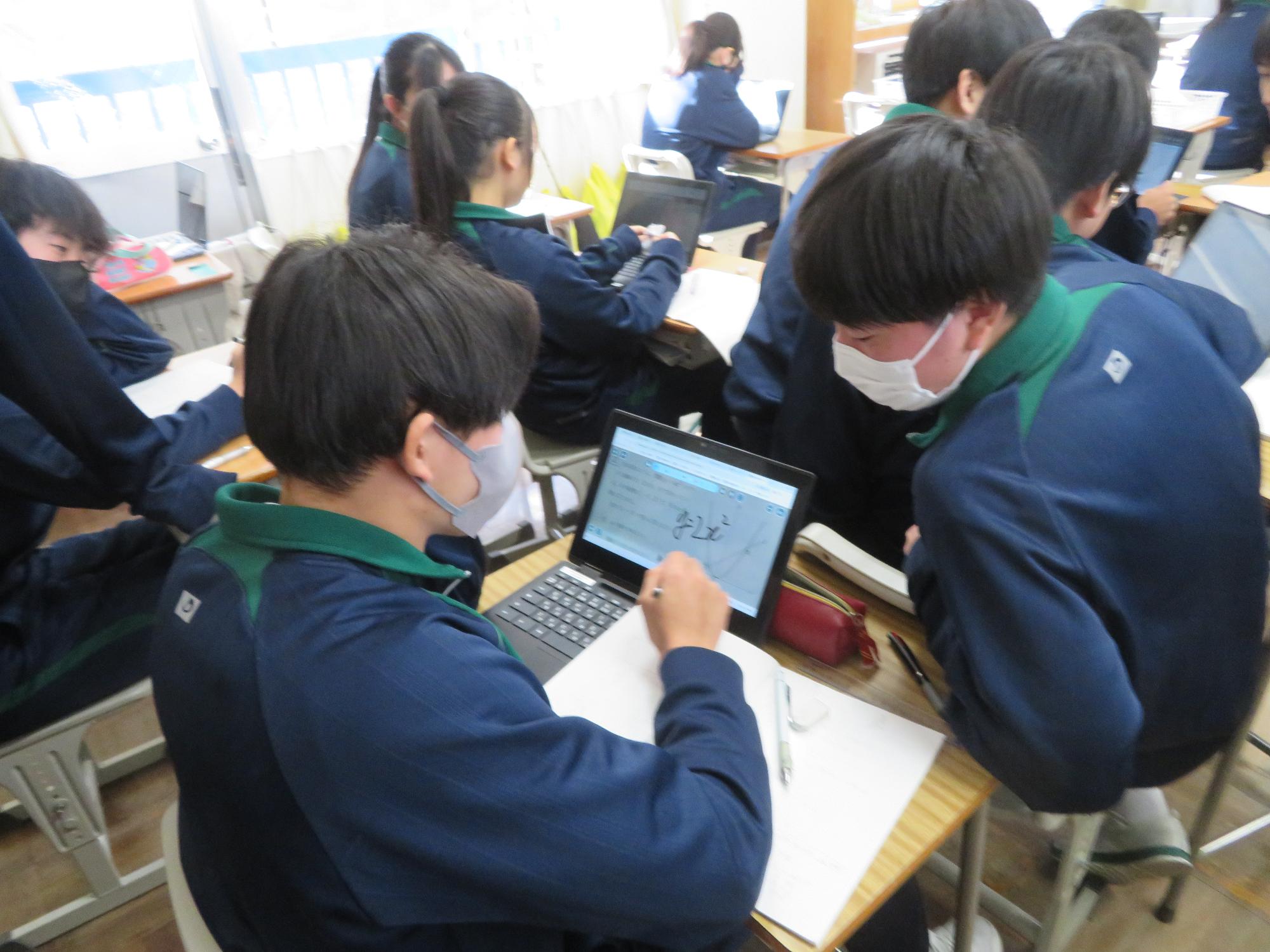 仲間と学習課題を追求していく生徒