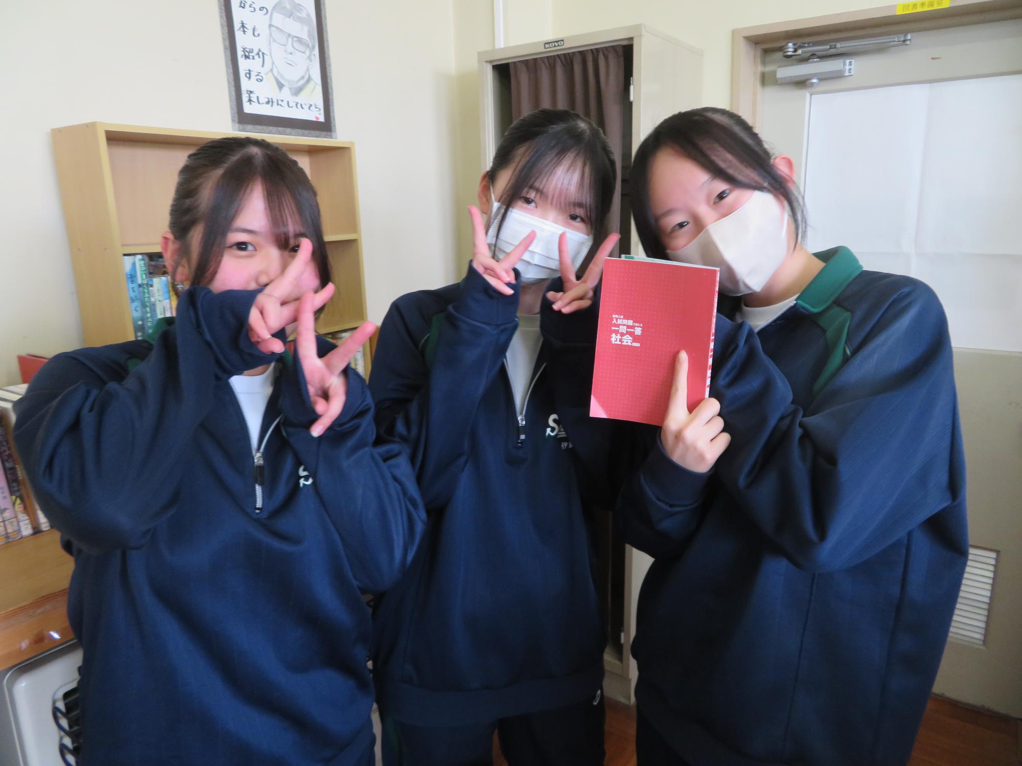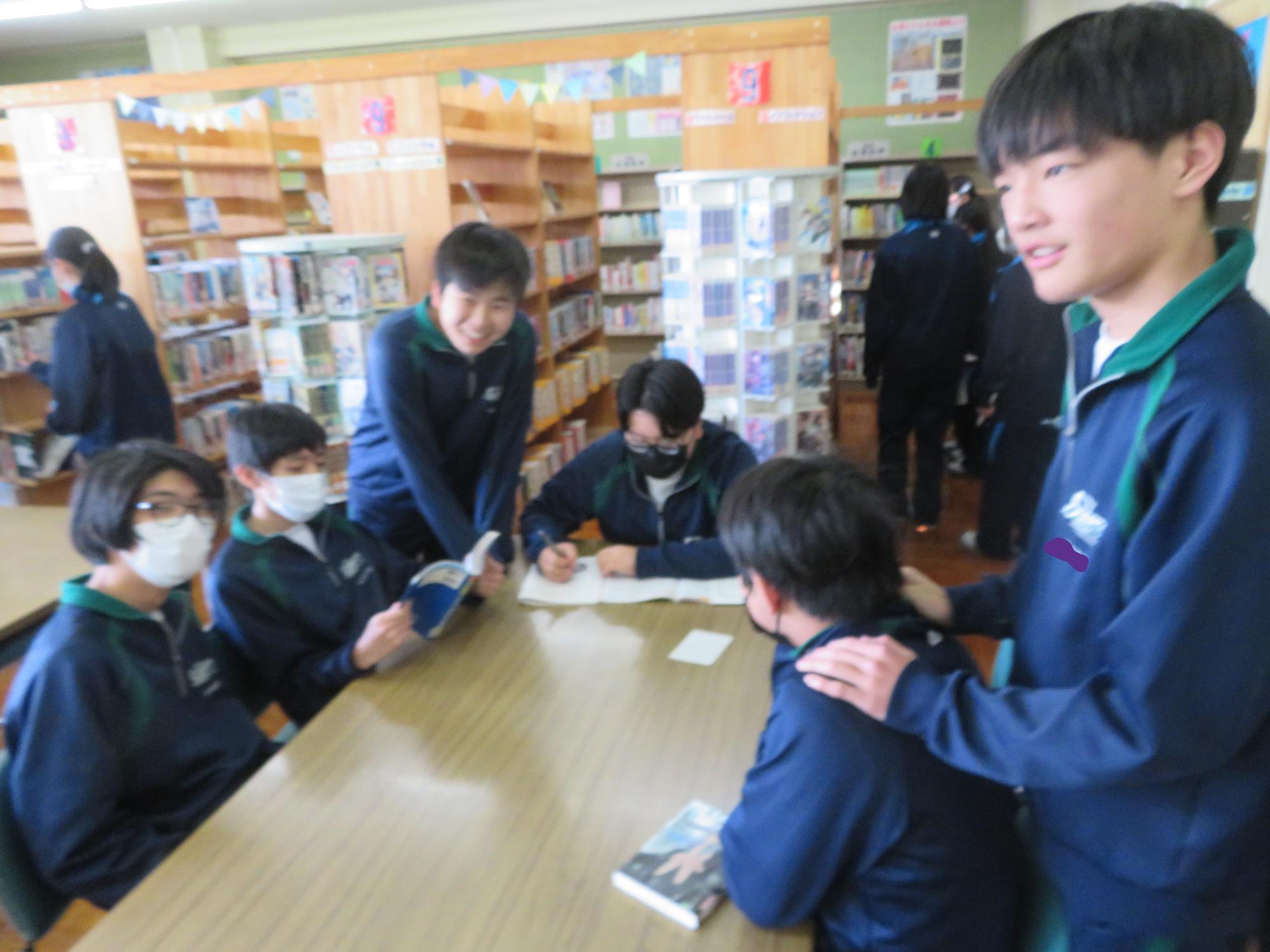 昼休みの図書館で仲間と学習に励む生徒その1