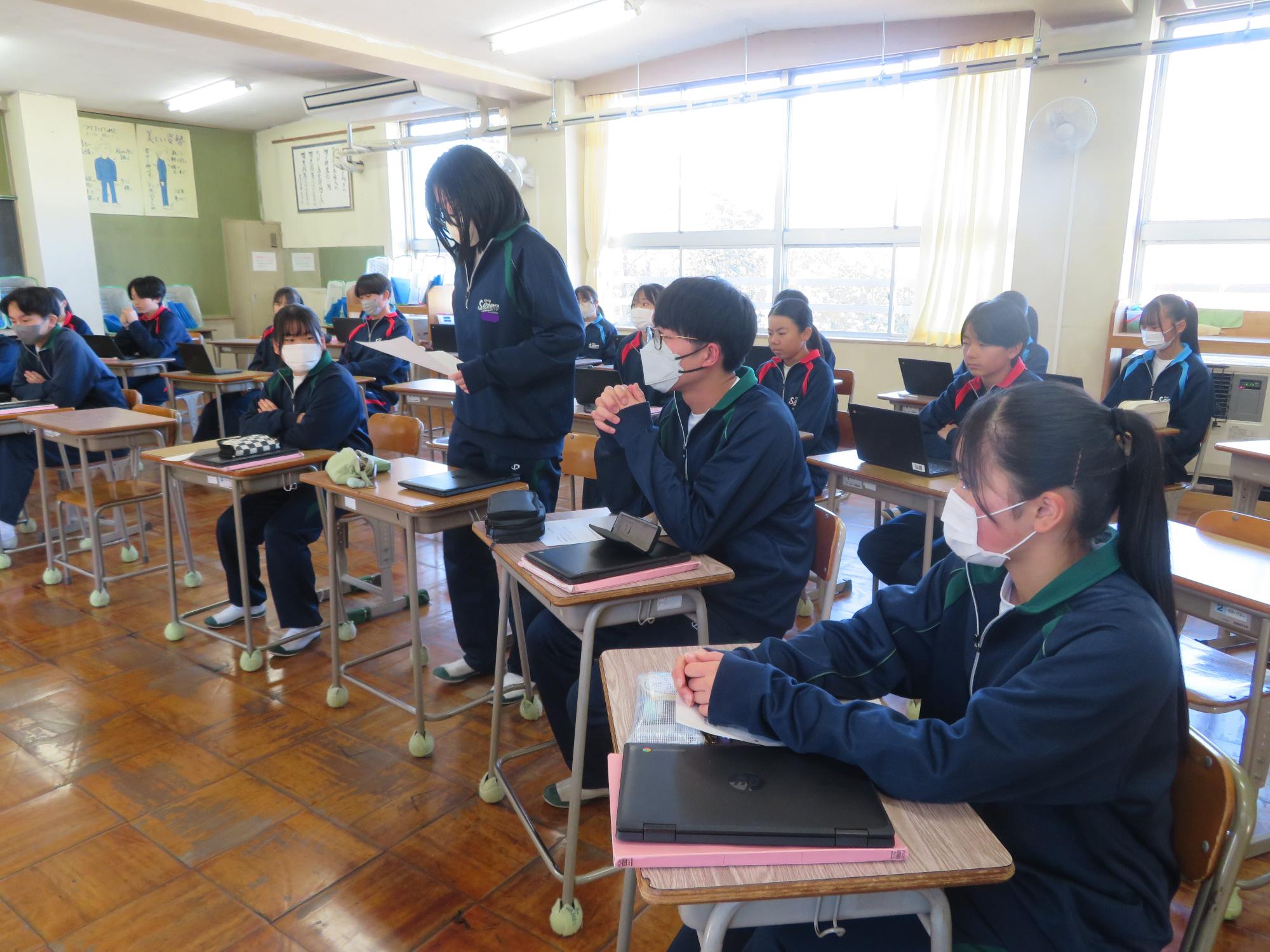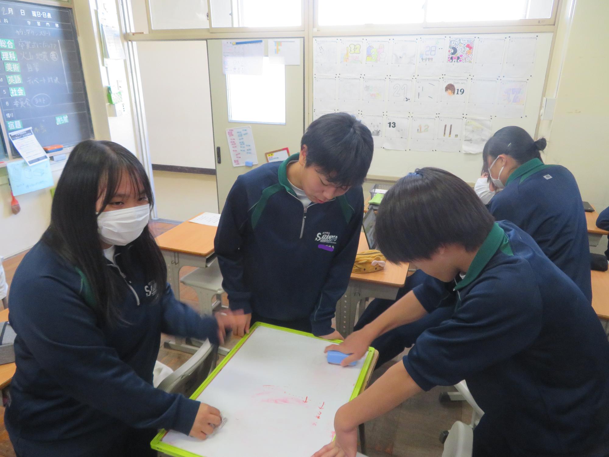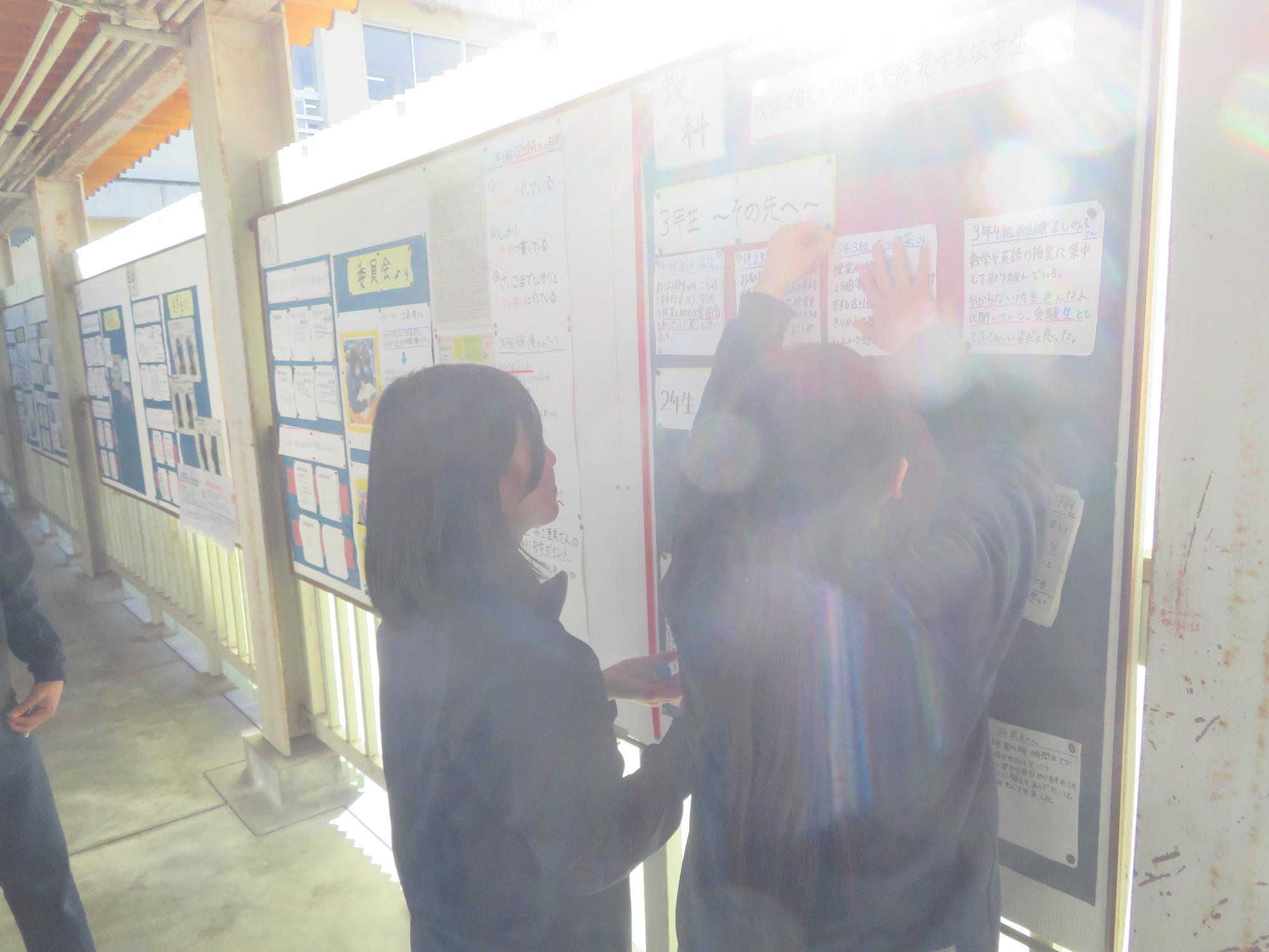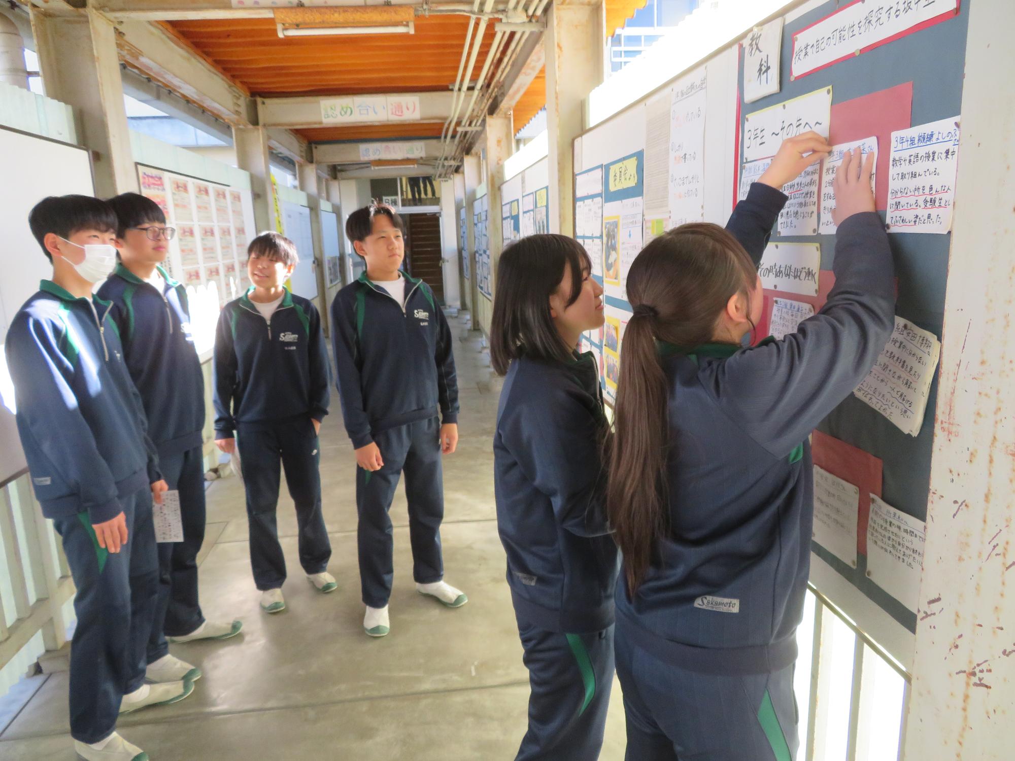 3年生最後の委員会活動でBRUSH UP! 更新日:2026年02月19日 3年生は中学校生活も残り9日。今日は最後の委員会活動を行いました。成果と課題を出し合いながら、来年度の坂本中学校の委員会活動への引き継ぎ内容などを話し合いました。カメラを向けるとVサインをする3年生からは、「楽しかった委員会活動が名残惜しい!」という気持ちが伝わってきました。3年生の残してきた頑張りが、1、2年生に確実に伝わりながら、継承していく土台ができつつある坂本中学校です。