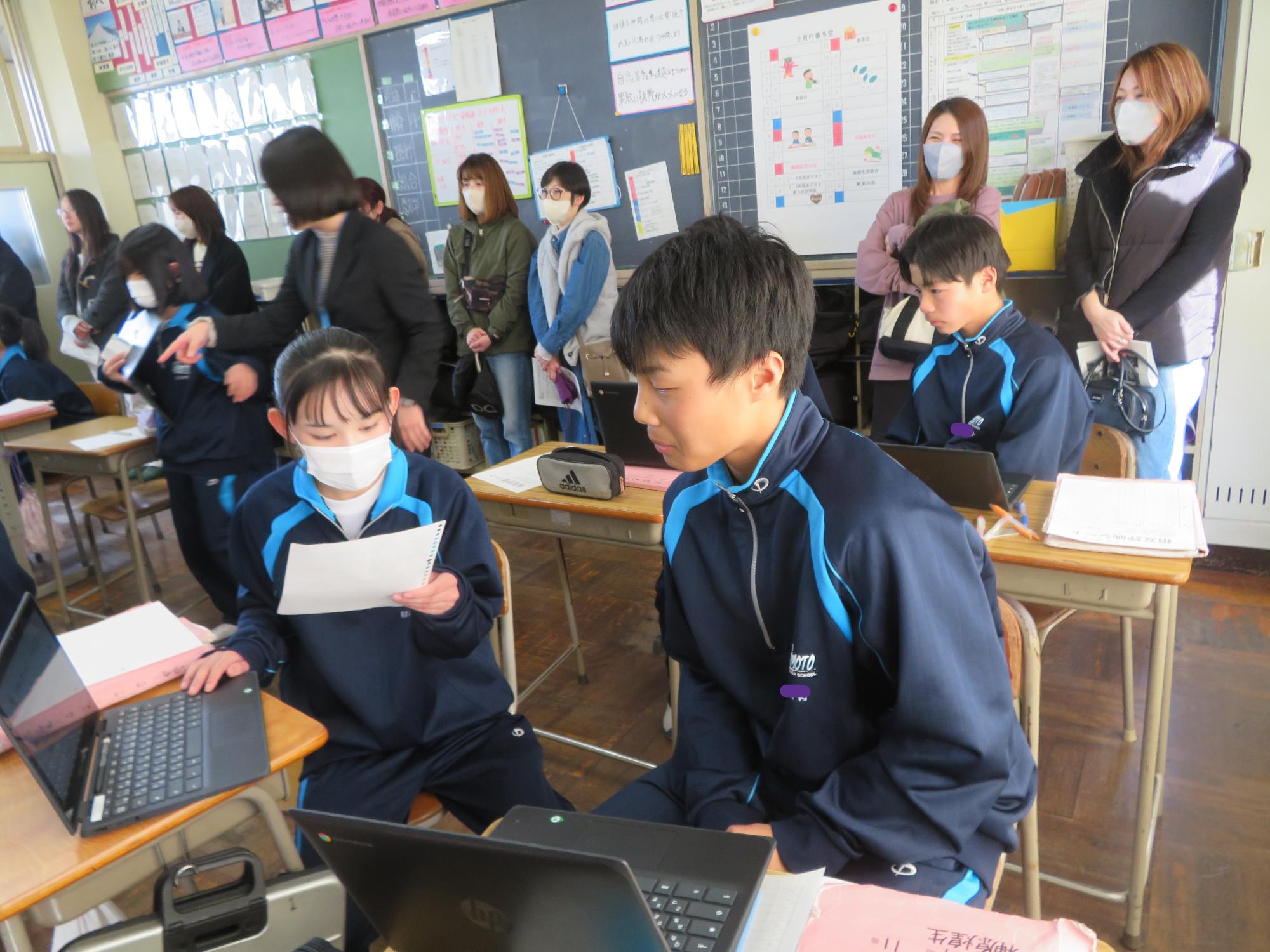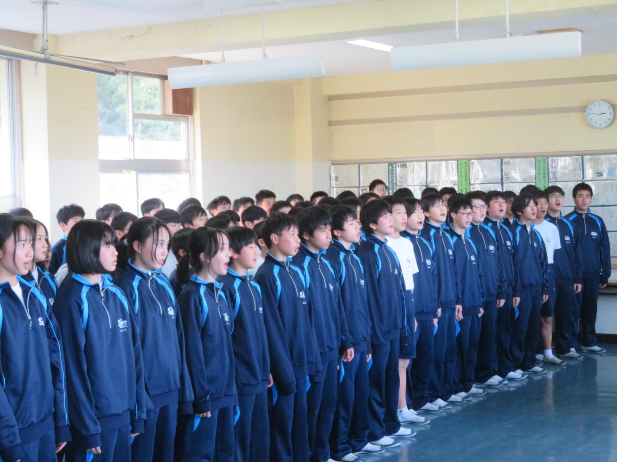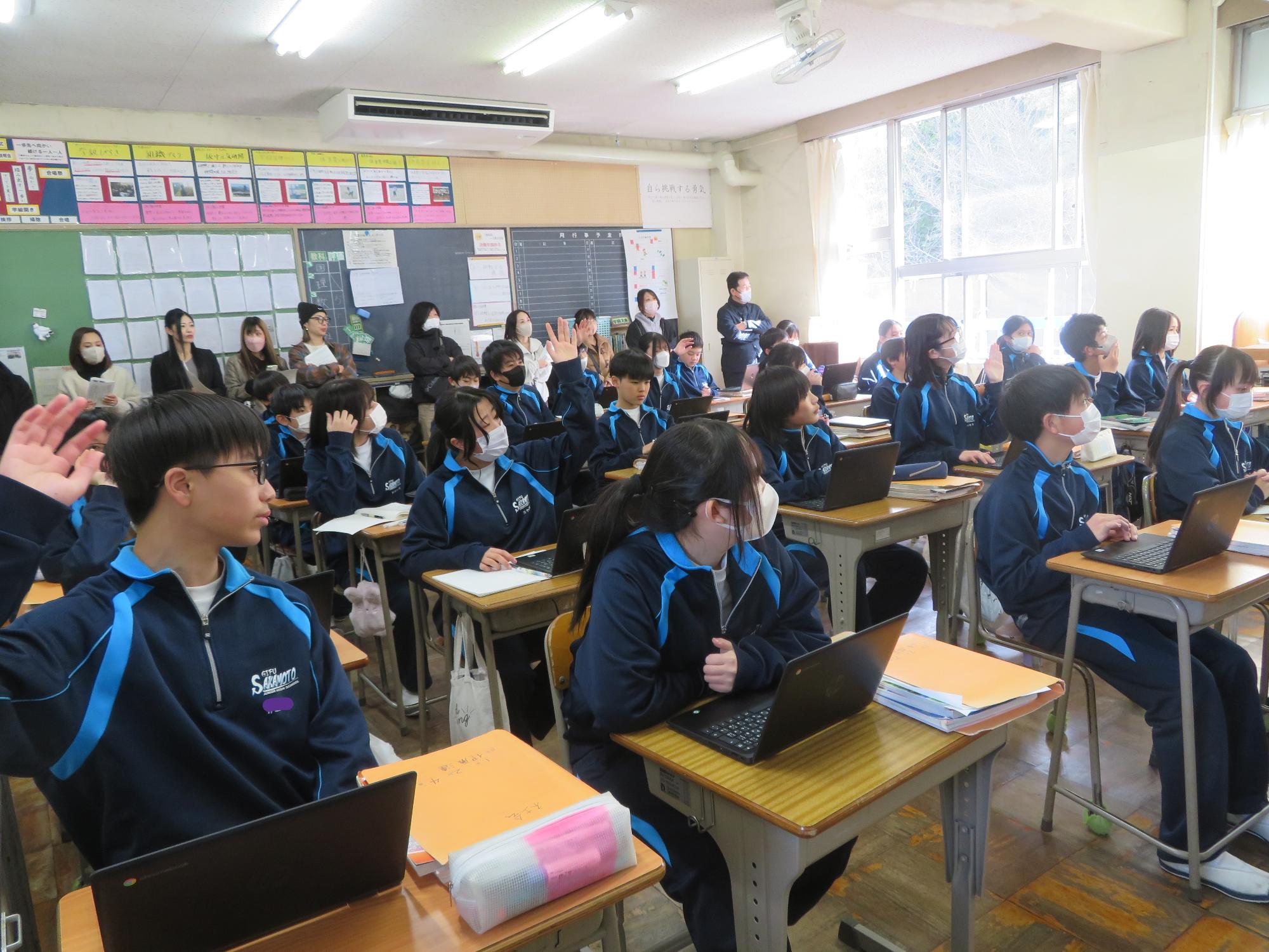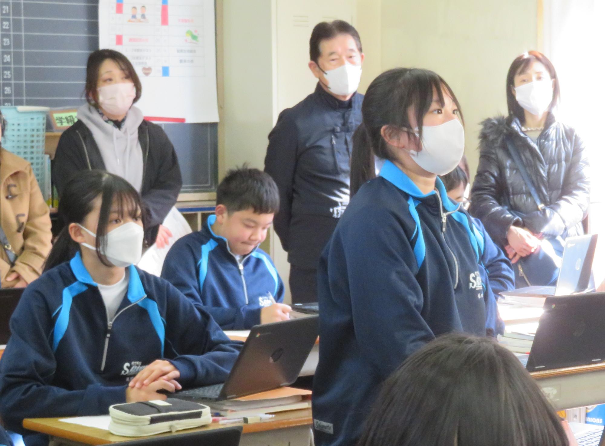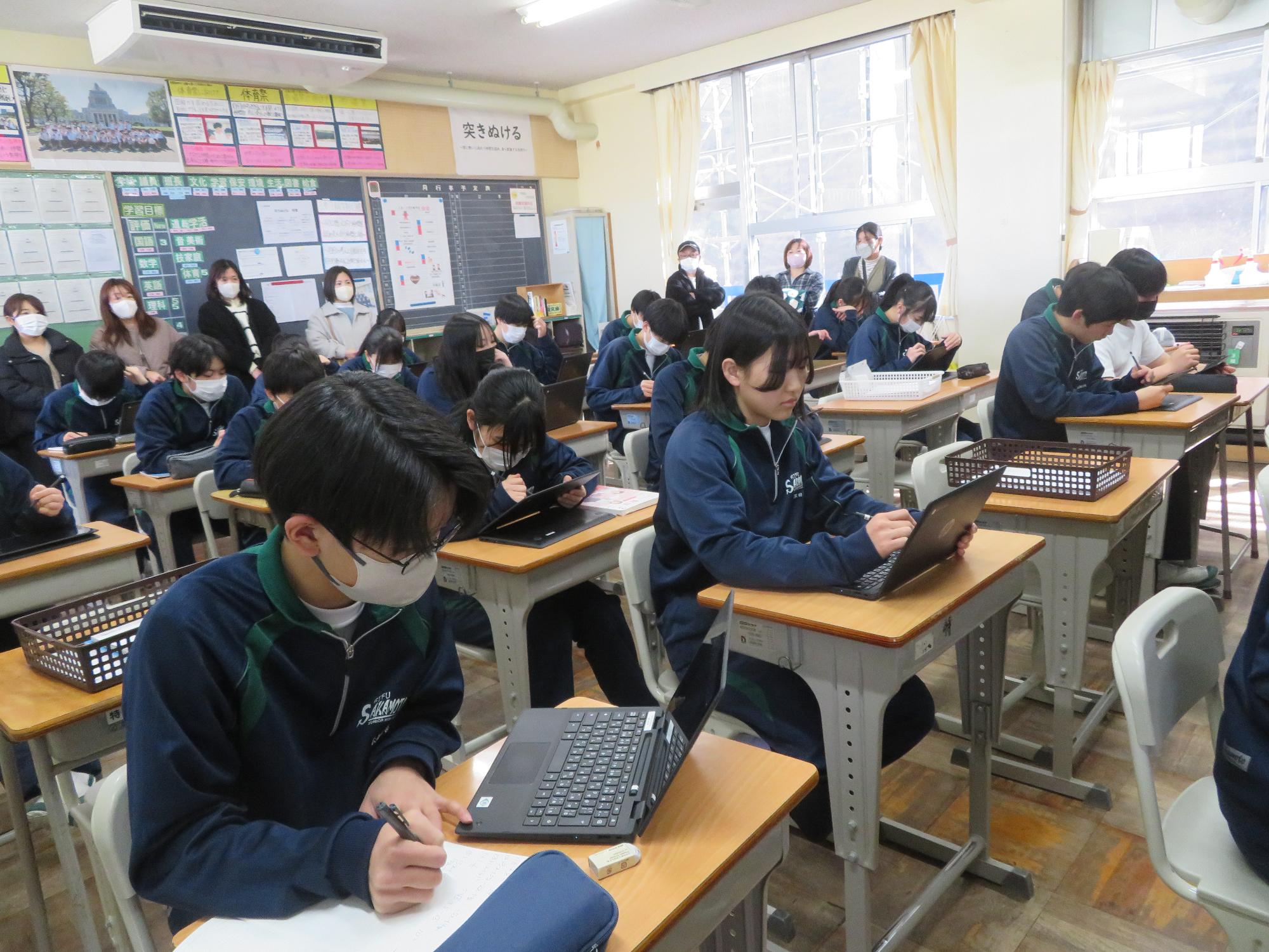 今年度最後の授業参観を全学年で行いました。昼の放送で新江生徒会長が「今日の授業参観では、一年間の自分たちの成長を家の人や地域の人に見てもらおう。」と全校生徒に発信しました。保護者の方の参観で普段より緊張はしたとは思いますが、一生懸命に授業に取り組む場面が随所に見られ、一年間の成長を見ていただくことはできたと強く感じています。授業後の1、2年生の学年合唱を聞いた保護者からは「感動しました。合唱祭の時よりもさらにすごい合唱になっていて驚きました。」「一生懸命に歌う姿にジーンときました。合唱っていいですね。」などたくさんの感想をいただきました。なお3年生は、卒業式で圧倒的な感動を与える合唱を計画しています。