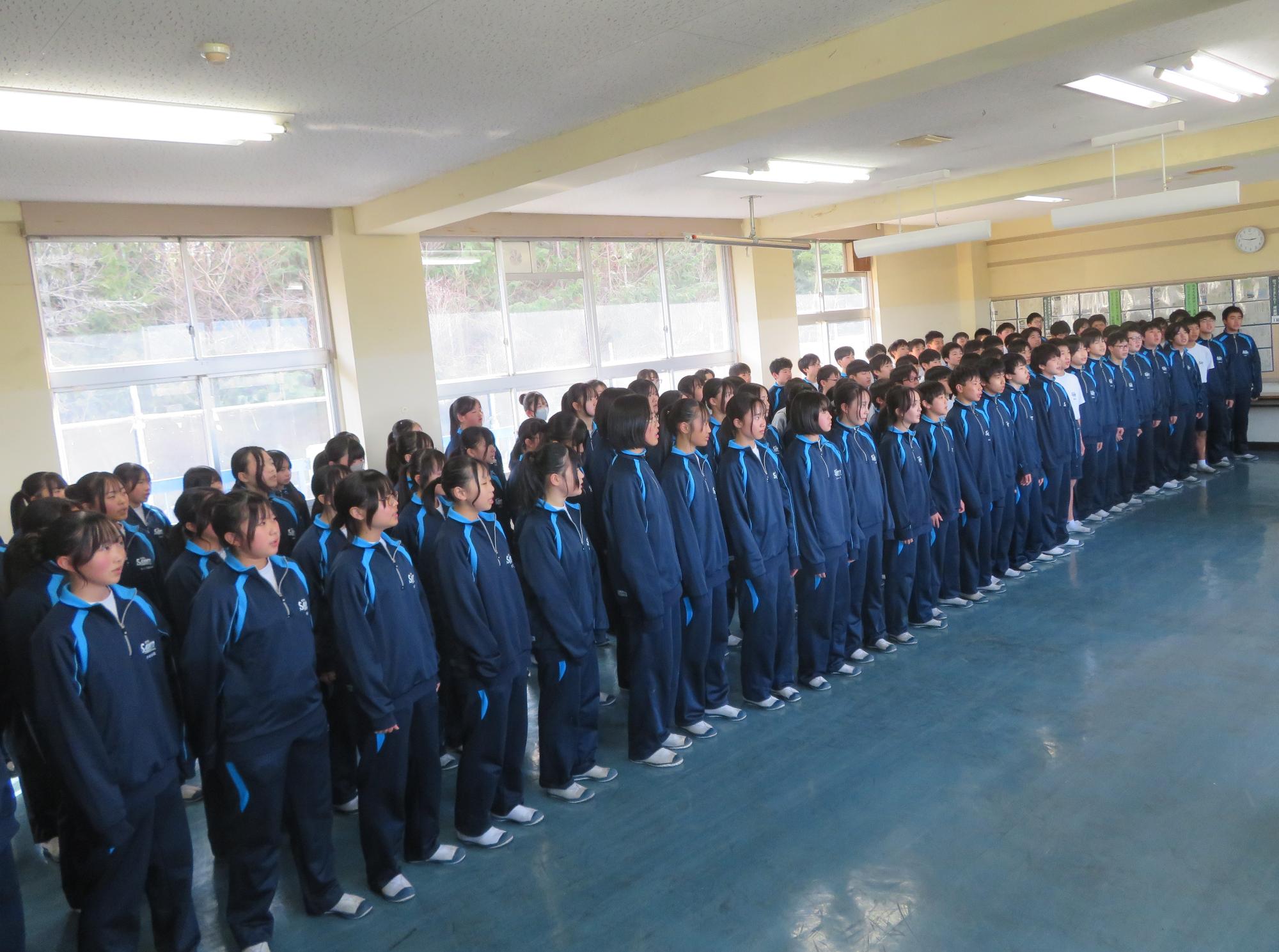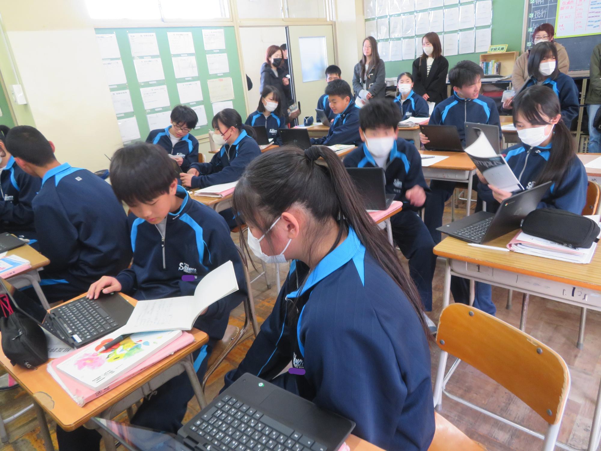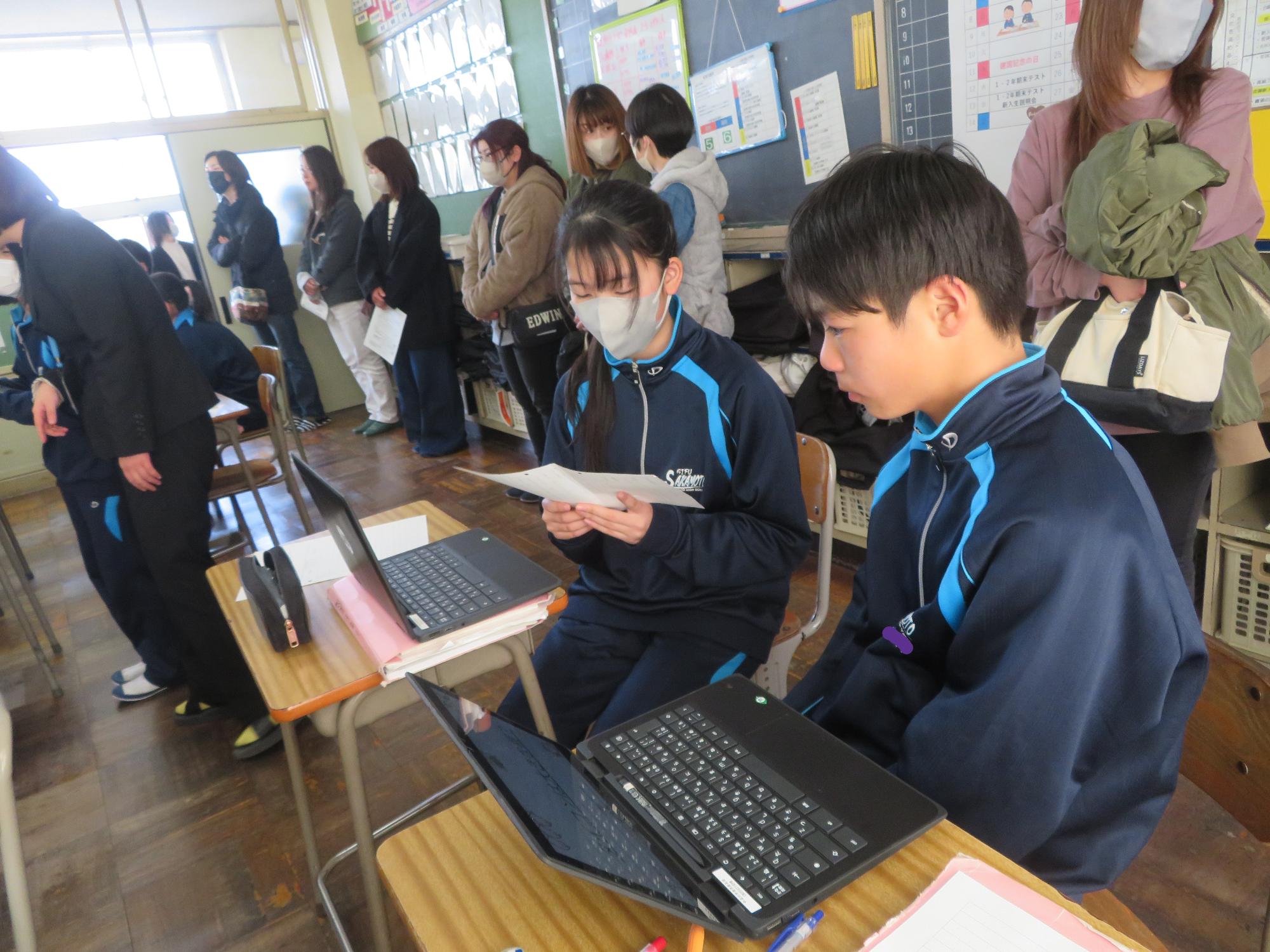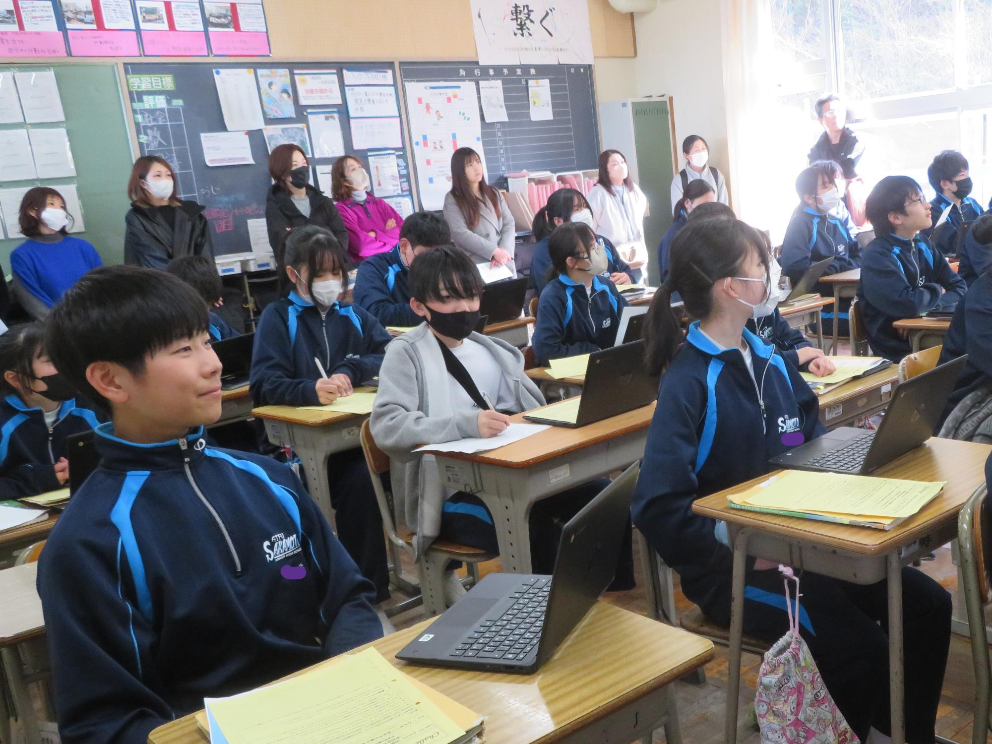 今年度最後の授業参観を全学年で行いました。昼の放送で新江生徒会長が「今日の授業参観では、一年間の自分たちの成長を家の人や地域の人に見てもらおう。」と全校生徒に発信しました。保護者の方の参観で普段より緊張はしたとは思いますが、一生懸命に授業に取り組む場面が随所に見られ、一年間の成長を見ていただくことはできたと強く感じています。授業後の1、2年生の学年合唱を聞いた保護者からは「感動しました。合唱祭の時よりもさらにすごい合唱になっていて驚きました。」「一生懸命に歌う姿にジーンときました。合唱っていいですね。」などたくさんの感想をいただきました。なお3年生は、卒業式で圧倒的な感動を与える合唱を計画しています。