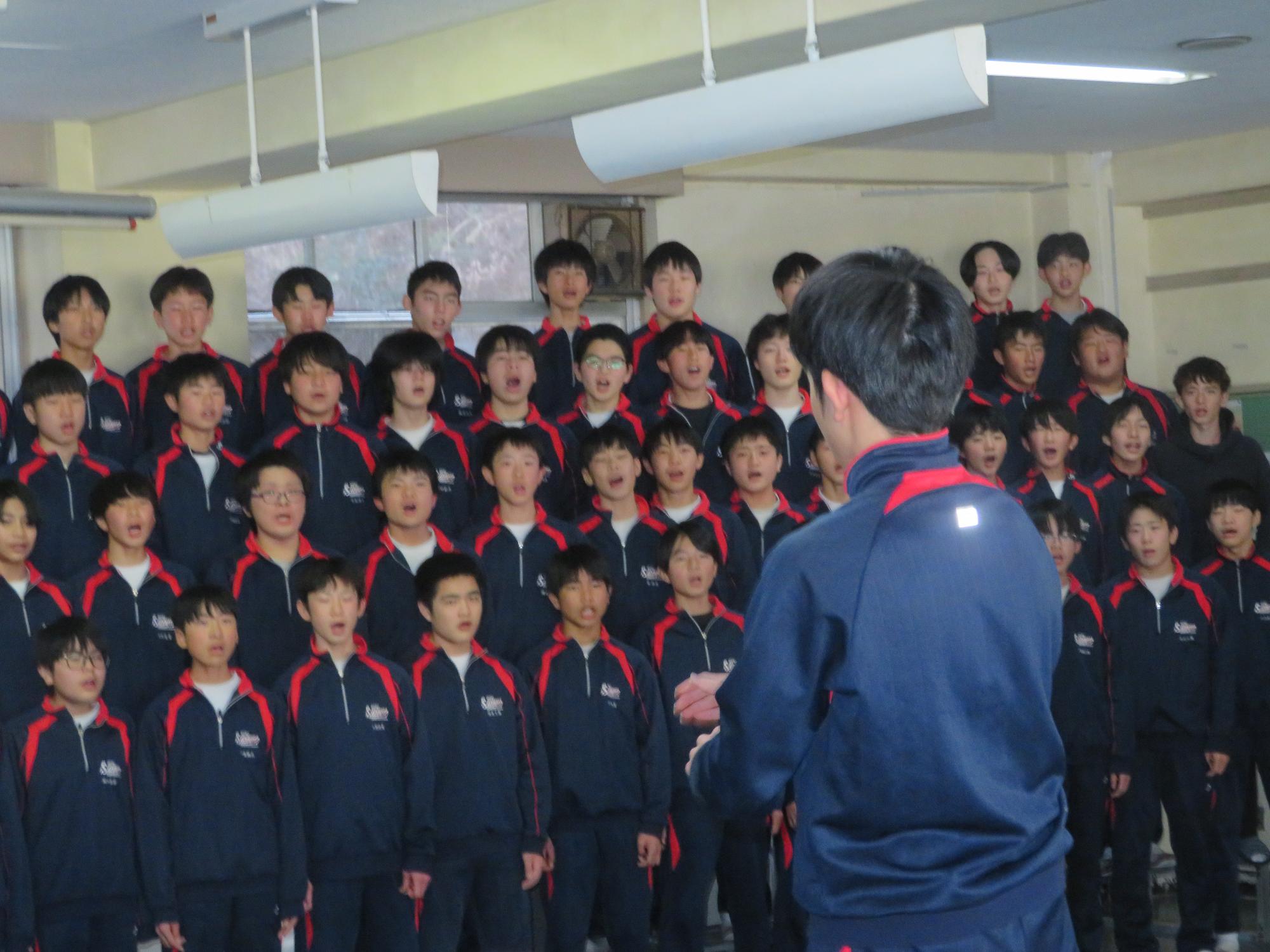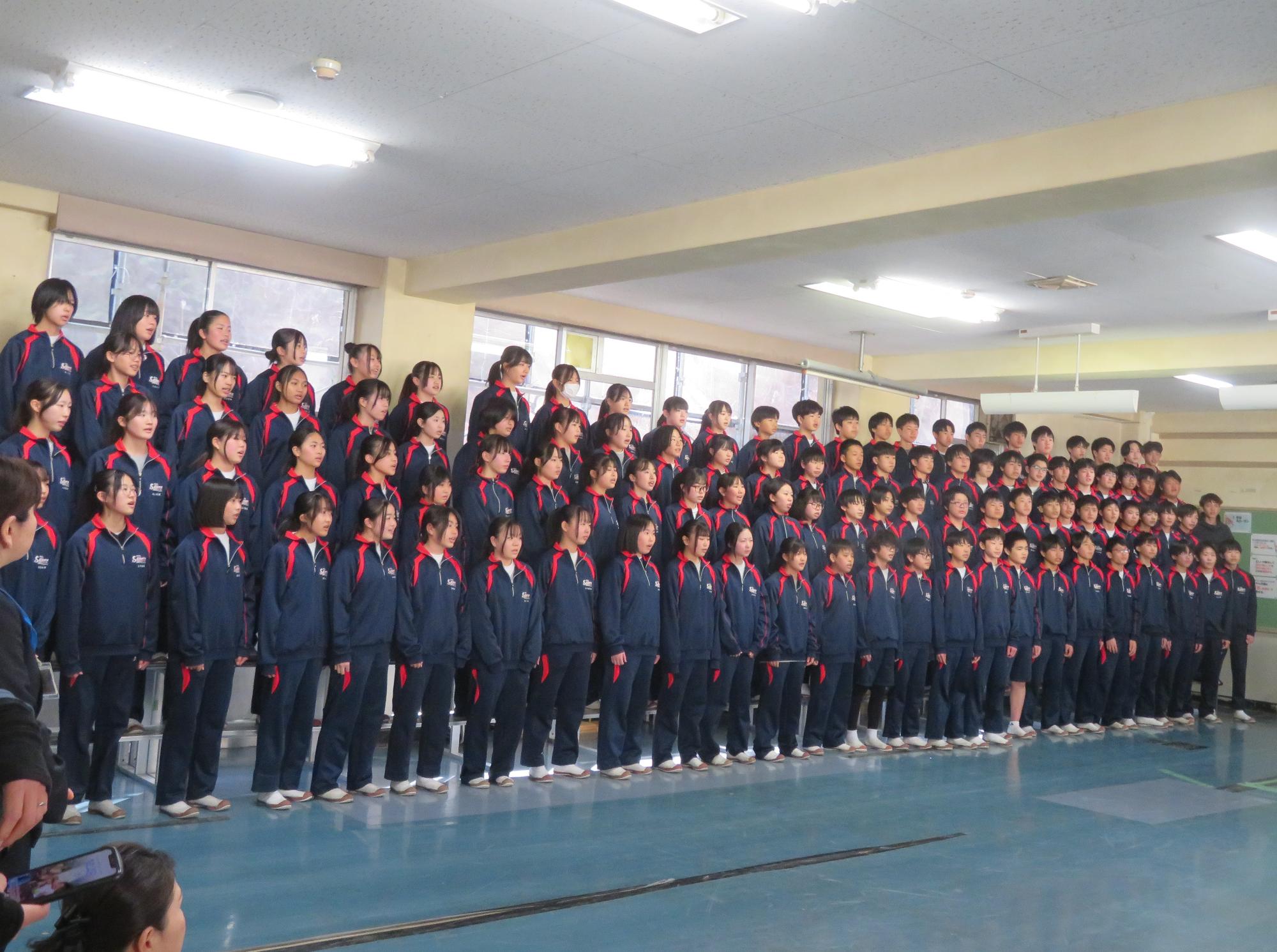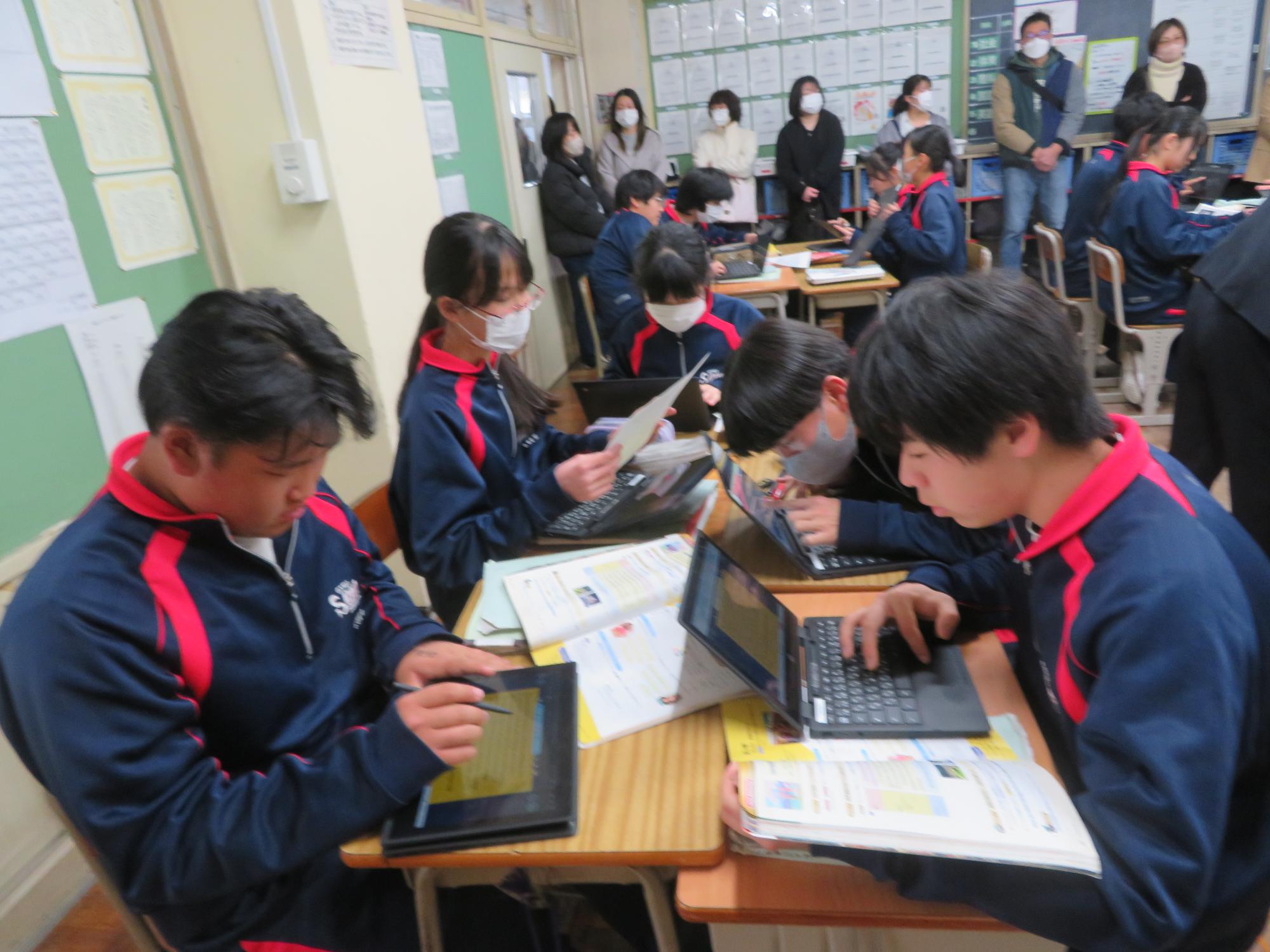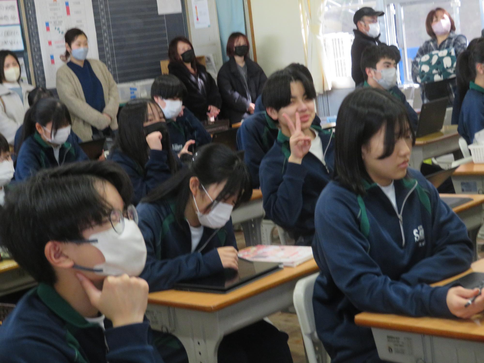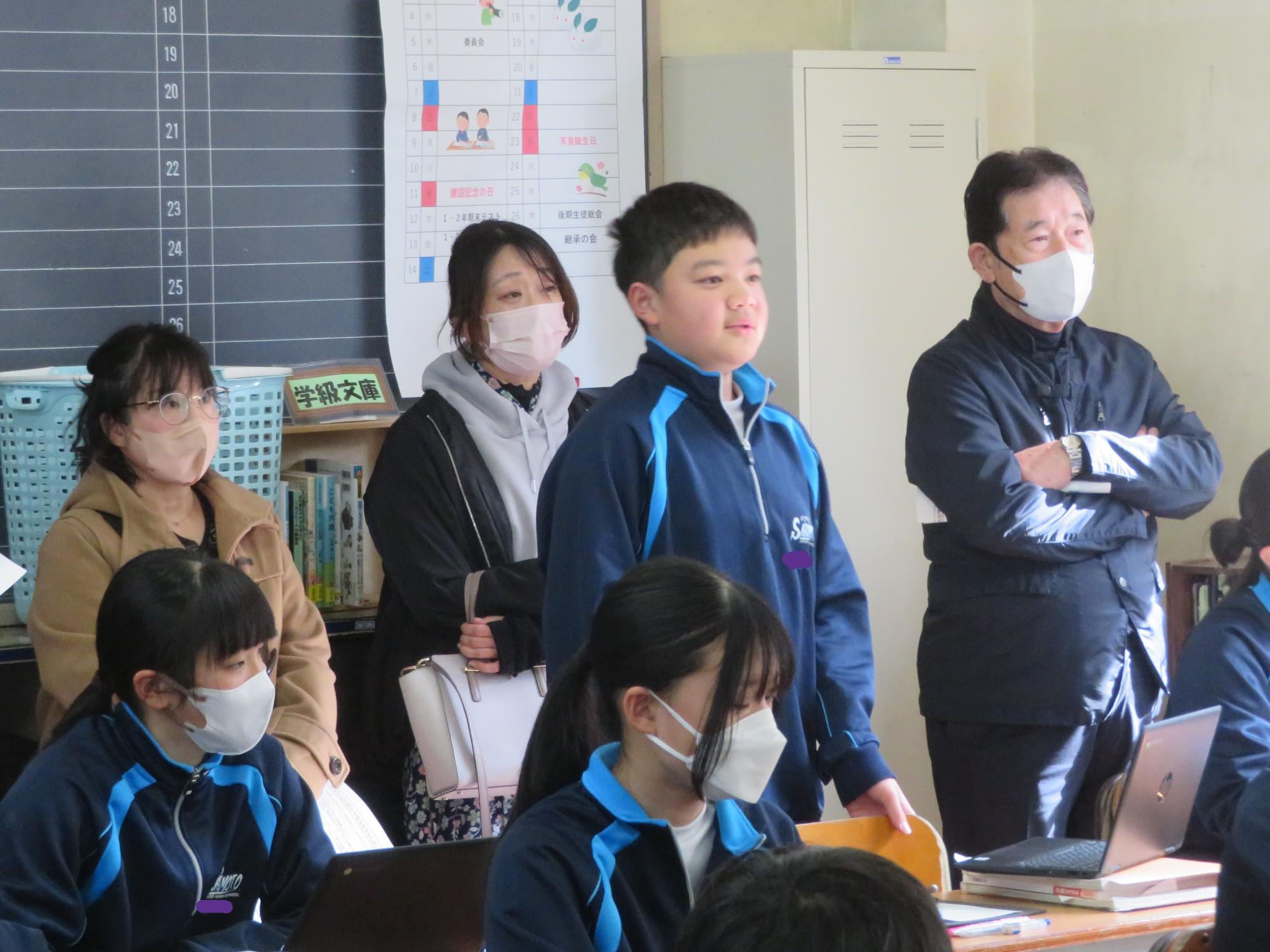 今年度最後の授業参観を全学年で行いました。昼の放送で新江生徒会長が「今日の授業参観では、一年間の自分たちの成長を家の人や地域の人に見てもらおう。」と全校生徒に発信しました。保護者の方の参観で普段より緊張はしたとは思いますが、一生懸命に授業に取り組む場面が随所に見られ、一年間の成長を見ていただくことはできたと強く感じています。授業後の1、2年生の学年合唱を聞いた保護者からは「感動しました。合唱祭の時よりもさらにすごい合唱になっていて驚きました。」「一生懸命に歌う姿にジーンときました。合唱っていいですね。」などたくさんの感想をいただきました。なお3年生は、卒業式で圧倒的な感動を与える合唱を計画しています。