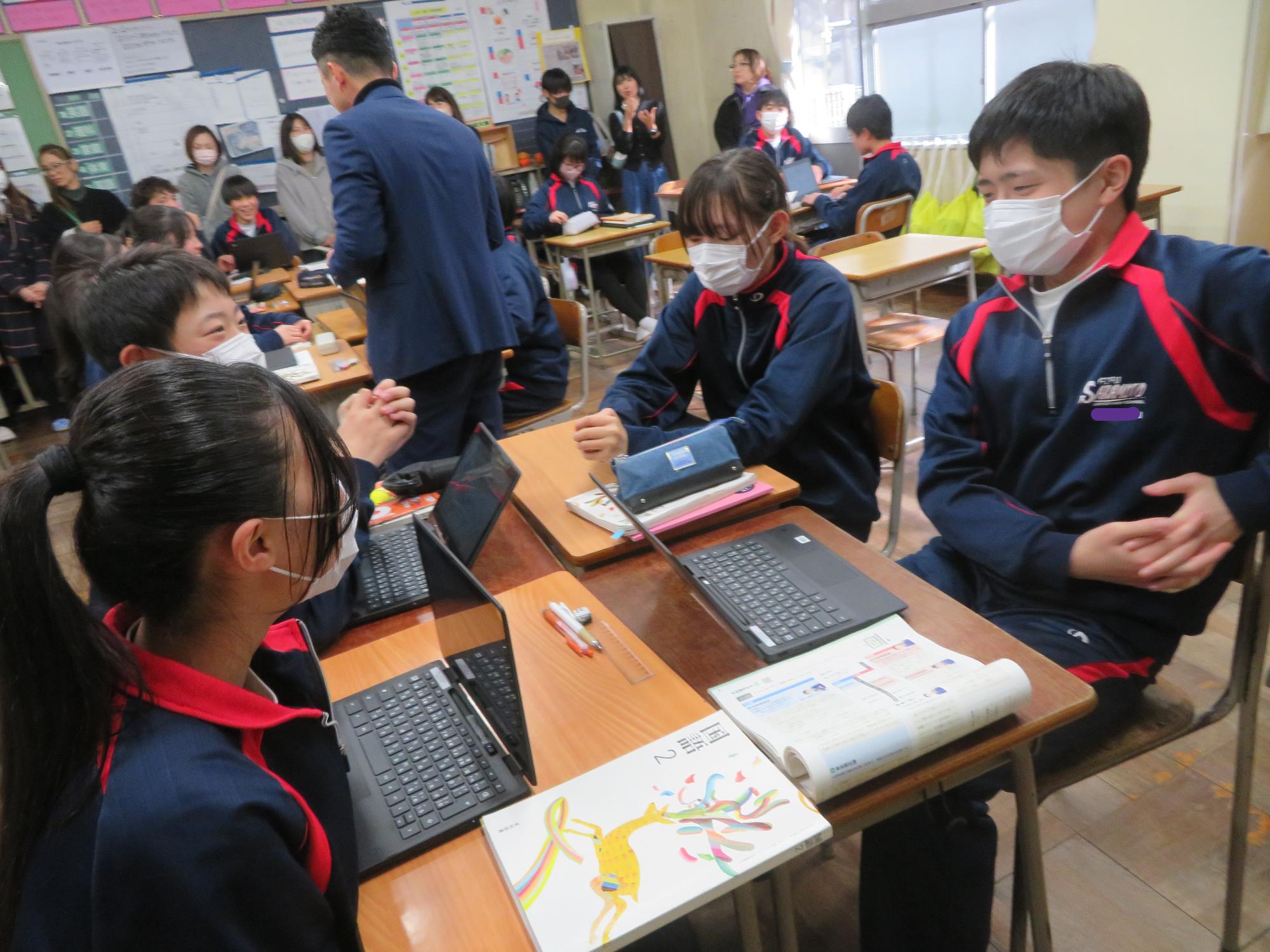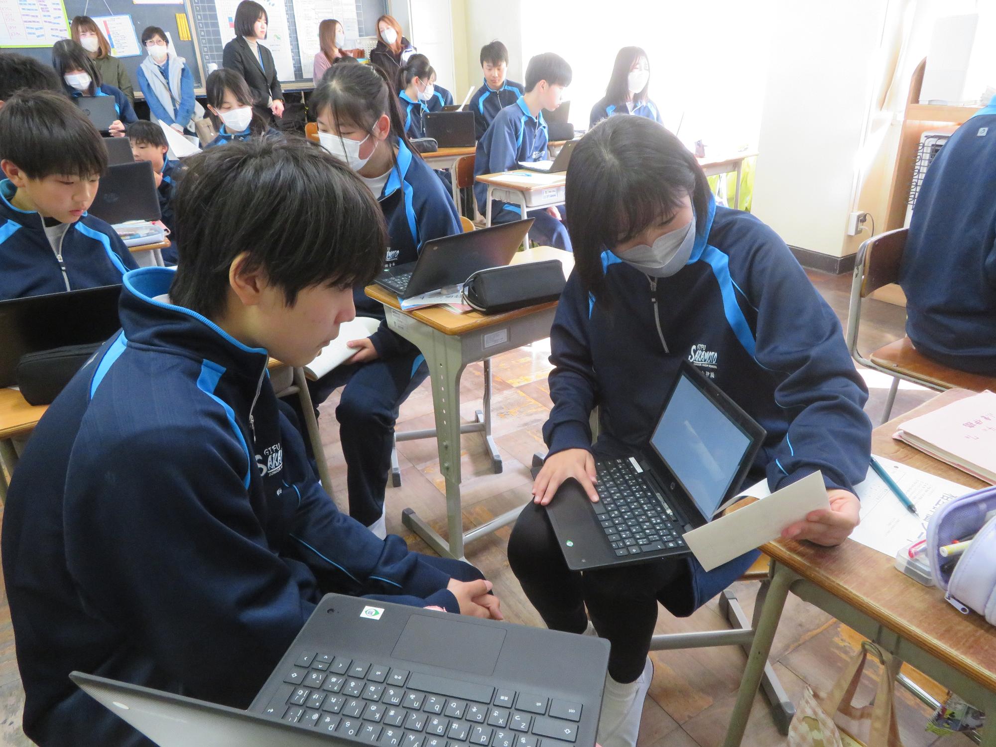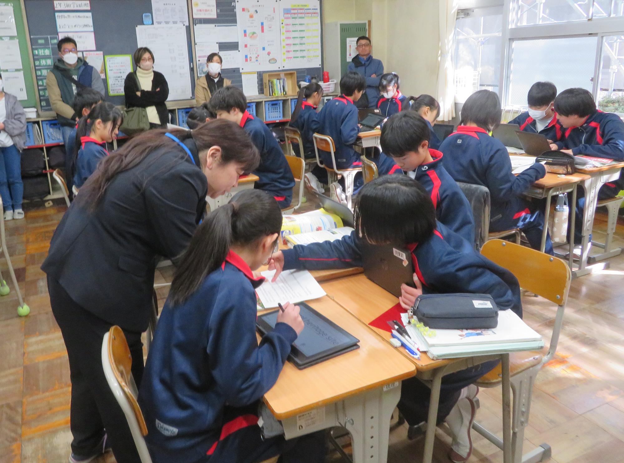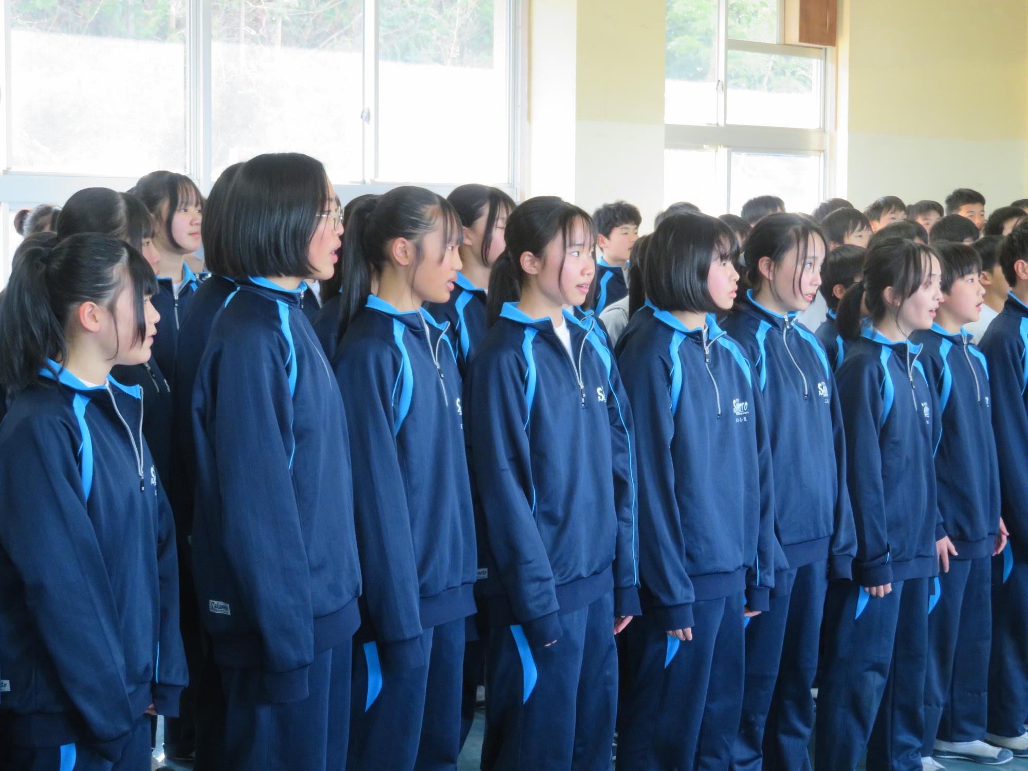 今年度最後の授業参観を全学年で行いました。昼の放送で新江生徒会長が「今日の授業参観では、一年間の自分たちの成長を家の人や地域の人に見てもらおう。」と全校生徒に発信しました。保護者の方の参観で普段より緊張はしたとは思いますが、一生懸命に授業に取り組む場面が随所に見られ、一年間の成長を見ていただくことはできたと強く感じています。授業後の1、2年生の学年合唱を聞いた保護者からは「感動しました。合唱祭の時よりもさらにすごい合唱になっていて驚きました。」「一生懸命に歌う姿にジーンときました。合唱っていいですね。」などたくさんの感想をいただきました。なお3年生は、卒業式で圧倒的な感動を与える合唱を計画しています。