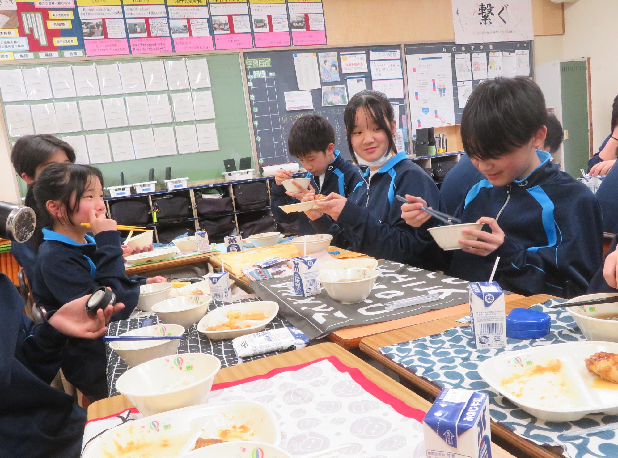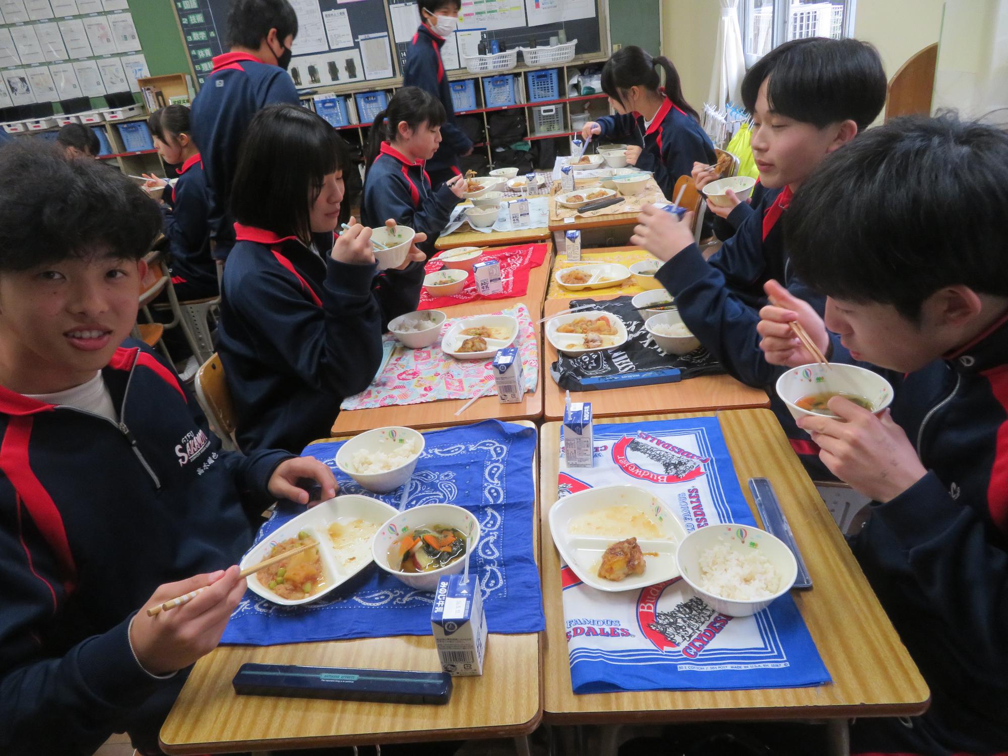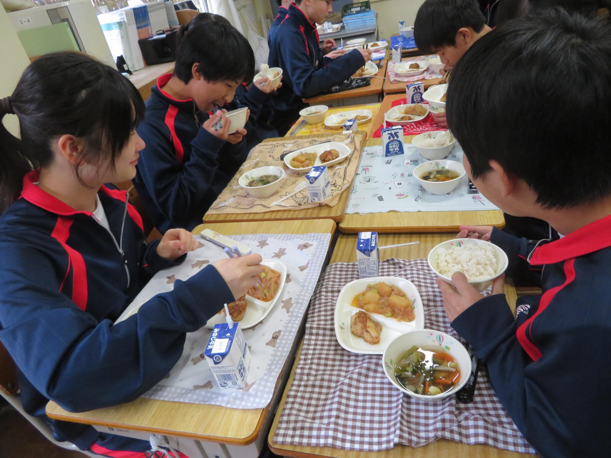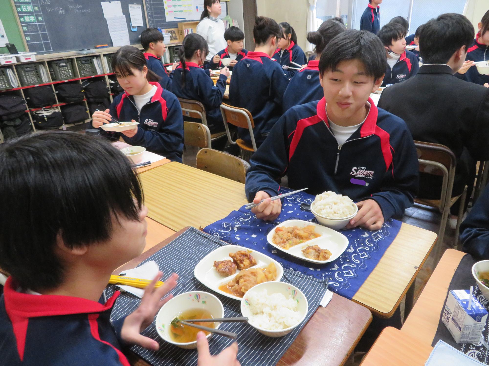 坂本中の2年生の生徒3名が岐阜県学校給食選手権に給食メニューを応募しました。そのメニューが本日の給食に登場しました。今までに家庭科の授業を中心に学習したことをもとに、栄養のことや地産地消のことを考えた素敵なメニューです。そのメニューは、ごはんとともに、トマト肉じゃが、鶏肉の五平だれかけ、根菜わっしょい汁です。根菜わっしょうい汁は、レンコンやサツマイモなど根菜いっぱいの栄養満点の汁です。また、五平だれのかかった鶏肉は、中津川市風の味付けです。仲間が考えた給食を全校生徒が無我夢中で食べていた本日の給食時間でした