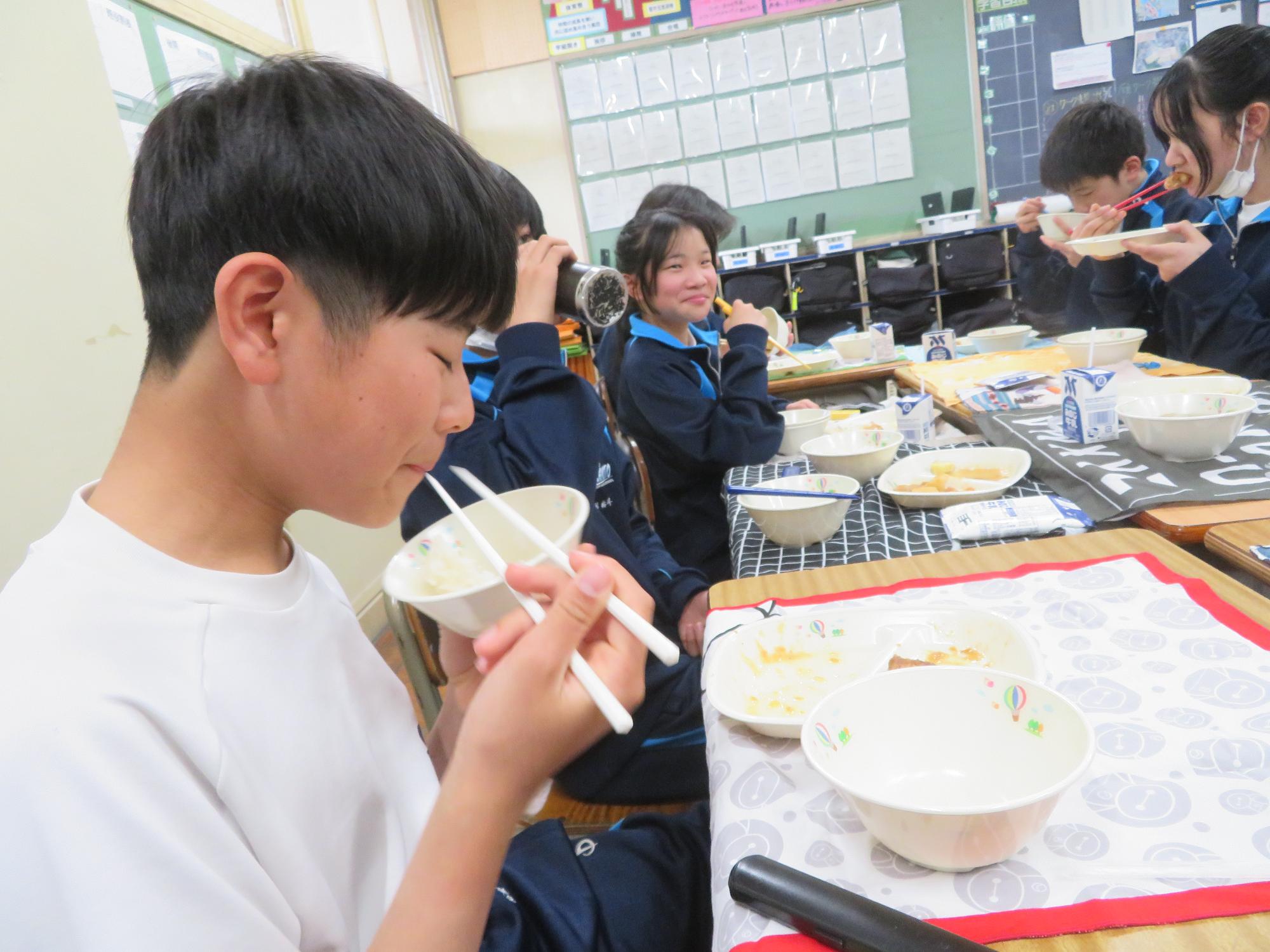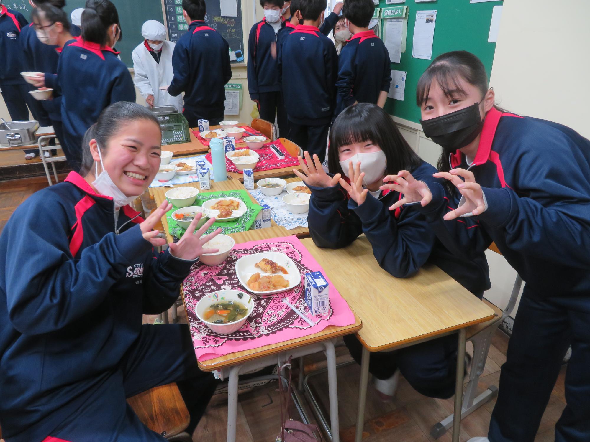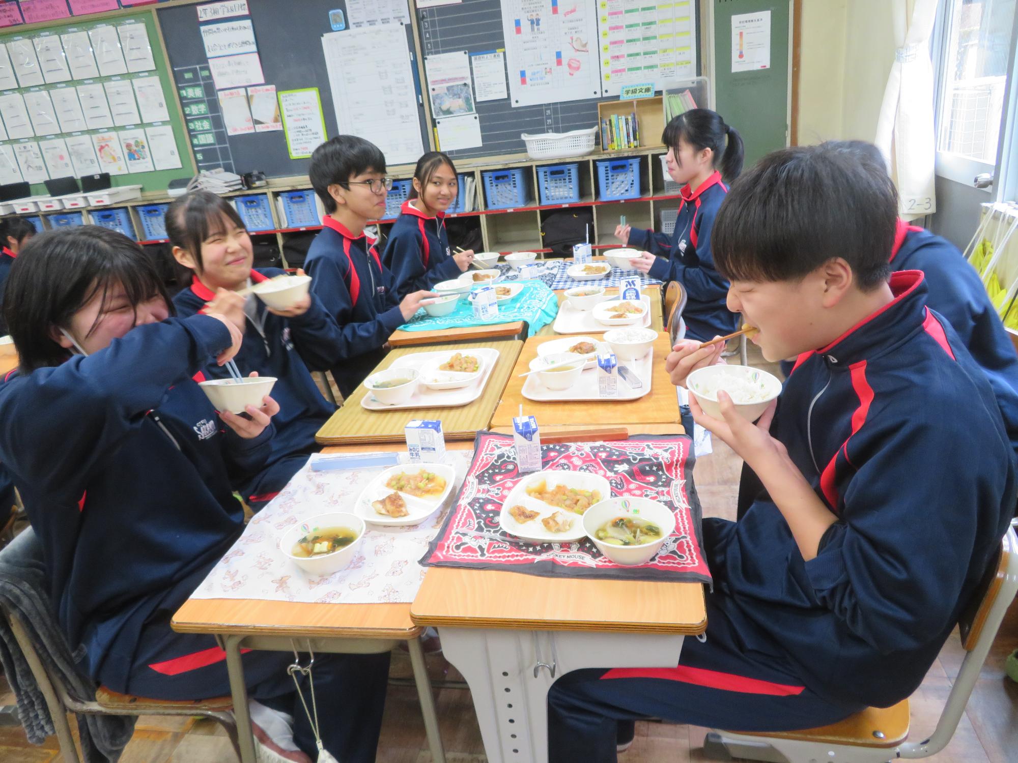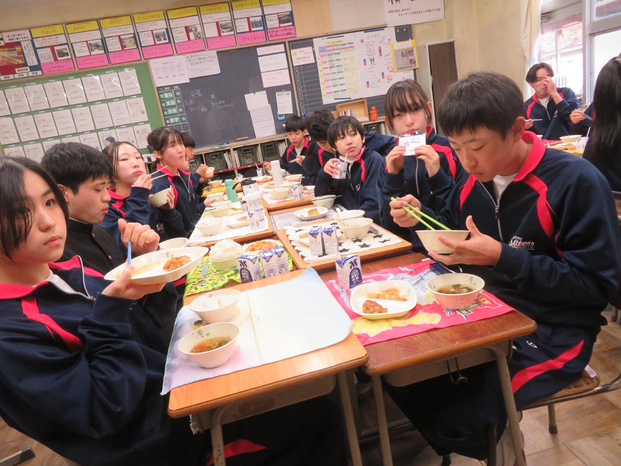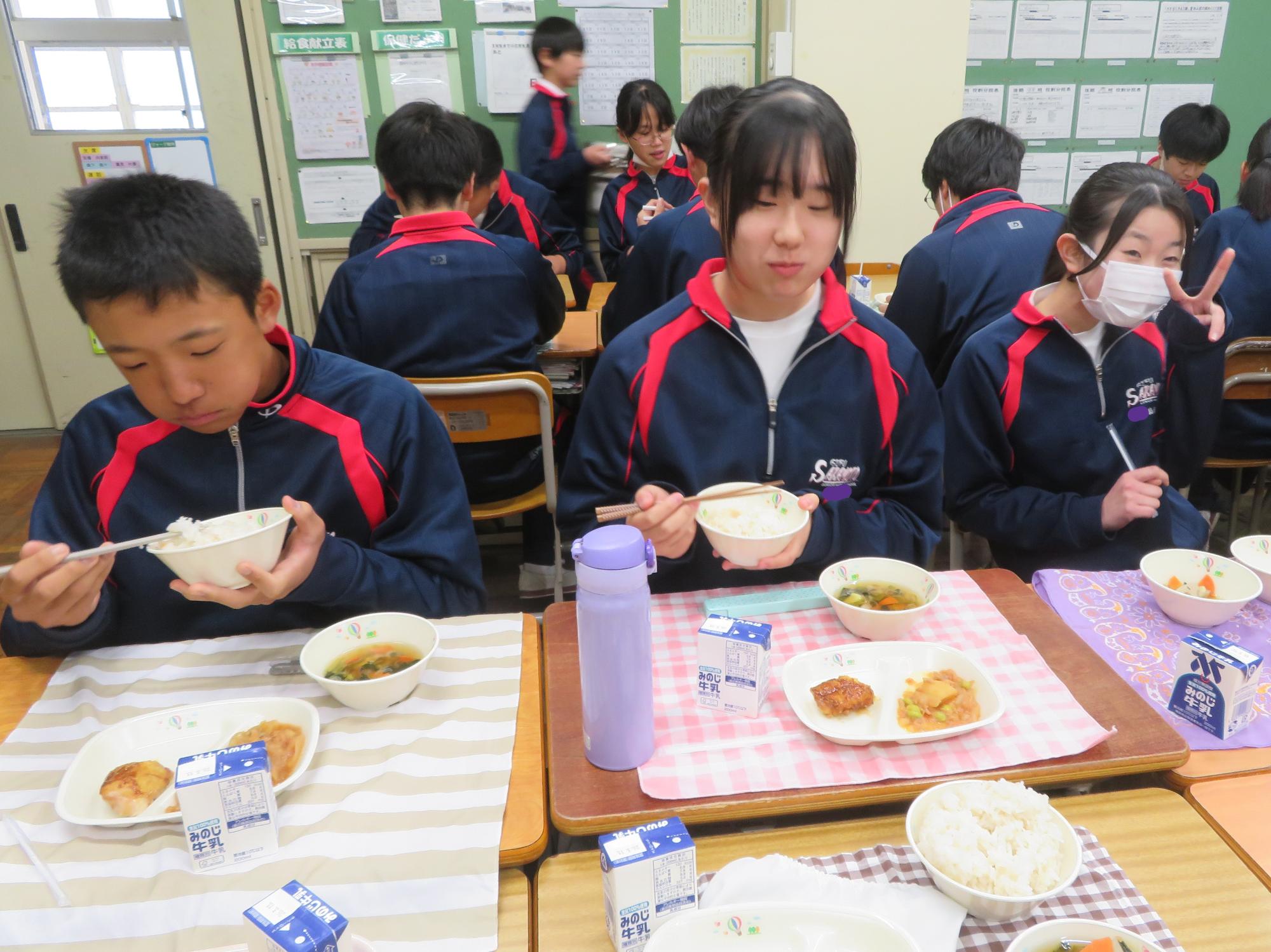坂本中の2年生の生徒3名が岐阜県学校給食選手権に給食メニューを応募しました。そのメニューが本日の給食に登場しました。今までに家庭科の授業を中心に学習したことをもとに、栄養のことや地産地消のことを考えた素敵なメニューです。そのメニューは、ごはんとともに、トマト肉じゃが、鶏肉の五平だれかけ、根菜わっしょい汁です。根菜わっしょうい汁は、レンコンやサツマイモなど根菜いっぱいの栄養満点の汁です。また、五平だれのかかった鶏肉は、中津川市風の味付けです。仲間が考えた給食を全校生徒が無我夢中で食べていた本日の給食時間でした