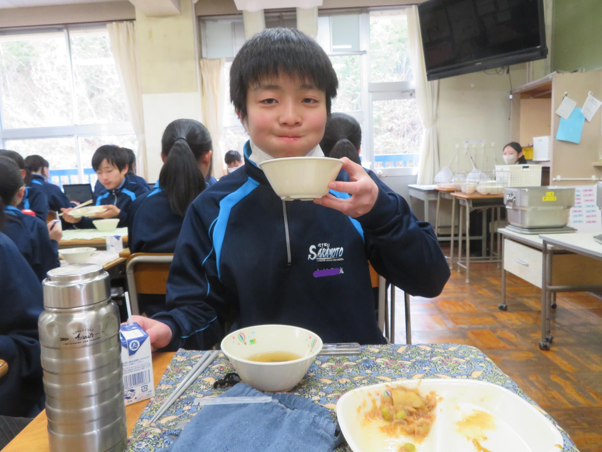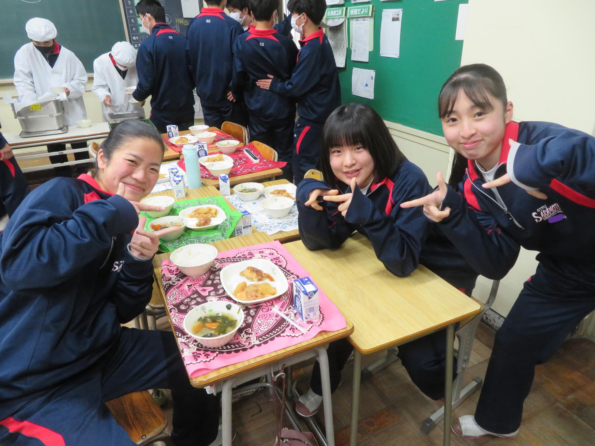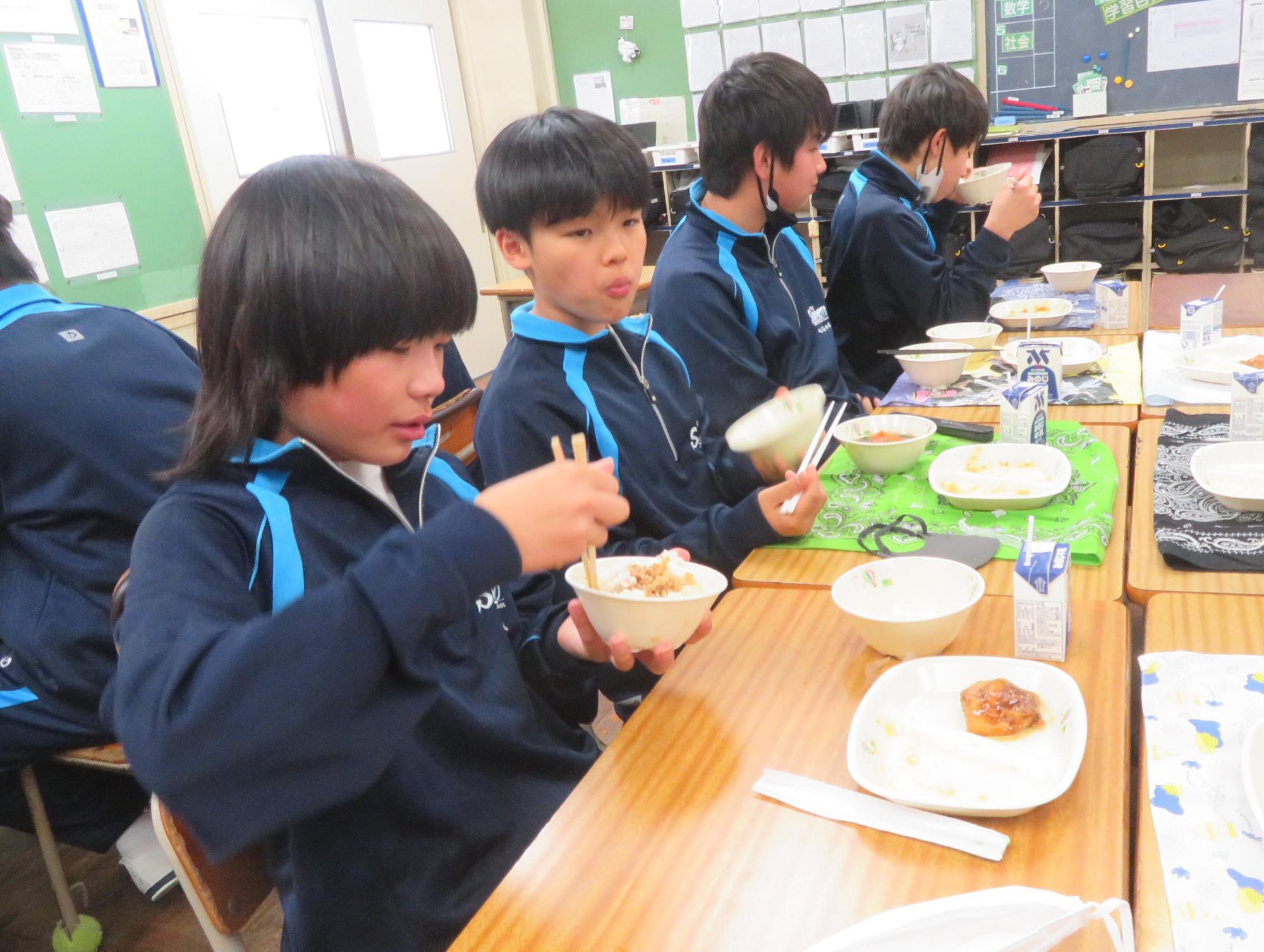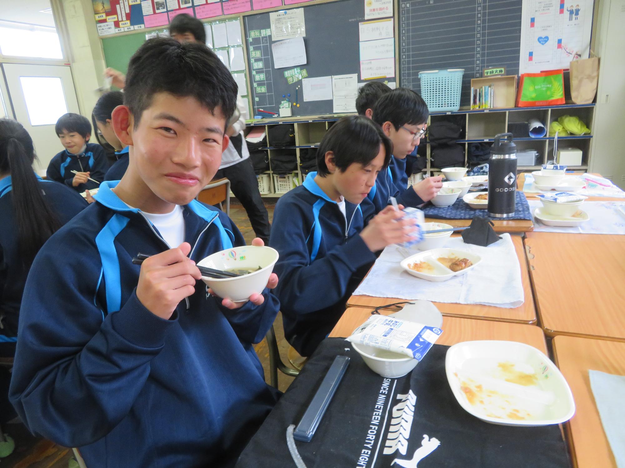 坂本中の2年生の生徒3名が岐阜県学校給食選手権に給食メニューを応募しました。そのメニューが本日の給食に登場しました。今までに家庭科の授業を中心に学習したことをもとに、栄養のことや地産地消のことを考えた素敵なメニューです。そのメニューは、ごはんとともに、トマト肉じゃが、鶏肉の五平だれかけ、根菜わっしょい汁です。根菜わっしょうい汁は、レンコンやサツマイモなど根菜いっぱいの栄養満点の汁です。また、五平だれのかかった鶏肉は、中津川市風の味付けです。仲間が考えた給食を全校生徒が無我夢中で食べていた本日の給食時間でした