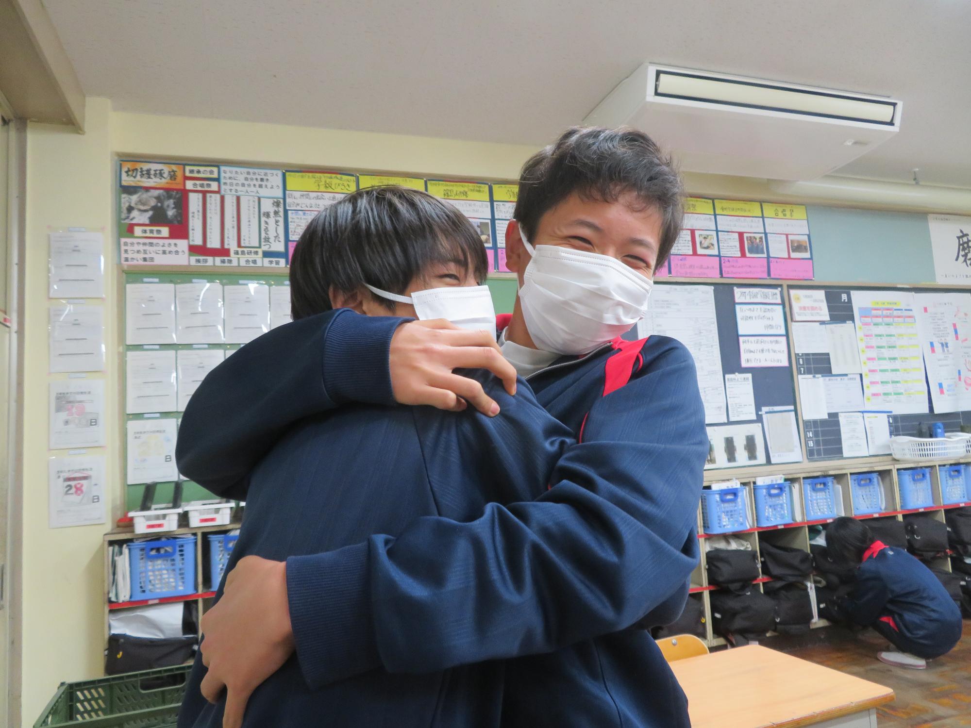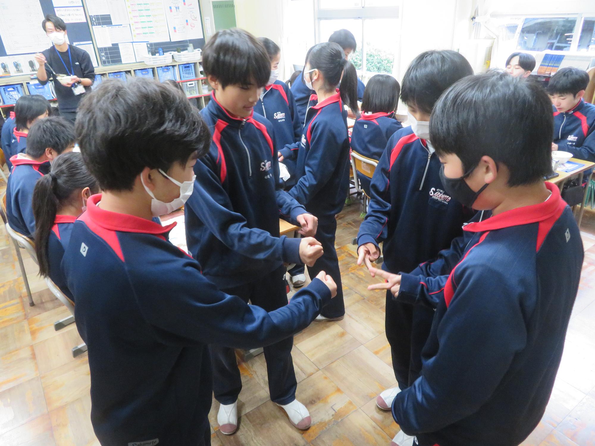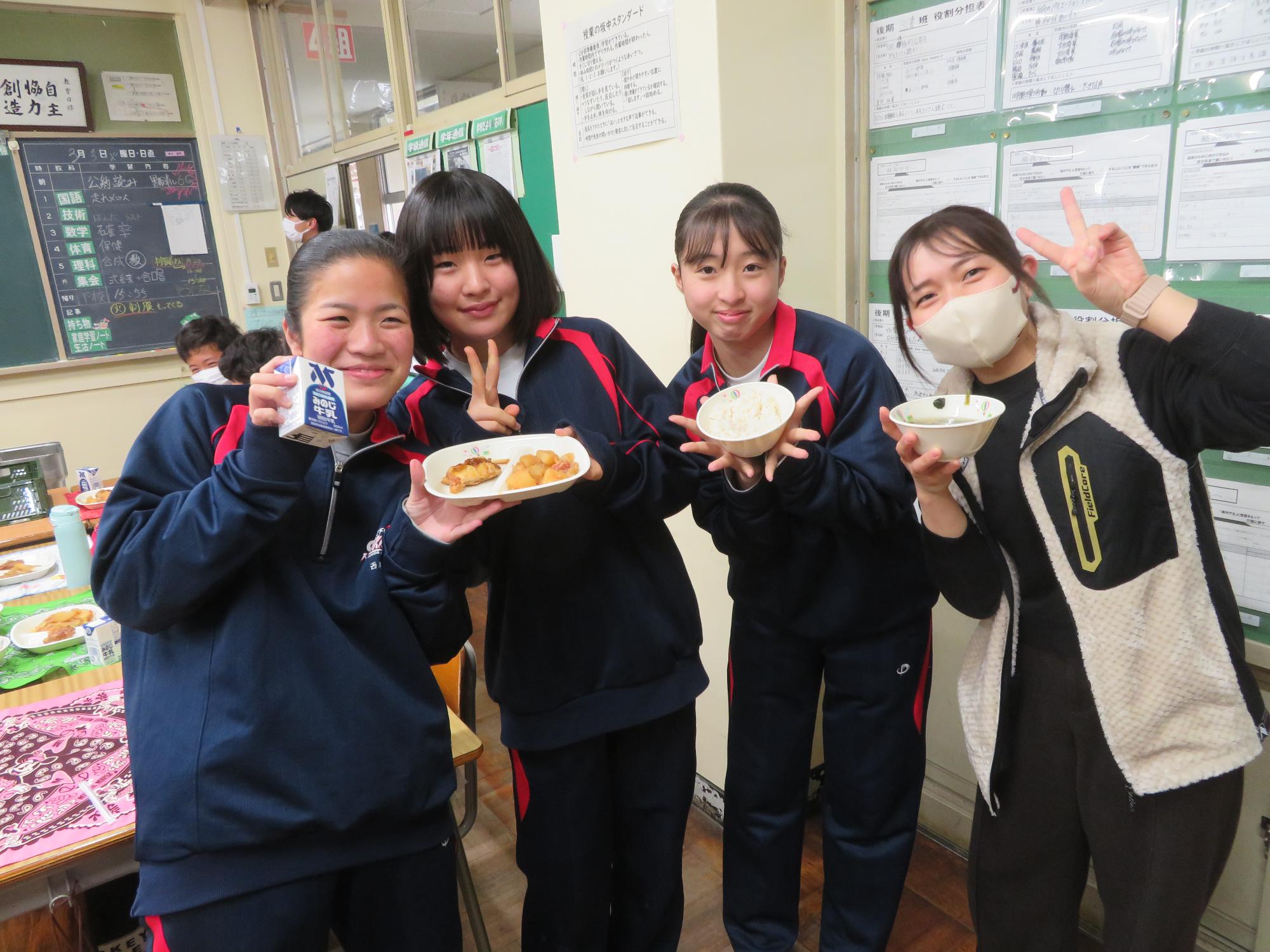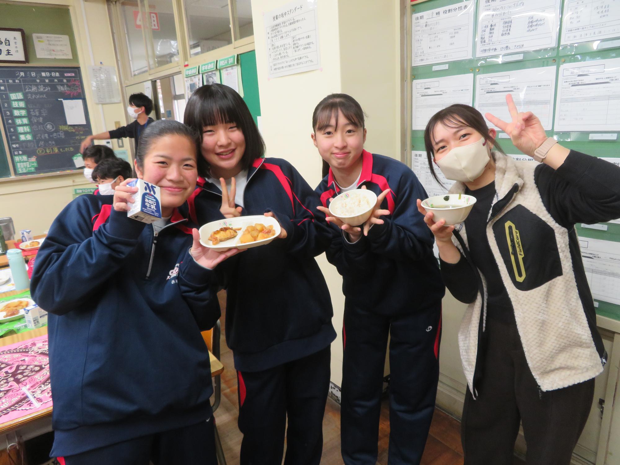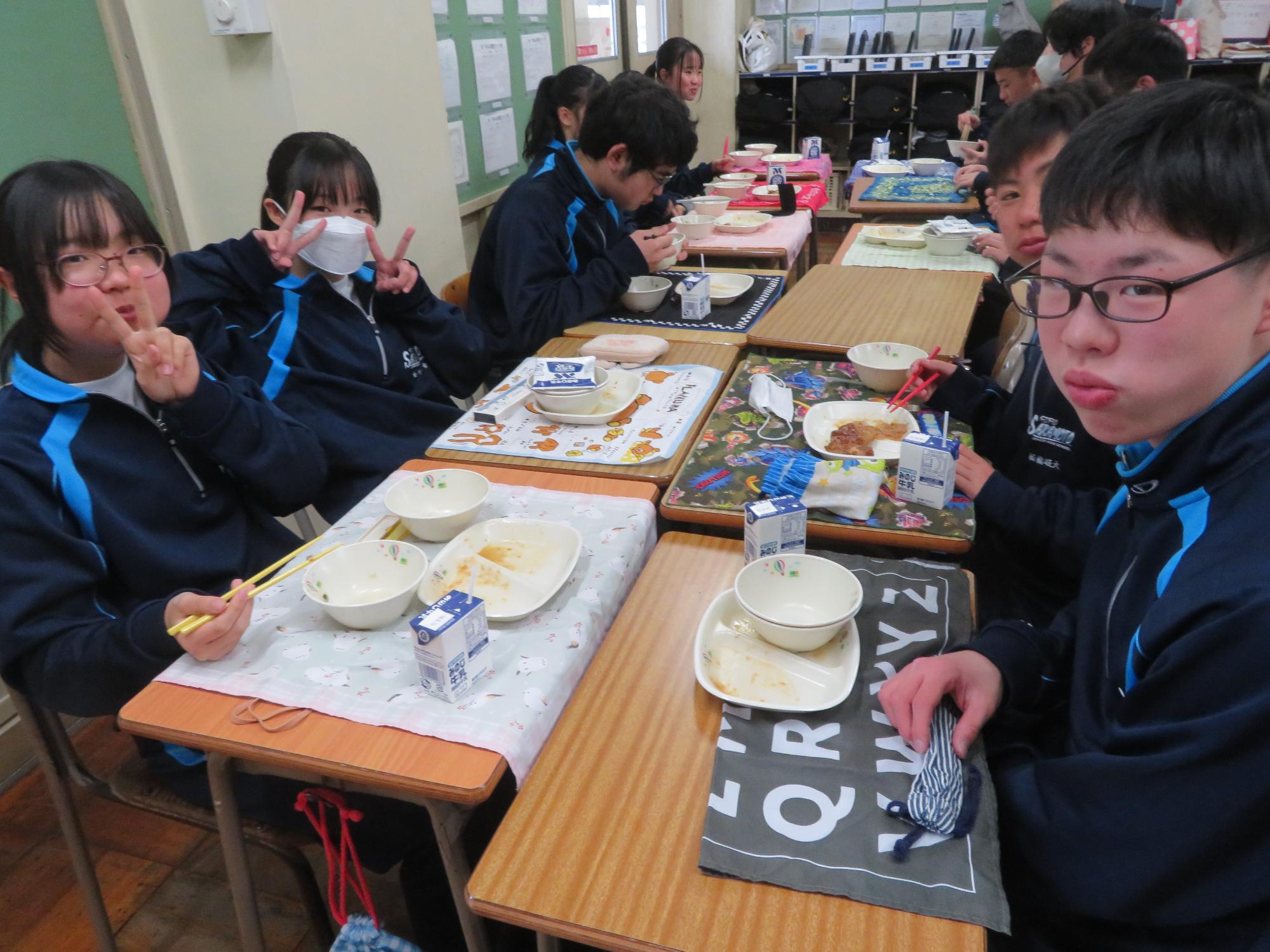 坂本中の2年生の生徒3名が岐阜県学校給食選手権に給食メニューを応募しました。そのメニューが本日の給食に登場しました。今までに家庭科の授業を中心に学習したことをもとに、栄養のことや地産地消のことを考えた素敵なメニューです。そのメニューは、ごはんとともに、トマト肉じゃが、鶏肉の五平だれかけ、根菜わっしょい汁です。根菜わっしょうい汁は、レンコンやサツマイモなど根菜いっぱいの栄養満点の汁です。また、五平だれのかかった鶏肉は、中津川市風の味付けです。仲間が考えた給食を全校生徒が無我夢中で食べていた本日の給食時間でした