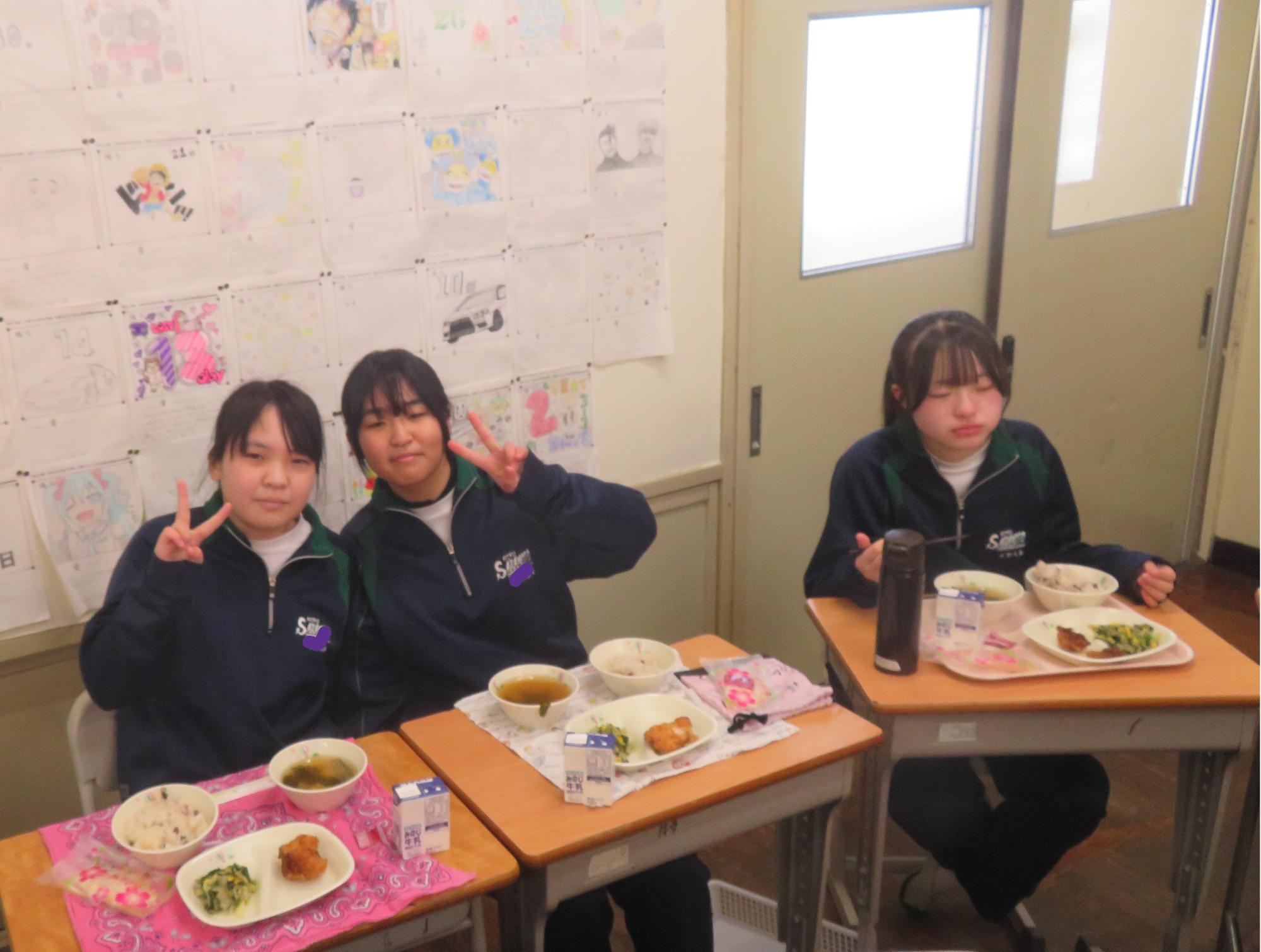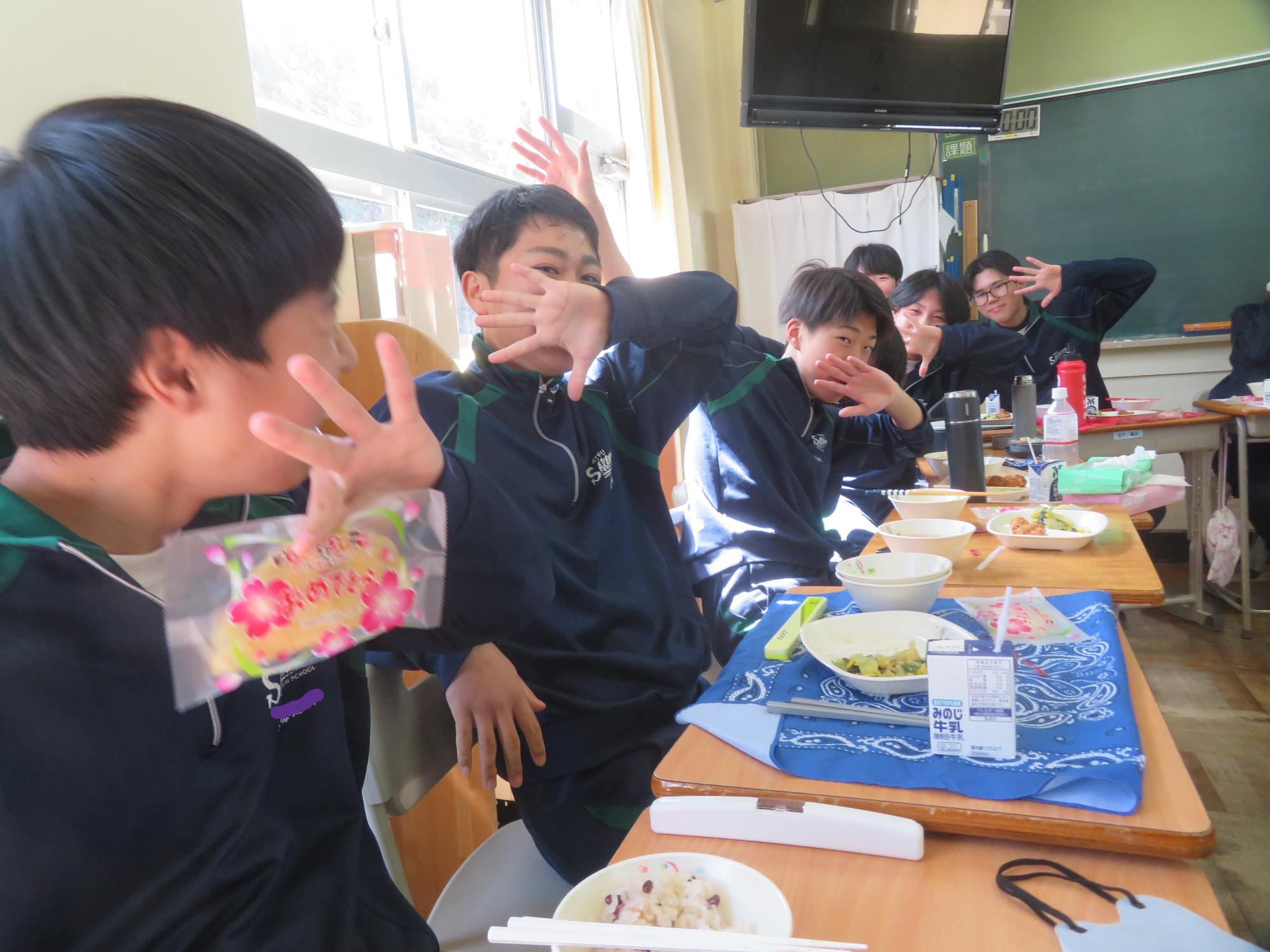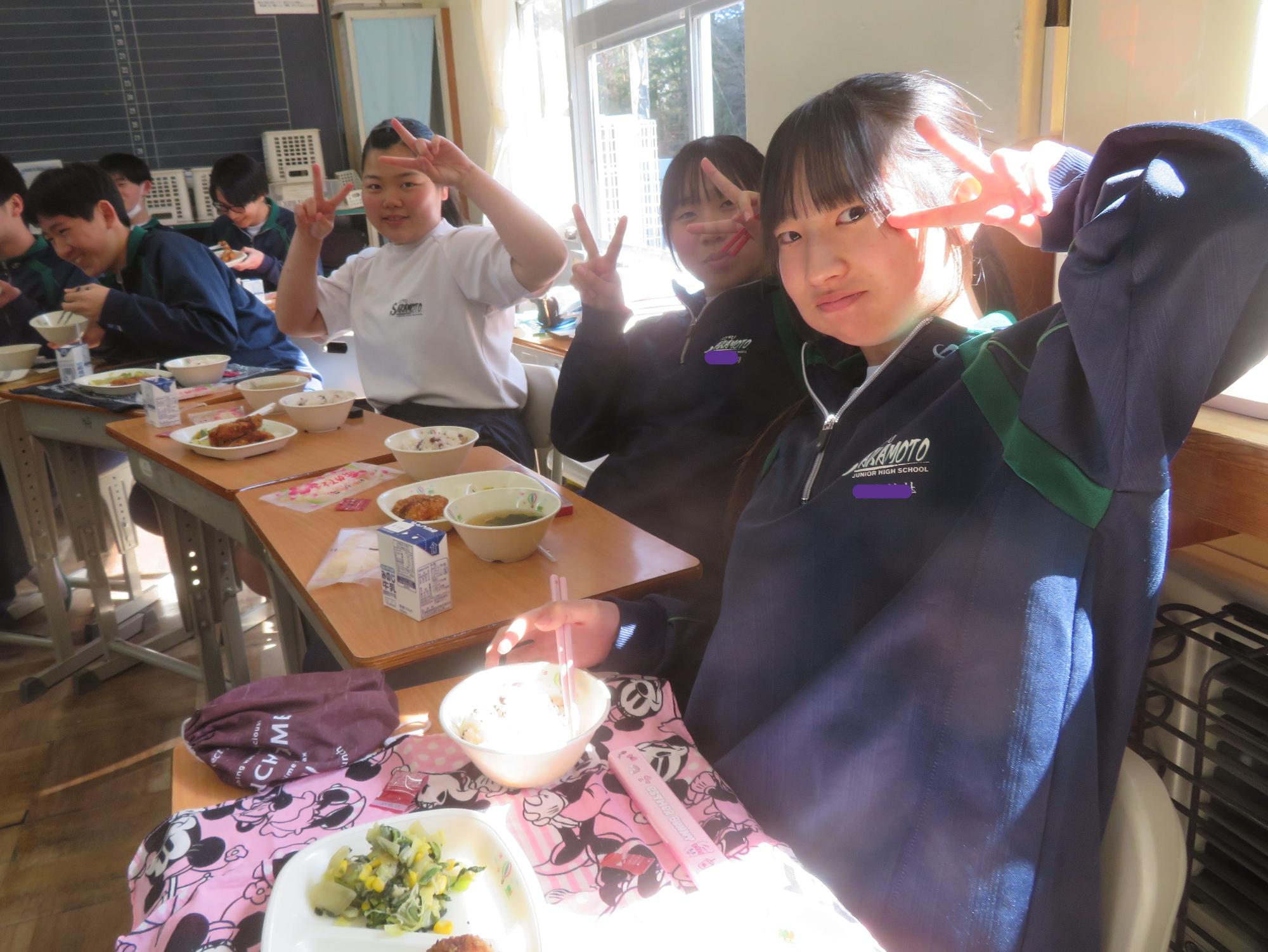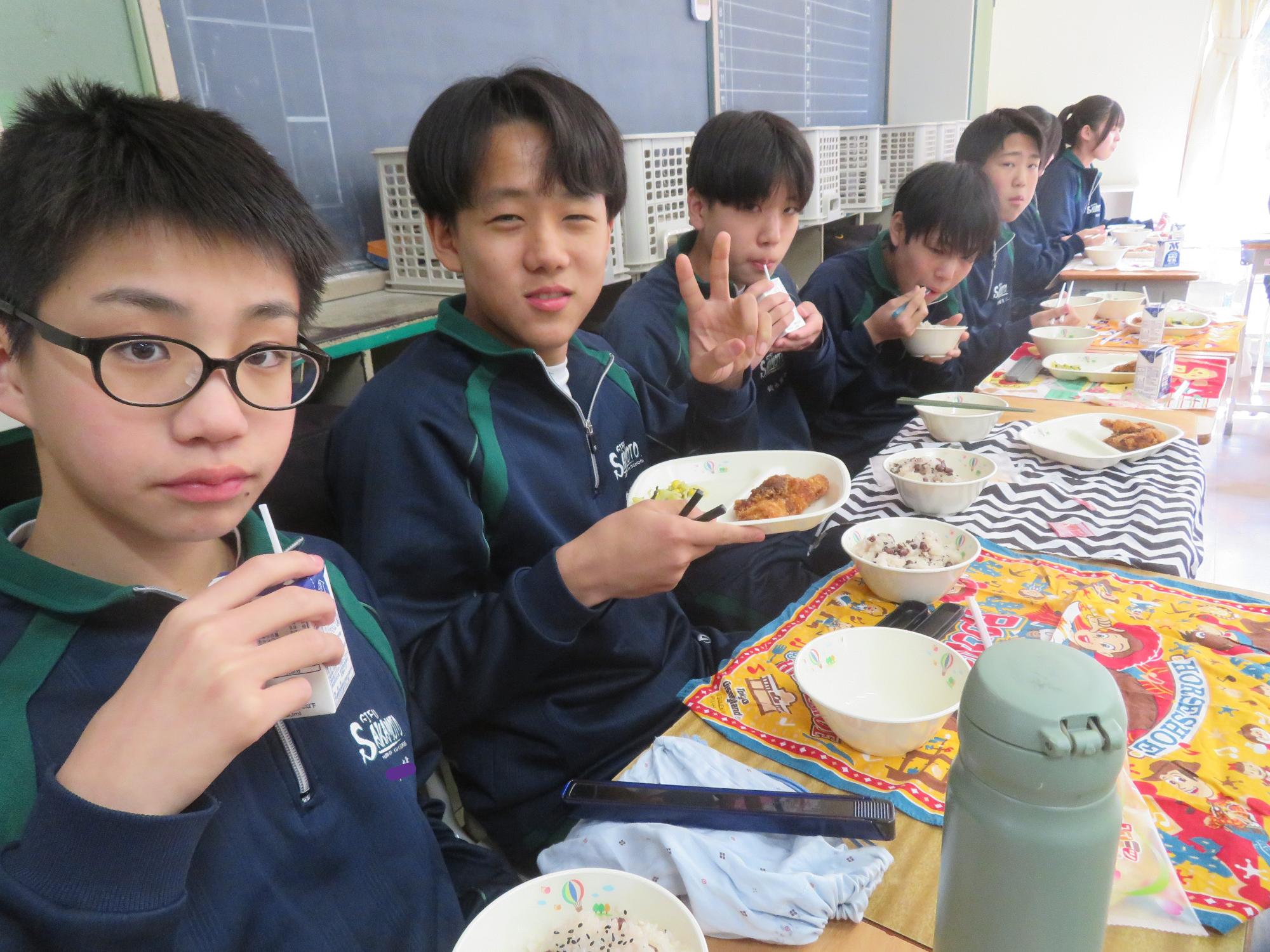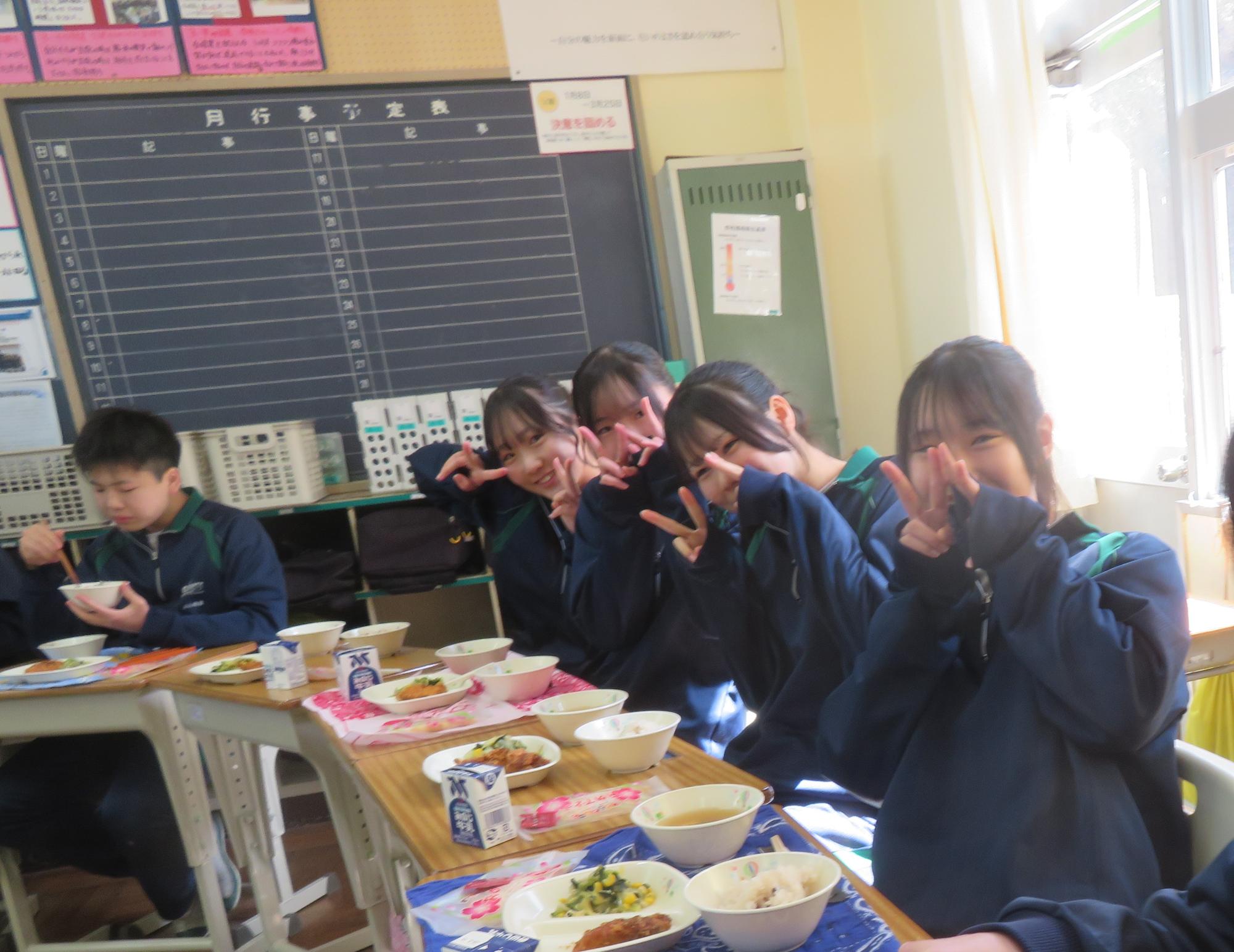 いよいよ3年生 最後の学校給食! 更新日:2026年03月05日 3年生は今日が最後の給食です。9年間の最後の給食は、どのクラスも輪になって、全員の顔を見ながら食べていました。お祝いの赤飯とチキンカツを味わいながら、最後の給食を惜しみながら食べていました。最後に卒業のお祝いのクレープを「いよいよこれを食べてしまったら卒業間近だね。」とじっーと見つめている姿がとっても印象的でした。とってもよく食べてくれた3年生もいよいよ卒業です。