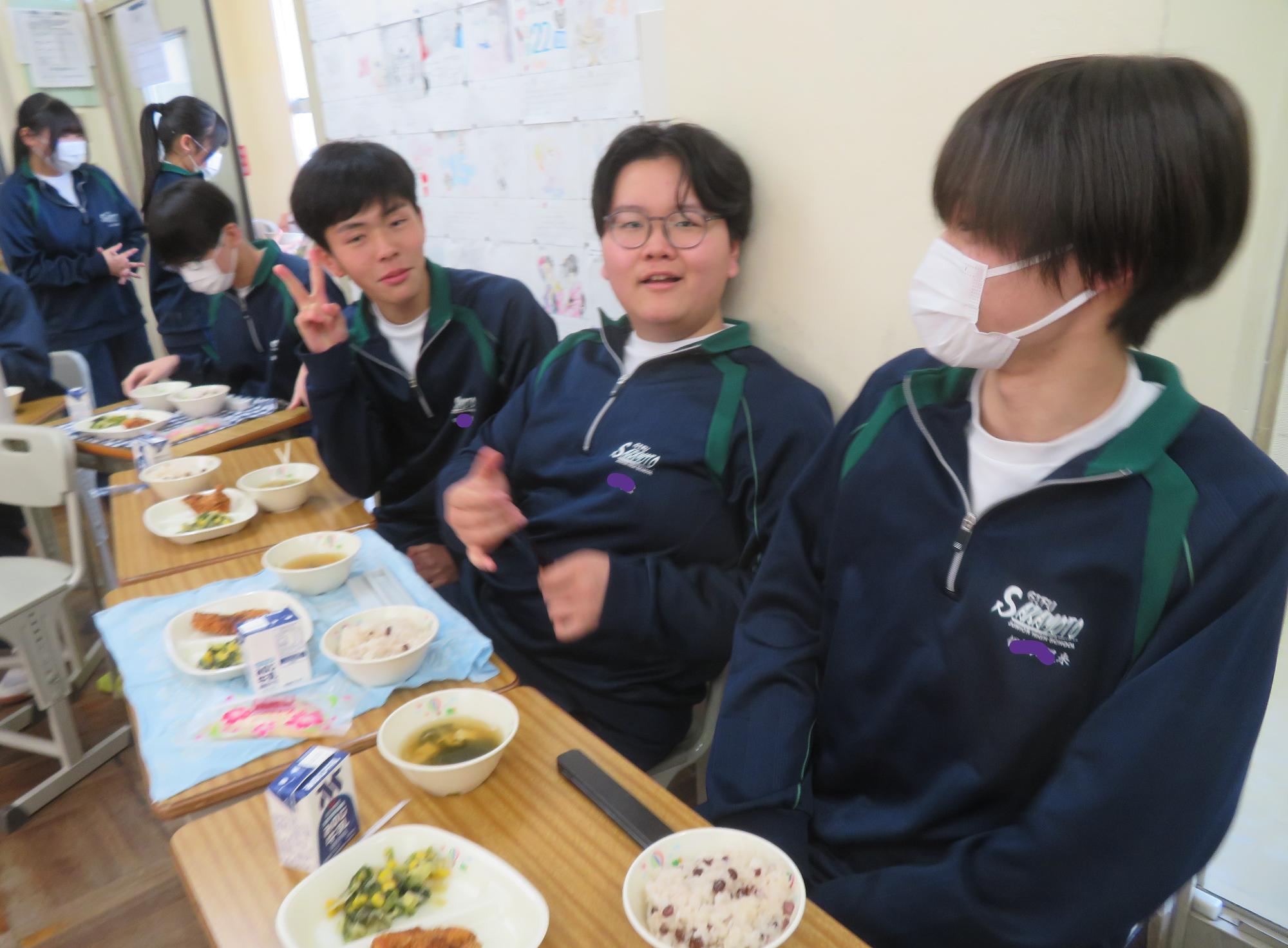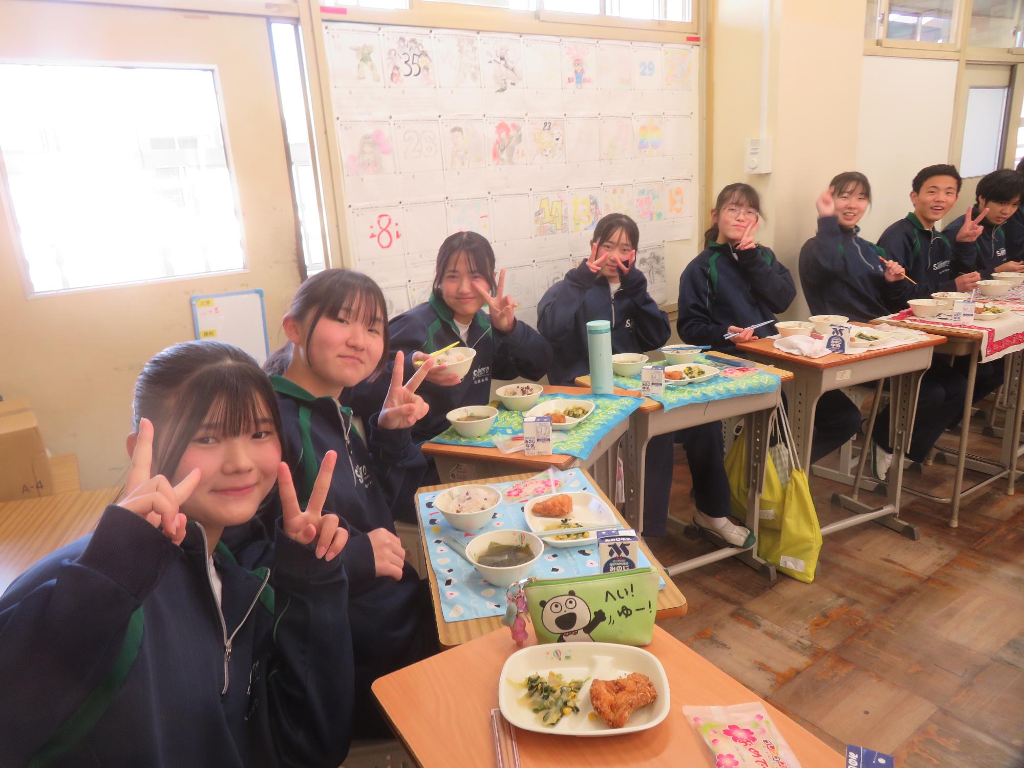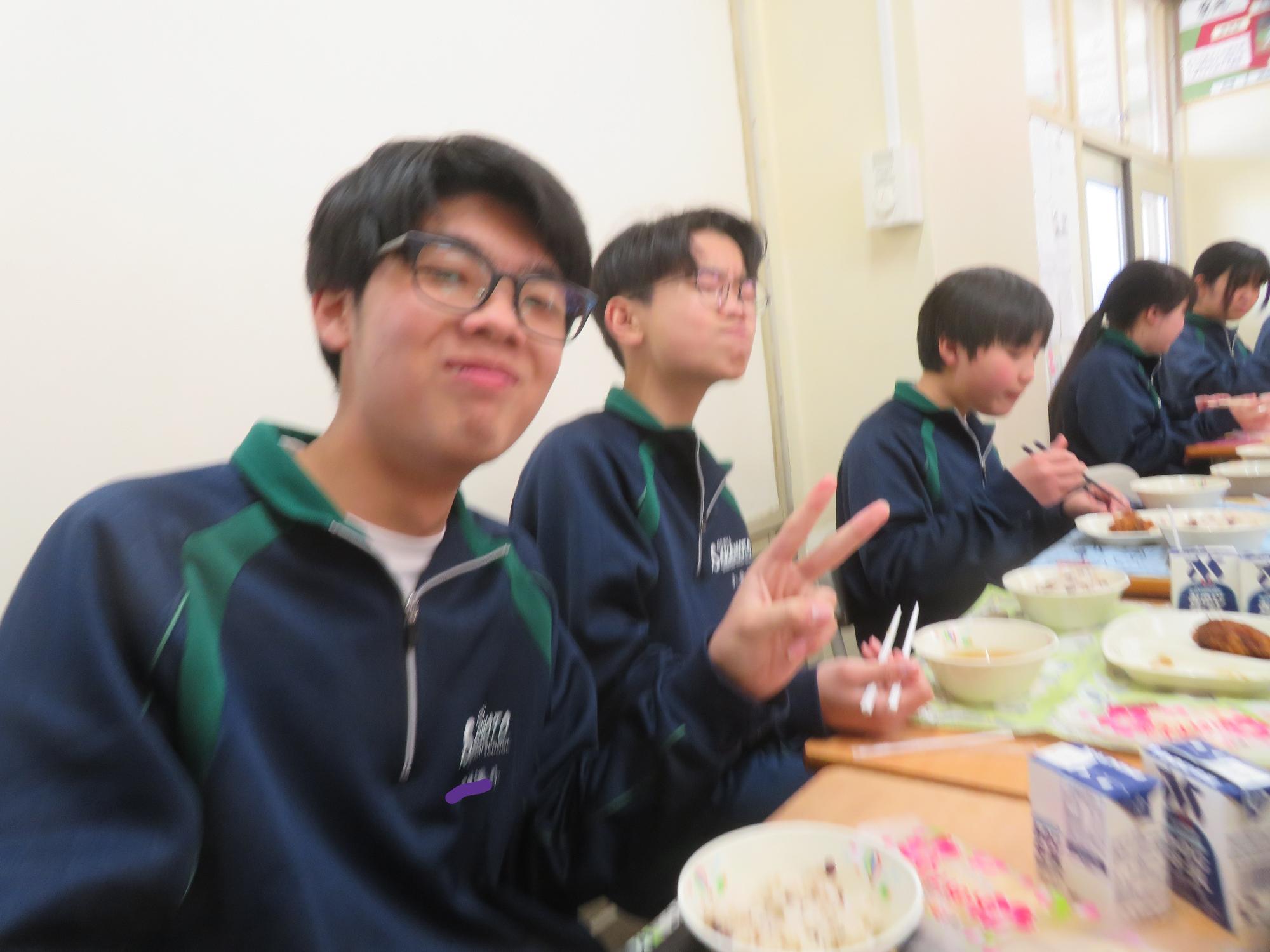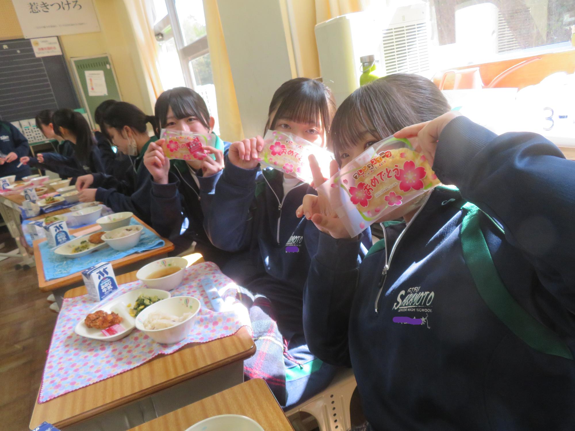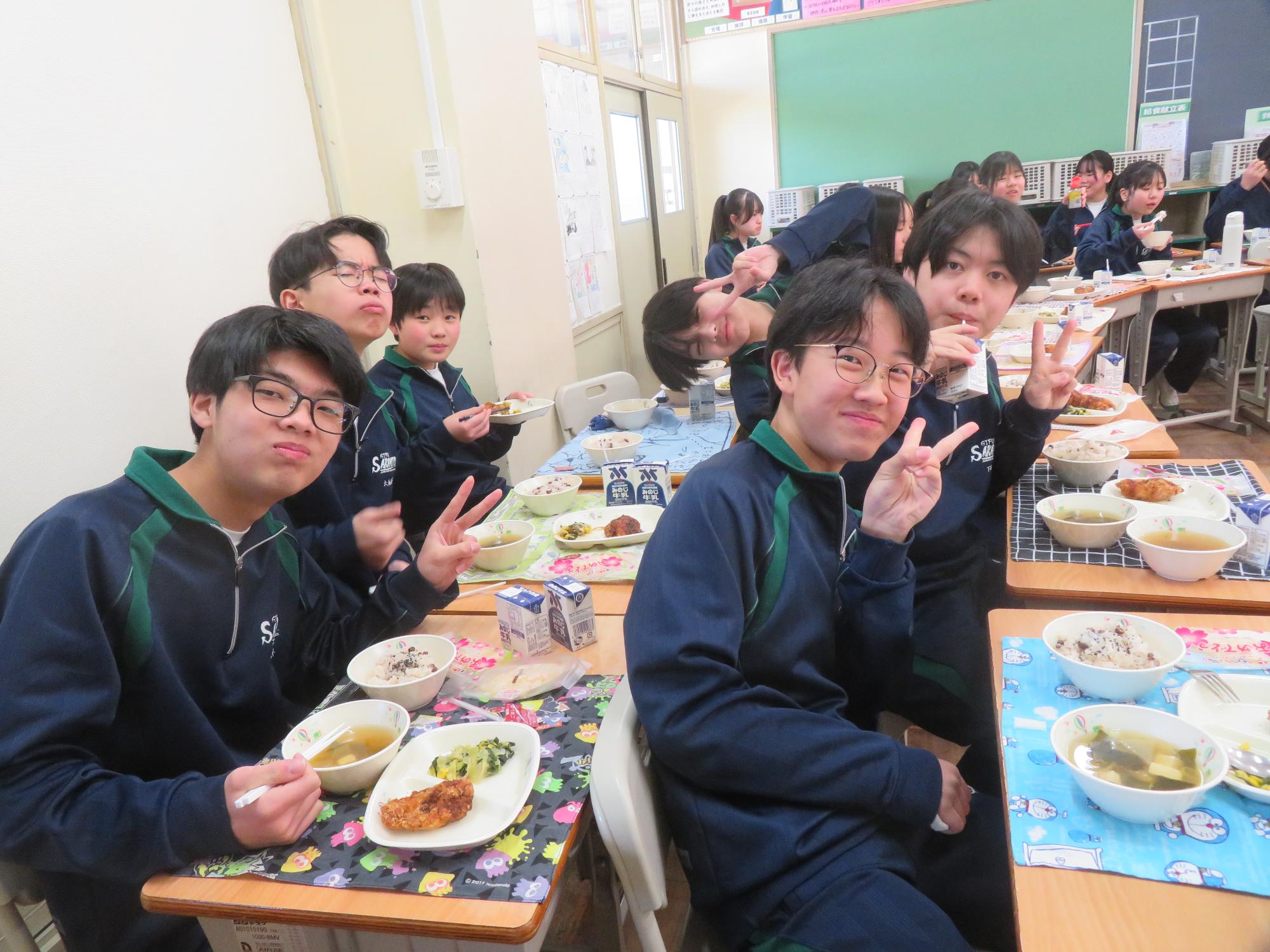 いよいよ3年生 最後の学校給食! 更新日:2026年03月05日 3年生は今日が最後の給食です。9年間の最後の給食は、どのクラスも輪になって、全員の顔を見ながら食べていました。お祝いの赤飯とチキンカツを味わいながら、最後の給食を惜しみながら食べていました。最後に卒業のお祝いのクレープを「いよいよこれを食べてしまったら卒業間近だね。」とじっーと見つめている姿がとっても印象的でした。とってもよく食べてくれた3年生もいよいよ卒業です。