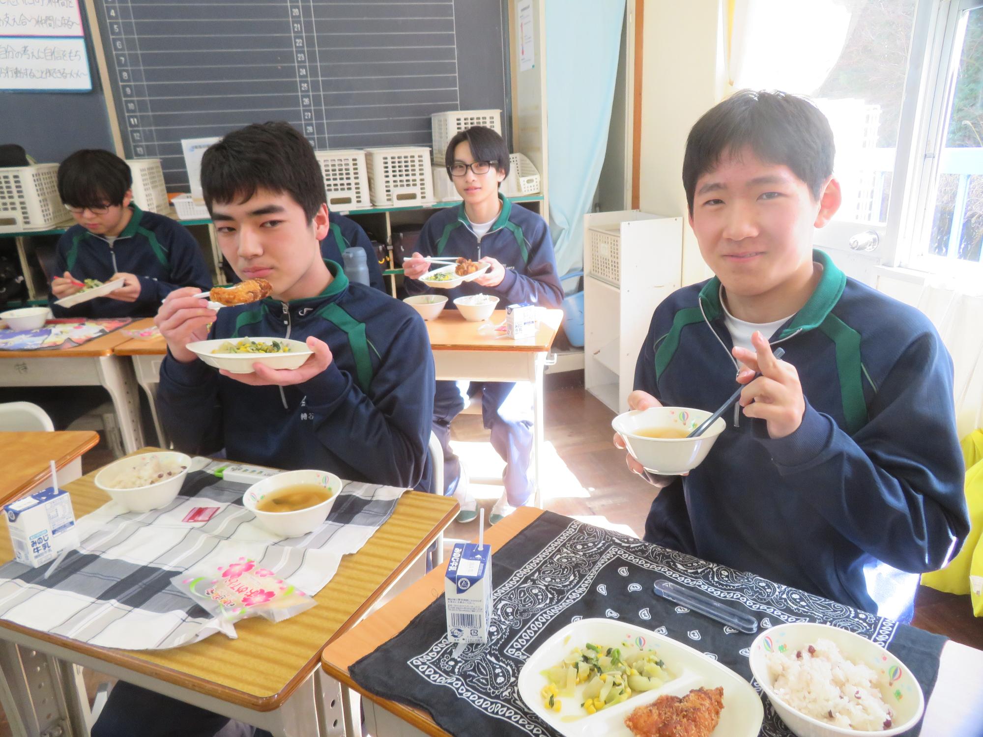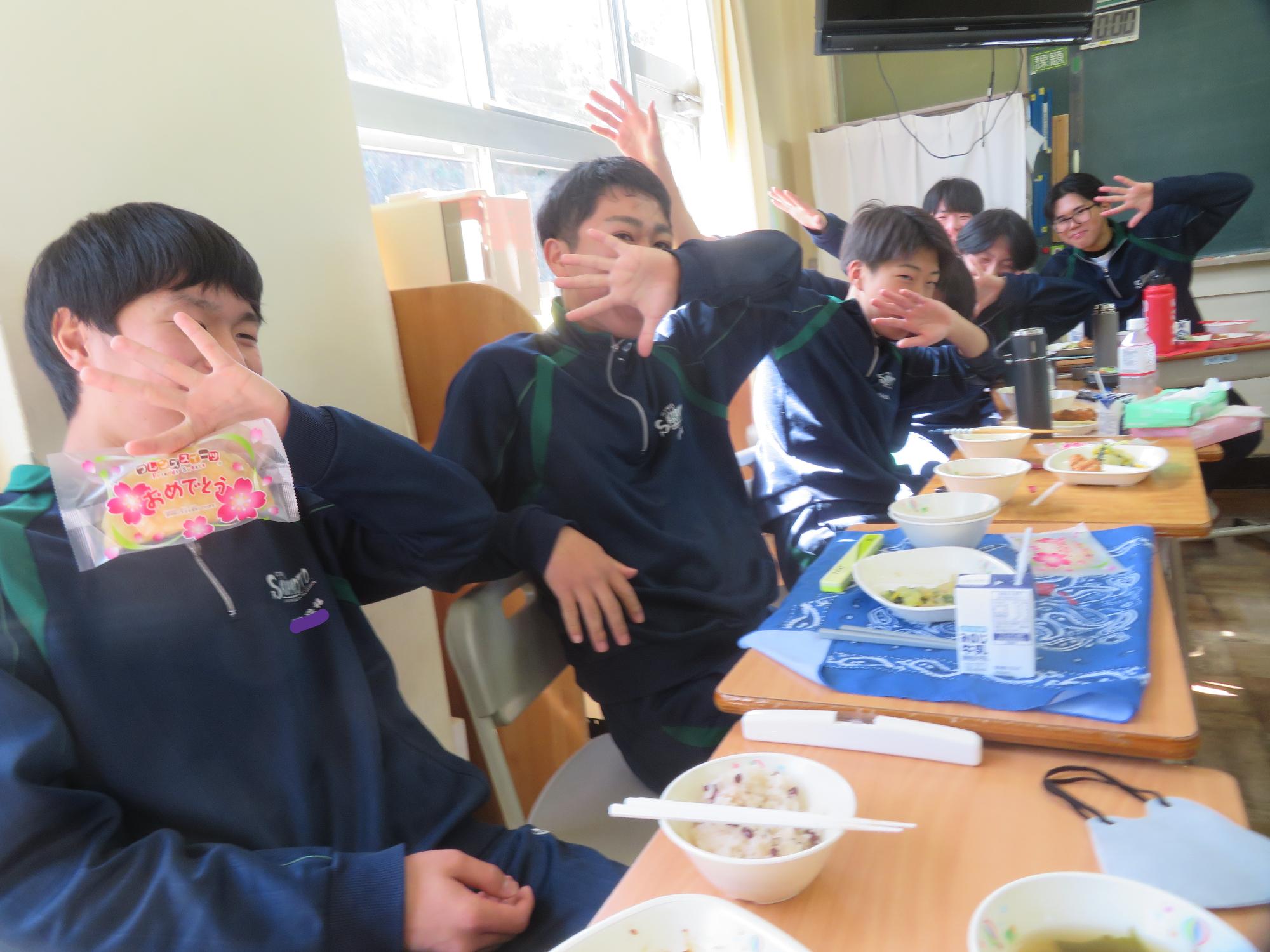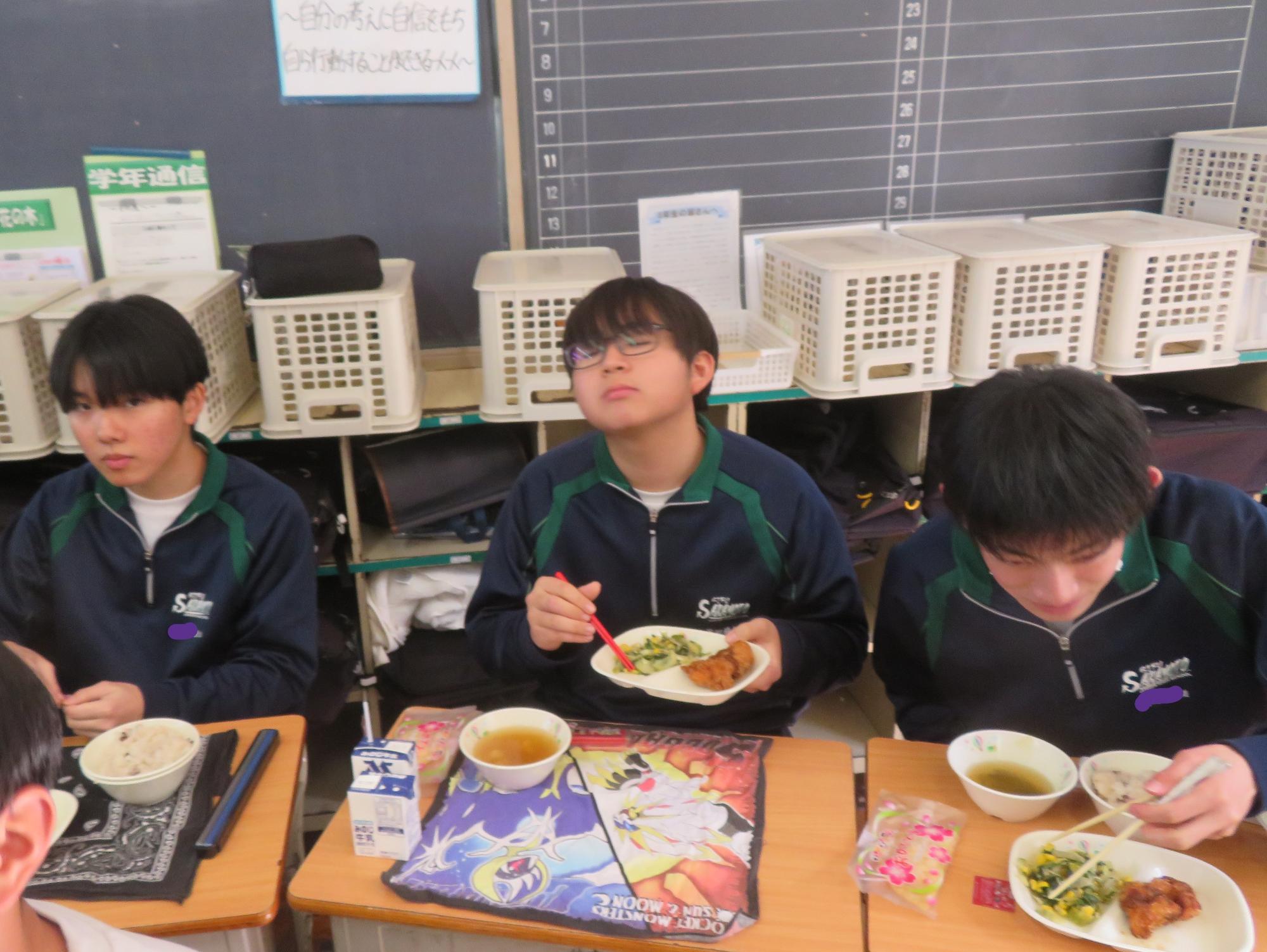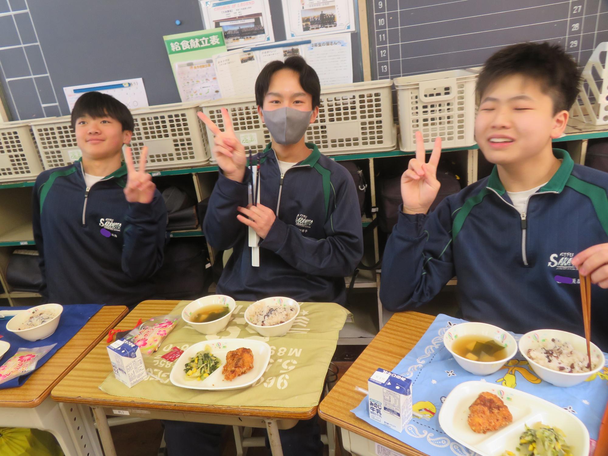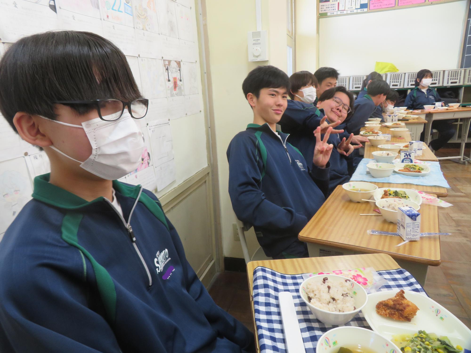 いよいよ3年生 最後の学校給食! 更新日:2026年03月05日 3年生は今日が最後の給食です。9年間の最後の給食は、どのクラスも輪になって、全員の顔を見ながら食べていました。お祝いの赤飯とチキンカツを味わいながら、最後の給食を惜しみながら食べていました。最後に卒業のお祝いのクレープを「いよいよこれを食べてしまったら卒業間近だね。」とじっーと見つめている姿がとっても印象的でした。とってもよく食べてくれた3年生もいよいよ卒業です。
