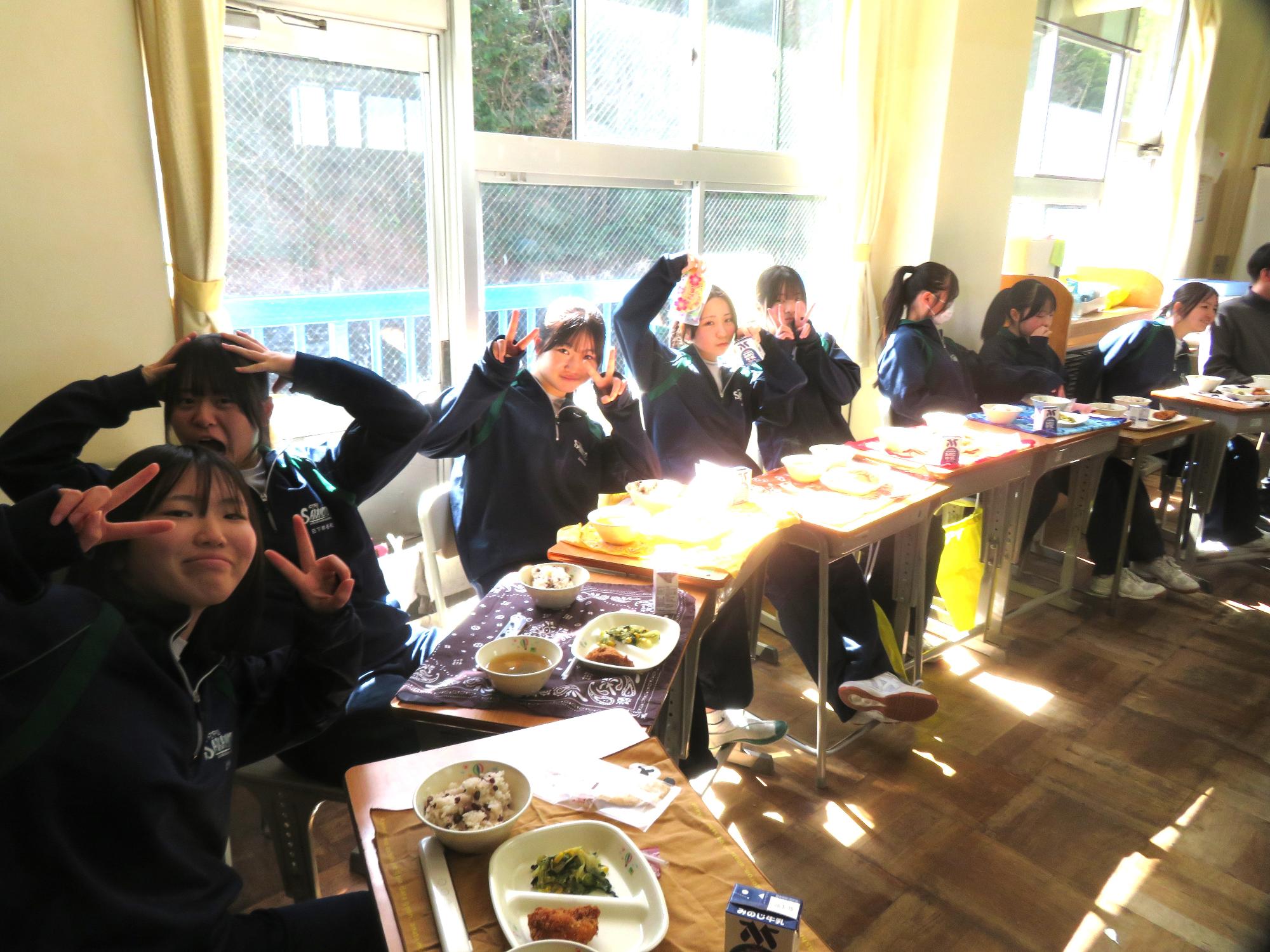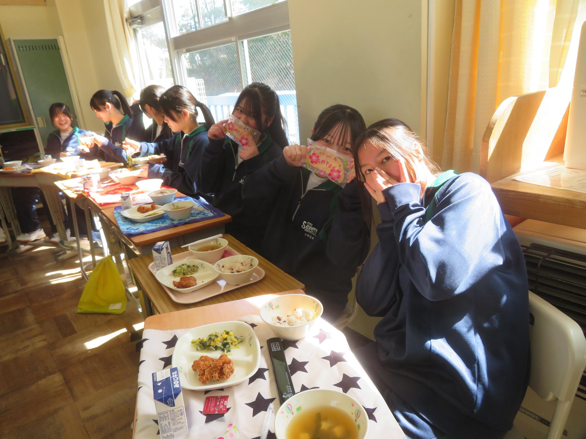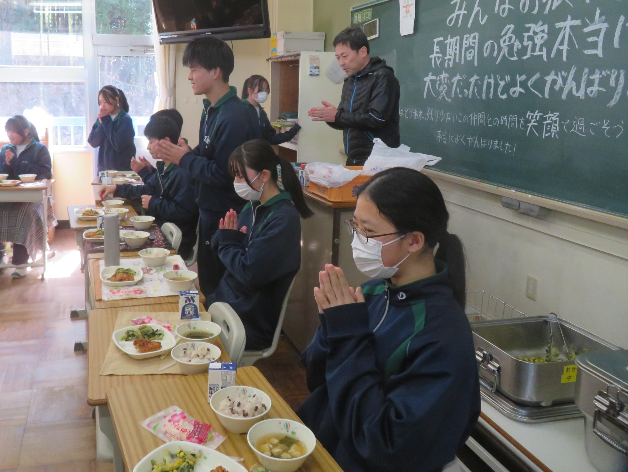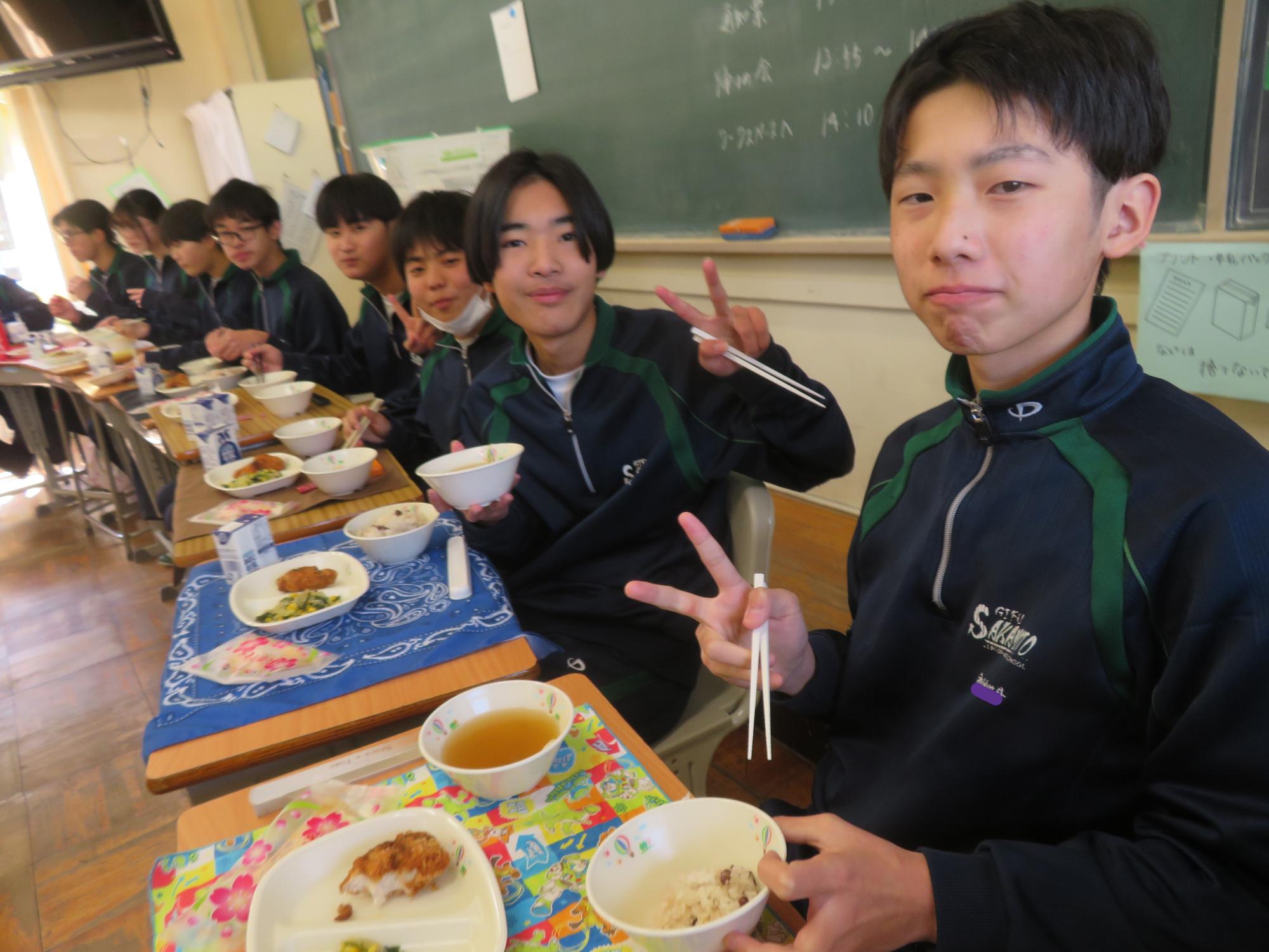 いよいよ3年生 最後の学校給食! 更新日:2026年03月05日 3年生は今日が最後の給食です。9年間の最後の給食は、どのクラスも輪になって、全員の顔を見ながら食べていました。お祝いの赤飯とチキンカツを味わいながら、最後の給食を惜しみながら食べていました。最後に卒業のお祝いのクレープを「いよいよこれを食べてしまったら卒業間近だね。」とじっーと見つめている姿がとっても印象的でした。とってもよく食べてくれた3年生もいよいよ卒業です。