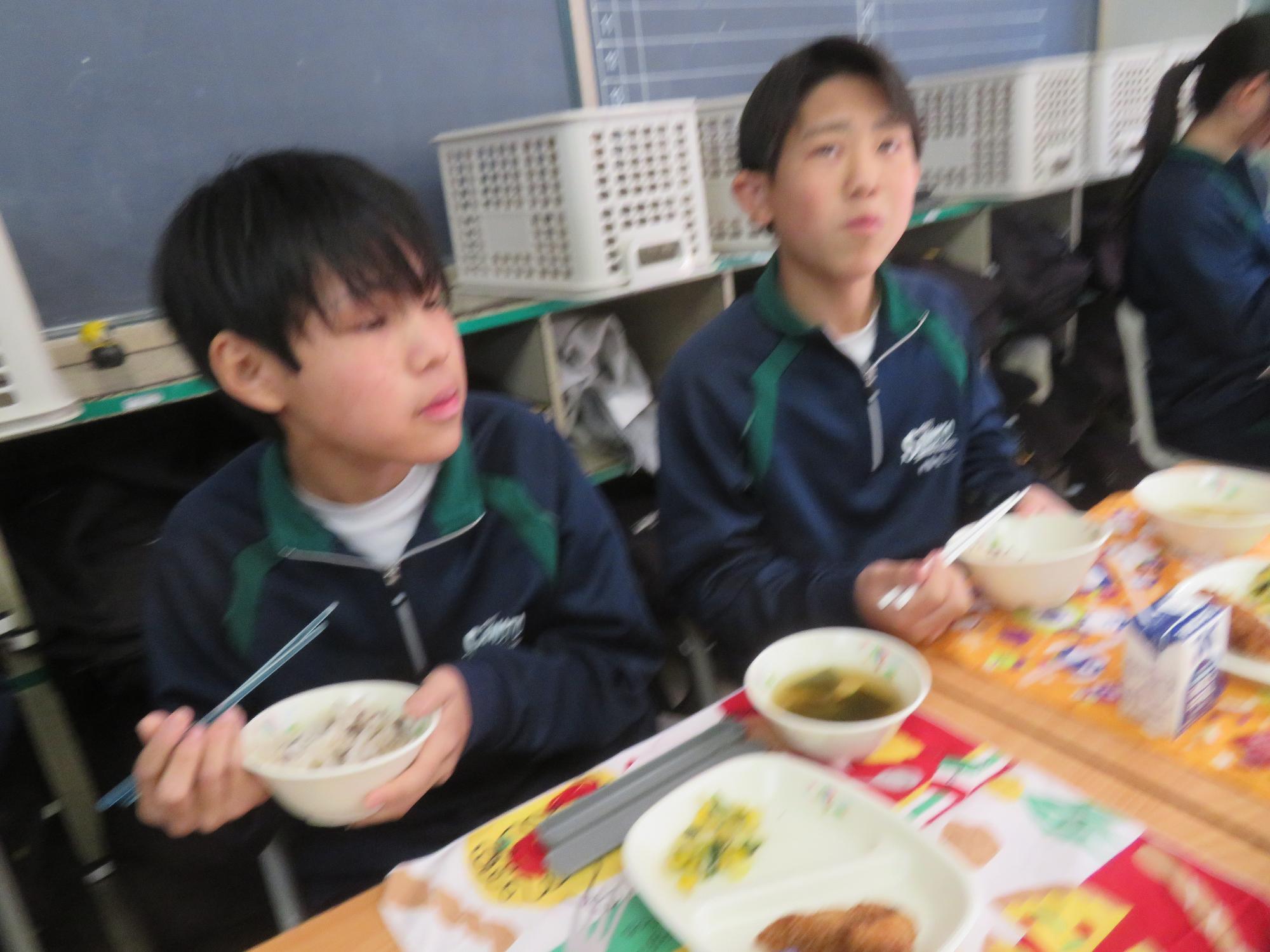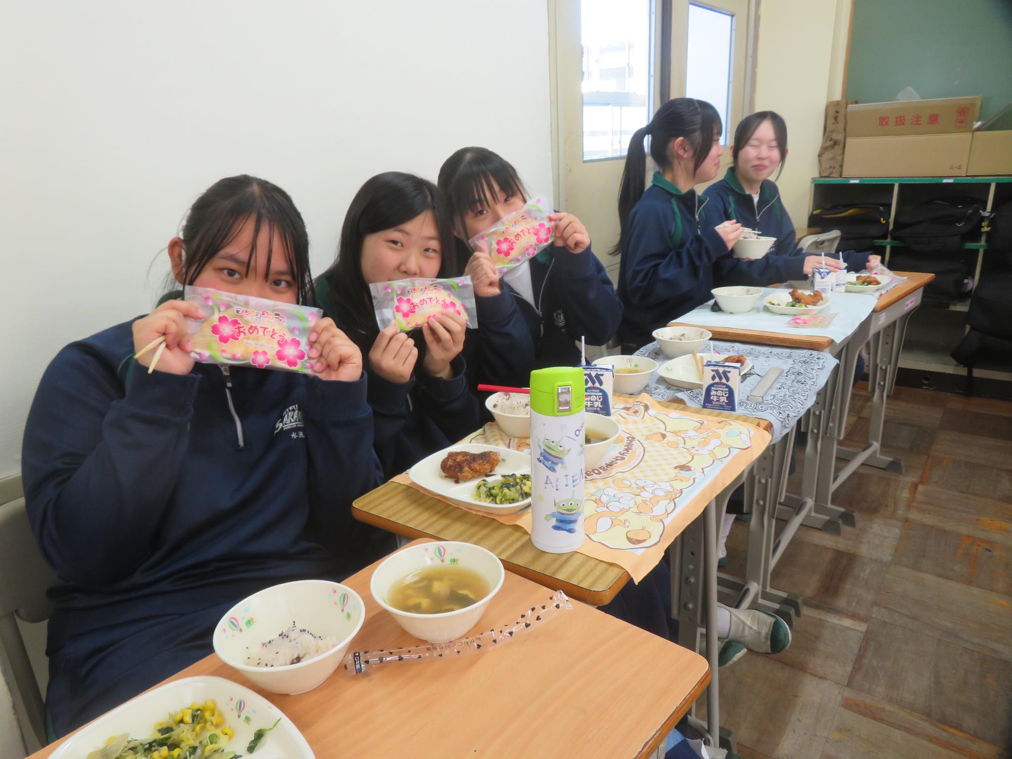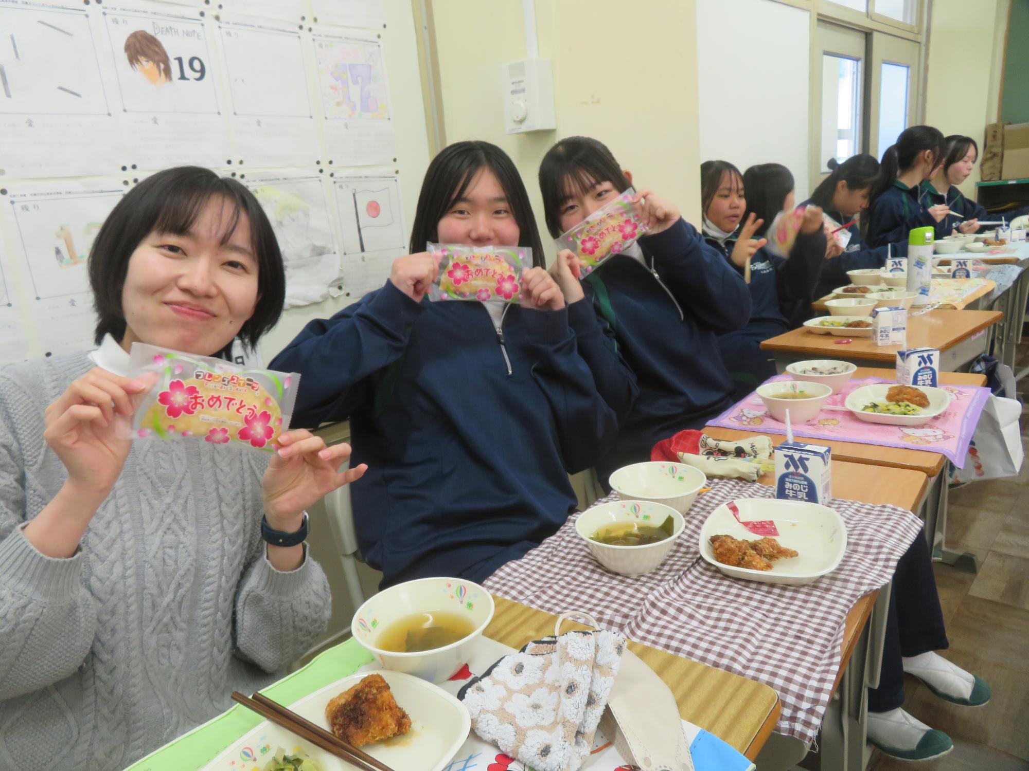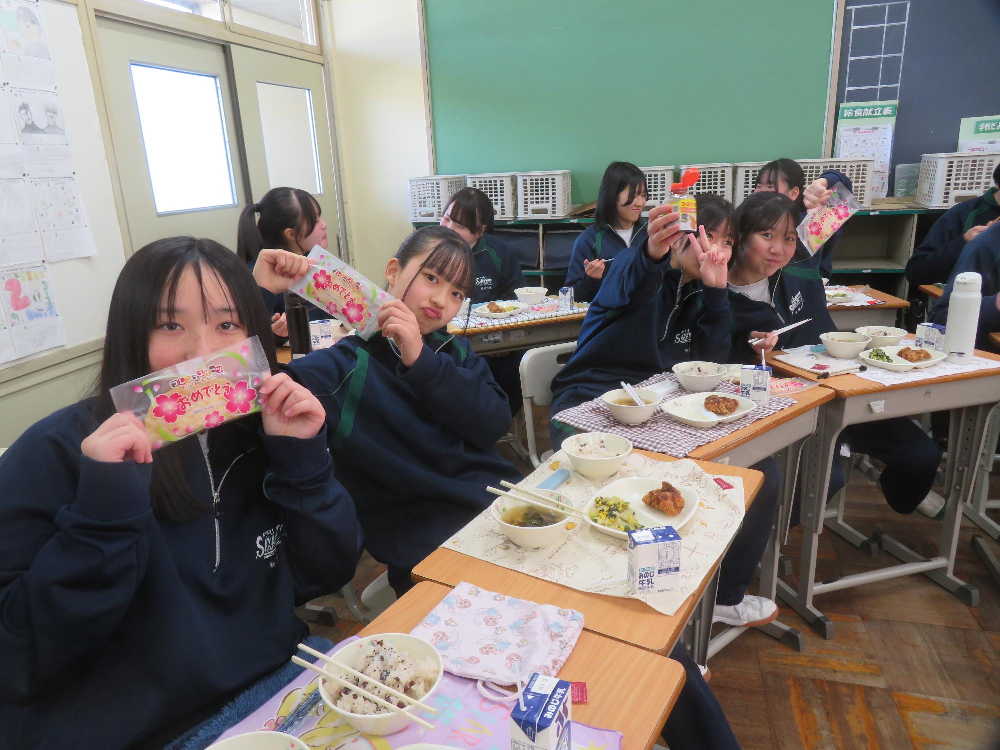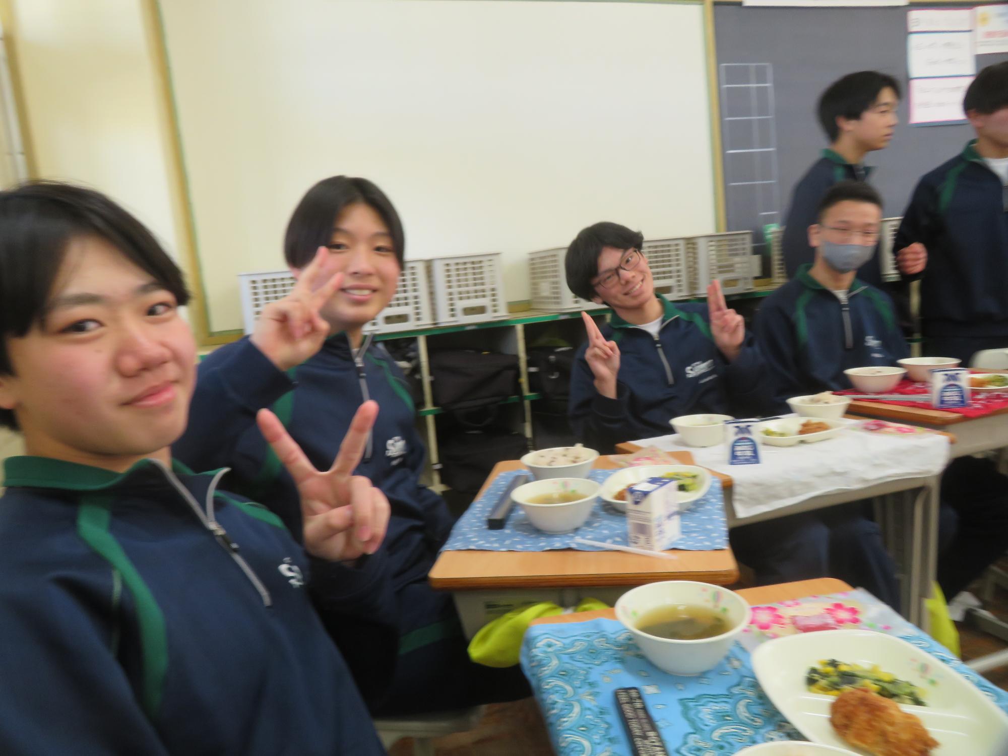 いよいよ3年生 最後の学校給食! 更新日:2026年03月05日 3年生は今日が最後の給食です。9年間の最後の給食は、どのクラスも輪になって、全員の顔を見ながら食べていました。お祝いの赤飯とチキンカツを味わいながら、最後の給食を惜しみながら食べていました。最後に卒業のお祝いのクレープを「いよいよこれを食べてしまったら卒業間近だね。」とじっーと見つめている姿がとっても印象的でした。とってもよく食べてくれた3年生もいよいよ卒業です。