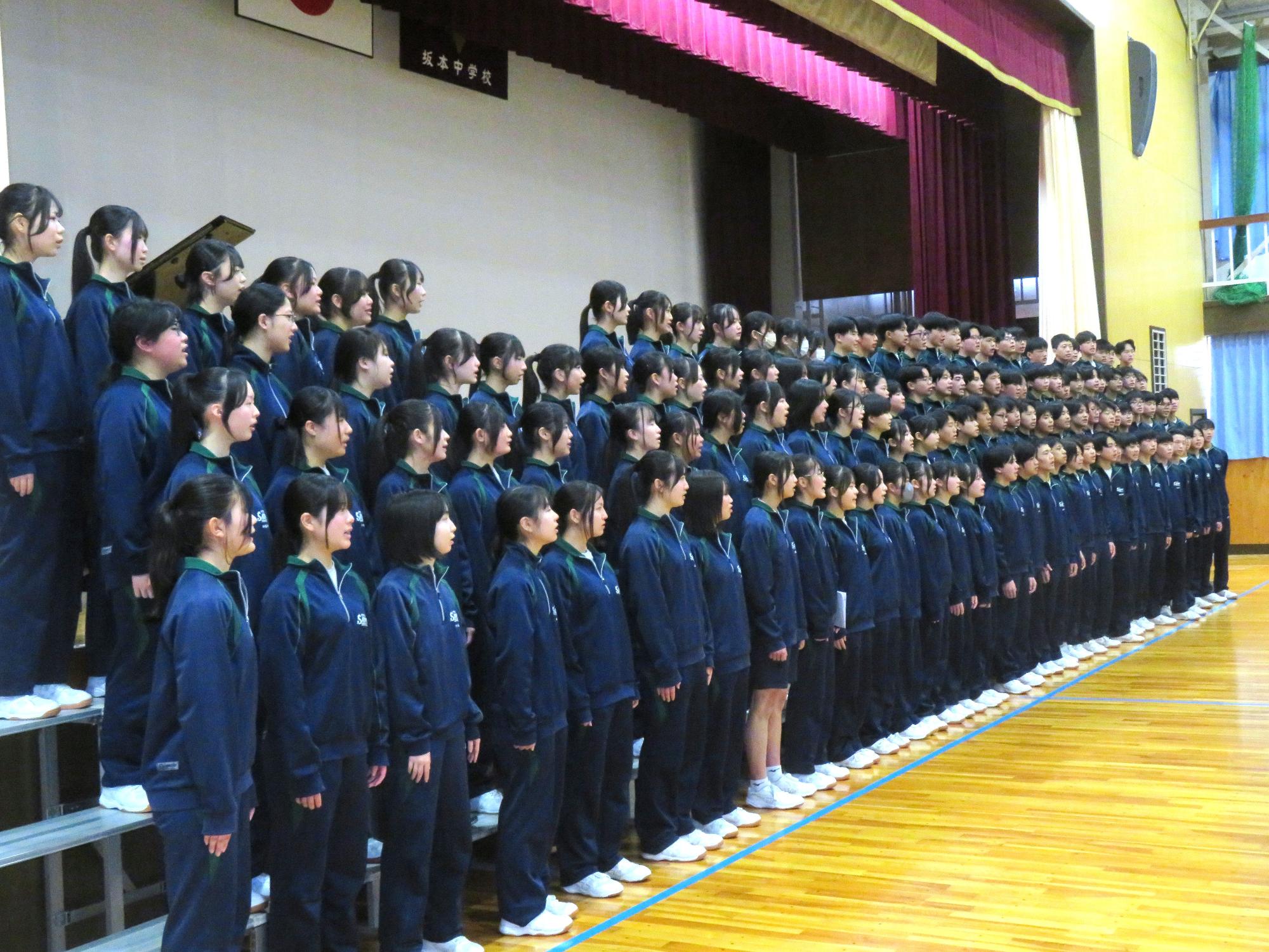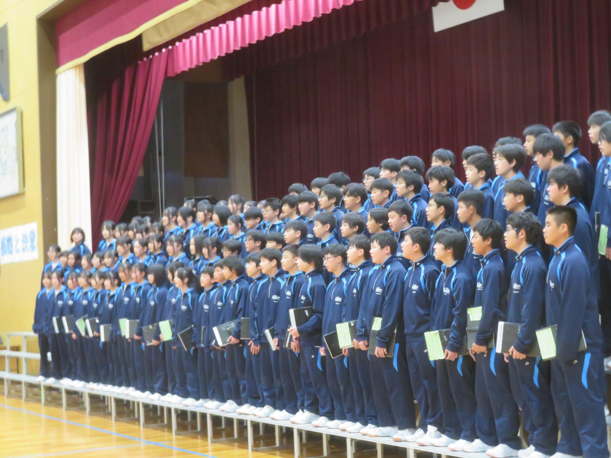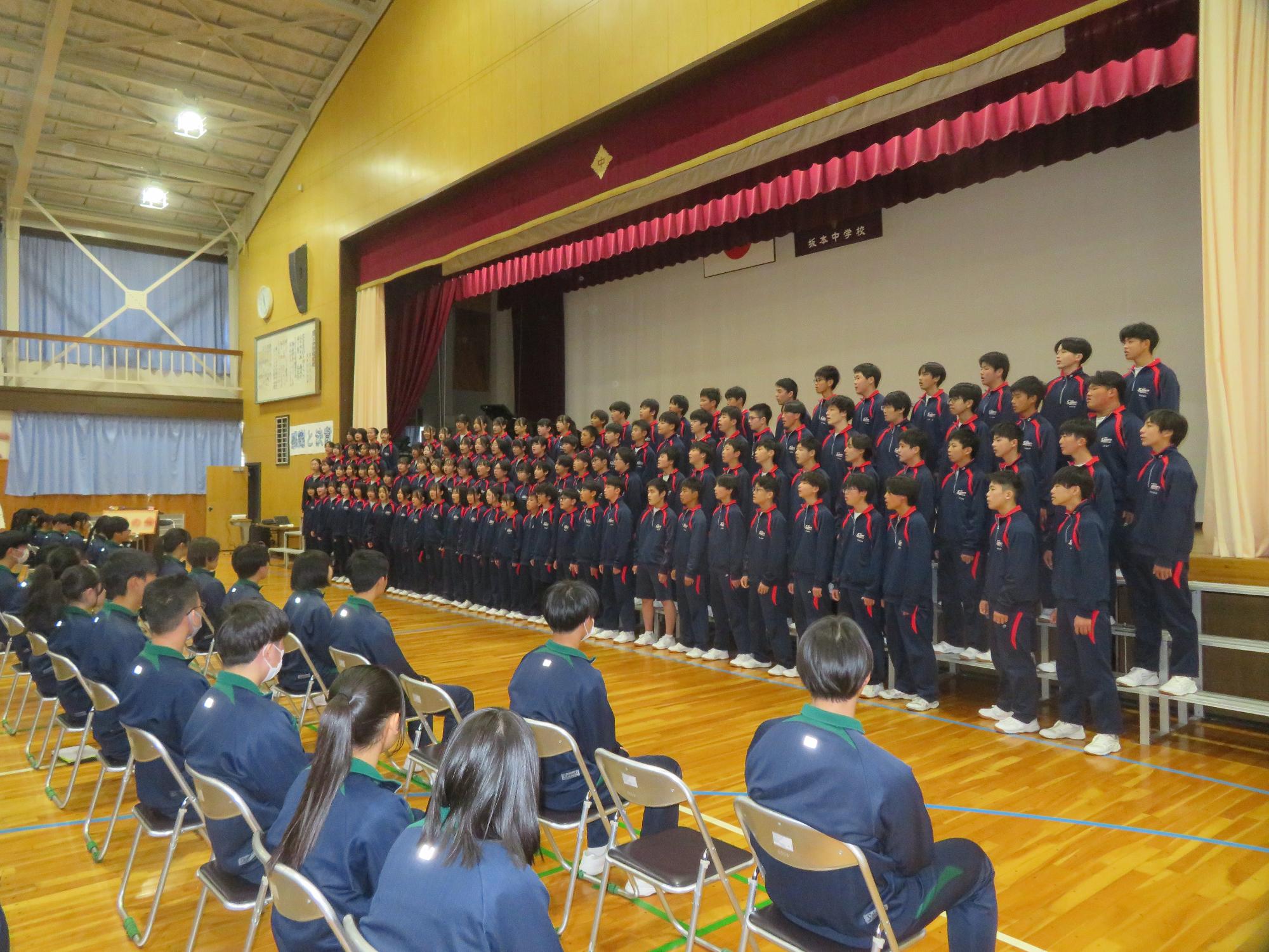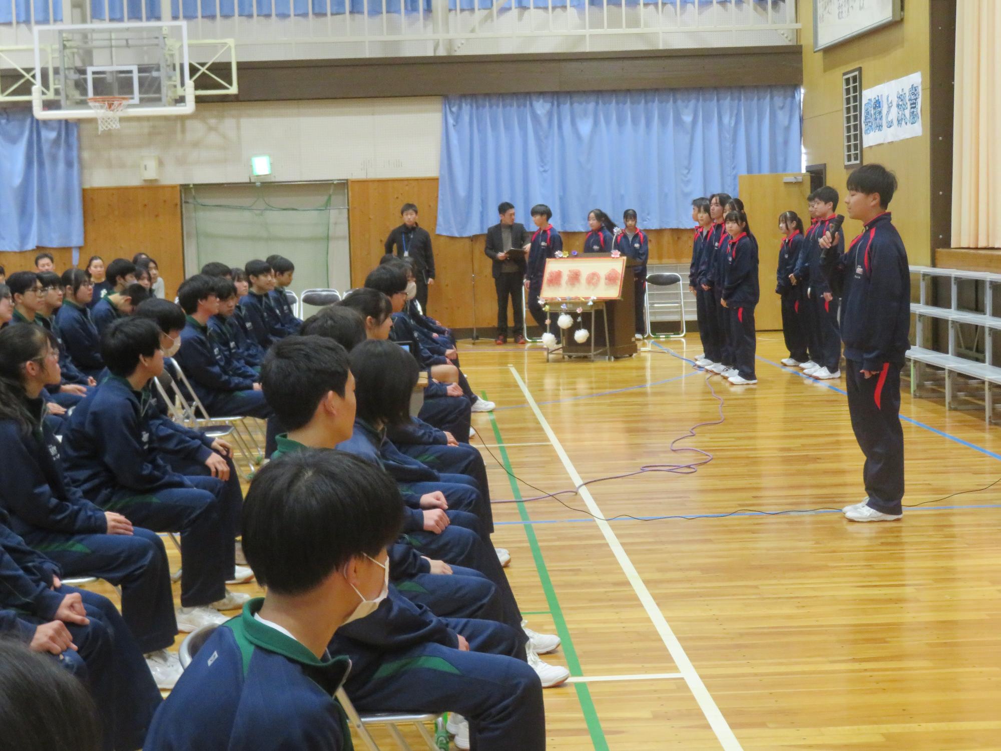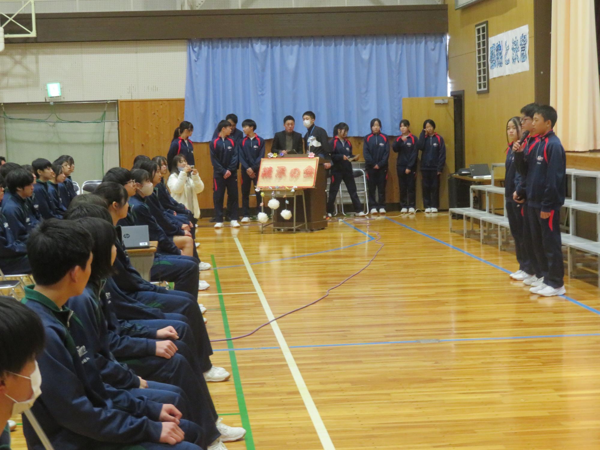 高校入試が終わり、延期されていた継承の会を本日行いました。涙いっぱいの継承の会でした。まずは、1年生はパネル活動と合唱で、2年生はスライドやメッセージと合唱で3年生に感謝と今後の決意を誓いました。練習時間が少ない中、仲間とつながり合い、一生懸命な心で創り上げたことがヒシヒシと伝わり、3年生の涙を誘っていました。そして3年生。仲間とのいろいろな活動を通して学んだことを堂々と後輩に語り継いでいました。そして圧巻の合唱。さすがという合唱を姿で示しました。涙を流しながら歌う3年生の合唱は、深い感動を与えていました。