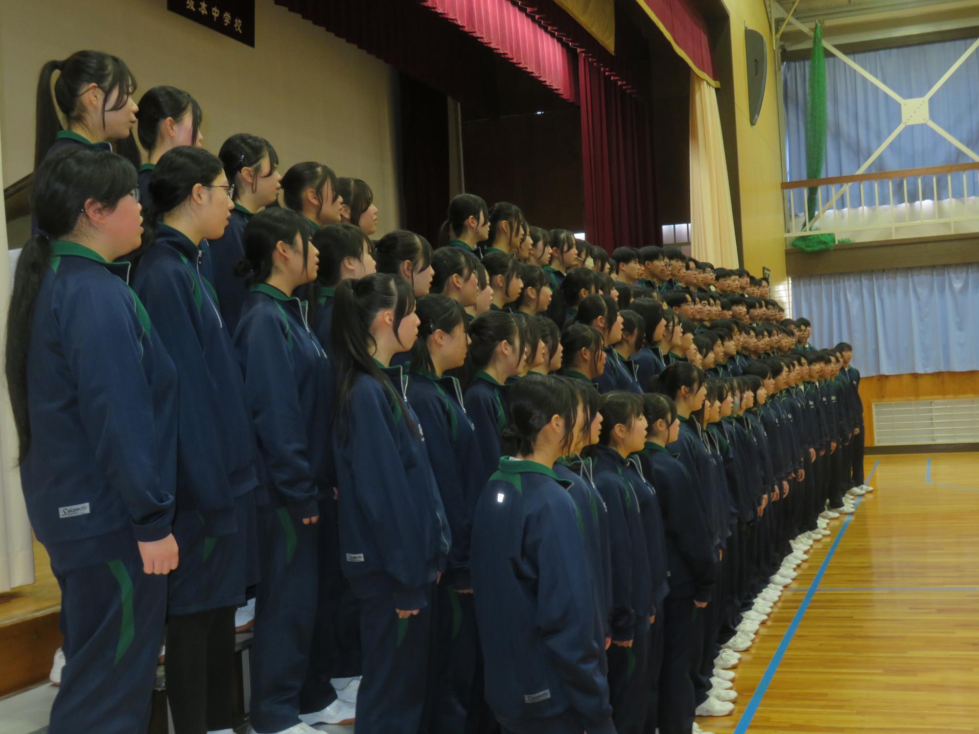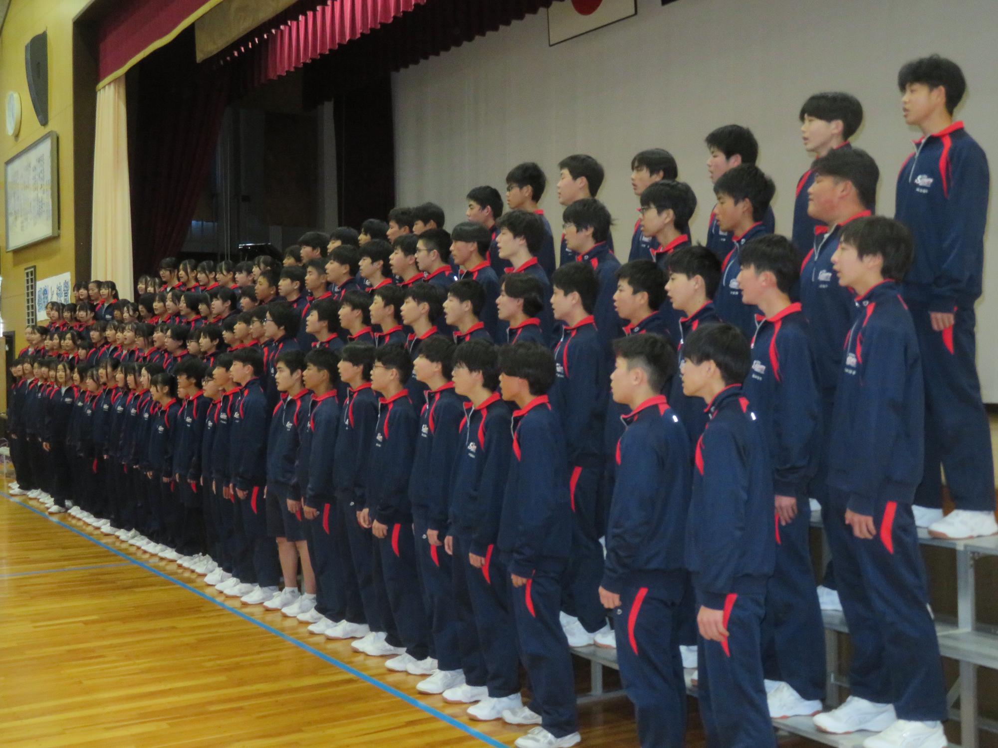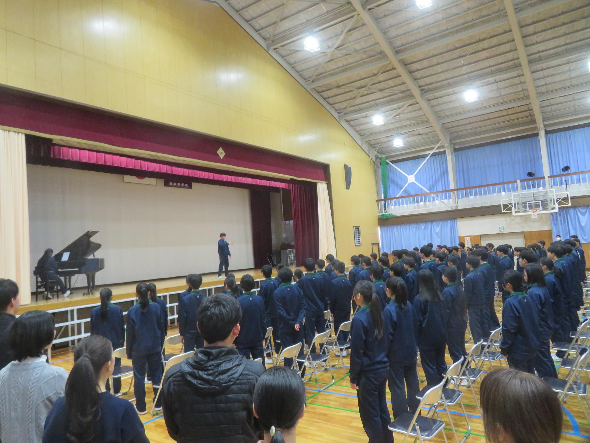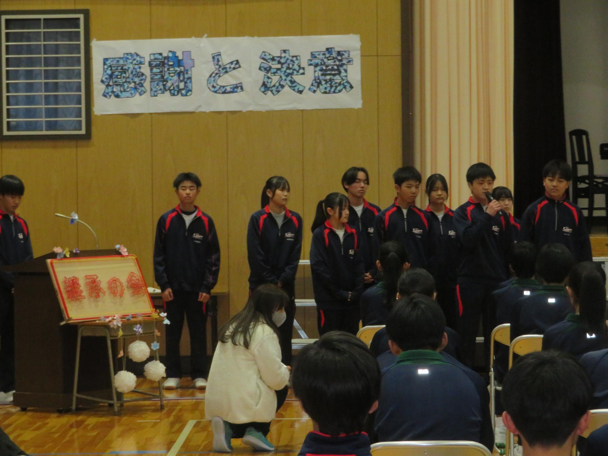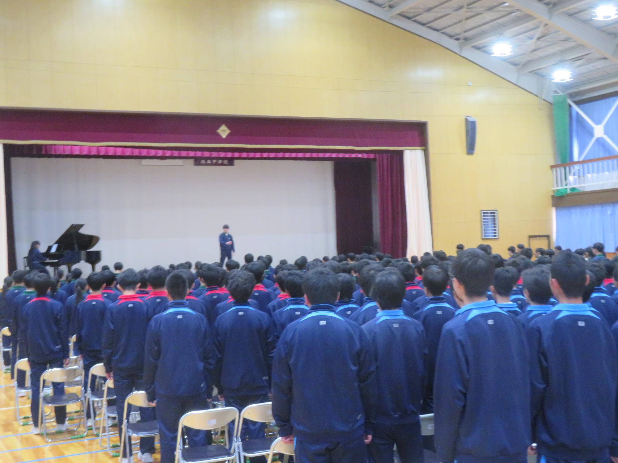 高校入試が終わり、延期されていた継承の会を本日行いました。涙いっぱいの継承の会でした。まずは、1年生はパネル活動と合唱で、2年生はスライドやメッセージと合唱で3年生に感謝と今後の決意を誓いました。練習時間が少ない中、仲間とつながり合い、一生懸命な心で創り上げたことがヒシヒシと伝わり、3年生の涙を誘っていました。そして3年生。仲間とのいろいろな活動を通して学んだことを堂々と後輩に語り継いでいました。そして圧巻の合唱。さすがという合唱を姿で示しました。涙を流しながら歌う3年生の合唱は、深い感動を与えていました。