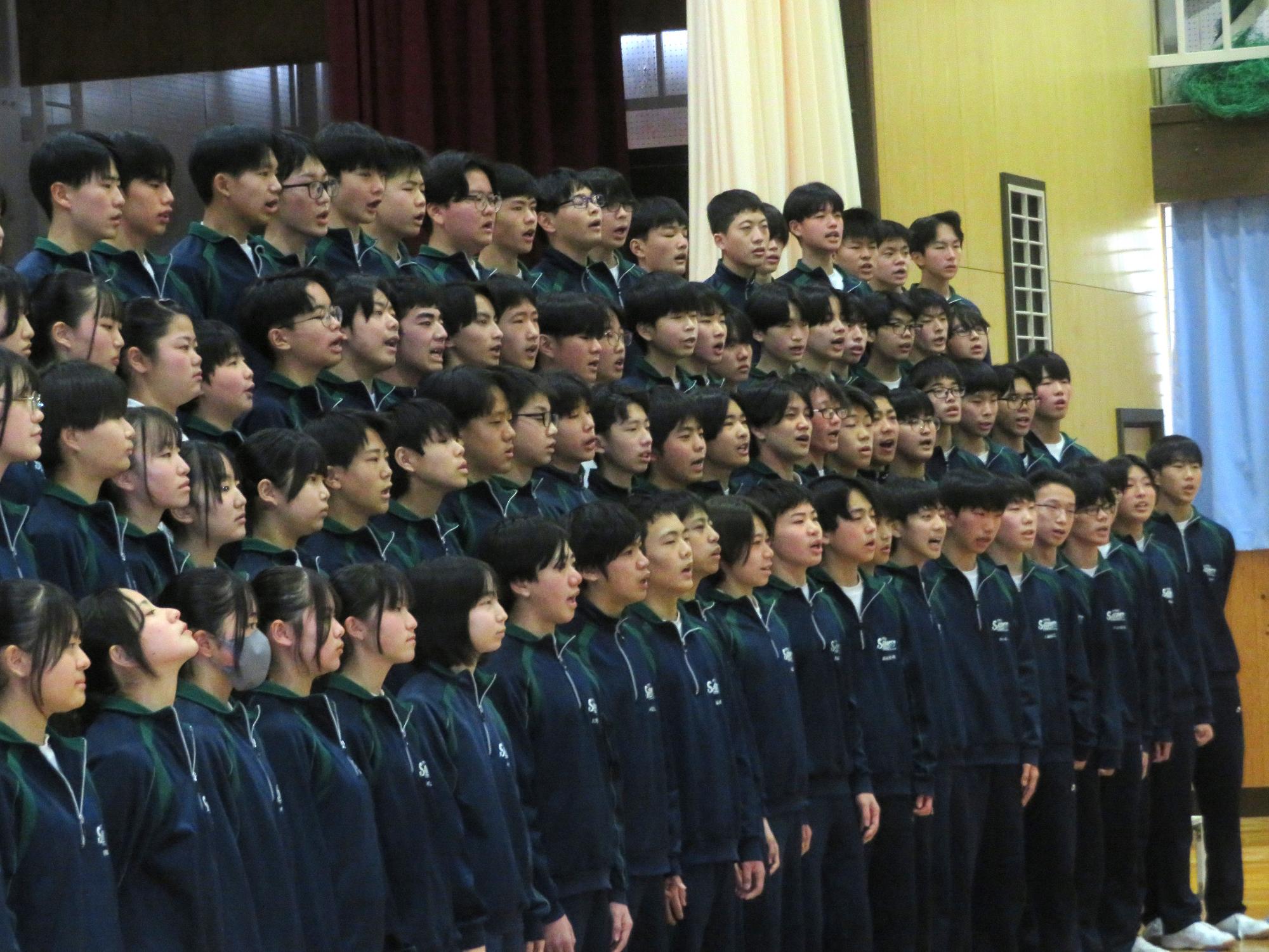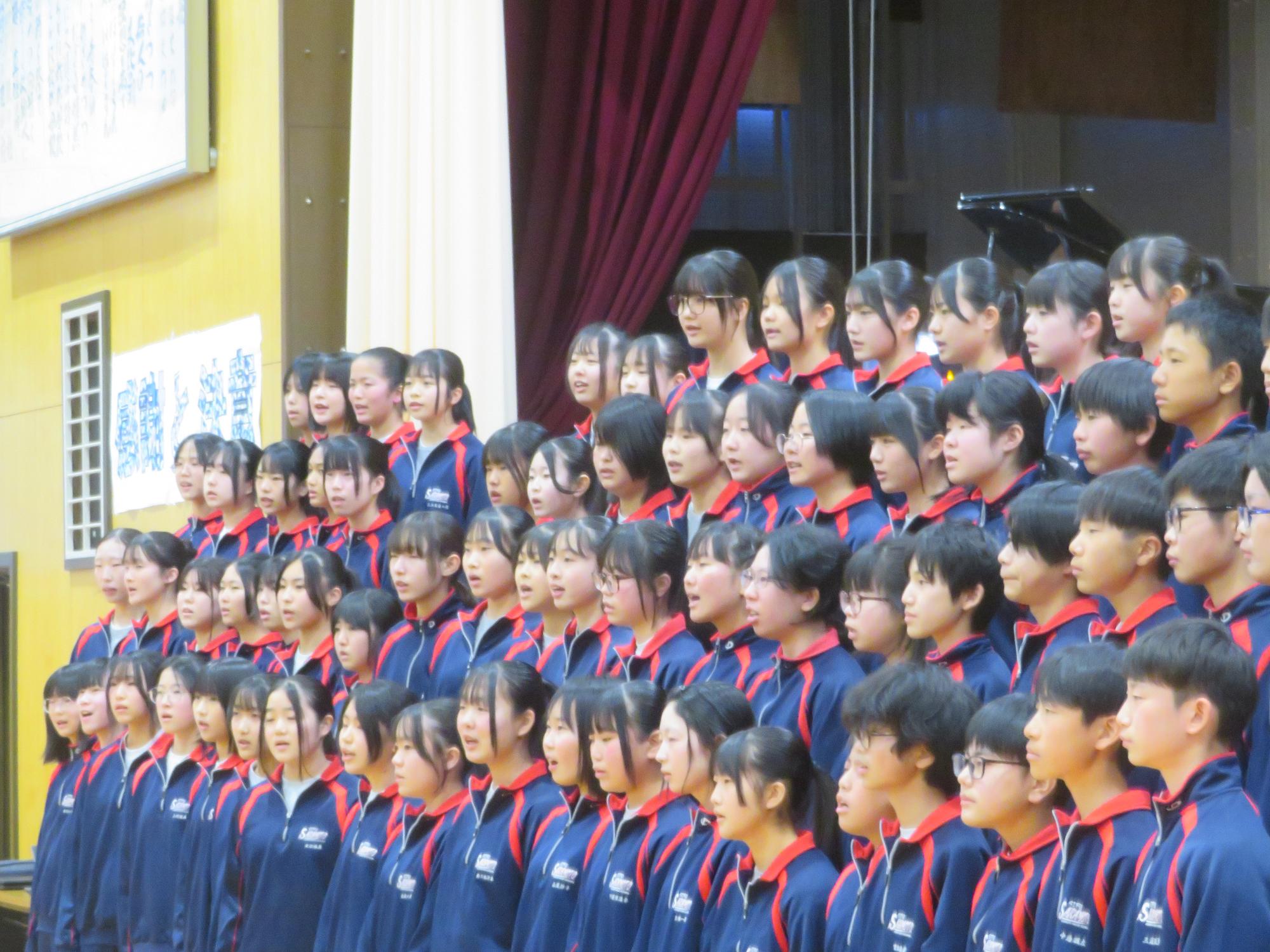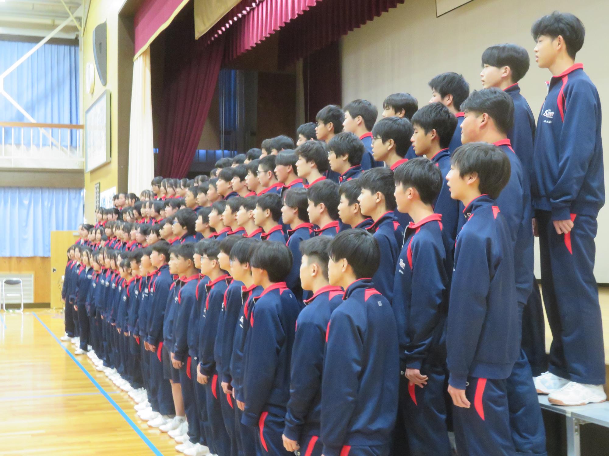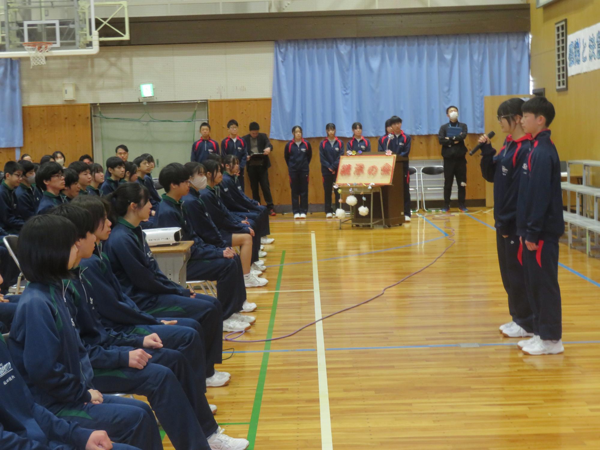 高校入試が終わり、延期されていた継承の会を本日行いました。涙いっぱいの継承の会でした。まずは、1年生はパネル活動と合唱で、2年生はスライドやメッセージと合唱で3年生に感謝と今後の決意を誓いました。練習時間が少ない中、仲間とつながり合い、一生懸命な心で創り上げたことがヒシヒシと伝わり、3年生の涙を誘っていました。そして3年生。仲間とのいろいろな活動を通して学んだことを堂々と後輩に語り継いでいました。そして圧巻の合唱。さすがという合唱を姿で示しました。涙を流しながら歌う3年生の合唱は、深い感動を与えていました。