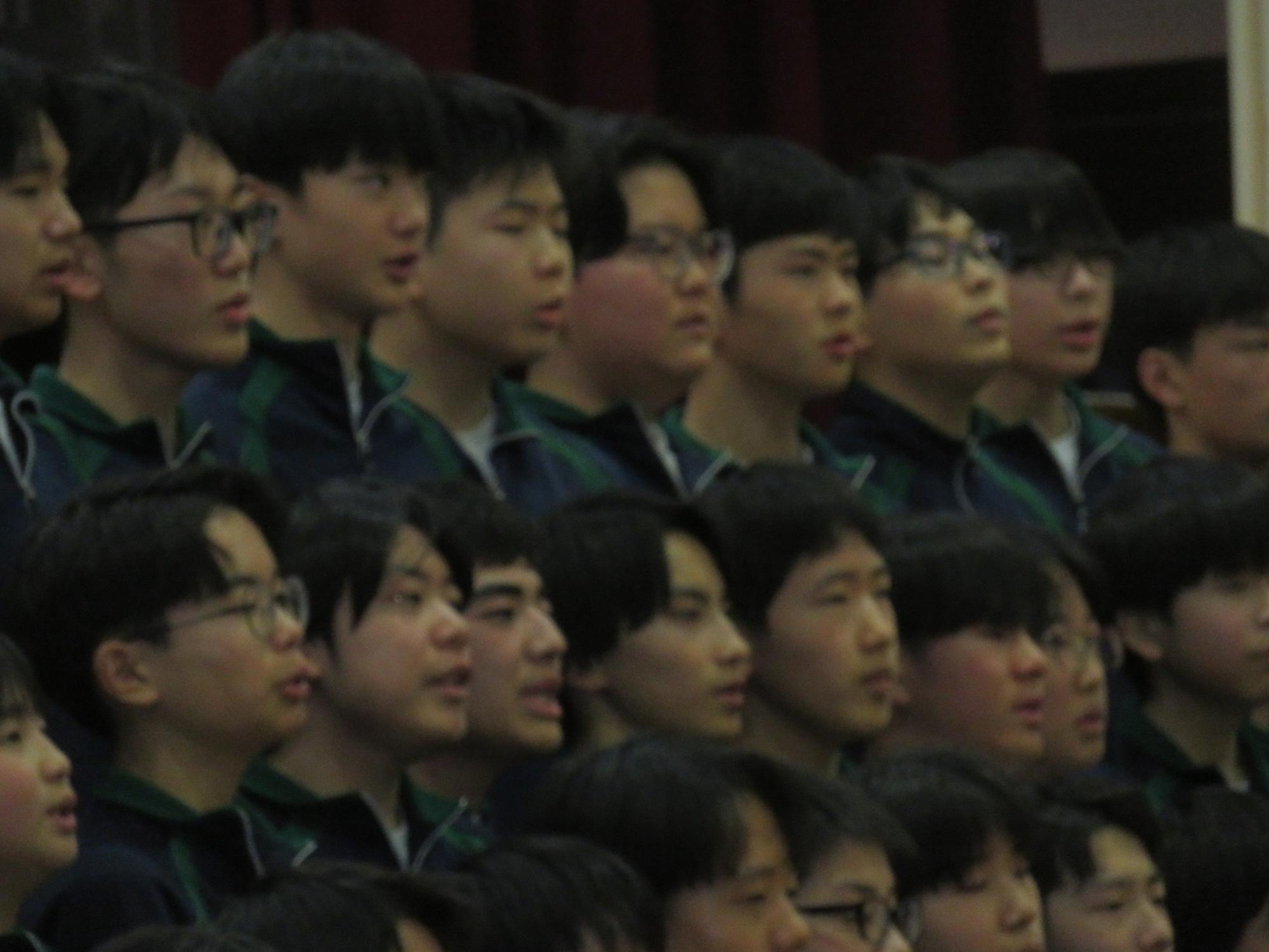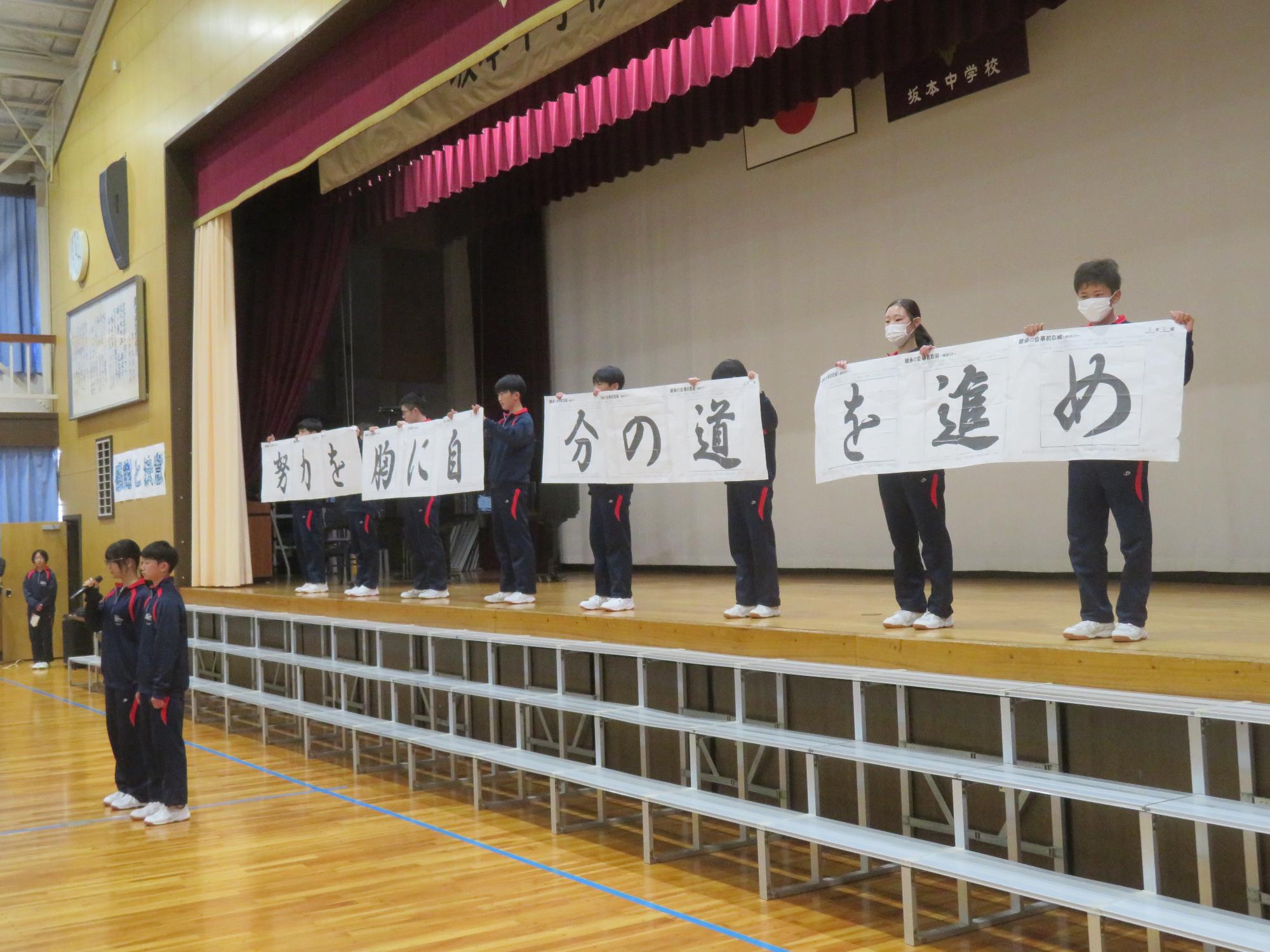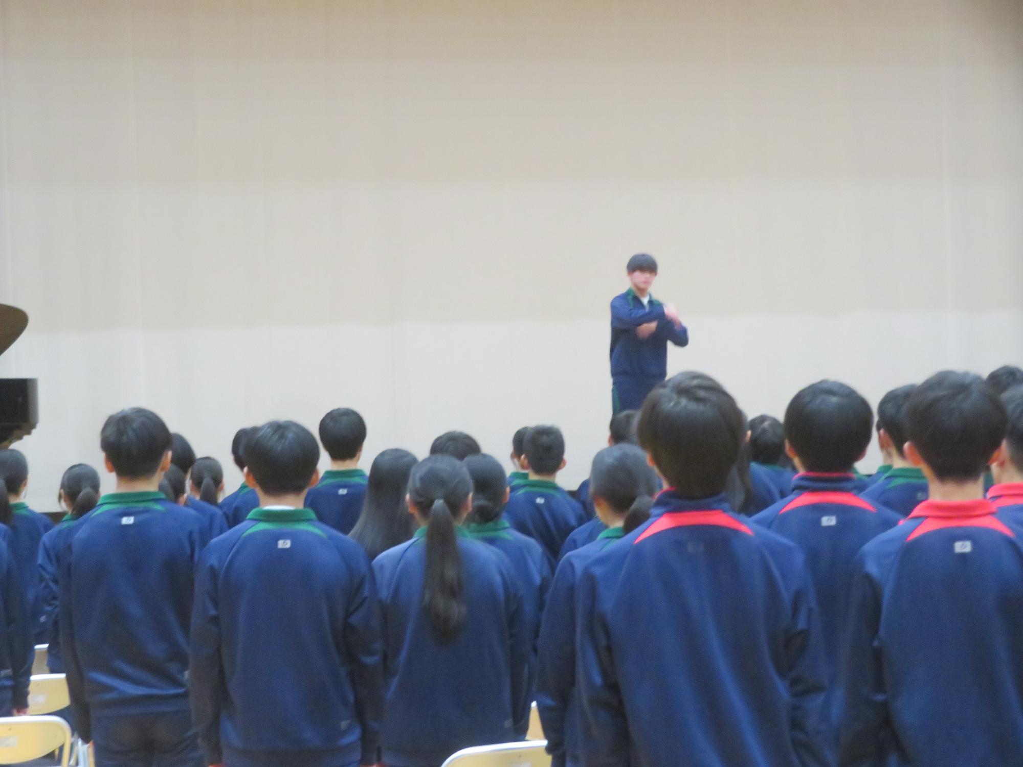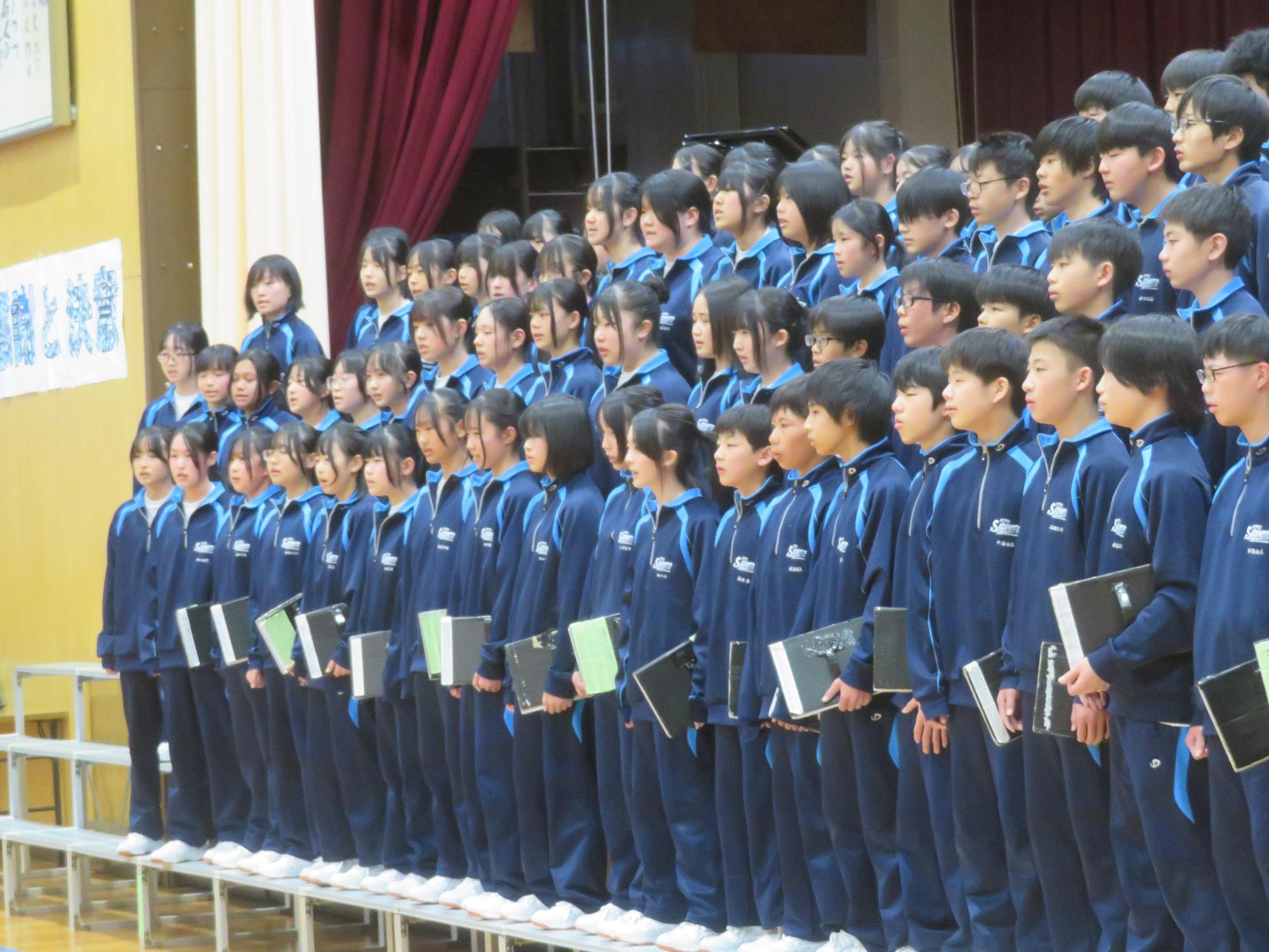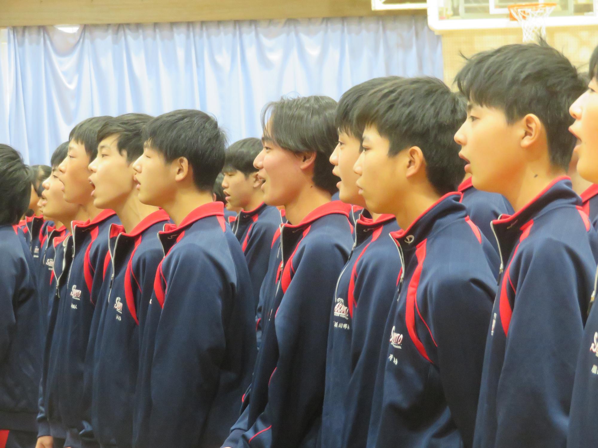 高校入試が終わり、延期されていた継承の会を本日行いました。涙いっぱいの継承の会でした。まずは、1年生はパネル活動と合唱で、2年生はスライドやメッセージと合唱で3年生に感謝と今後の決意を誓いました。練習時間が少ない中、仲間とつながり合い、一生懸命な心で創り上げたことがヒシヒシと伝わり、3年生の涙を誘っていました。そして3年生。仲間とのいろいろな活動を通して学んだことを堂々と後輩に語り継いでいました。そして圧巻の合唱。さすがという合唱を姿で示しました。涙を流しながら歌う3年生の合唱は、深い感動を与えていました。
