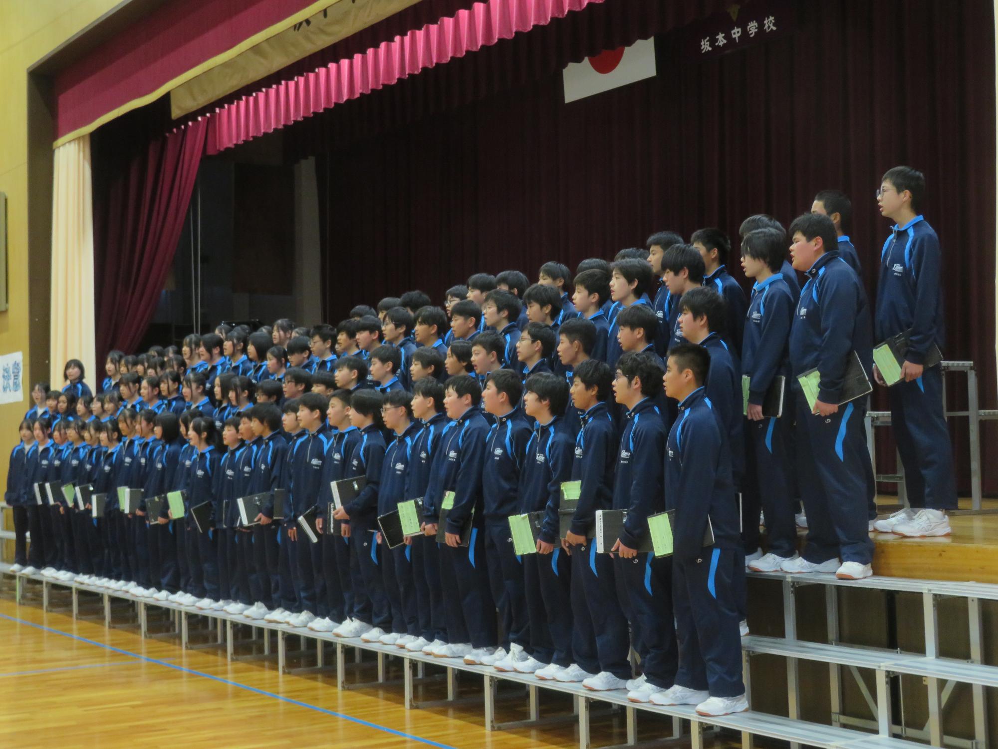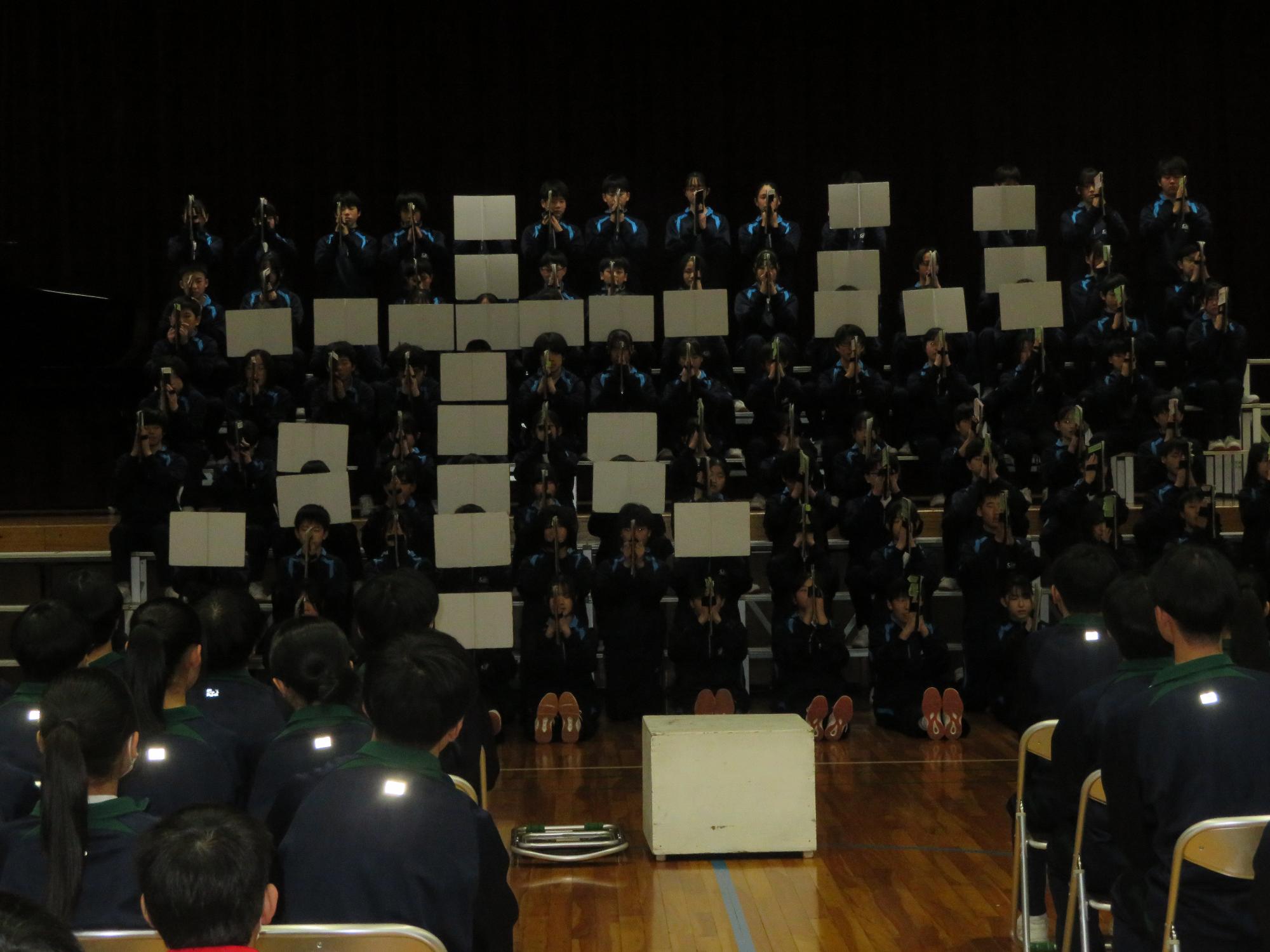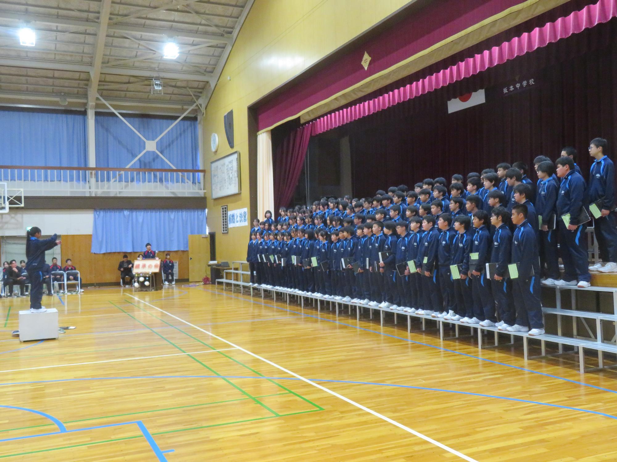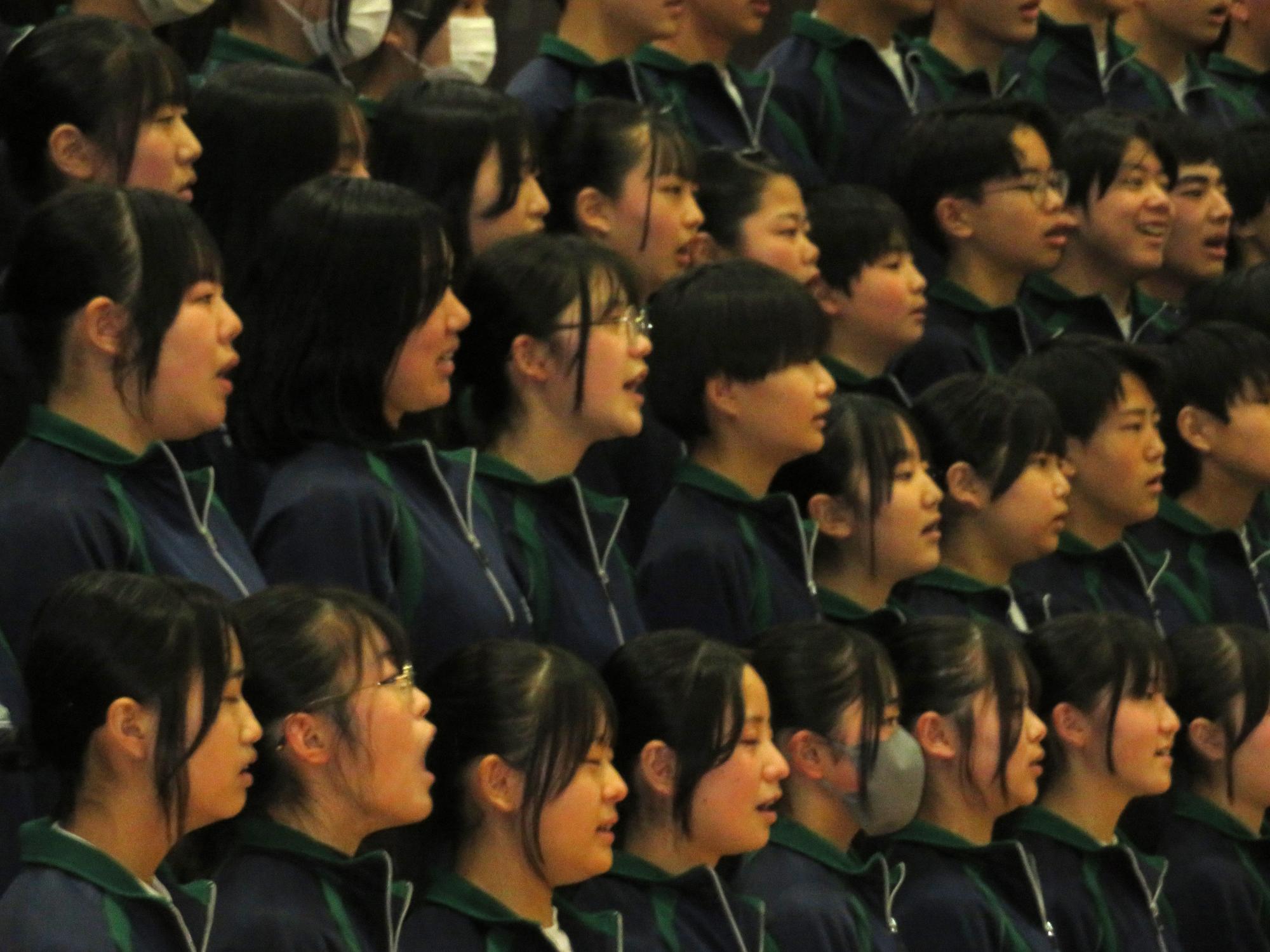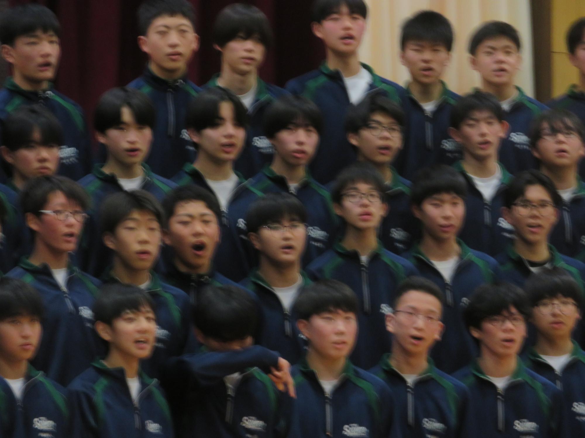 高校入試が終わり、延期されていた継承の会を本日行いました。涙いっぱいの継承の会でした。まずは、1年生はパネル活動と合唱で、2年生はスライドやメッセージと合唱で3年生に感謝と今後の決意を誓いました。練習時間が少ない中、仲間とつながり合い、一生懸命な心で創り上げたことがヒシヒシと伝わり、3年生の涙を誘っていました。そして3年生。仲間とのいろいろな活動を通して学んだことを堂々と後輩に語り継いでいました。そして圧巻の合唱。さすがという合唱を姿で示しました。涙を流しながら歌う3年生の合唱は、深い感動を与えていました。