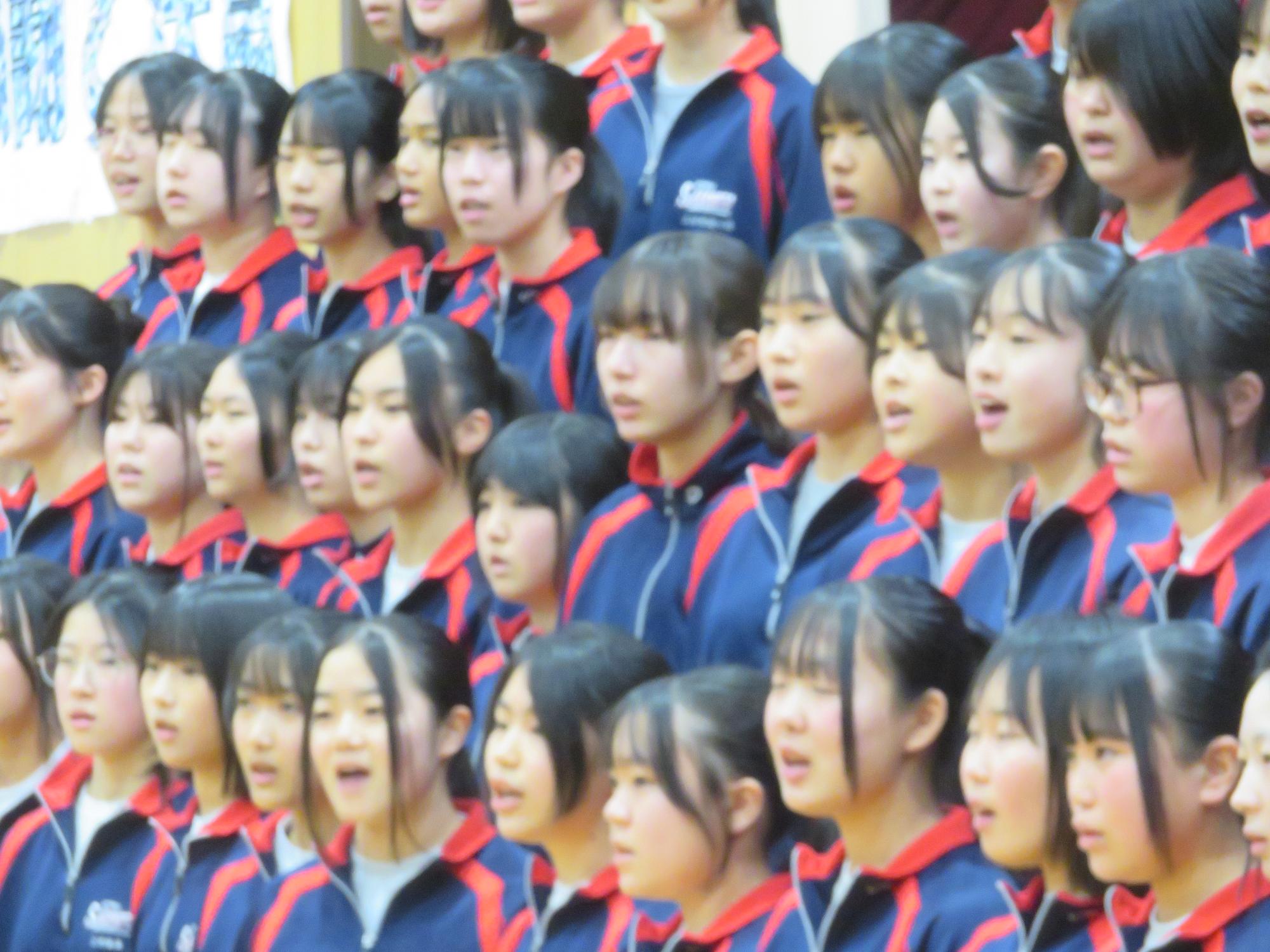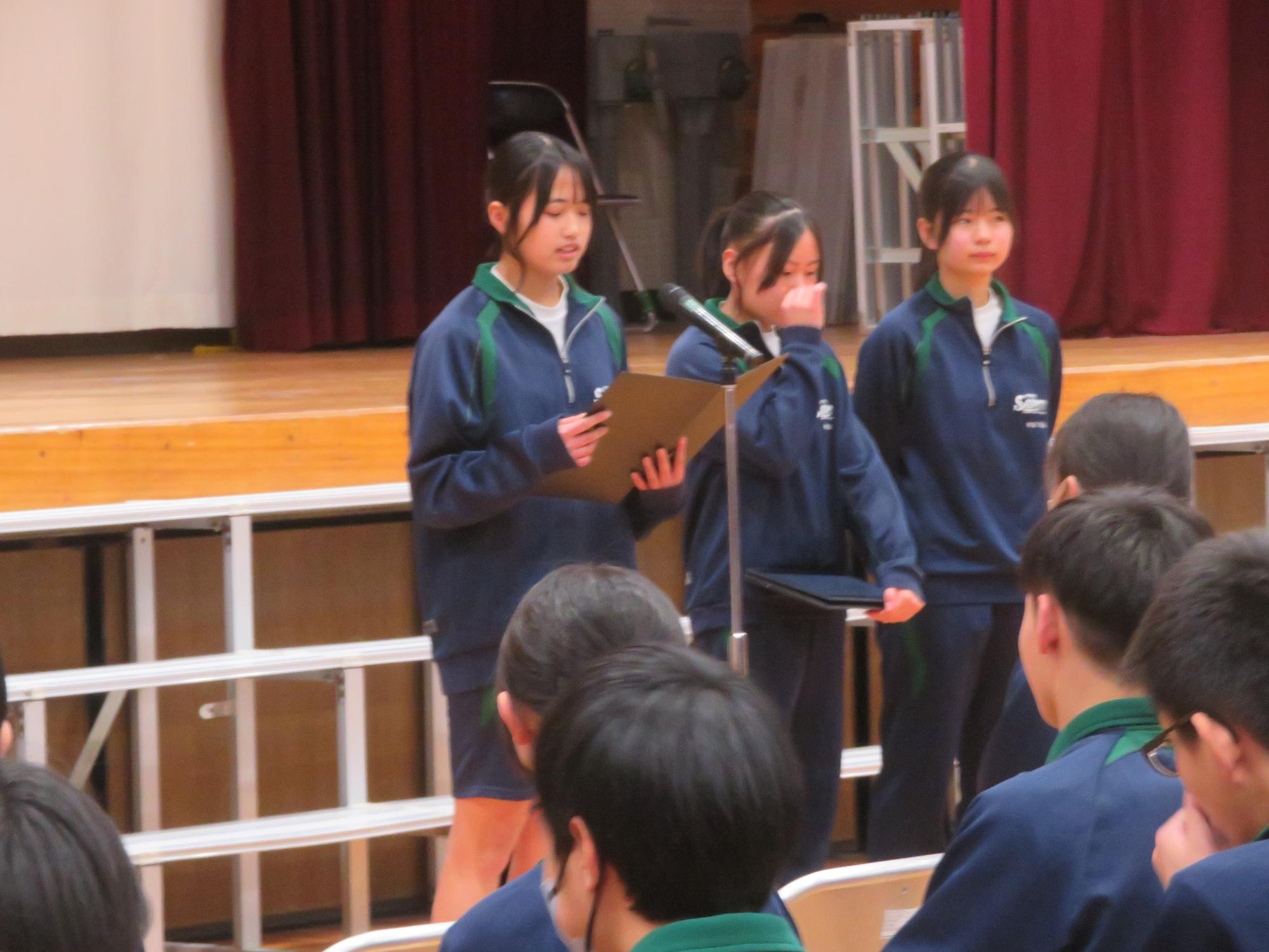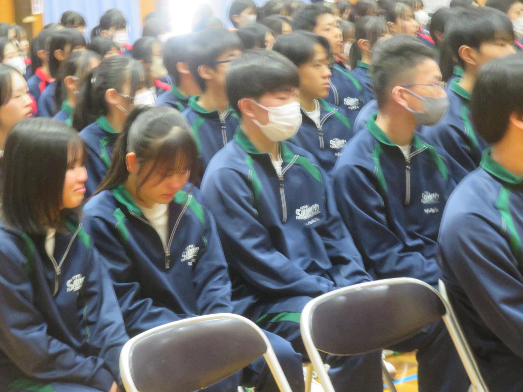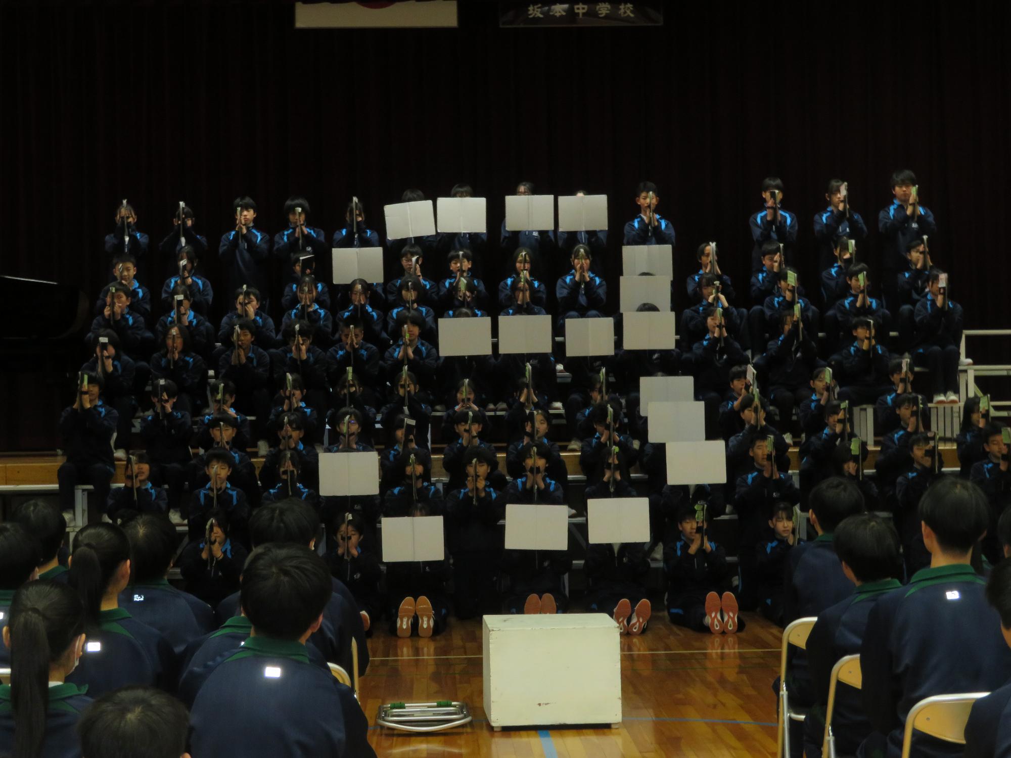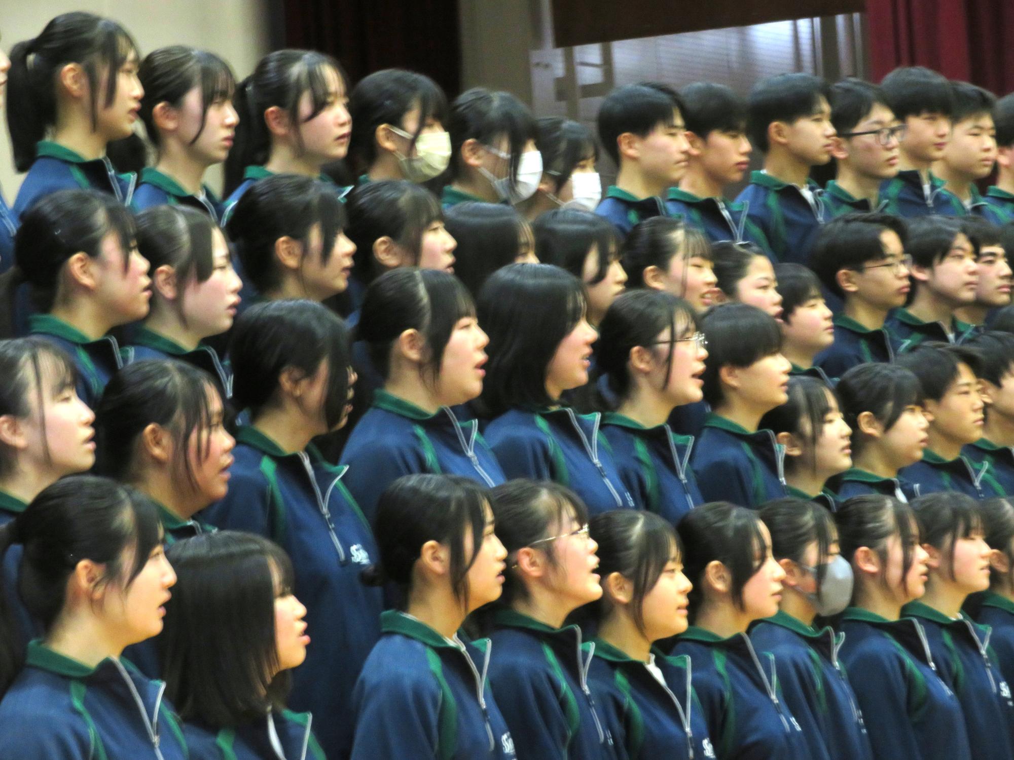 高校入試が終わり、延期されていた継承の会を本日行いました。涙いっぱいの継承の会でした。まずは、1年生はパネル活動と合唱で、2年生はスライドやメッセージと合唱で3年生に感謝と今後の決意を誓いました。練習時間が少ない中、仲間とつながり合い、一生懸命な心で創り上げたことがヒシヒシと伝わり、3年生の涙を誘っていました。そして3年生。仲間とのいろいろな活動を通して学んだことを堂々と後輩に語り継いでいました。そして圧巻の合唱。さすがという合唱を姿で示しました。涙を流しながら歌う3年生の合唱は、深い感動を与えていました。