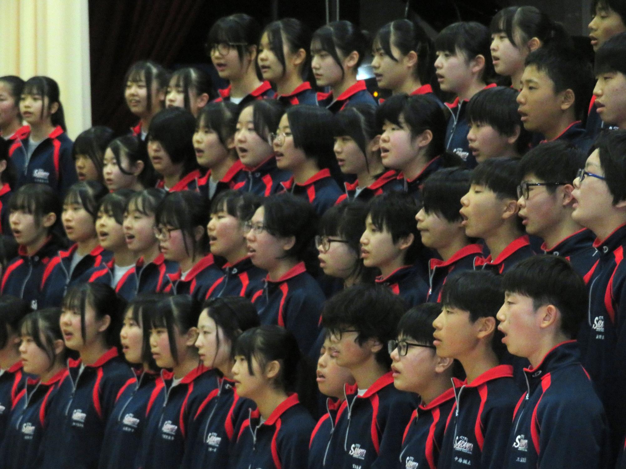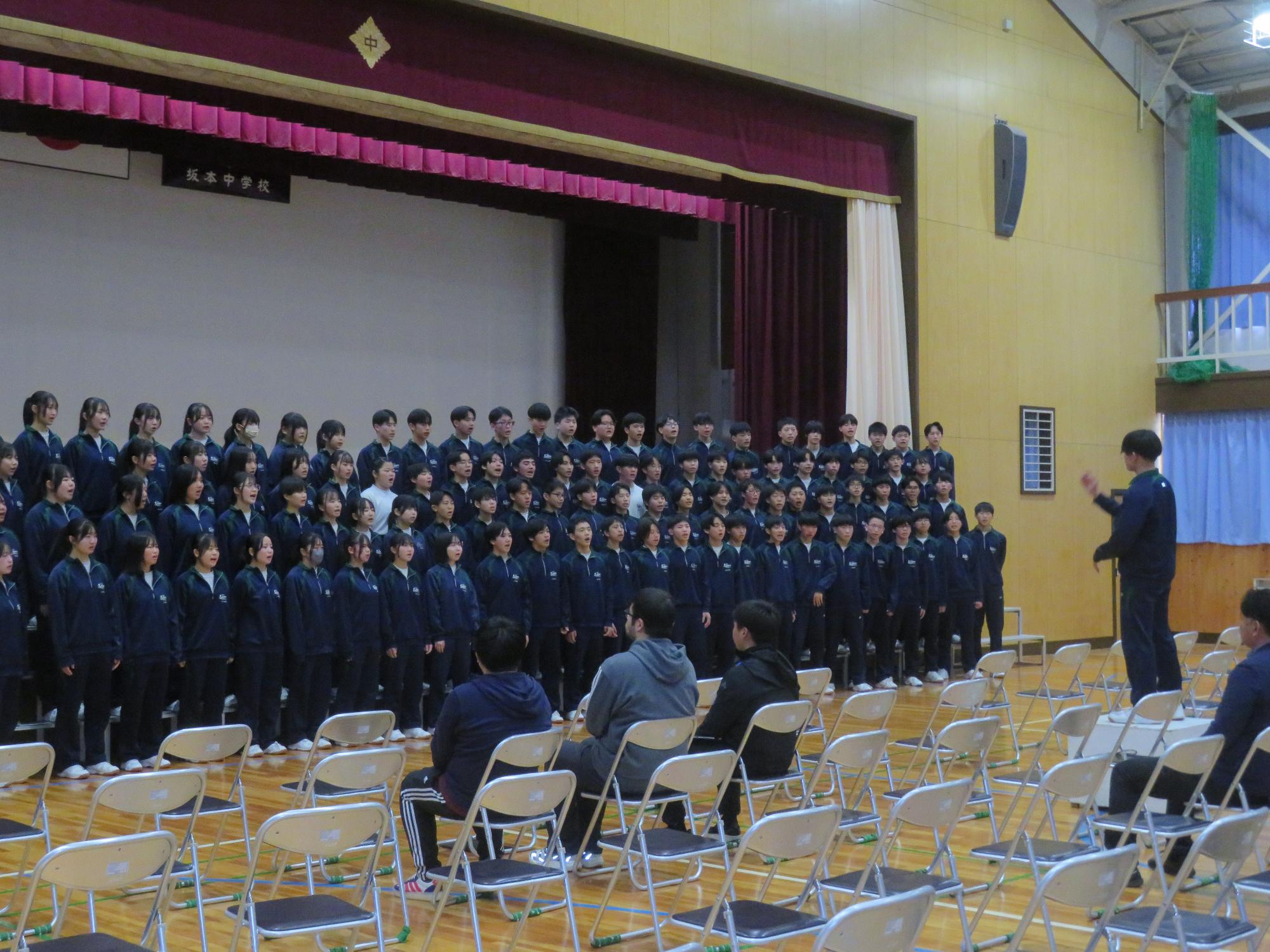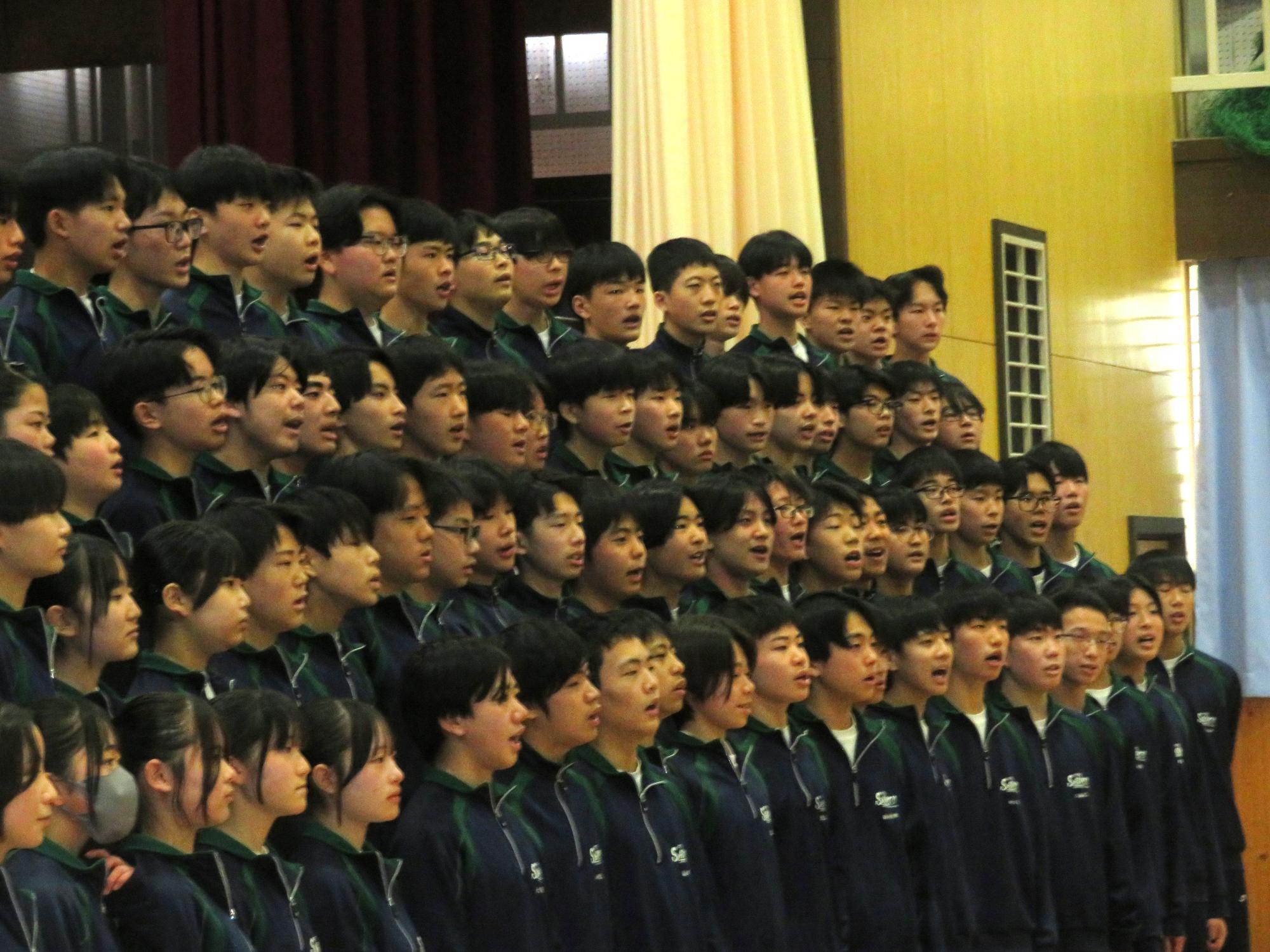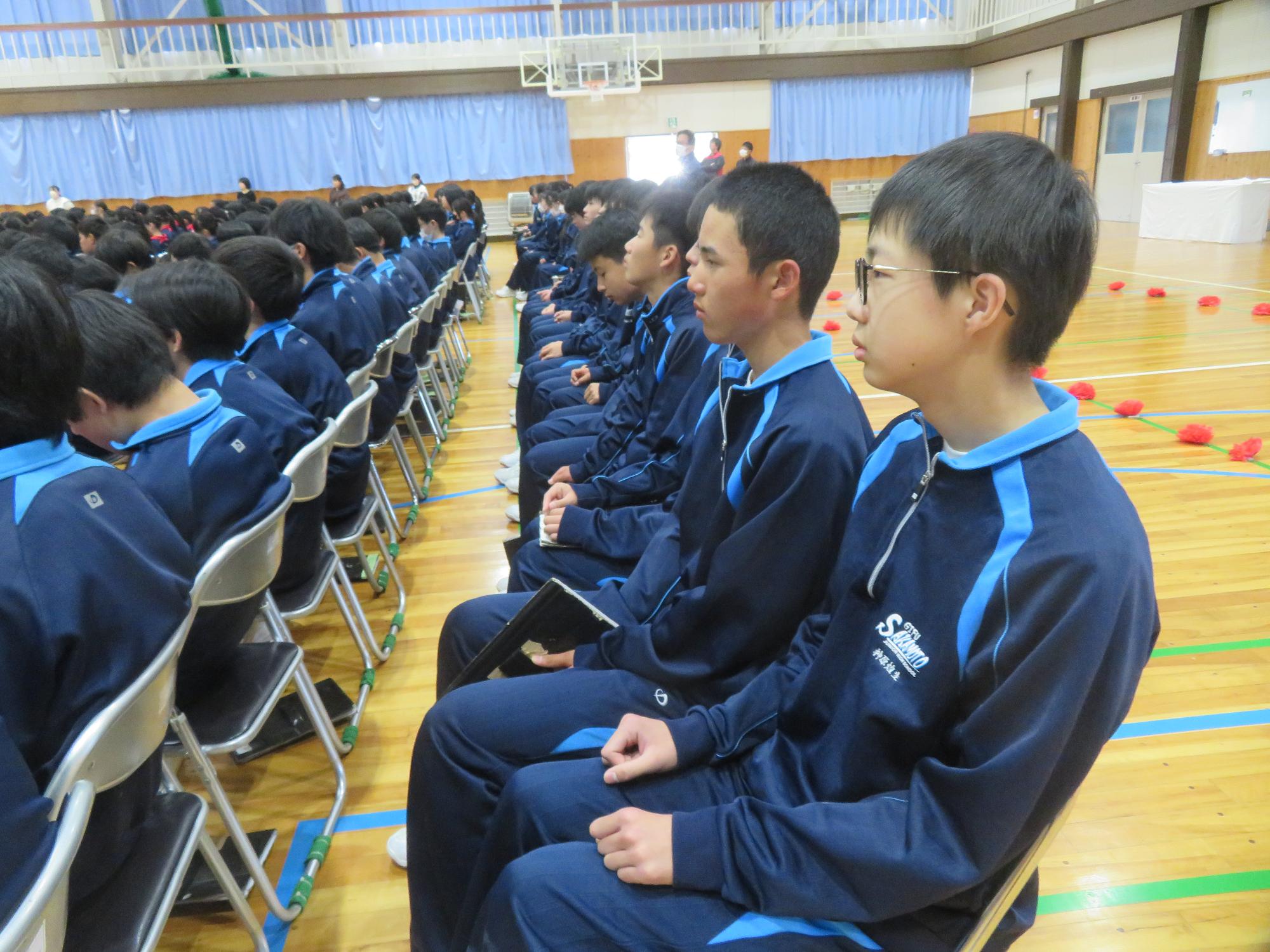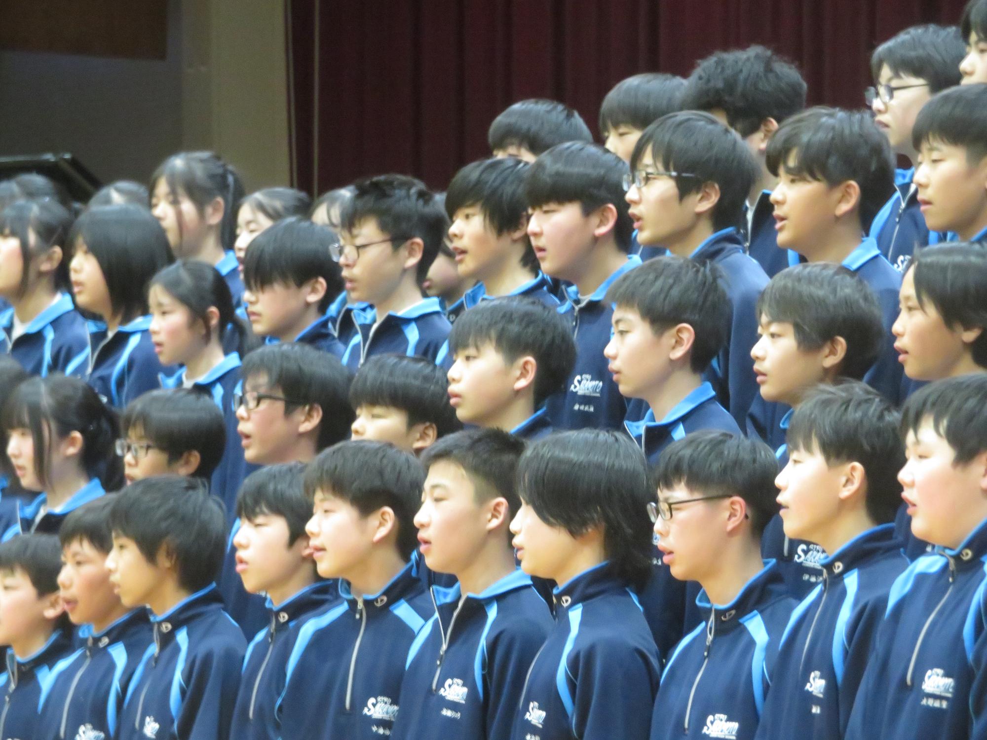 高校入試が終わり、延期されていた継承の会を本日行いました。涙いっぱいの継承の会でした。まずは、1年生はパネル活動と合唱で、2年生はスライドやメッセージと合唱で3年生に感謝と今後の決意を誓いました。練習時間が少ない中、仲間とつながり合い、一生懸命な心で創り上げたことがヒシヒシと伝わり、3年生の涙を誘っていました。そして3年生。仲間とのいろいろな活動を通して学んだことを堂々と後輩に語り継いでいました。そして圧巻の合唱。さすがという合唱を姿で示しました。涙を流しながら歌う3年生の合唱は、深い感動を与えていました。