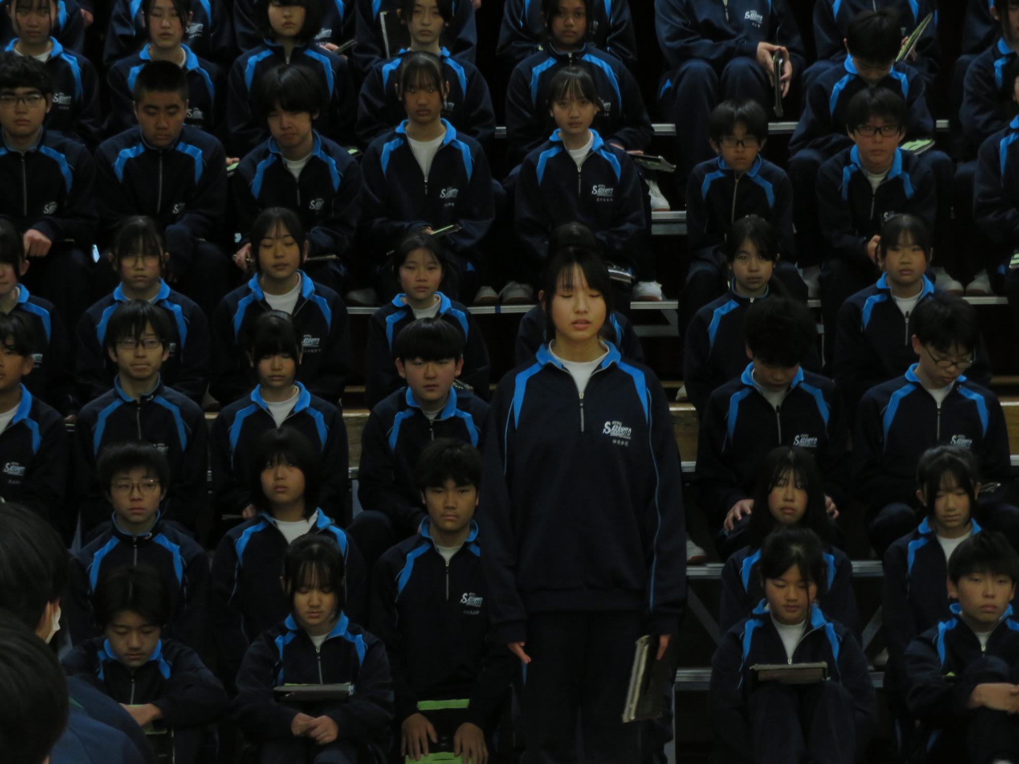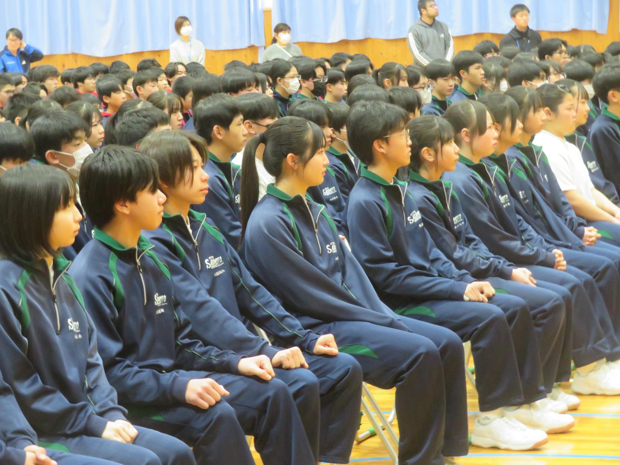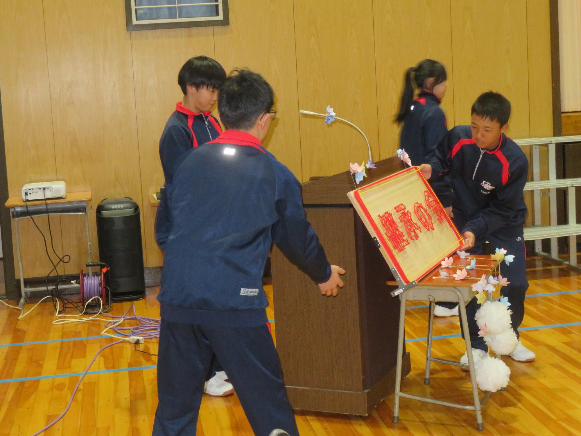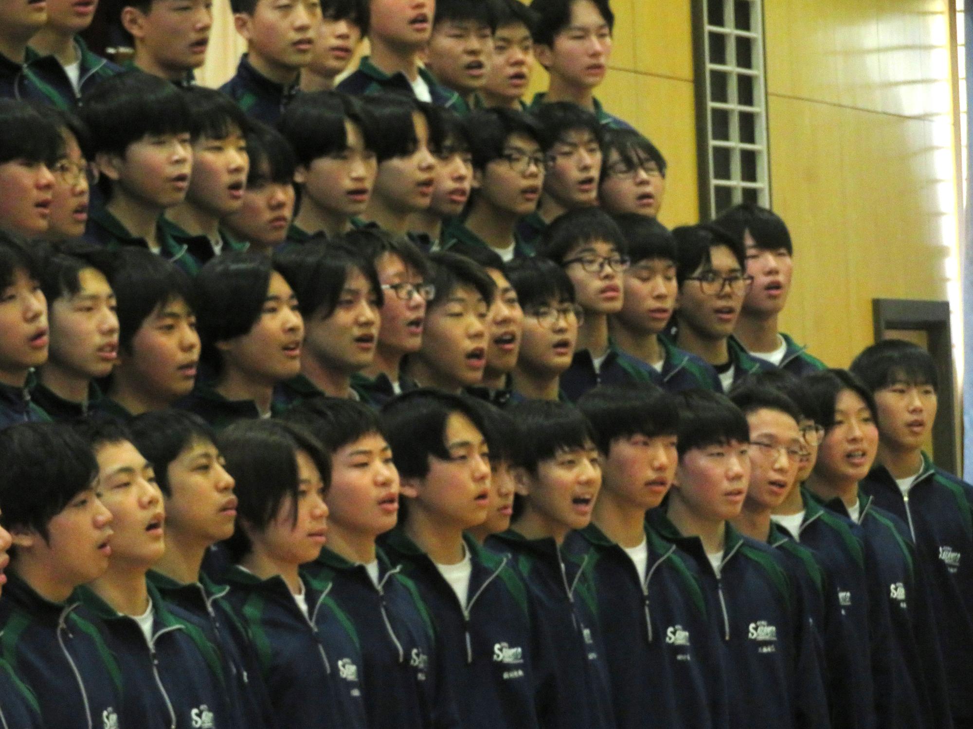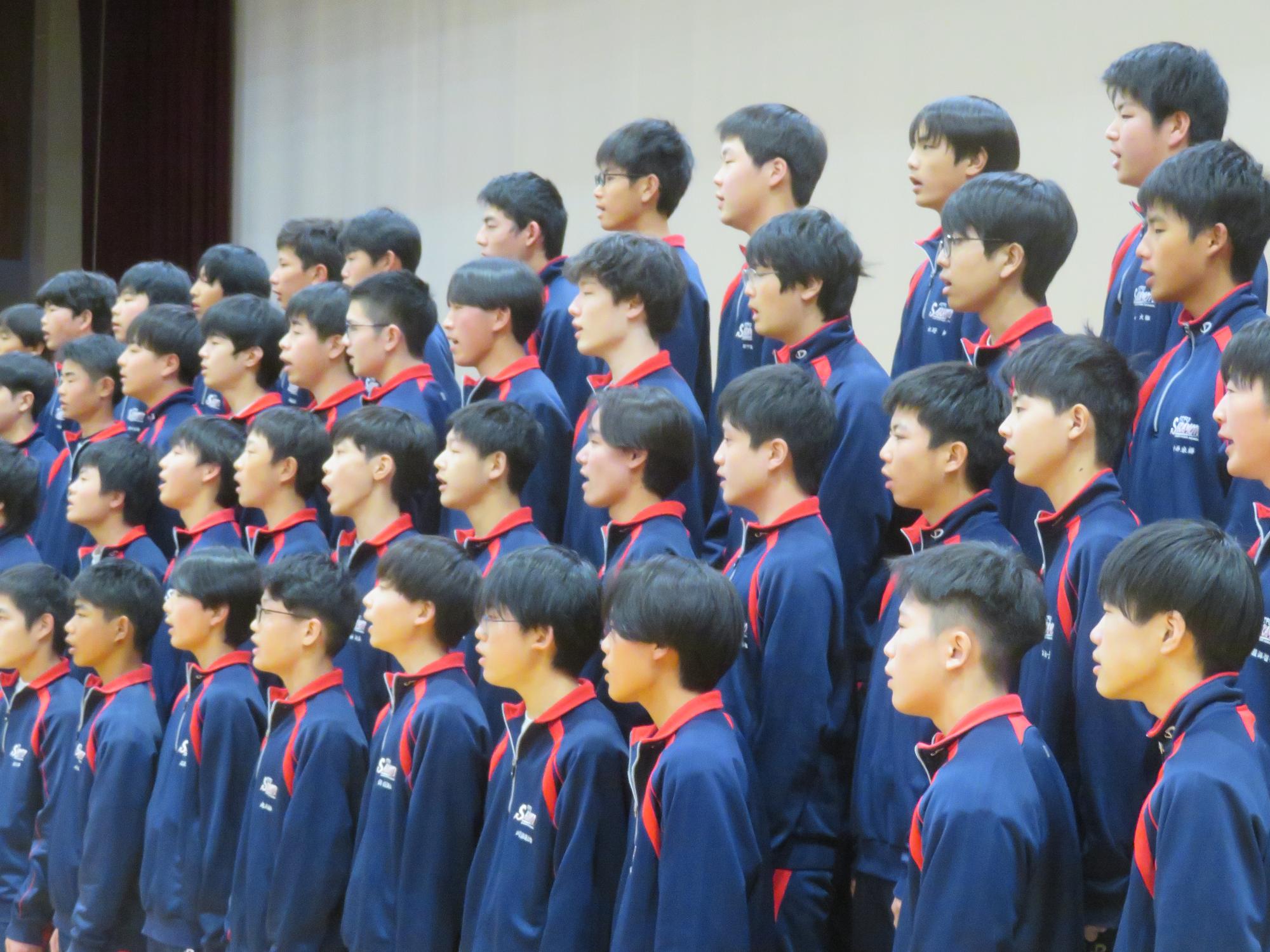 高校入試が終わり、延期されていた継承の会を本日行いました。涙いっぱいの継承の会でした。まずは、1年生はパネル活動と合唱で、2年生はスライドやメッセージと合唱で3年生に感謝と今後の決意を誓いました。練習時間が少ない中、仲間とつながり合い、一生懸命な心で創り上げたことがヒシヒシと伝わり、3年生の涙を誘っていました。そして3年生。仲間とのいろいろな活動を通して学んだことを堂々と後輩に語り継いでいました。そして圧巻の合唱。さすがという合唱を姿で示しました。涙を流しながら歌う3年生の合唱は、深い感動を与えていました。
