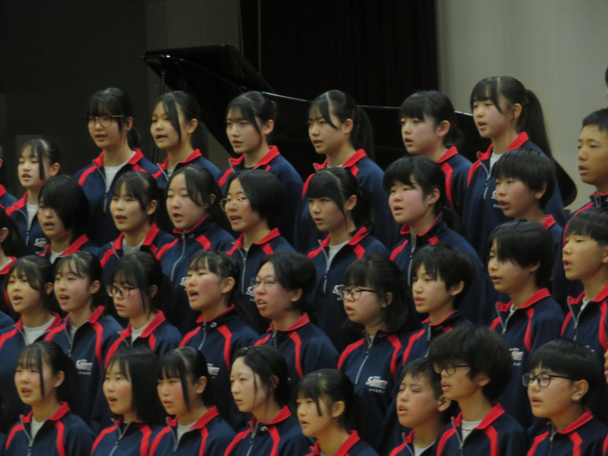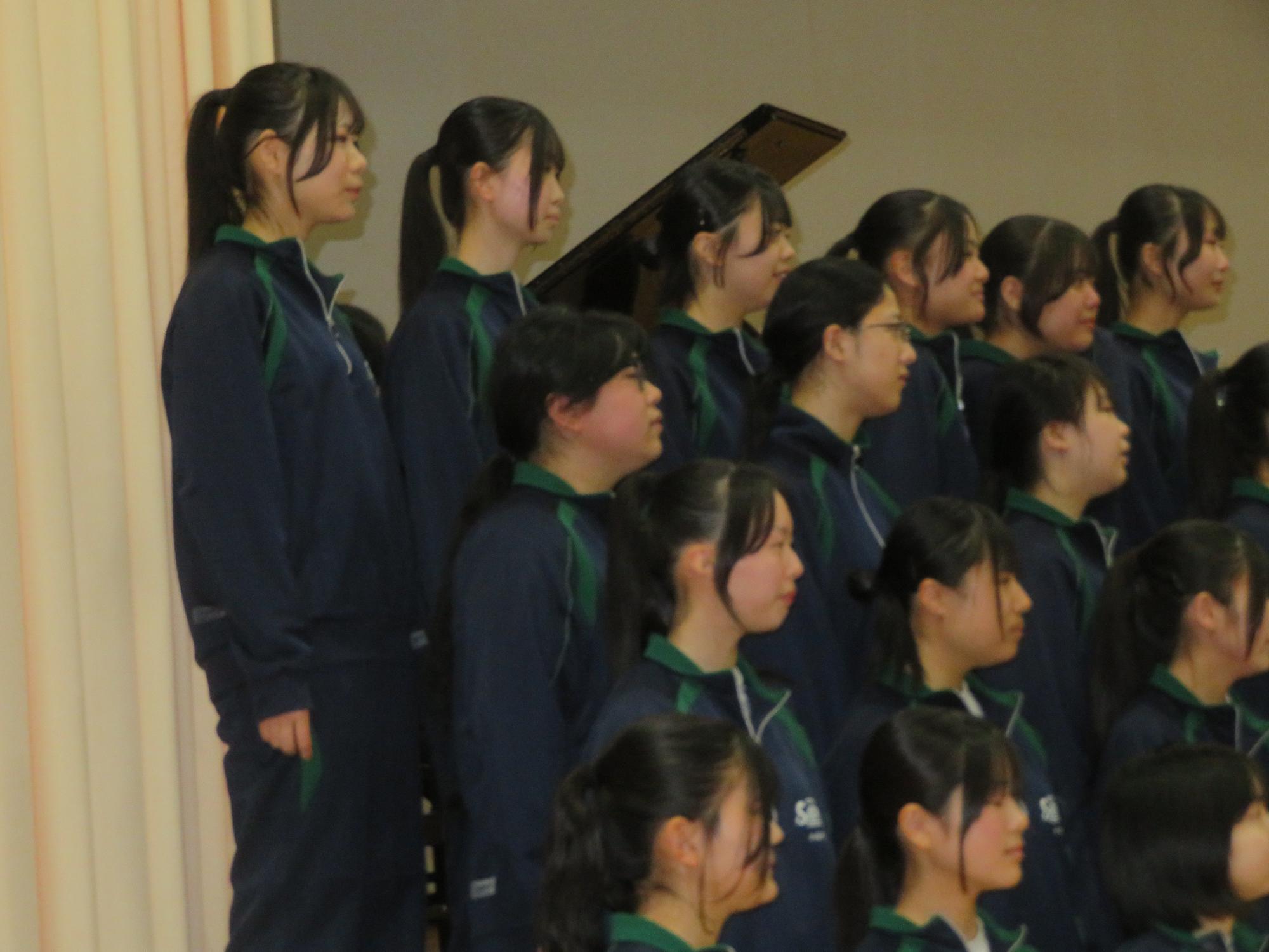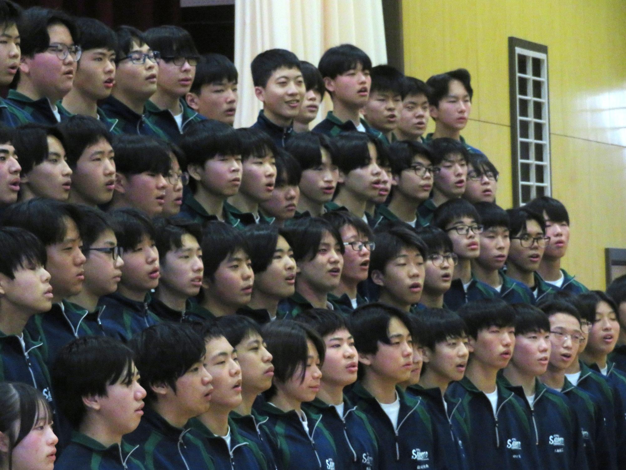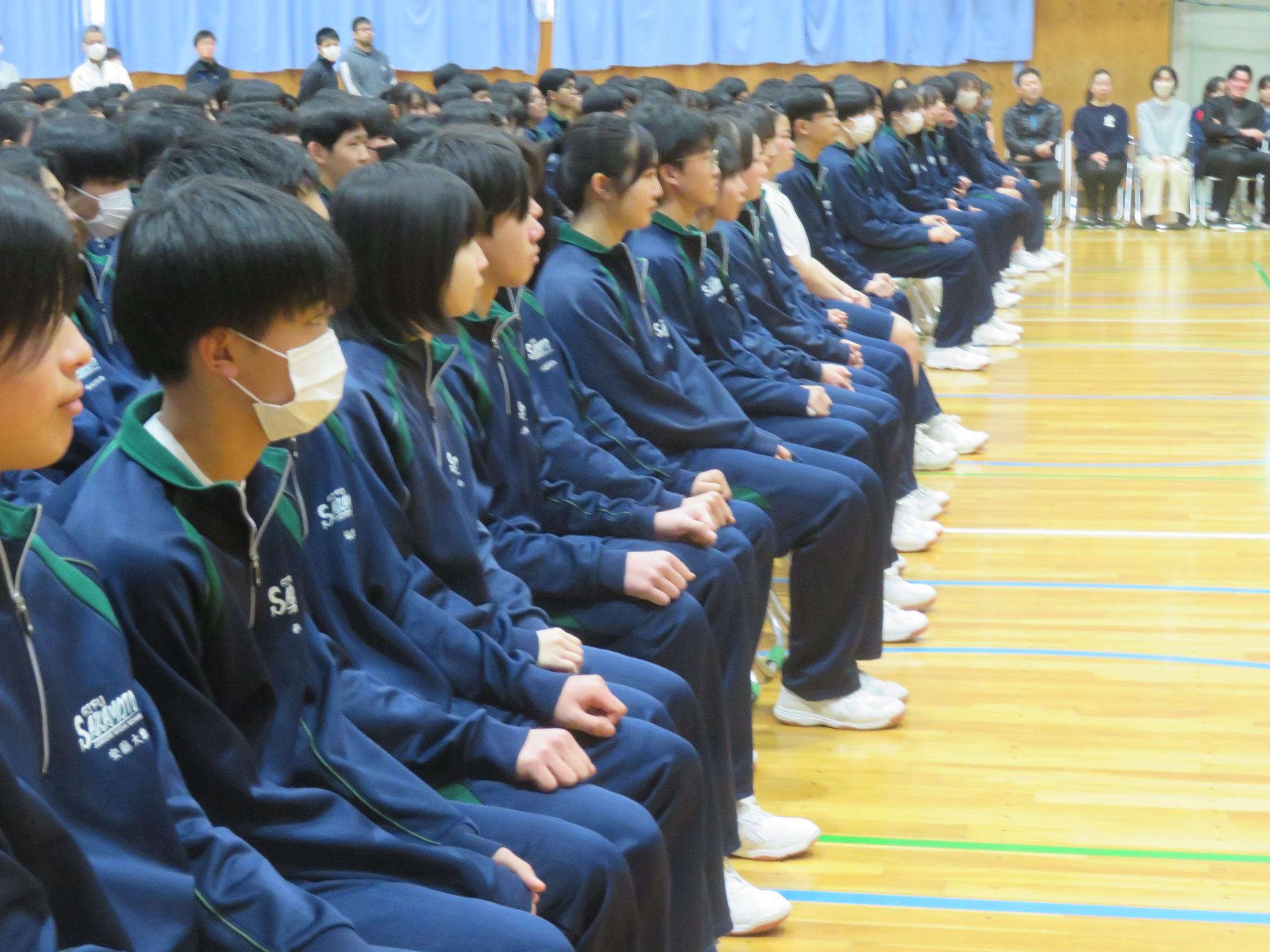 高校入試が終わり、延期されていた継承の会を本日行いました。涙いっぱいの継承の会でした。まずは、1年生はパネル活動と合唱で、2年生はスライドやメッセージと合唱で3年生に感謝と今後の決意を誓いました。練習時間が少ない中、仲間とつながり合い、一生懸命な心で創り上げたことがヒシヒシと伝わり、3年生の涙を誘っていました。そして3年生。仲間とのいろいろな活動を通して学んだことを堂々と後輩に語り継いでいました。そして圧巻の合唱。さすがという合唱を姿で示しました。涙を流しながら歌う3年生の合唱は、深い感動を与えていました。