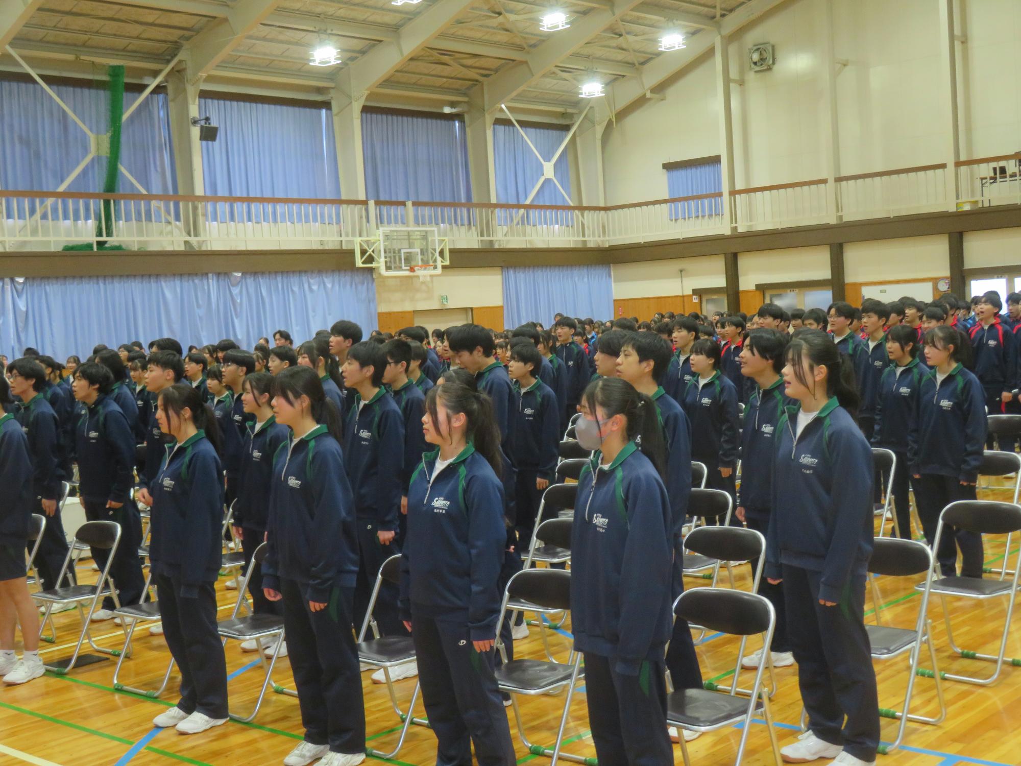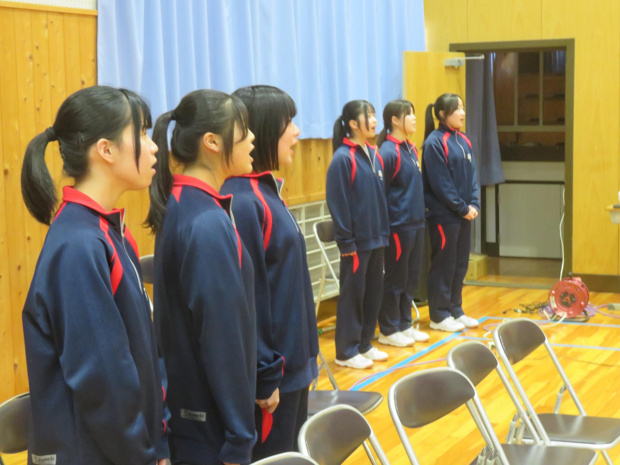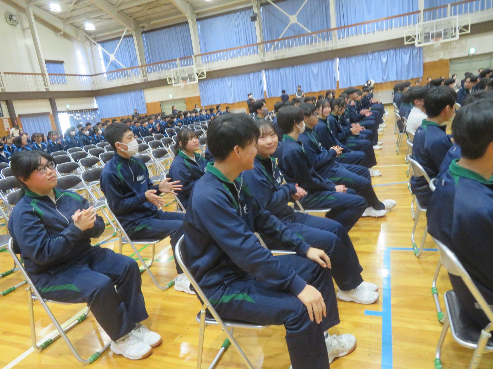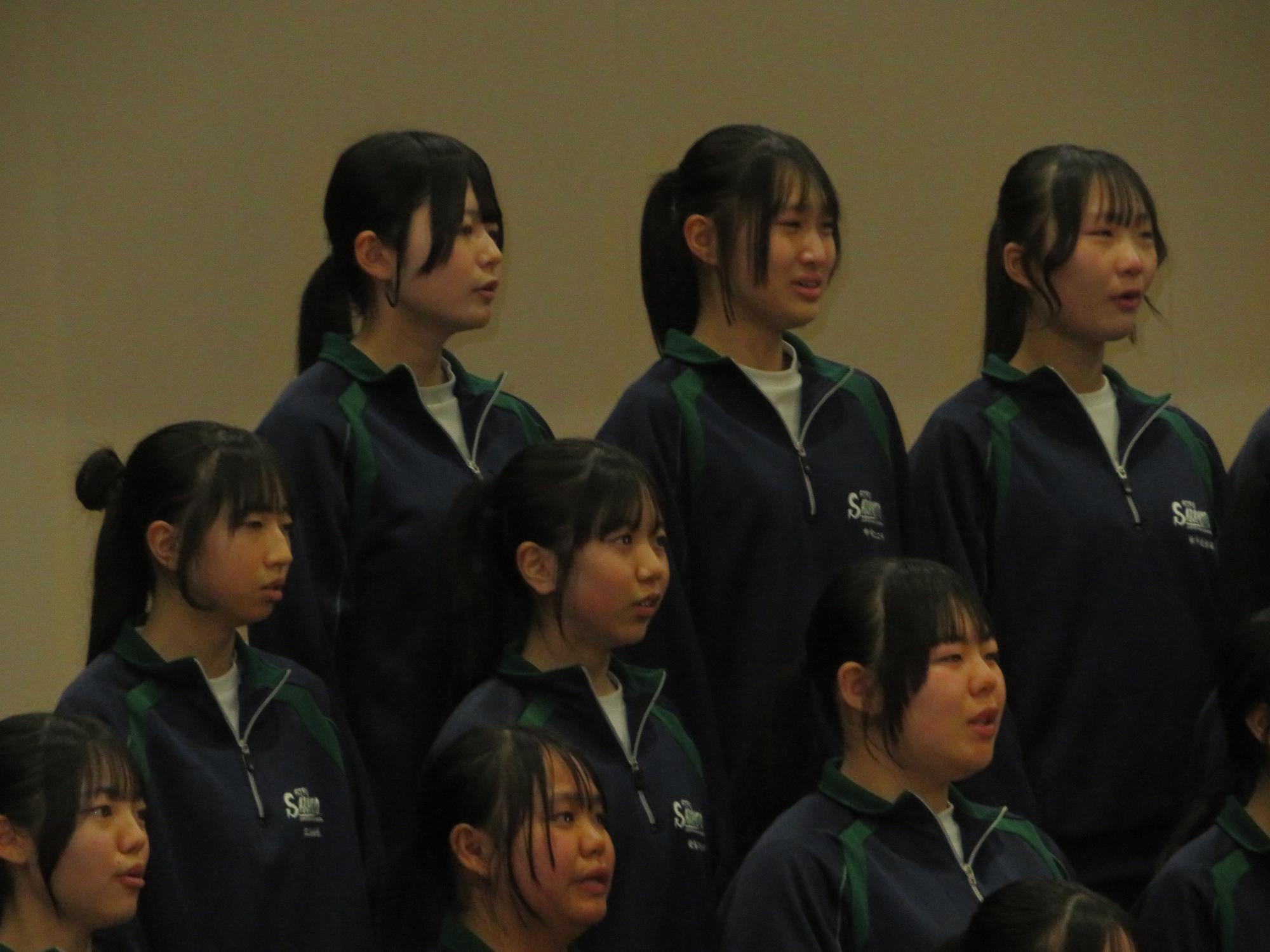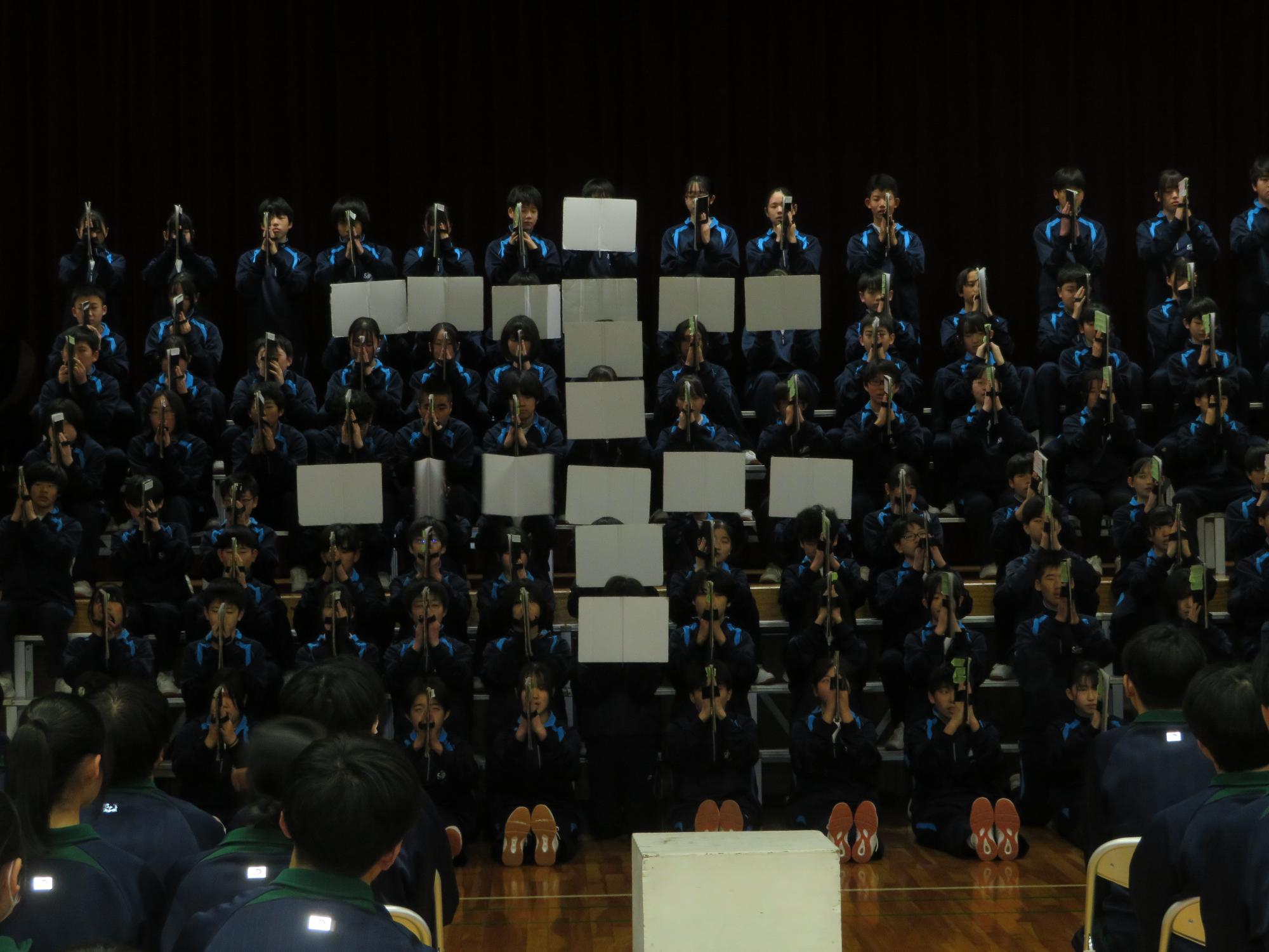 高校入試が終わり、延期されていた継承の会を本日行いました。涙いっぱいの継承の会でした。まずは、1年生はパネル活動と合唱で、2年生はスライドやメッセージと合唱で3年生に感謝と今後の決意を誓いました。練習時間が少ない中、仲間とつながり合い、一生懸命な心で創り上げたことがヒシヒシと伝わり、3年生の涙を誘っていました。そして3年生。仲間とのいろいろな活動を通して学んだことを堂々と後輩に語り継いでいました。そして圧巻の合唱。さすがという合唱を姿で示しました。涙を流しながら歌う3年生の合唱は、深い感動を与えていました。