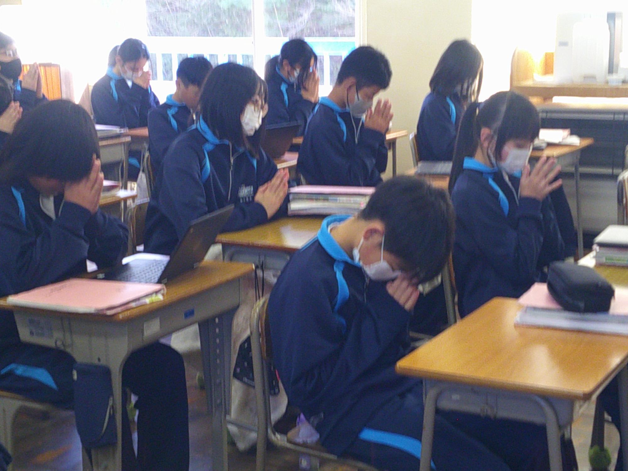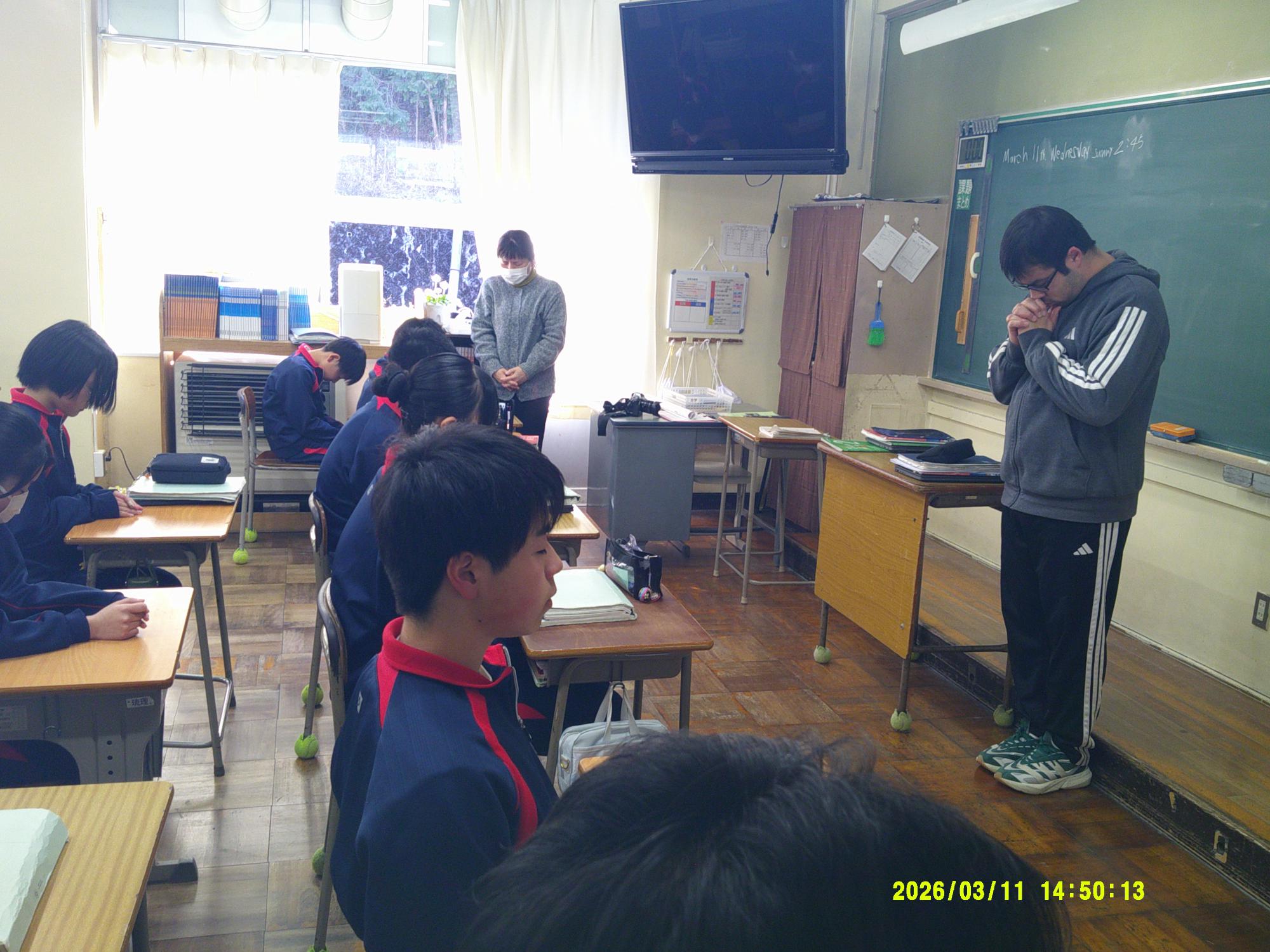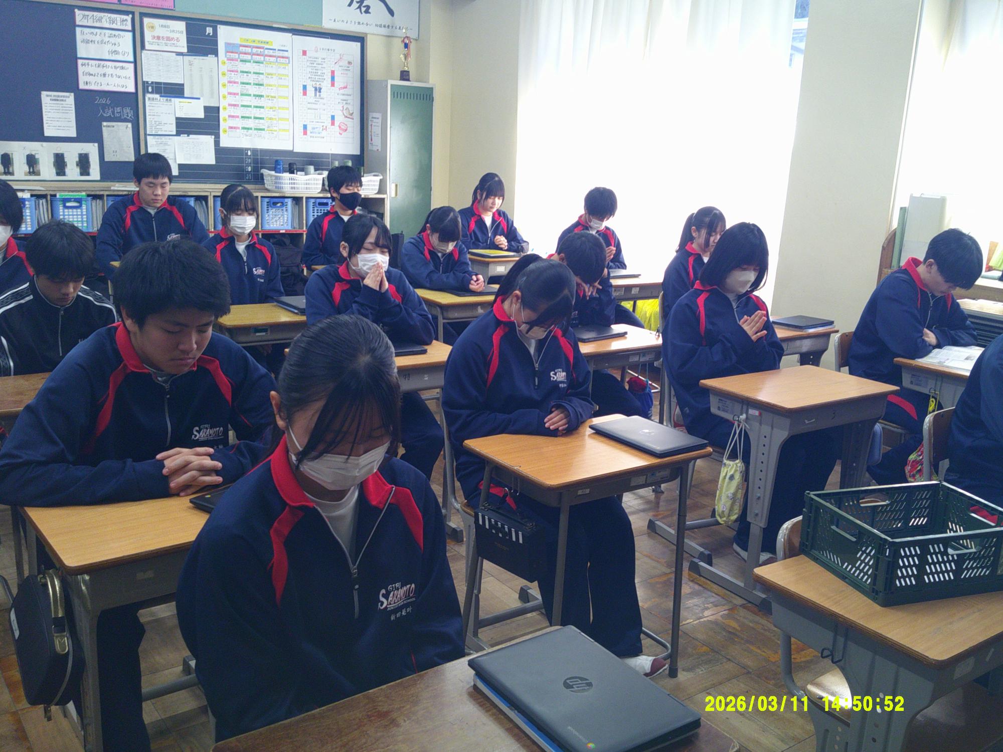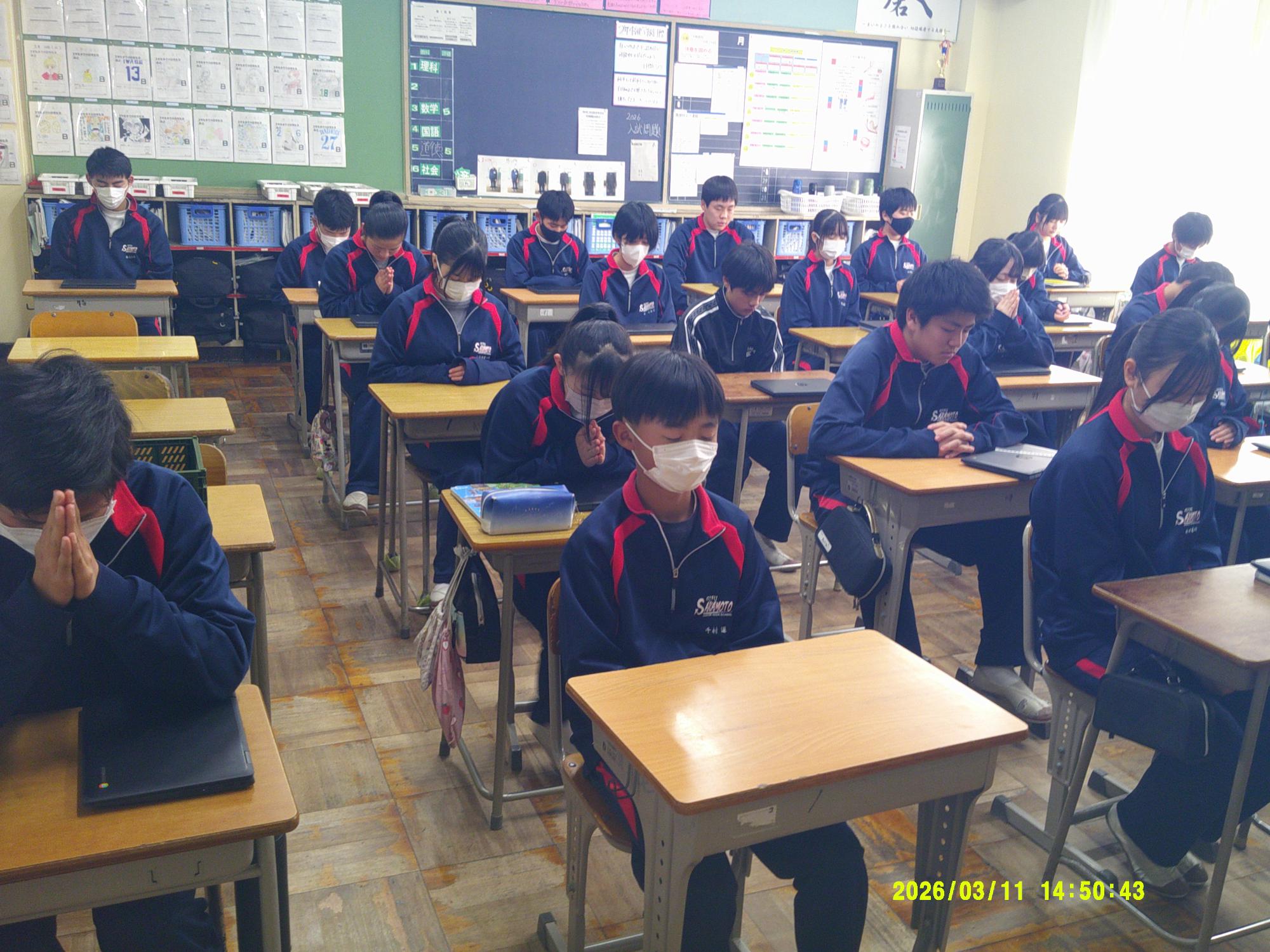 2011年3月11日、未曽有の被害をもたらした東日本大震災から15年。15年ということは・・1、2年生の生徒はまだ生まれていないときに発生した大震災となります。昼の放送では、東日本大震災の災害の大きさと今後の防災意識の大切さを確認し合いました。そして14時46分、中津川市のサイレンに合わせ、哀悼の意を込めながら全校で黙祷を行いました。“自分の命は自分で守りきる”。防災意識とともに生徒たちがさらに判断力を高めていくことを願っています。