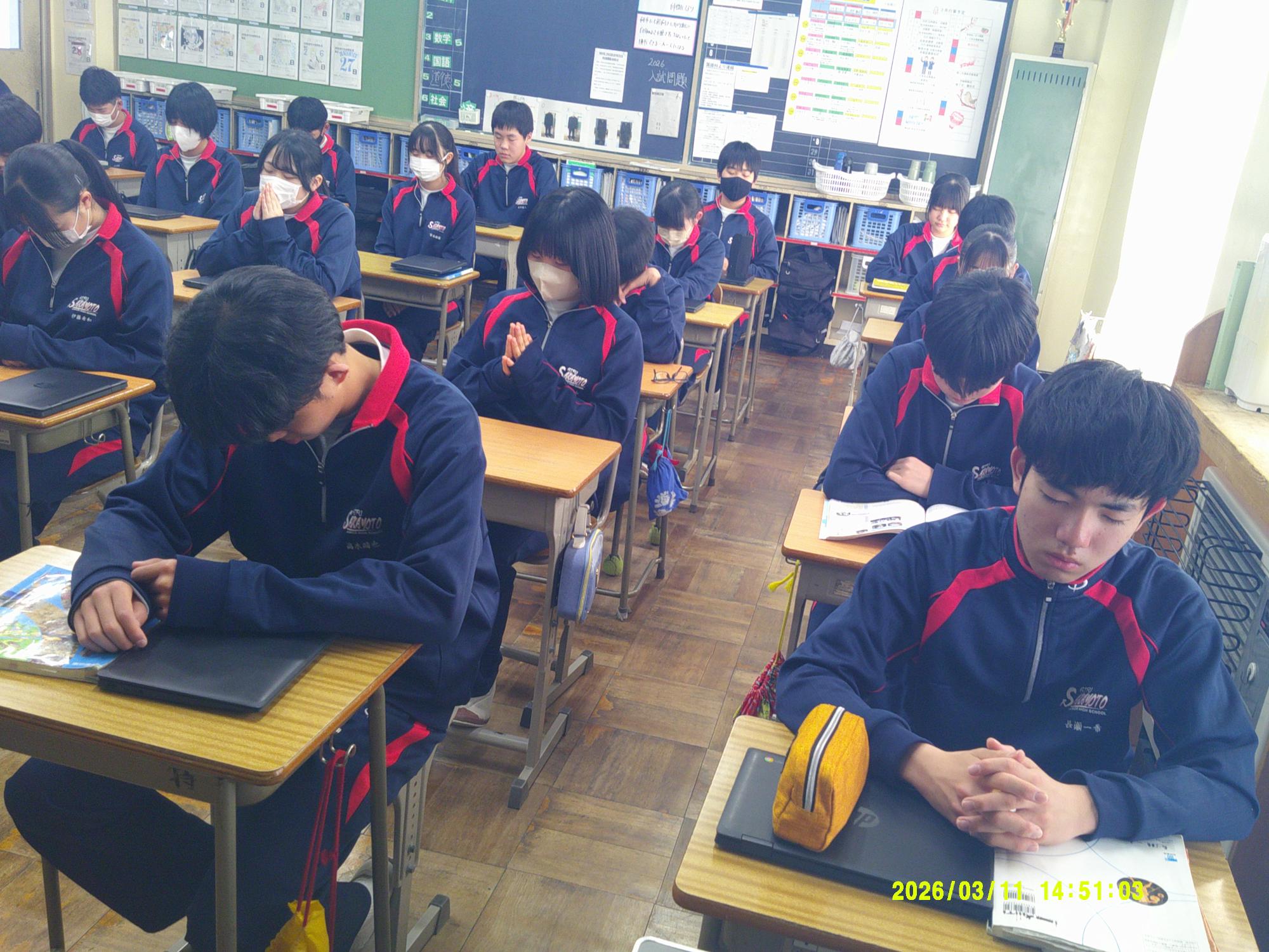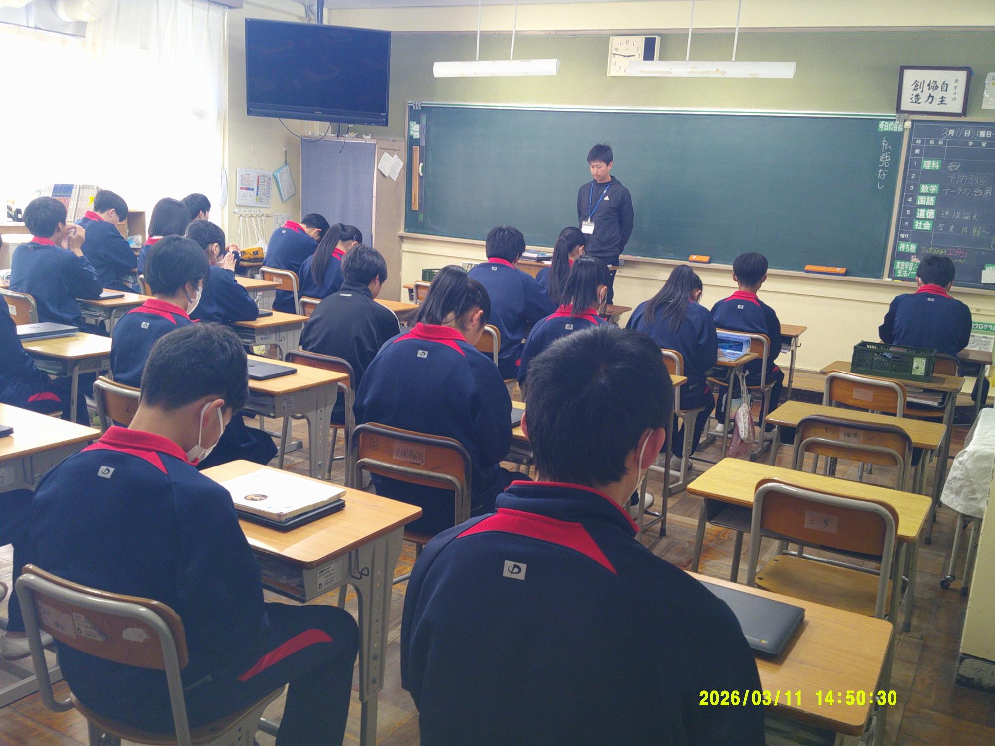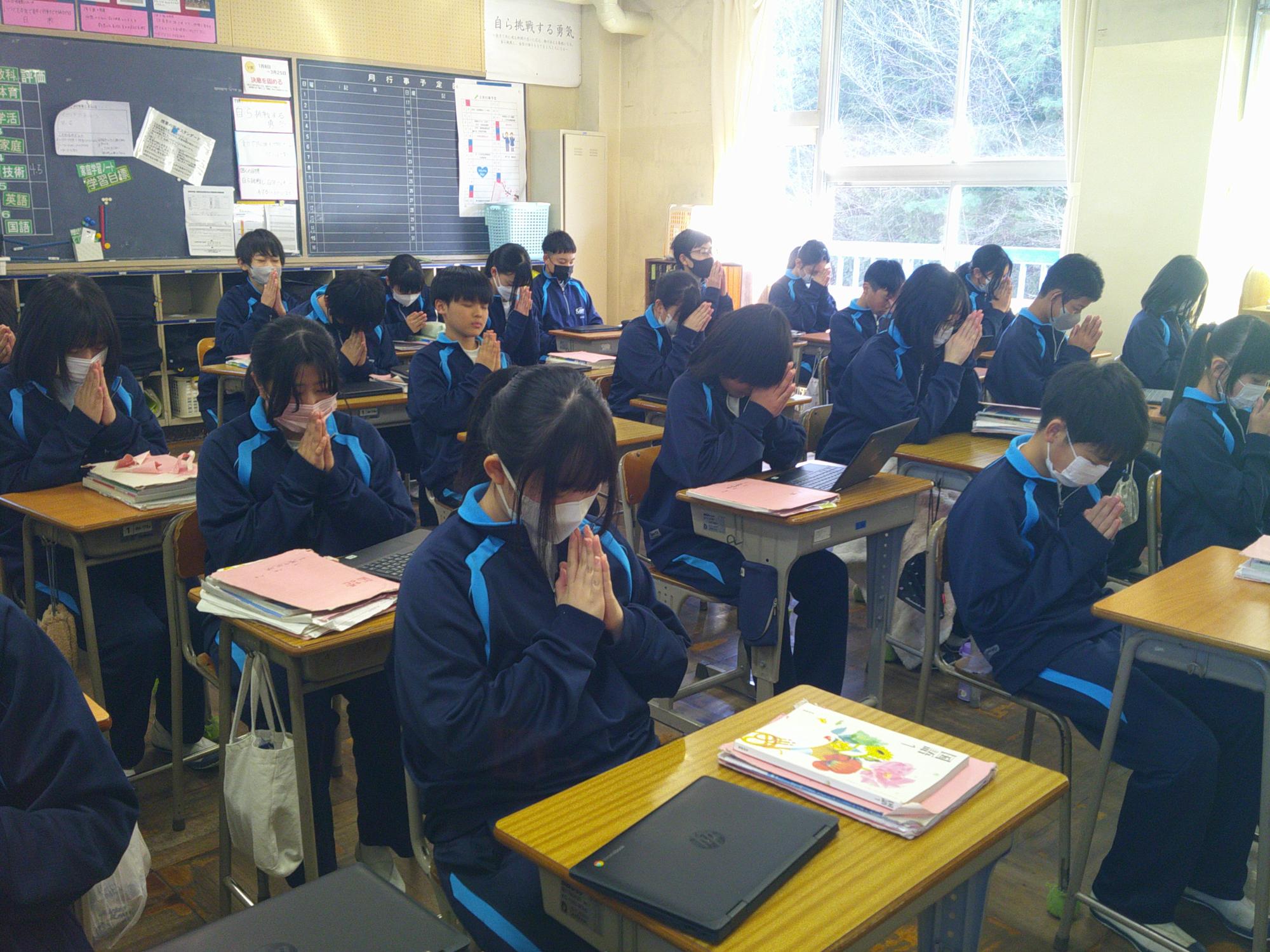 2011年3月11日、未曽有の被害をもたらした東日本大震災から15年。15年ということは・・1、2年生の生徒はまだ生まれていないときに発生した大震災となります。昼の放送では、東日本大震災の災害の大きさと今後の防災意識の大切さを確認し合いました。そして14時46分、中津川市のサイレンに合わせ、哀悼の意を込めながら全校で黙祷を行いました。“自分の命は自分で守りきる”。防災意識とともに生徒たちがさらに判断力を高めていくことを願っています。