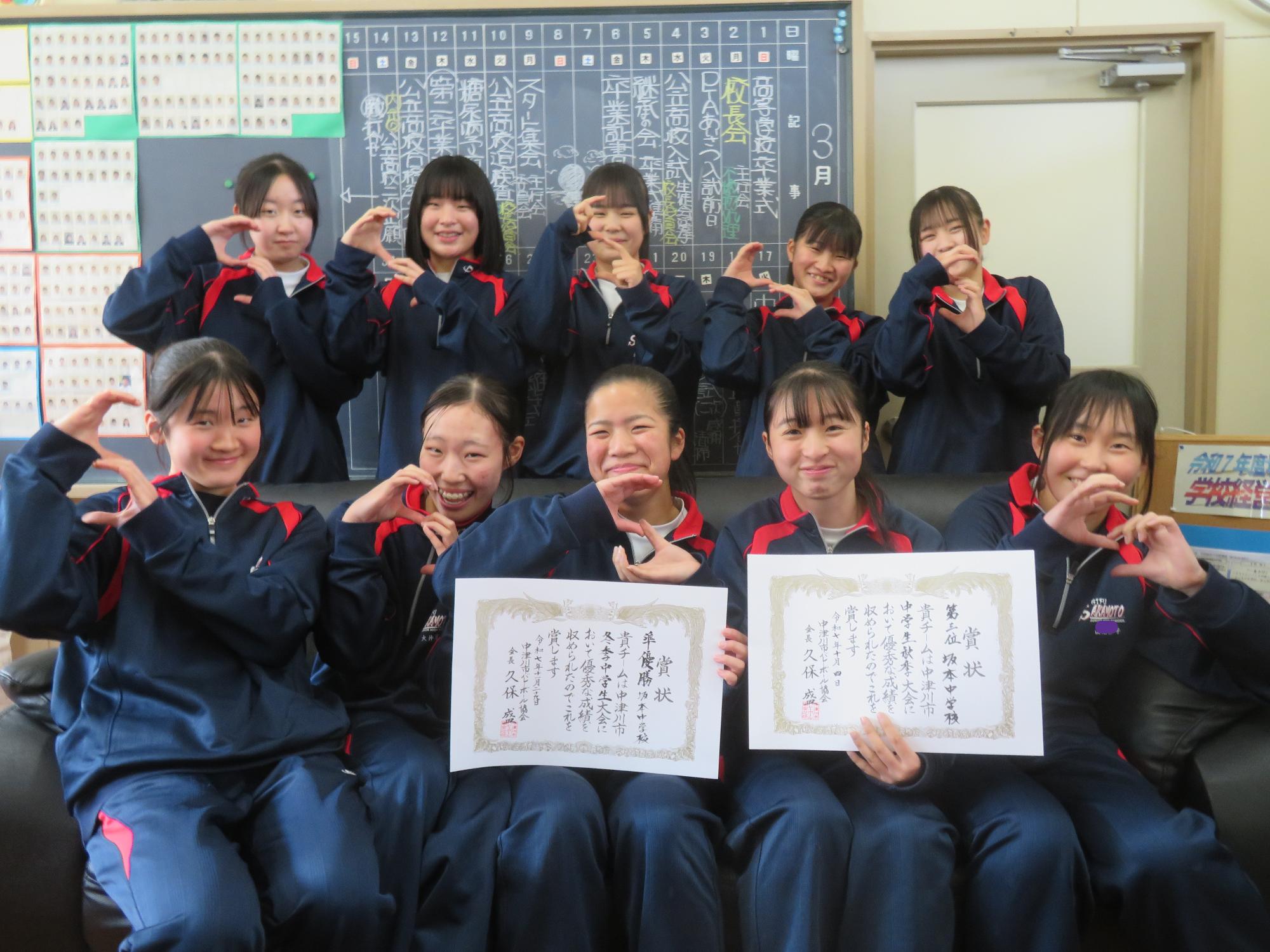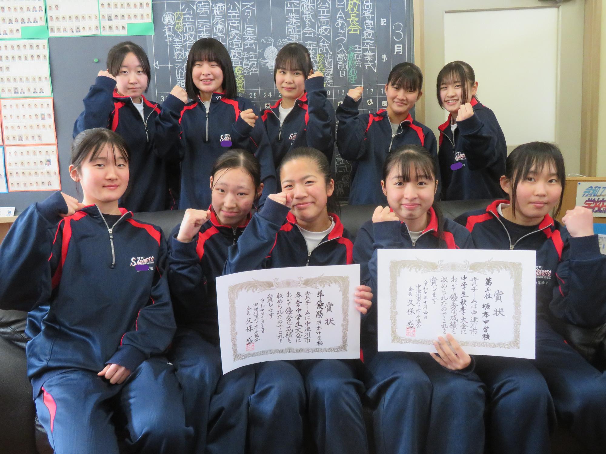 バレー部女子の試合報告 更新日:2026年03月24日 バレー部女子の2年生が試合報告に校長室に来てくれました。この冬から2つの大会を終え、報告してくれました。惜しくも準優勝だったことにも触れ、「一生懸命練習に励み、ライバル校に勝利するよう頑張ります。」と力強く語ってくれました。冬の練習に本気で励む者は春を制する。春の大会の健闘を心から応援しています。